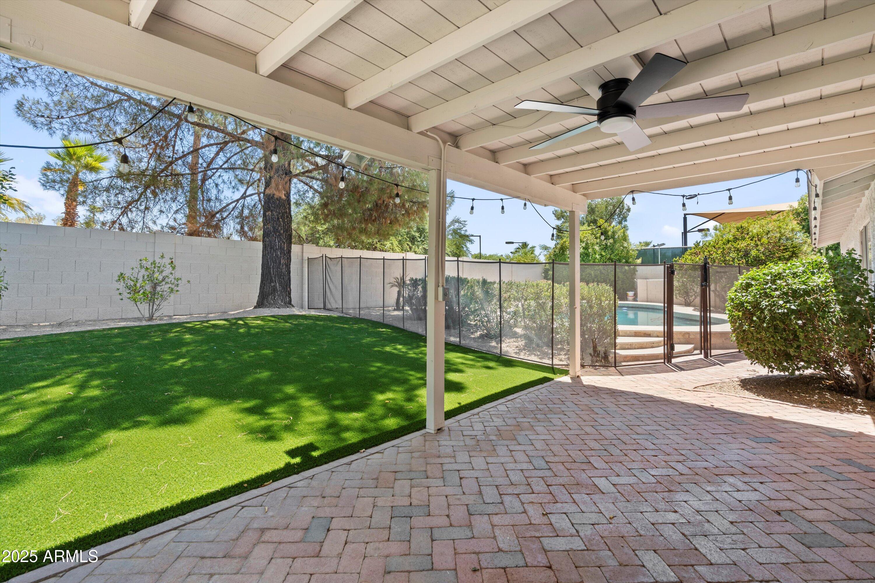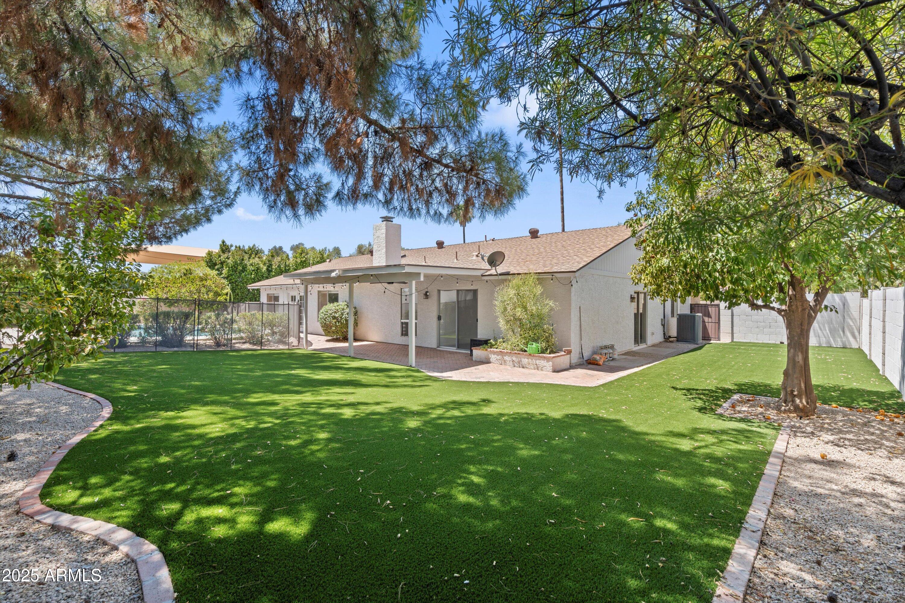 Welcome to your little slice of paradise in the heart of Scottsdale! This 4-bedroom, 2-bathroom home offers the perfect blend of comfort, style, and location. Recently refreshed, this functional open-concept floor plan features a welcoming living area with vaulted ceilings, a formal dining space, and a seamless flow that's perfect for both everyday living and entertaining. Step outside to your own private backyard retreat--a sparkling Pebble Tec pool, expansive covered patio, and newly installed artificial turf surrounded by lush, mature trees and landscaping create a serene setting for year-round enjoyment. The property also offers a large covered side area--ideal for an extra car, boat, or toy storage. Ideally situated with quick access to the Greenbelt, you're just minutes from premier shopping, dining, and entertainment. The community offers its own private tennis/pickleball courts, and children's playground just steps from the home. Located in the coveted 3 C's school district (Cochise, Cocopah, and Chaparral), this home delivers both lifestyle and convenience in one of Scottsdale's most sought-after neighborhoods.
