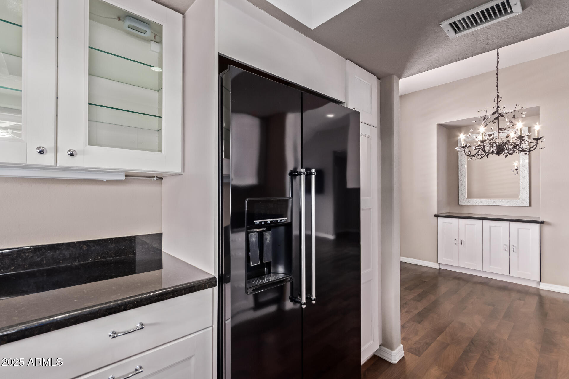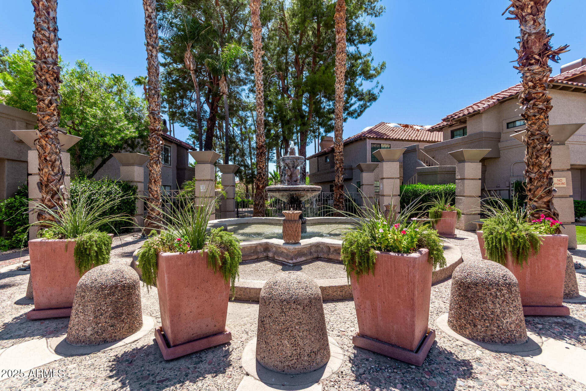 Move-in ready condo at The Fountains in Scottsdale Ranch--complete with a NEW A/C and NEW WATER HEATER (both 2025). Step into a light and bright great room with vaulted ceilings, plantation shutters, vinyl flooring, and a cozy fireplace. The dining area features a built-in buffet and chandelier, while the updated kitchen has soft-close white cabinetry (pull-out pantry drawers), granite counters, sleek appliances, recessed and under-cabinet lighting. The primary suite provides a relaxing escape with a chandelier and recessed lighting, full ensuite bath, dual closets, and a private balcony. The secondary bedroom has a large window with shutters and closet organization, while the hall bath features a pedestal sink, and step-in shower with tile surround and glass door. Enjoy TWO OUTDOOR living spaces perfect for sipping morning coffee or hosting friends. Full-size LG washer/dryer and water softener included. Single-car GARAGE with dedicated driveway. You'll love the community's lush landscape and year-round heated pool and spa, plus the unbeatable central Scottsdale location close to shopping, dining, parks, trails, and easy freeway access. Welcome home!