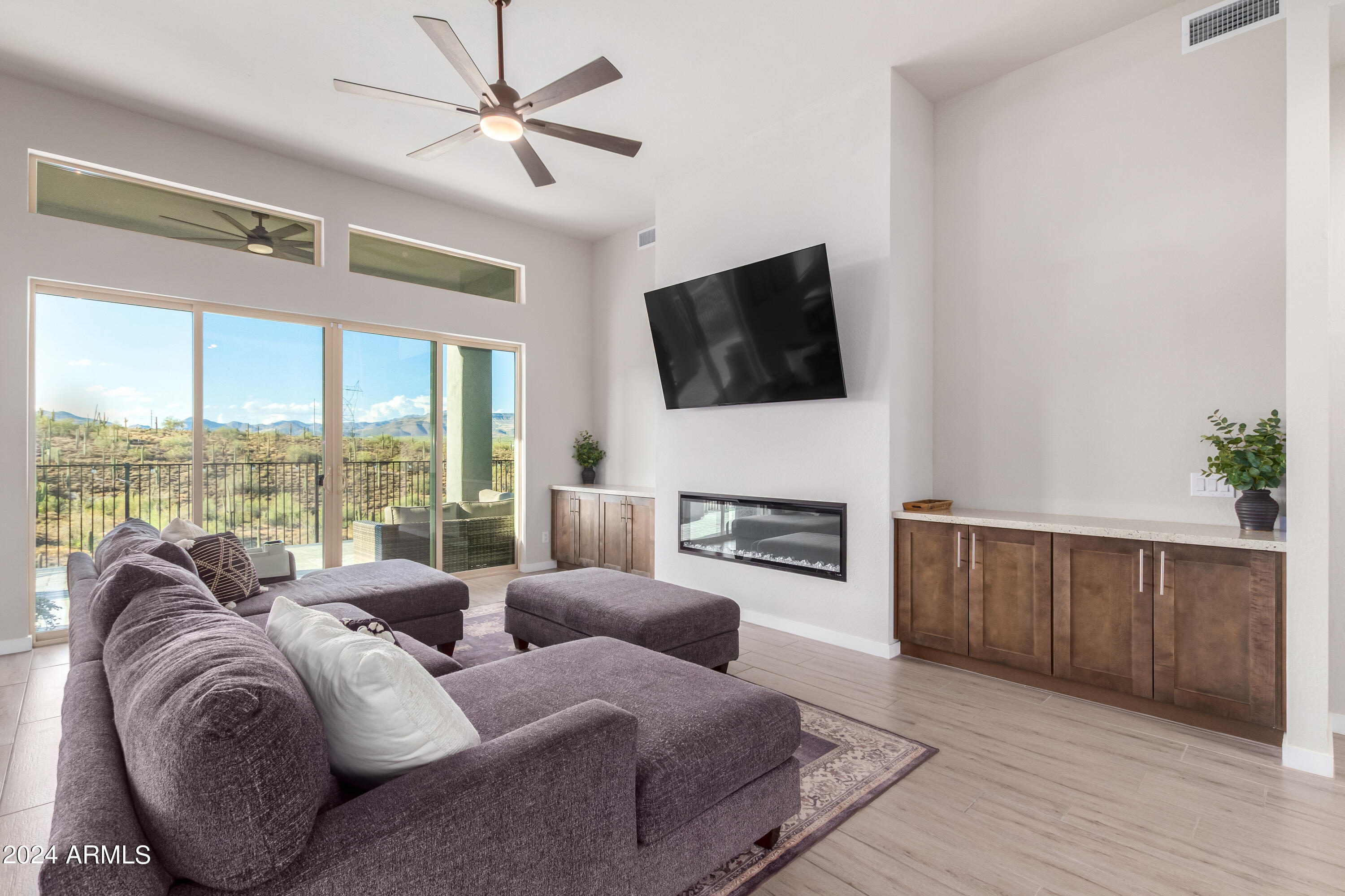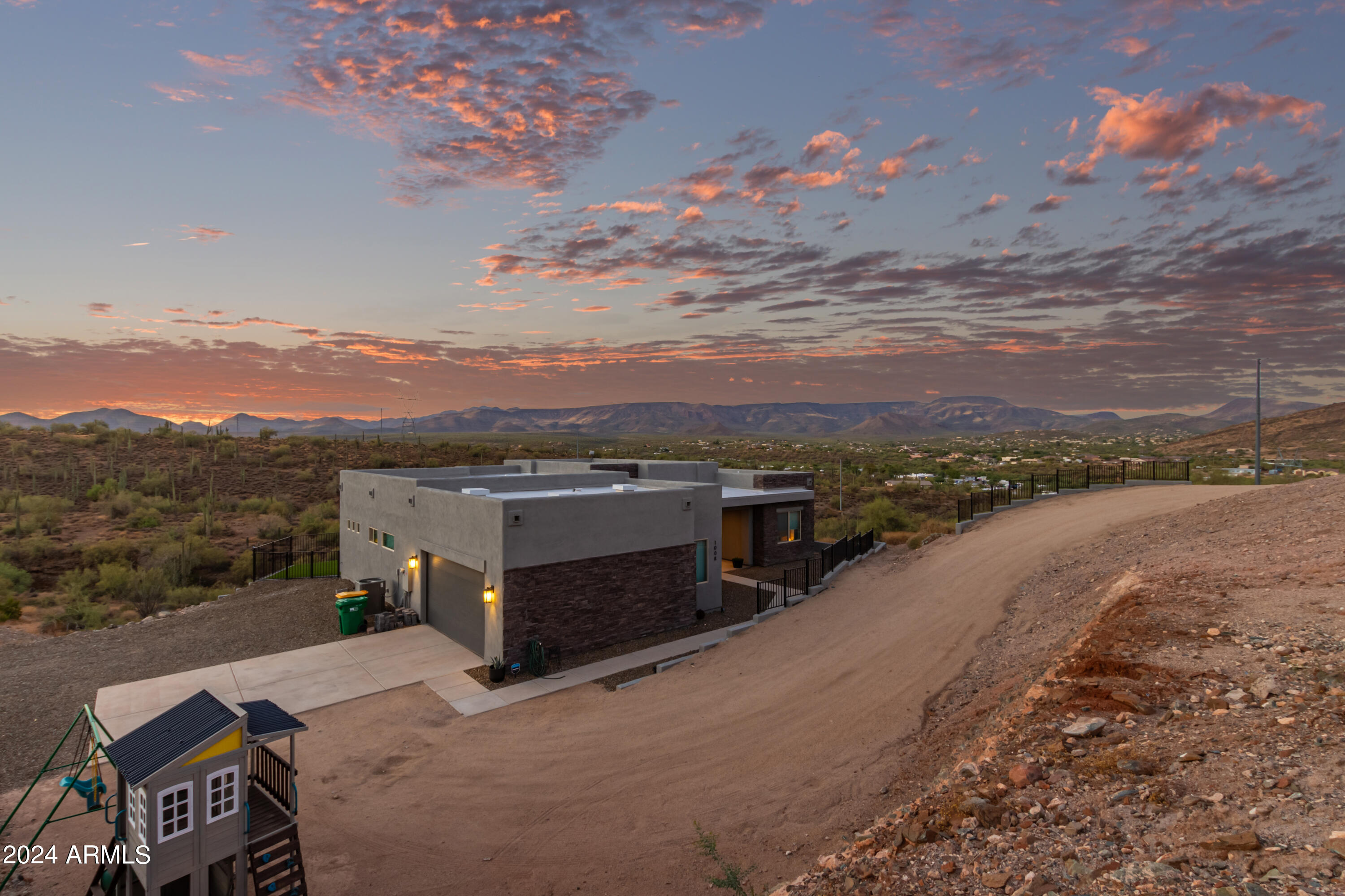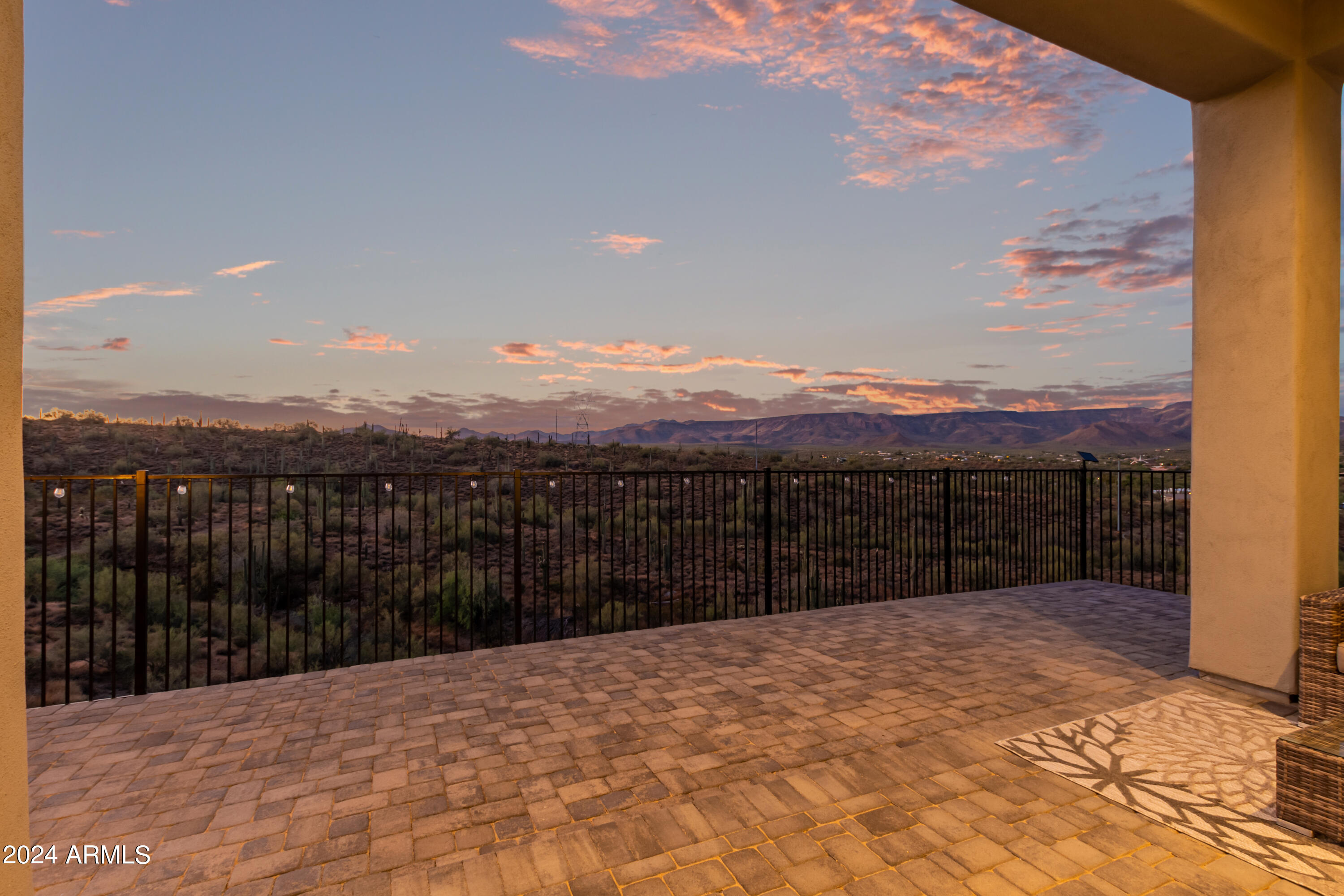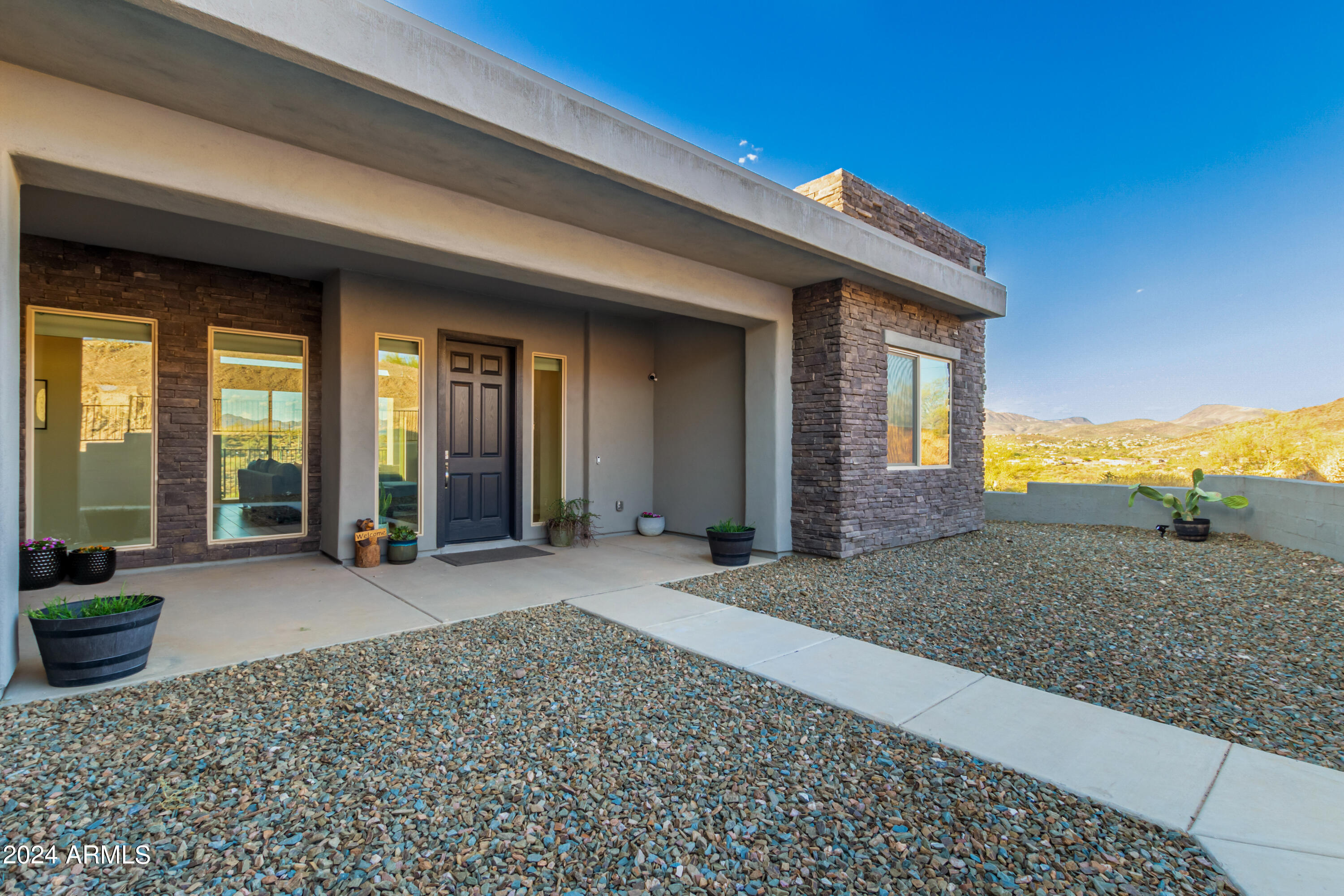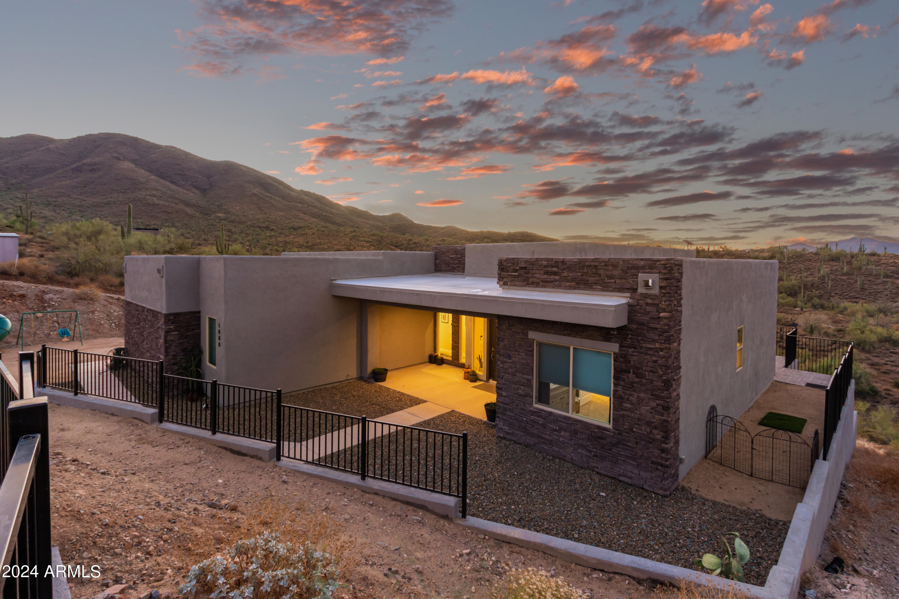 Explore this newly constructed Morgan Taylor built home nestled on a sprawling 1.13-acres bordering state land. Extra private lot, saguaro desert views for days, horse rights with room for stalls. Stone accents and a convenient extended 2-car garage. Incredible views from every room. Features wood-look tile floors and a soothing neutral palette. The great room, complete with an electric fireplace, offers a warm welcome. The kitchen boasts ample wood cabinetry, stainless steel appliances including wall ovens, a pantry, granite counters, and a center island illuminated by pendant lights above the breakfast bar. The primary suite is a serene retreat, highlighting large windows that frame the mountain views, a private bathroom with dual sinks, a soaking tub, and a walk-in closet. Must see! Outside, the paver patio provides a perfect backdrop for enjoying stunning sunsets or hosting lively barbecues. Make this tranquil haven yours today!