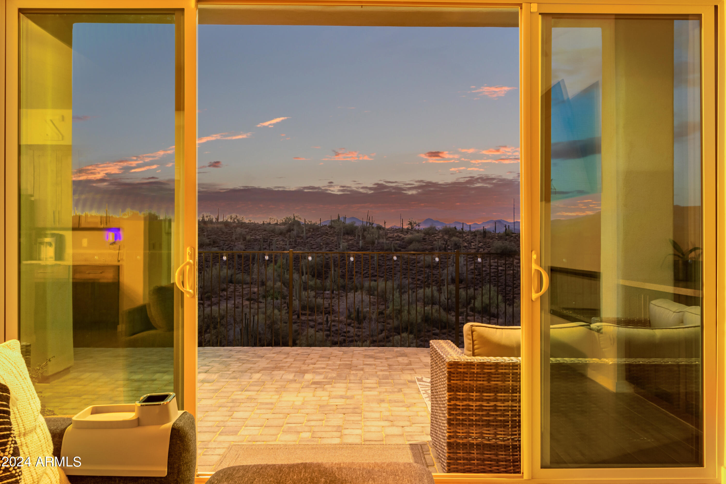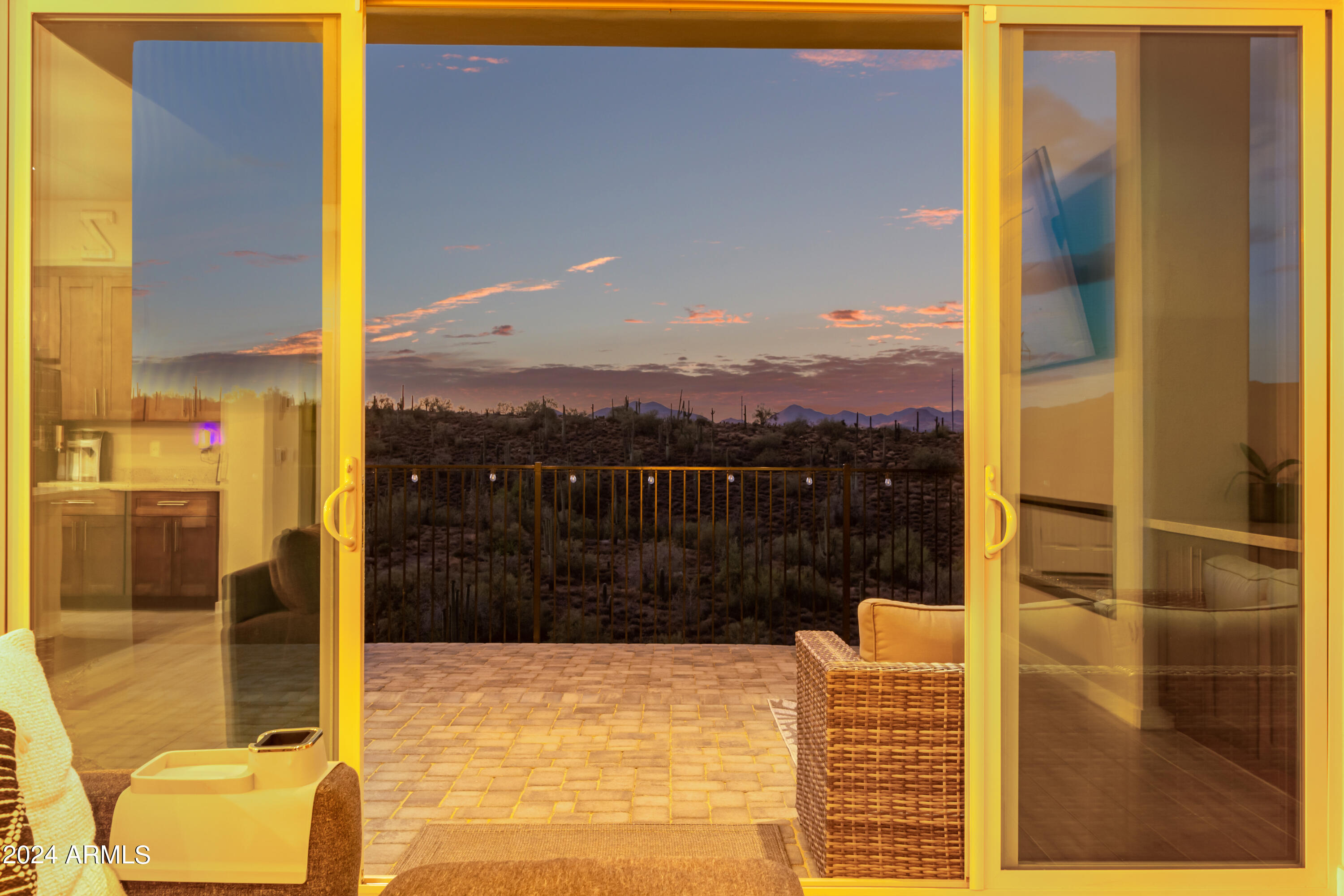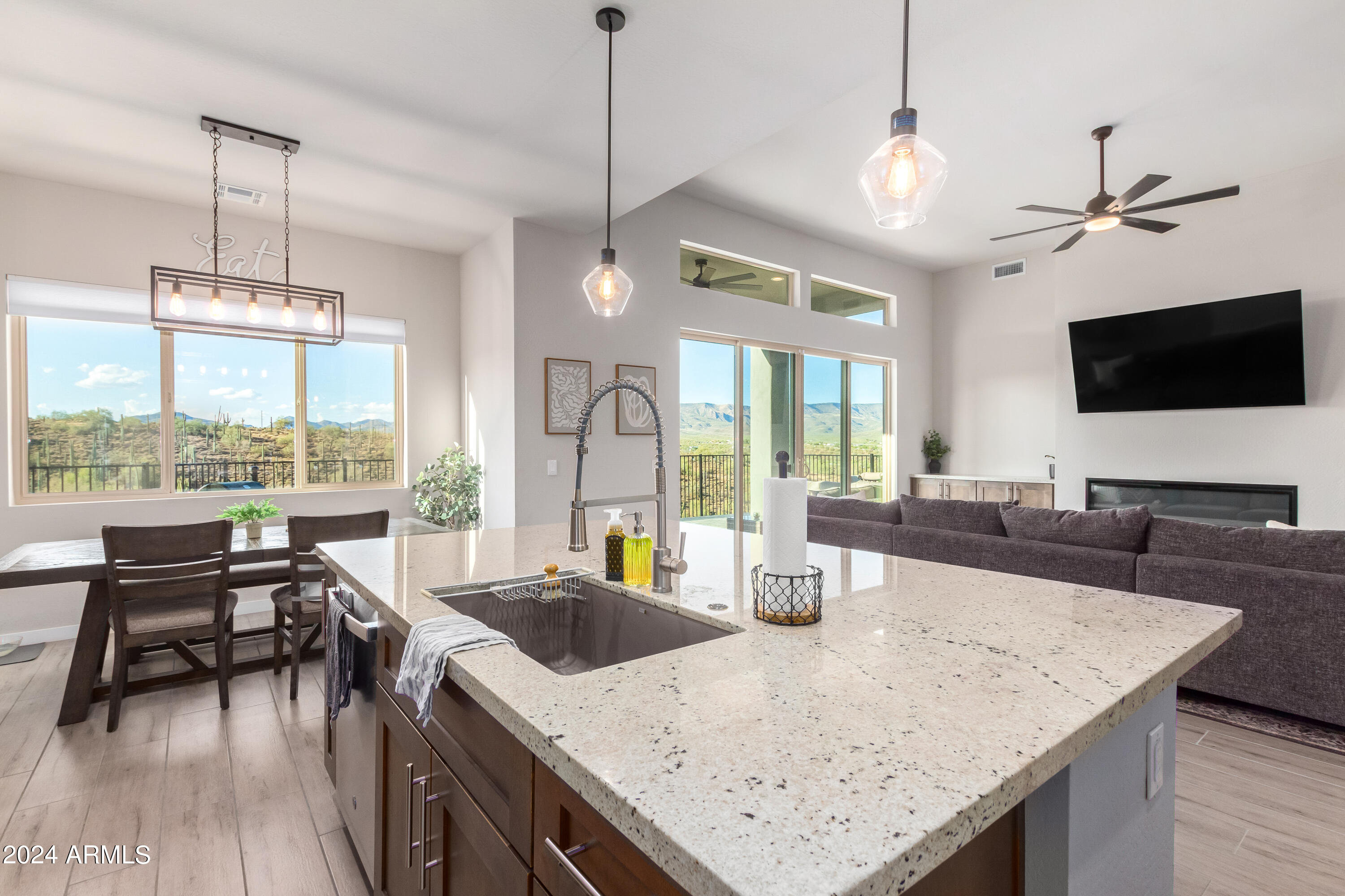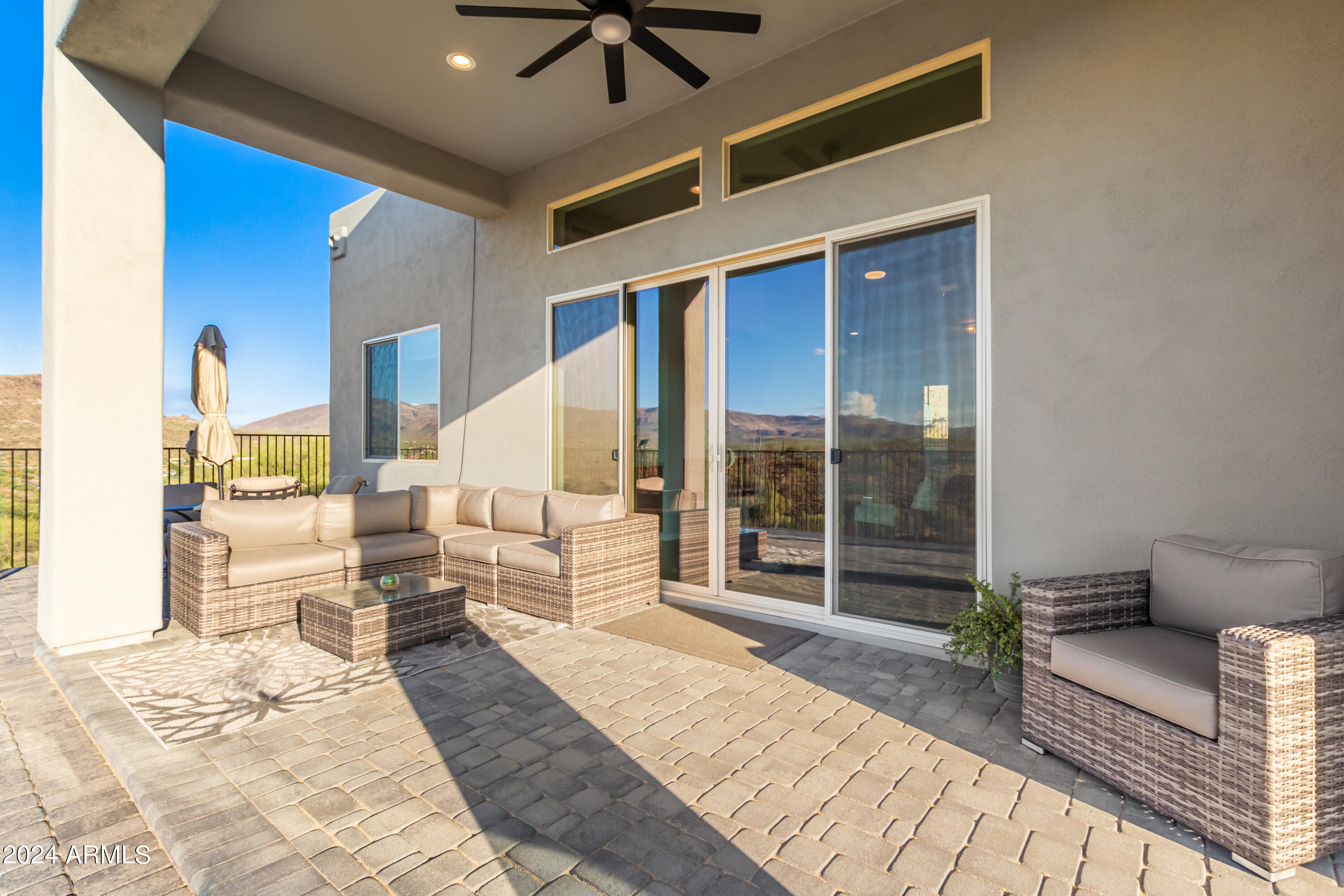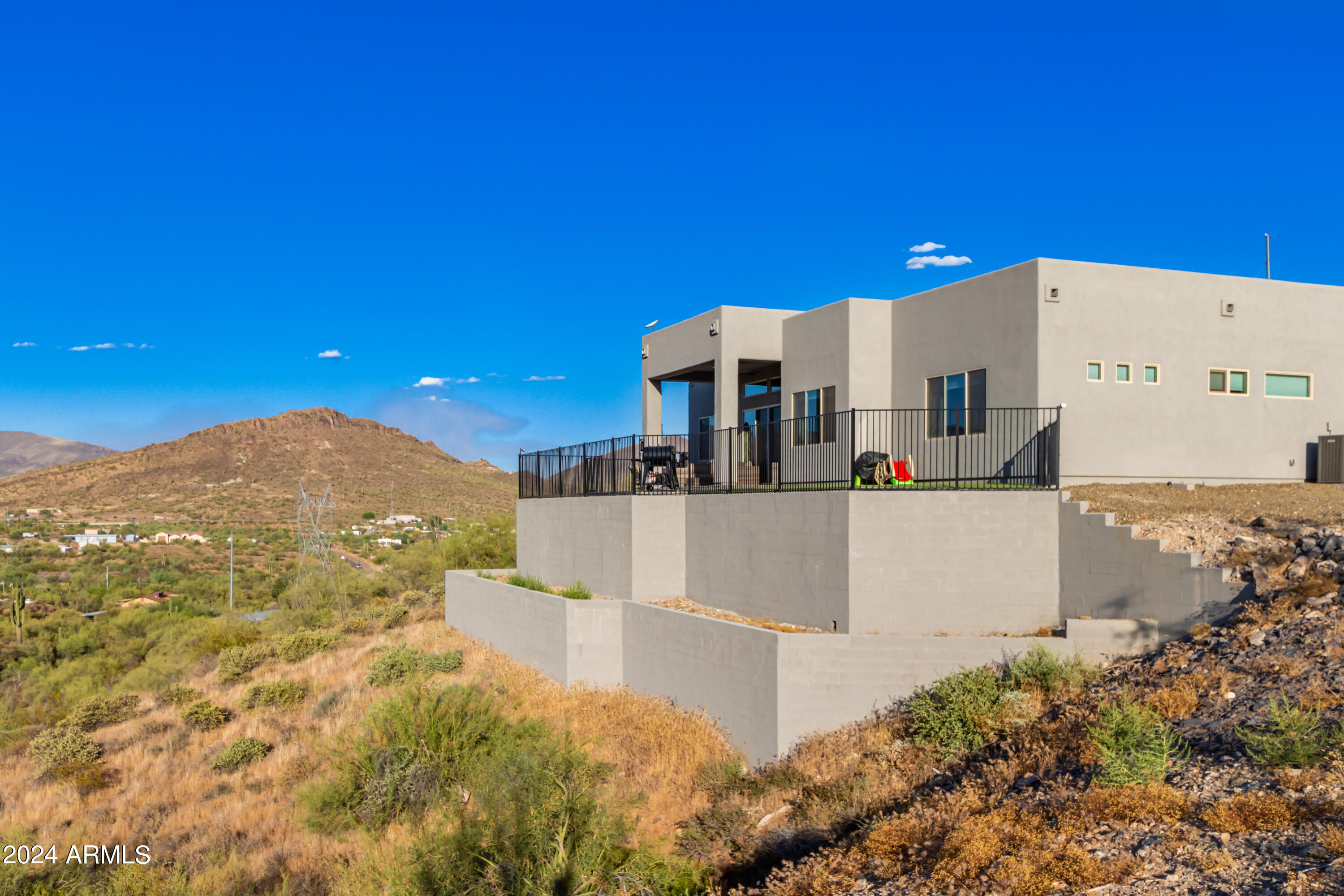 Explore this newly constructed Morgan Taylor built home nestled on a sprawling 1.13-acres bordering state land. Extra private lot, saguaro desert views for days, horse rights with room for stalls. Stone accents and a convenient extended 2-car garage. Incredible views from every room. Features wood-look tile floors and a soothing neutral palette. The great room, complete with an electric fireplace, offers a warm welcome. The kitchen boasts ample wood cabinetry, stainless steel appliances including wall ovens, a pantry, granite counters, and a center island illuminated by pendant lights above the breakfast bar. The primary suite is a serene retreat, highlighting large windows that frame the mountain views, a private bathroom with dual sinks, a soaking tub, and a walk-in closet. Must see! Outside, the paver patio provides a perfect backdrop for enjoying stunning sunsets or hosting lively barbecues. Make this tranquil haven yours today!