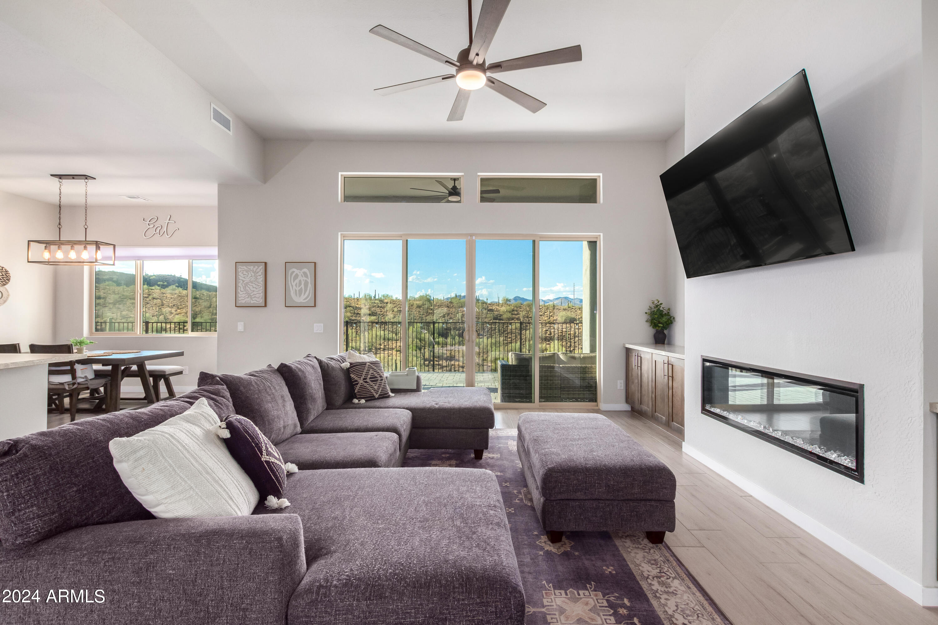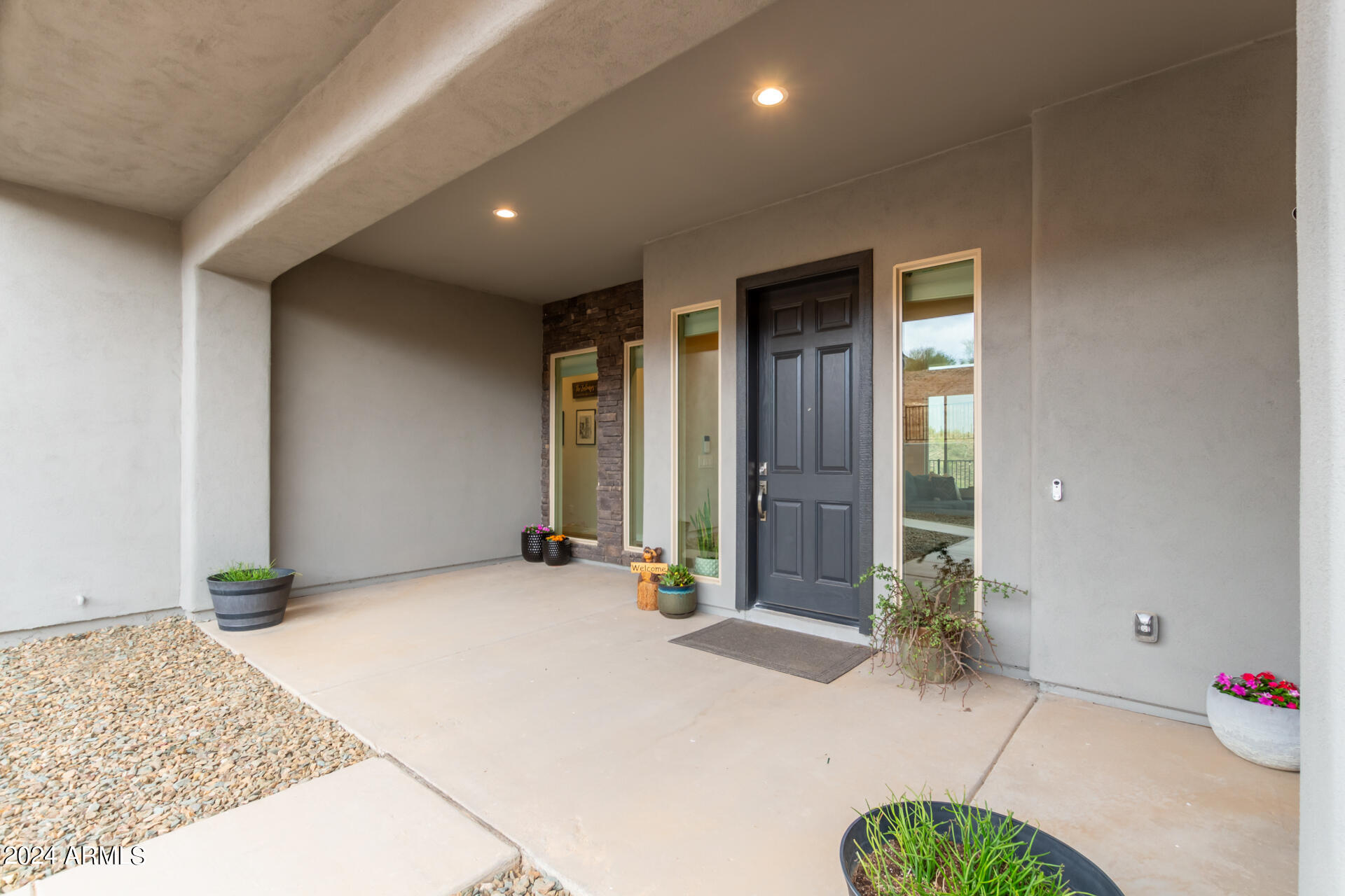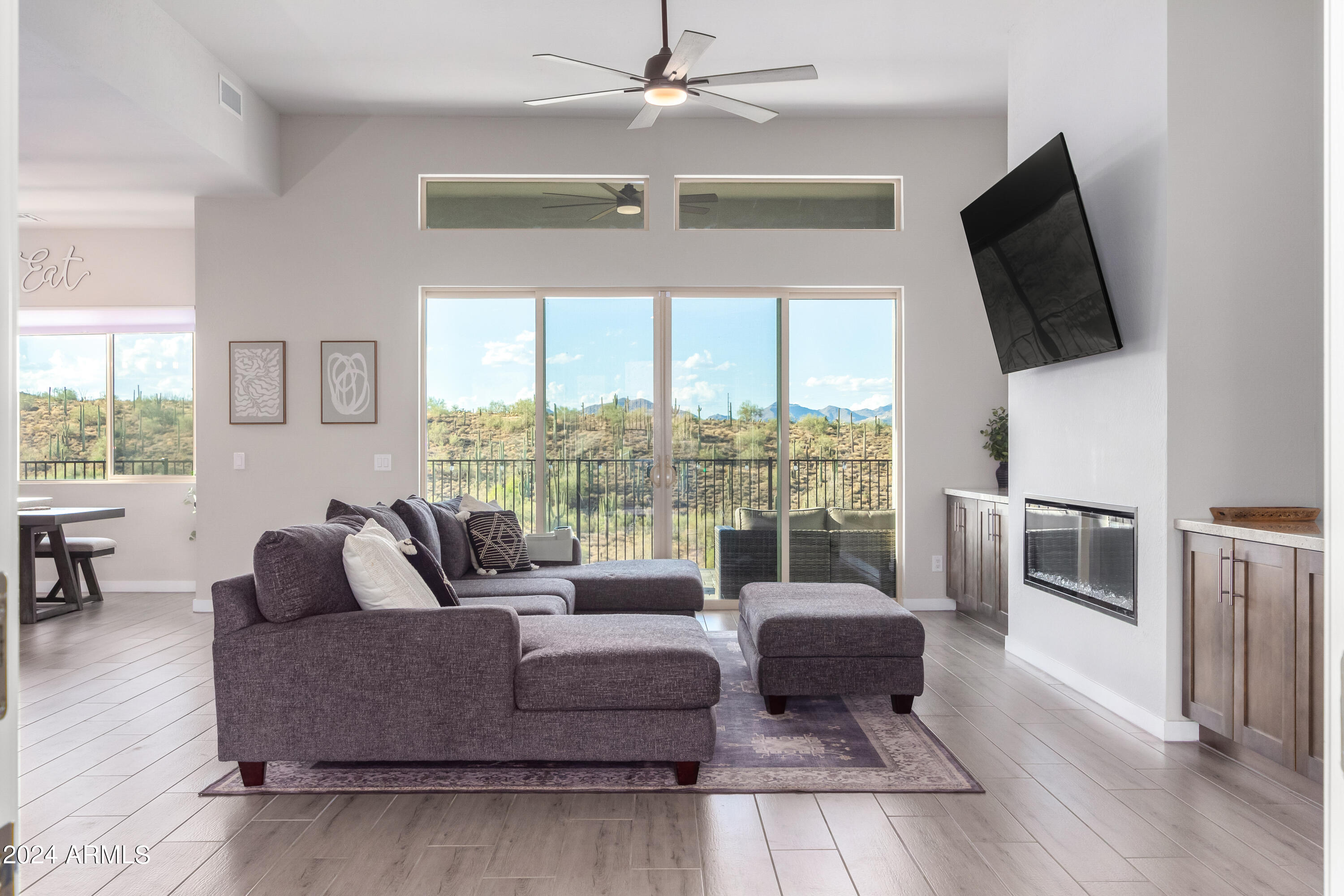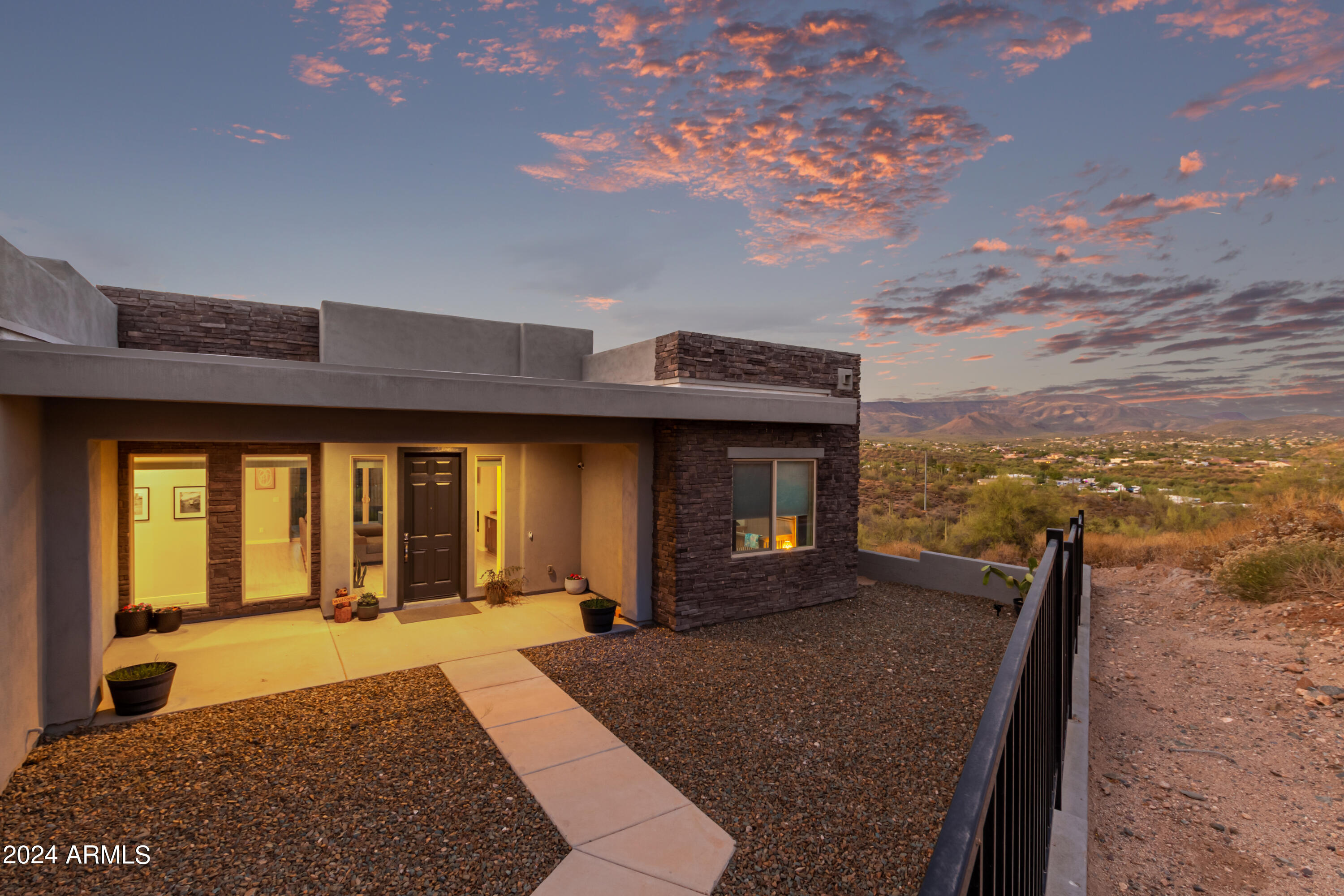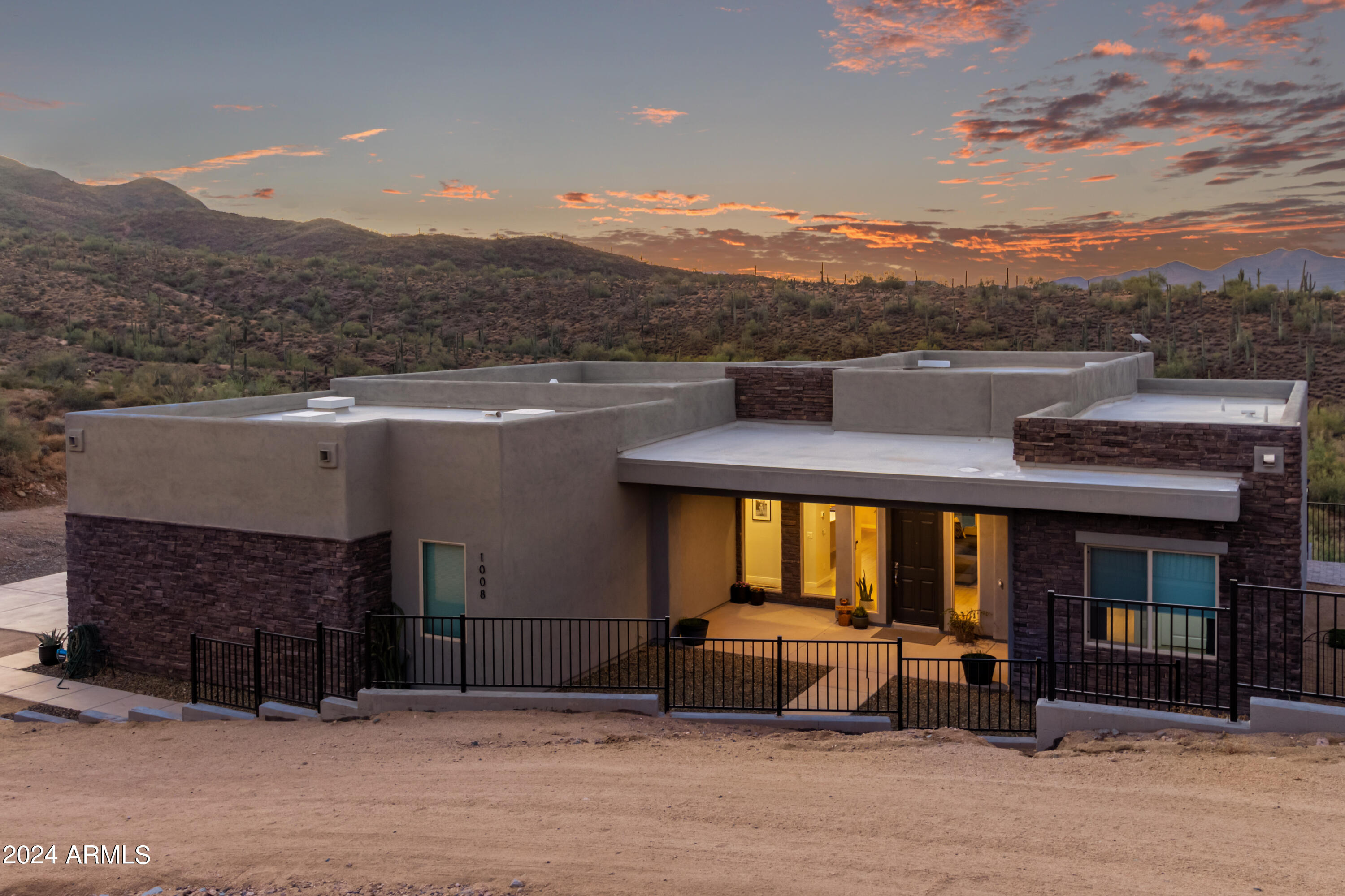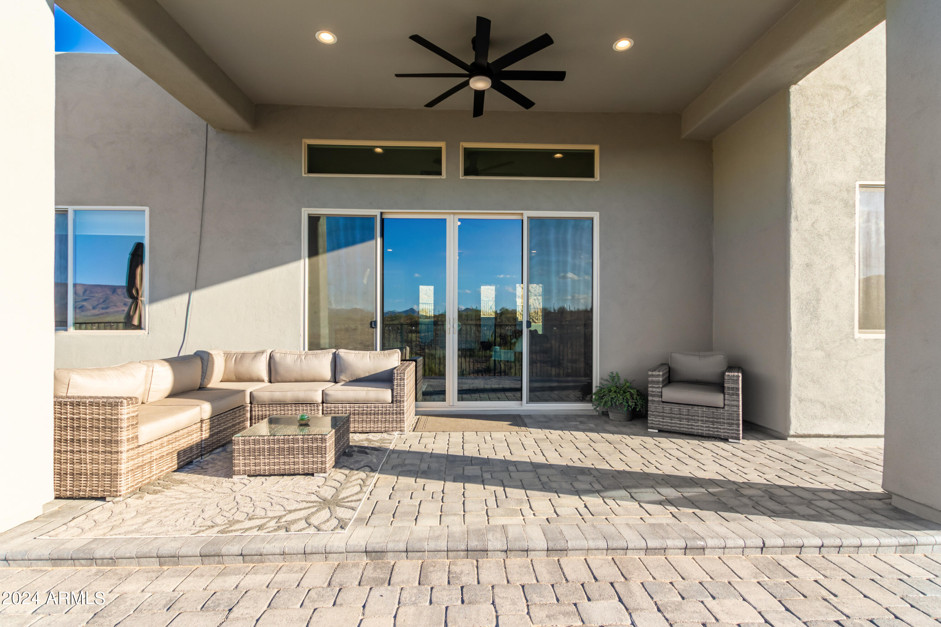 Explore this newly constructed Morgan Taylor built home nestled on a sprawling 1.13-acres bordering state land. Extra private lot, saguaro desert views for days, horse rights with room for stalls. Stone accents and a convenient extended 2-car garage. Incredible views from every room. Features wood-look tile floors and a soothing neutral palette. The great room, complete with an electric fireplace, offers a warm welcome. The kitchen boasts ample wood cabinetry, stainless steel appliances including wall ovens, a pantry, granite counters, and a center island illuminated by pendant lights above the breakfast bar. The primary suite is a serene retreat, highlighting large windows that frame the mountain views, a private bathroom with dual sinks, a soaking tub, and a walk-in closet. Must see! Outside, the paver patio provides a perfect backdrop for enjoying stunning sunsets or hosting lively barbecues. Make this tranquil haven yours today!
