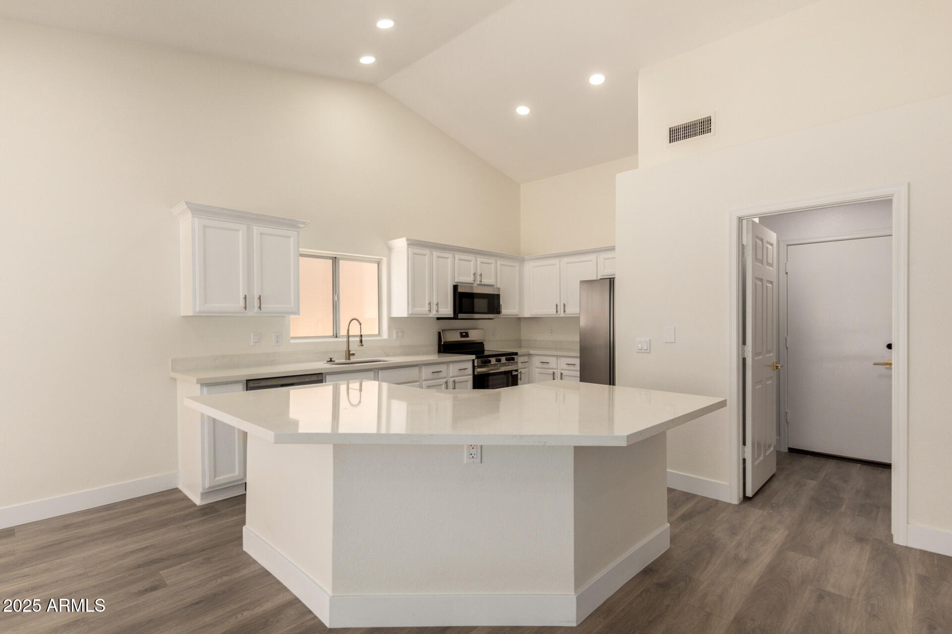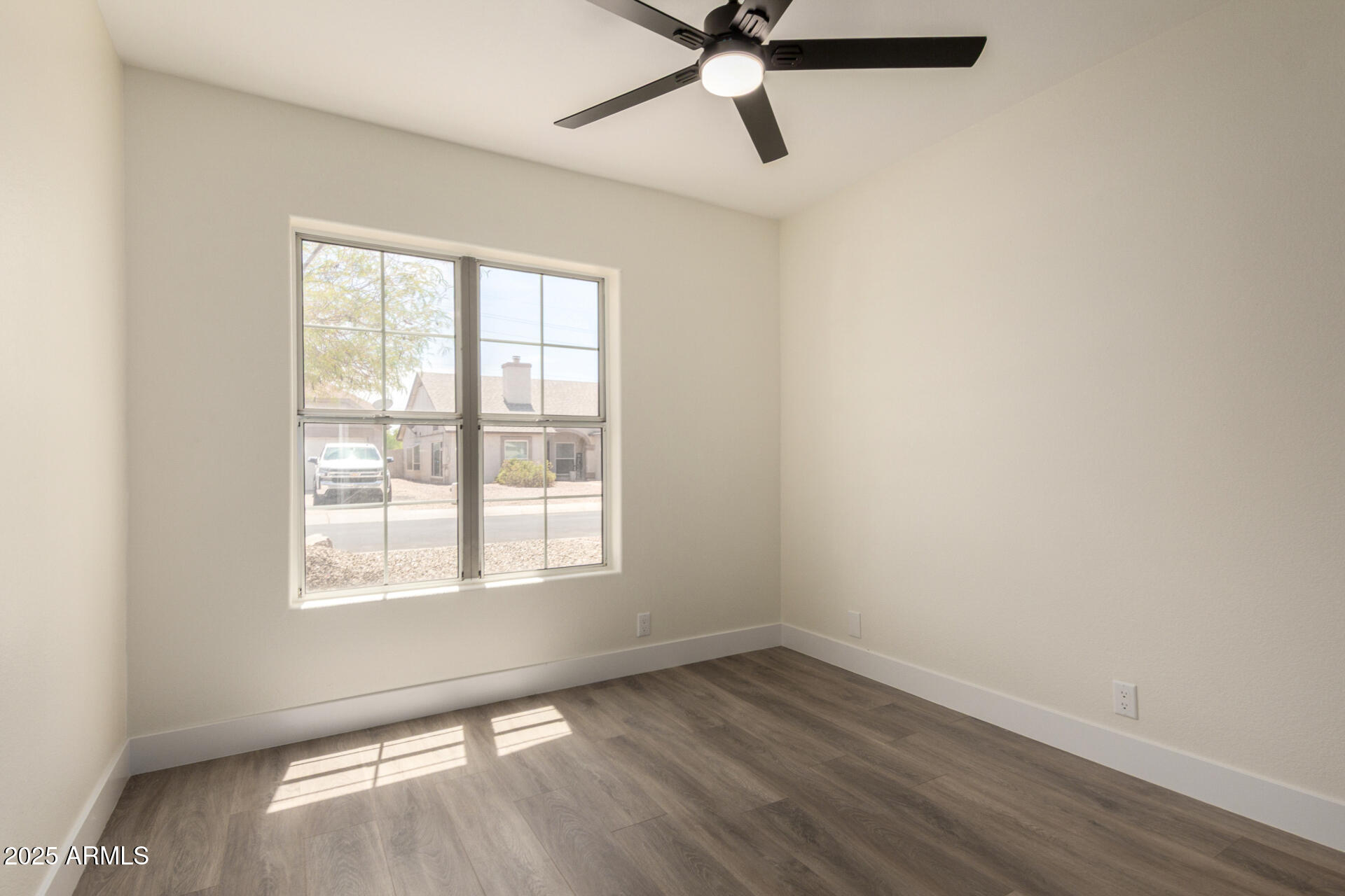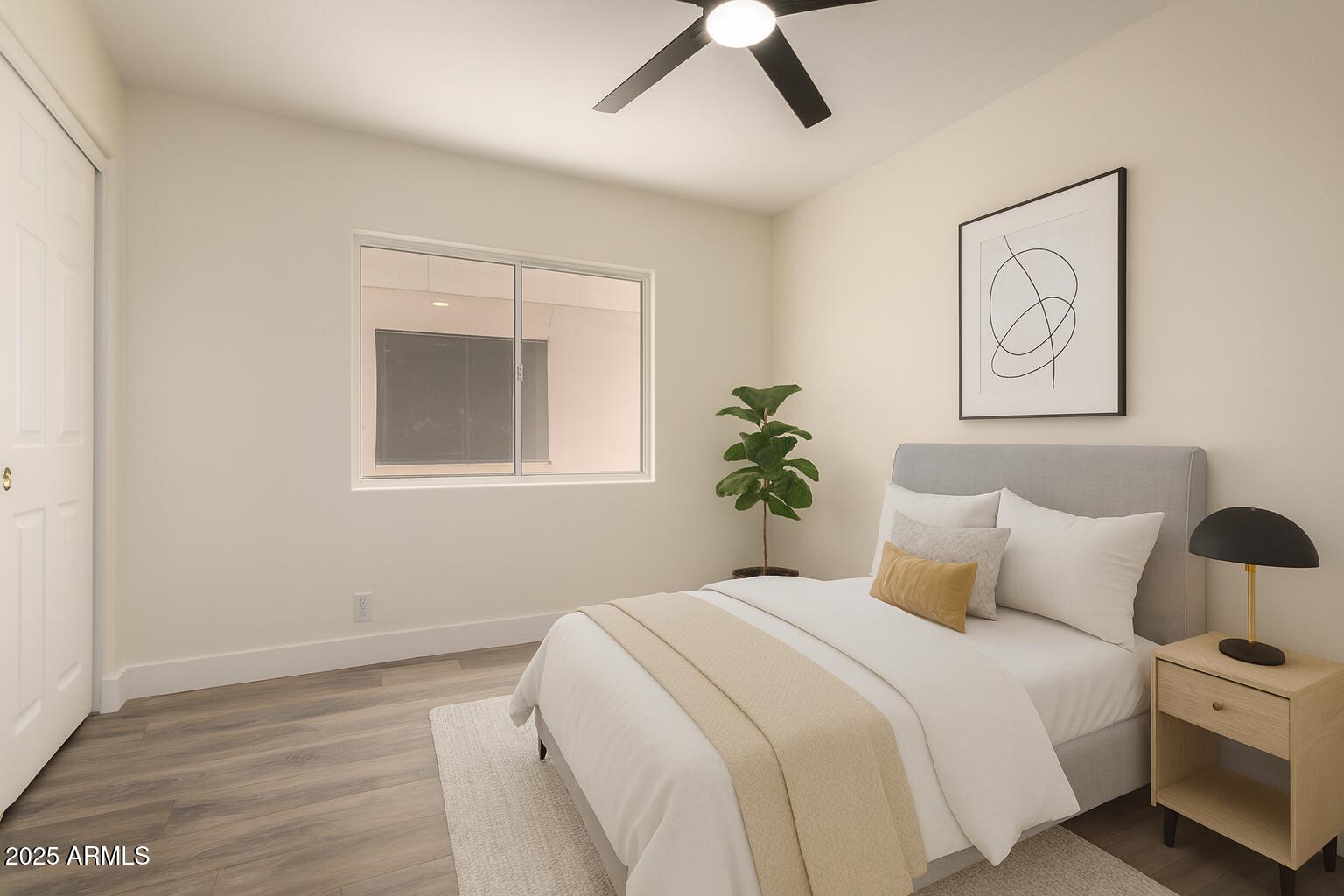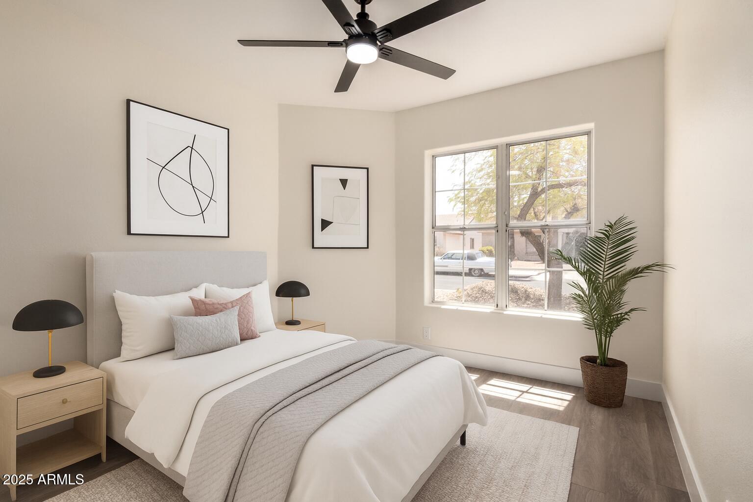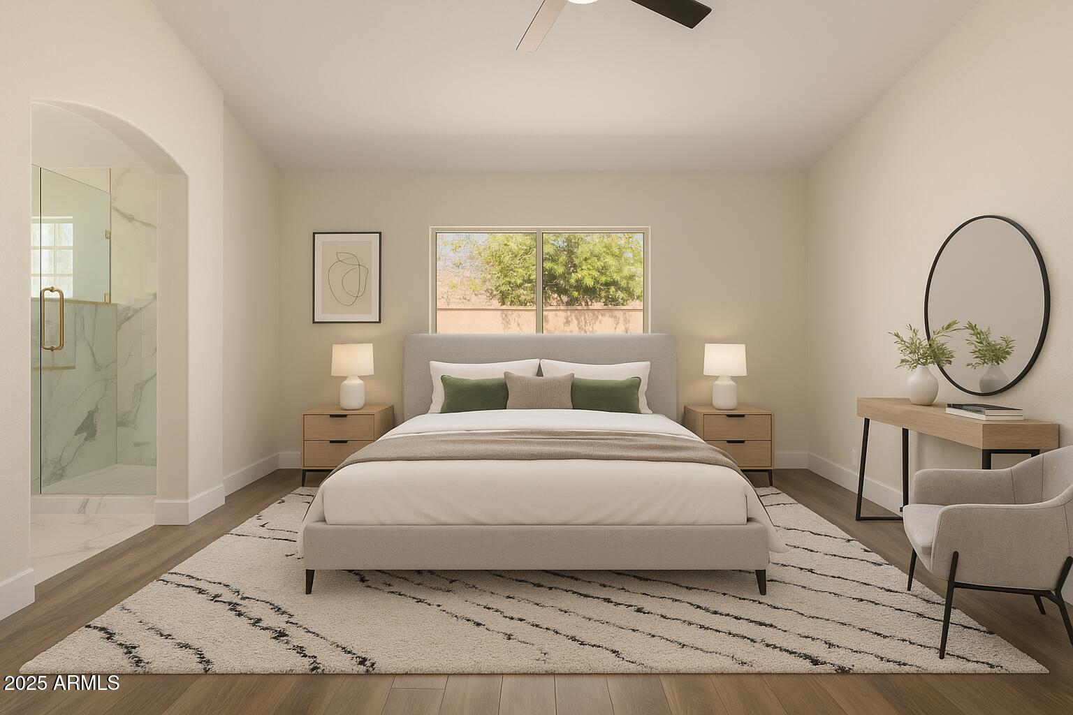 Be amazed by this adorable single-story home in Glendale, AZ! Highly upgraded interior boasts wood-look flooring, vaulted ceilings, stylish light fixtures, fresh neutral paint, and ceiling fans. Desirable open floor plan maximizes space, offering an airy feel and effortless flow for daily living. Renewed kitchen displays brand new stainless steel appliances, white cabinets with crown moulding, quartz counters, and a custom island with a breakfast bar. Serene primary bedroom provides a walk-in closet and a pristine ensuite comprised of dual sinks, a garden tub with a glass block window, and a floor-to-ceiling tiled shower. Continue onto the large backyard, which includes a covered patio and a convenient storage shed. Hurry! This gem is turnkey ready to move in and enjoy! BRAND NEW A/C !!