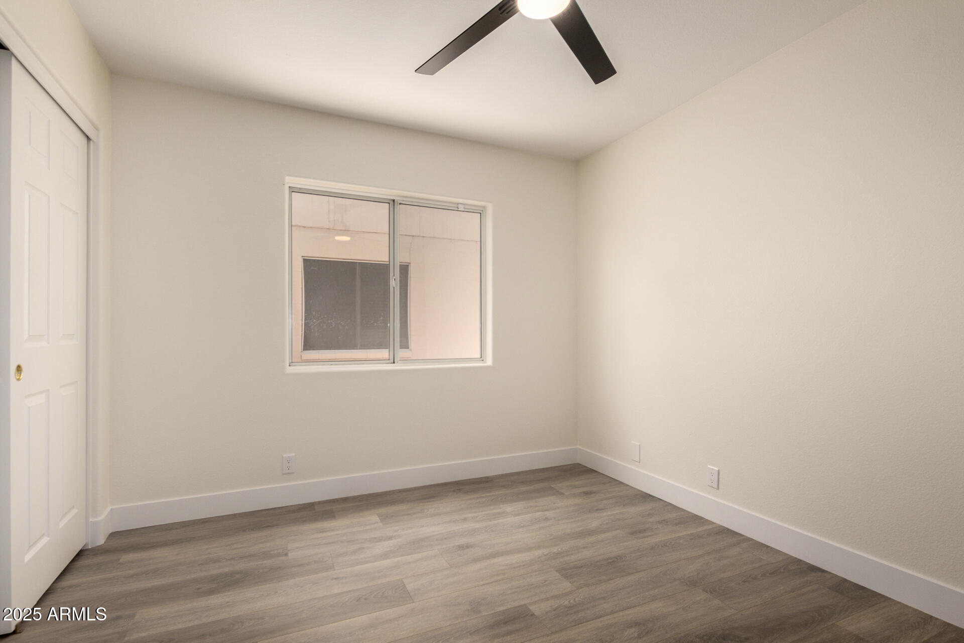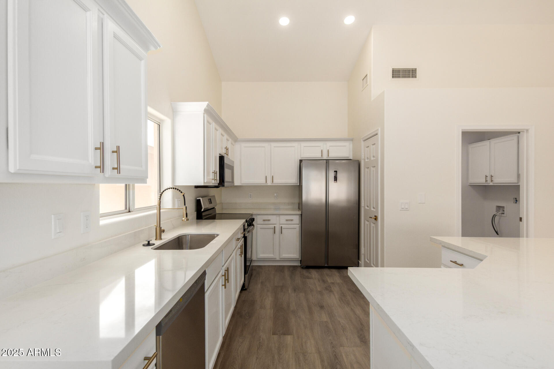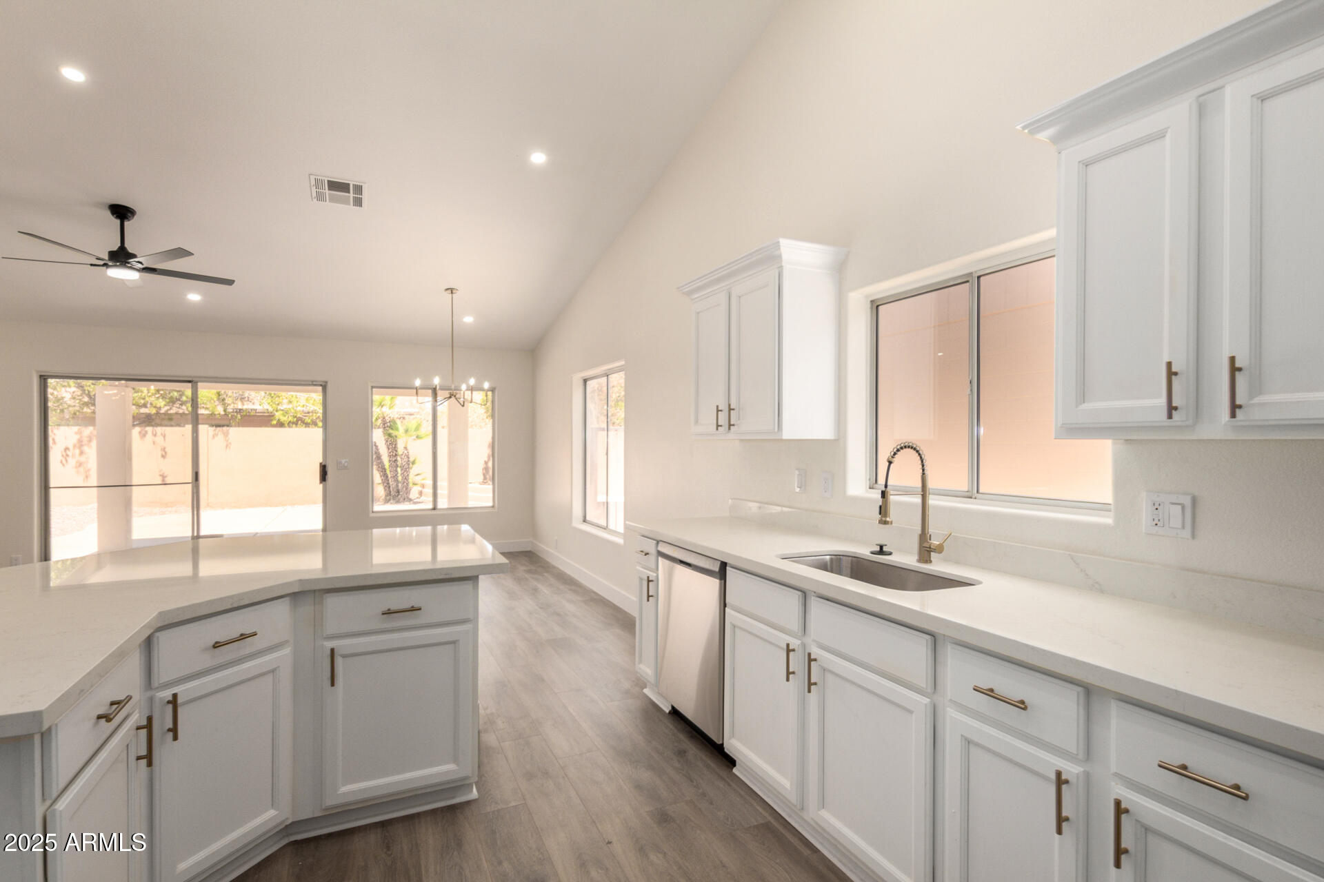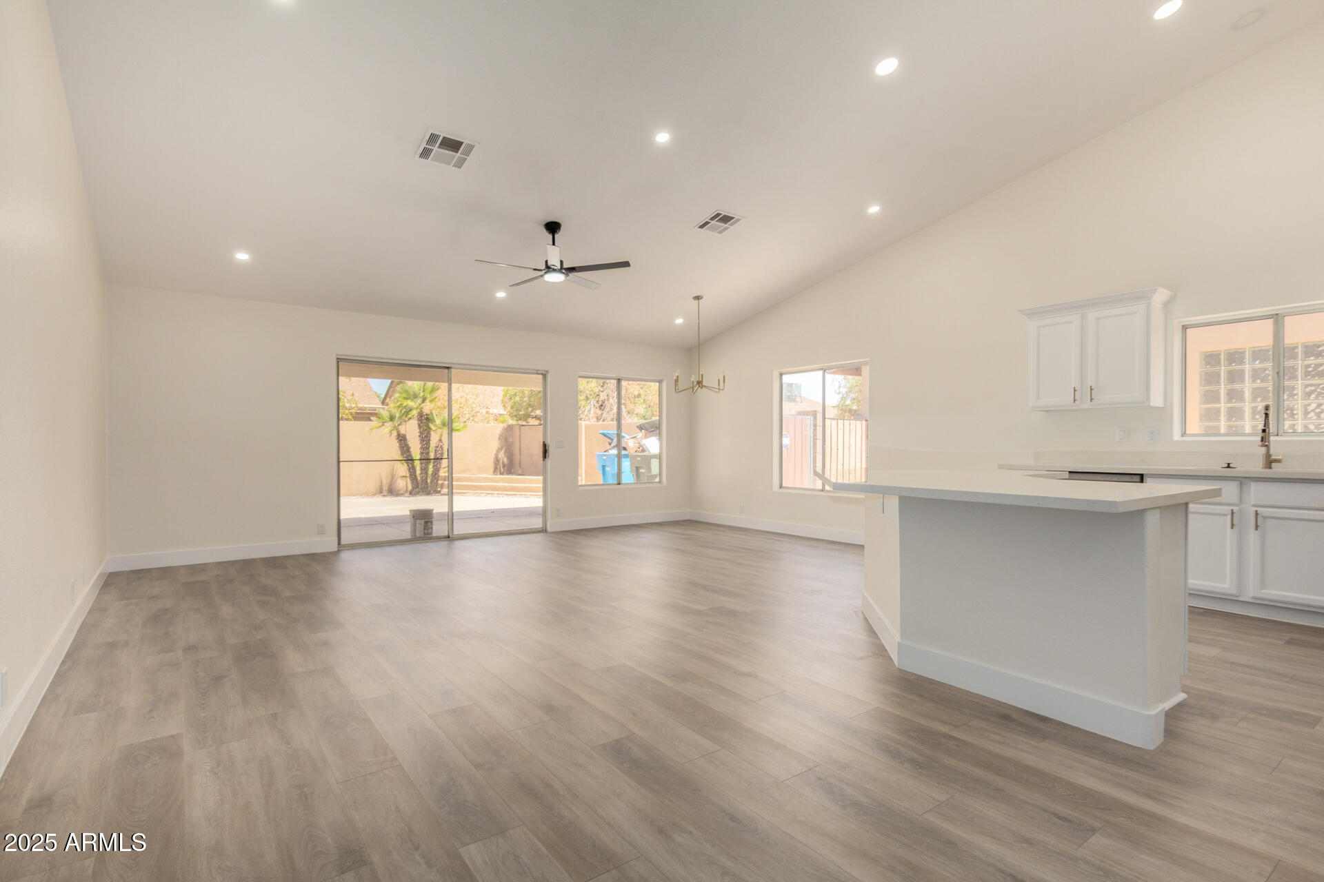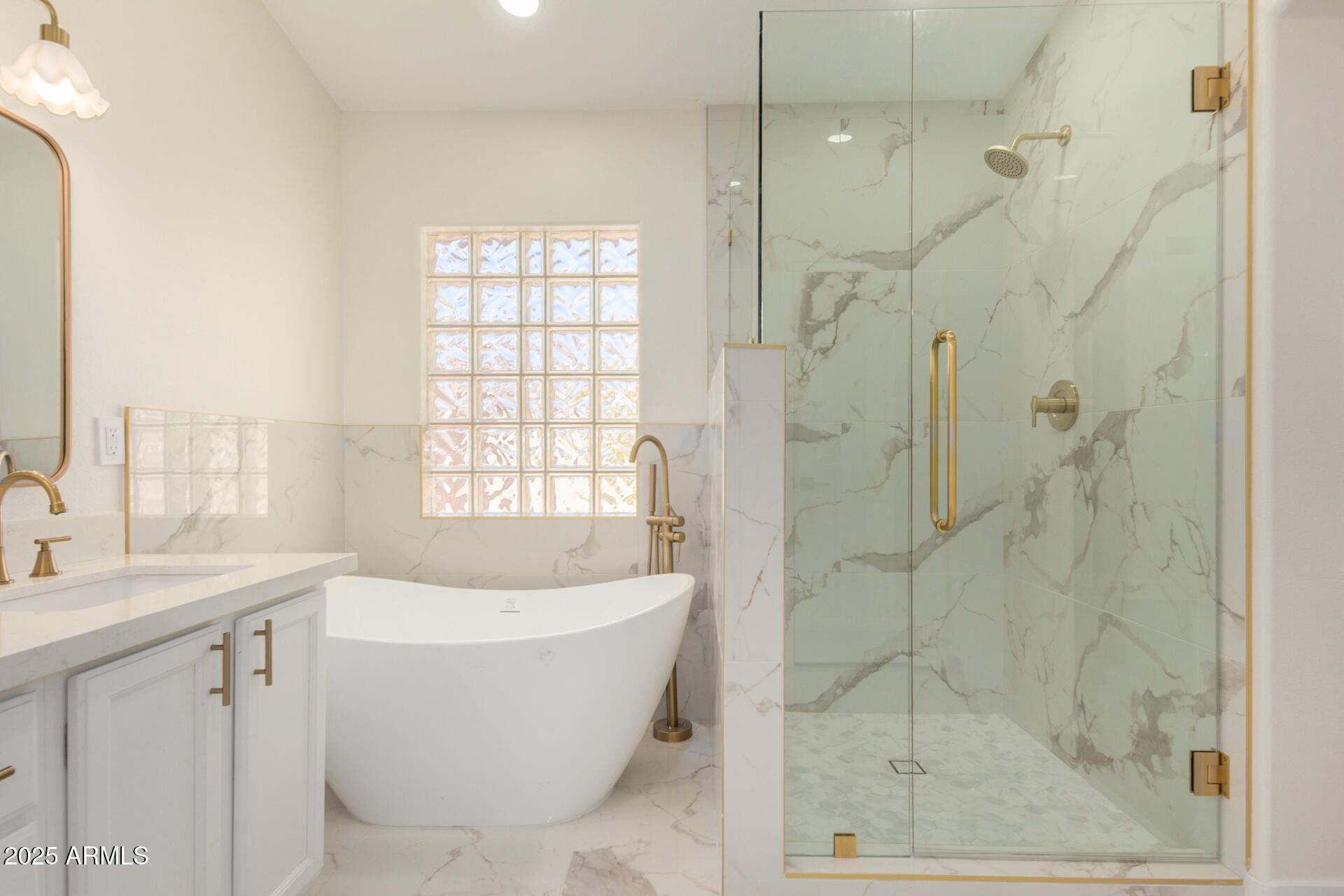 Be amazed by this adorable single-story home in Glendale, AZ! Highly upgraded interior boasts wood-look flooring, vaulted ceilings, stylish light fixtures, fresh neutral paint, and ceiling fans. Desirable open floor plan maximizes space, offering an airy feel and effortless flow for daily living. Renewed kitchen displays brand new stainless steel appliances, white cabinets with crown moulding, quartz counters, and a custom island with a breakfast bar. Serene primary bedroom provides a walk-in closet and a pristine ensuite comprised of dual sinks, a garden tub with a glass block window, and a floor-to-ceiling tiled shower. Continue onto the large backyard, which includes a covered patio and a convenient storage shed. Hurry! This gem is turnkey ready to move in and enjoy! BRAND NEW A/C !!