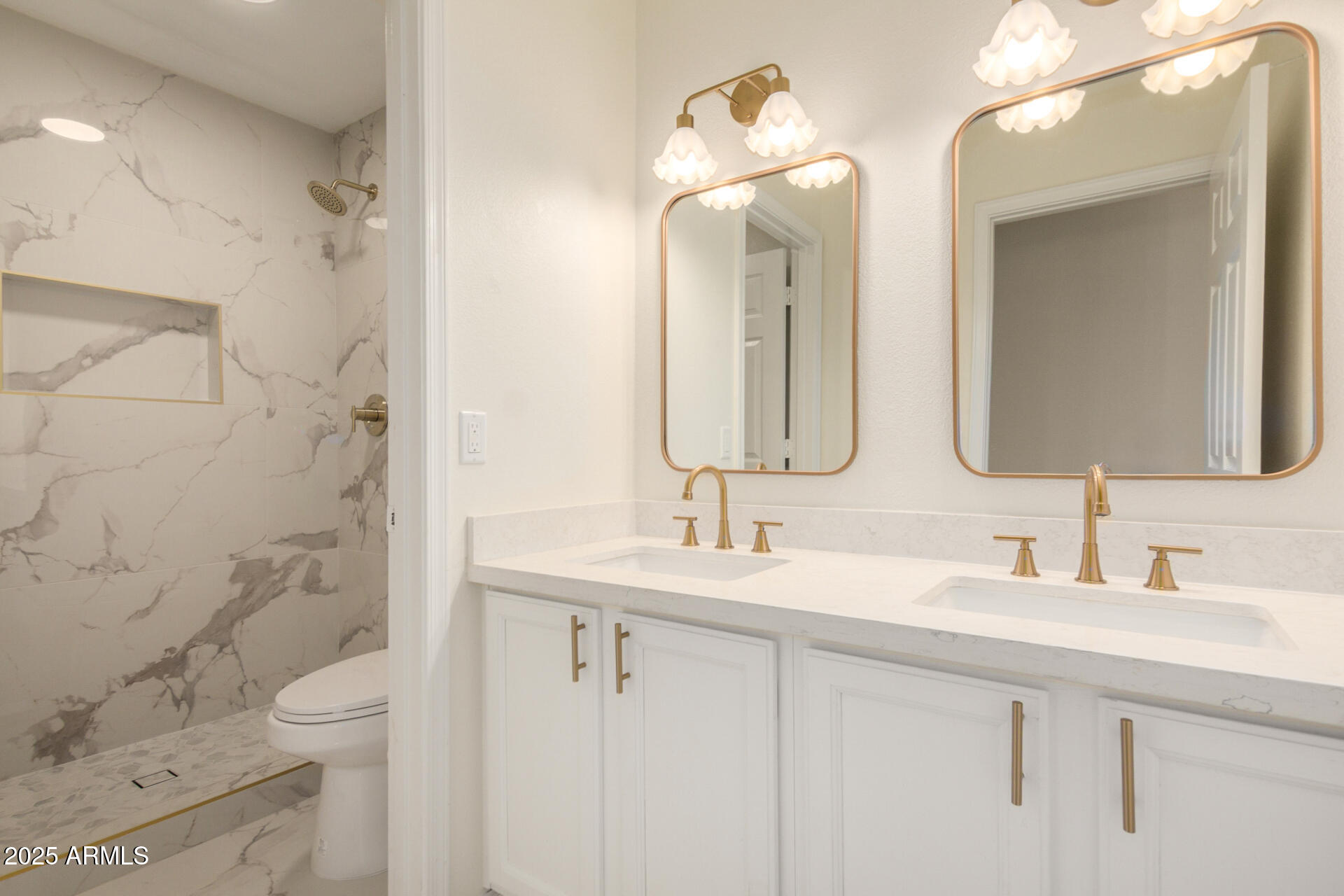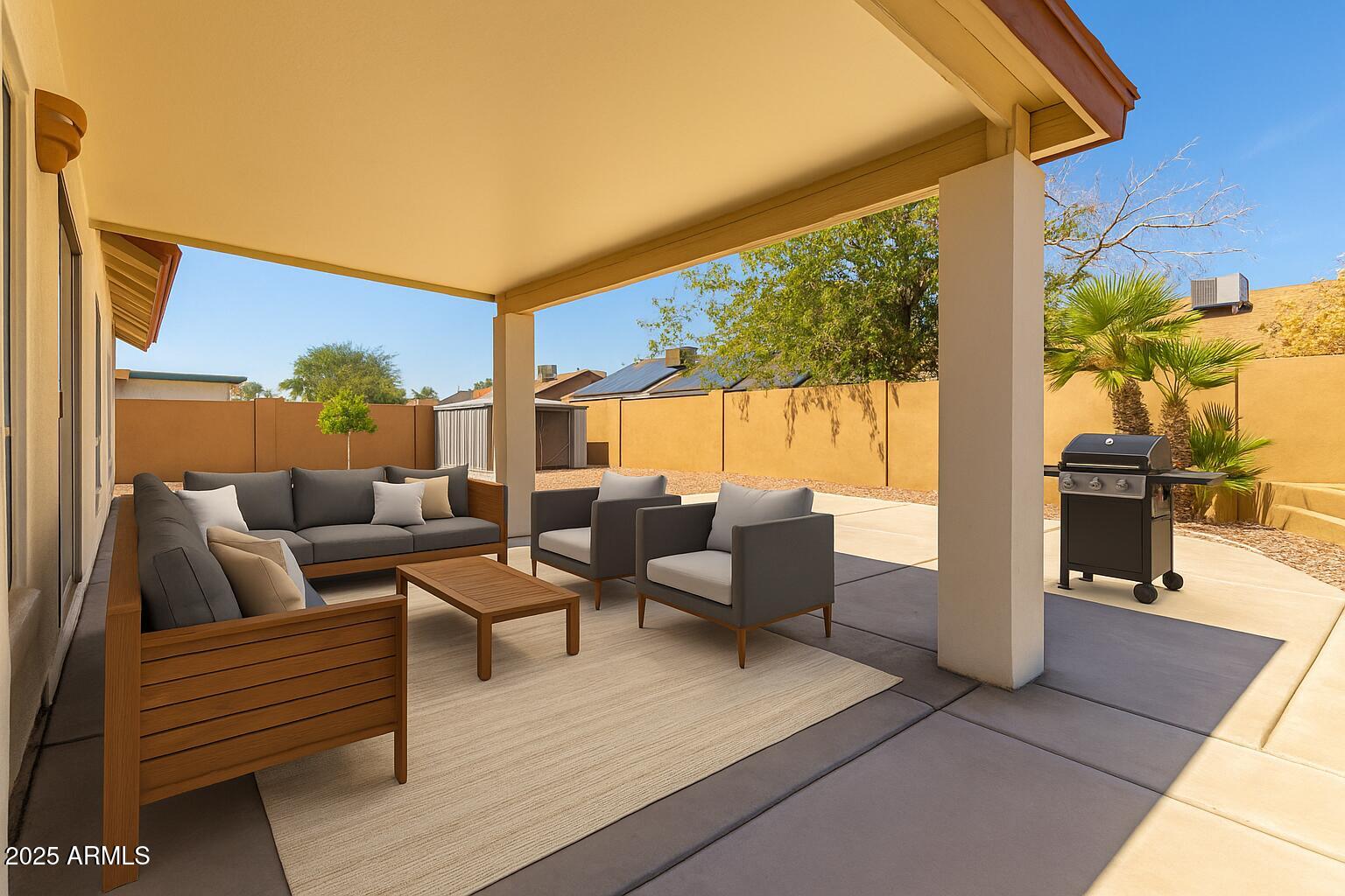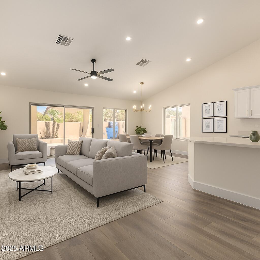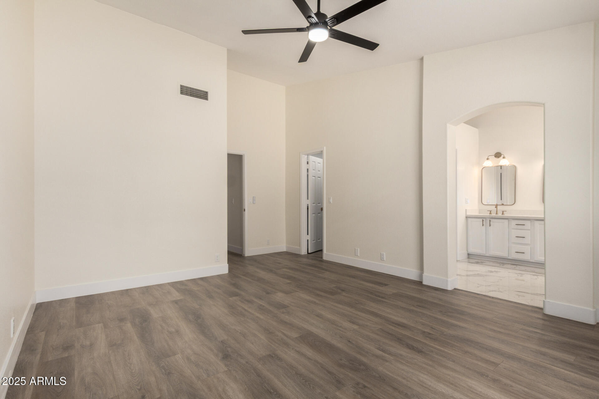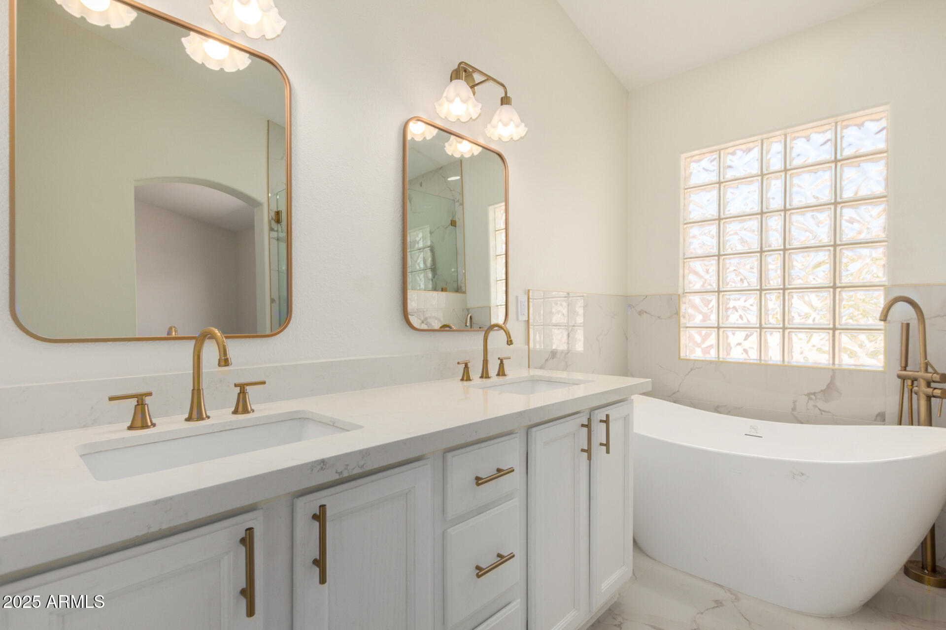 Be amazed by this adorable single-story home in Glendale, AZ! Highly upgraded interior boasts wood-look flooring, vaulted ceilings, stylish light fixtures, fresh neutral paint, and ceiling fans. Desirable open floor plan maximizes space, offering an airy feel and effortless flow for daily living. Renewed kitchen displays brand new stainless steel appliances, white cabinets with crown moulding, quartz counters, and a custom island with a breakfast bar. Serene primary bedroom provides a walk-in closet and a pristine ensuite comprised of dual sinks, a garden tub with a glass block window, and a floor-to-ceiling tiled shower. Continue onto the large backyard, which includes a covered patio and a convenient storage shed. Hurry! This gem is turnkey ready to move in and enjoy! BRAND NEW A/C !!