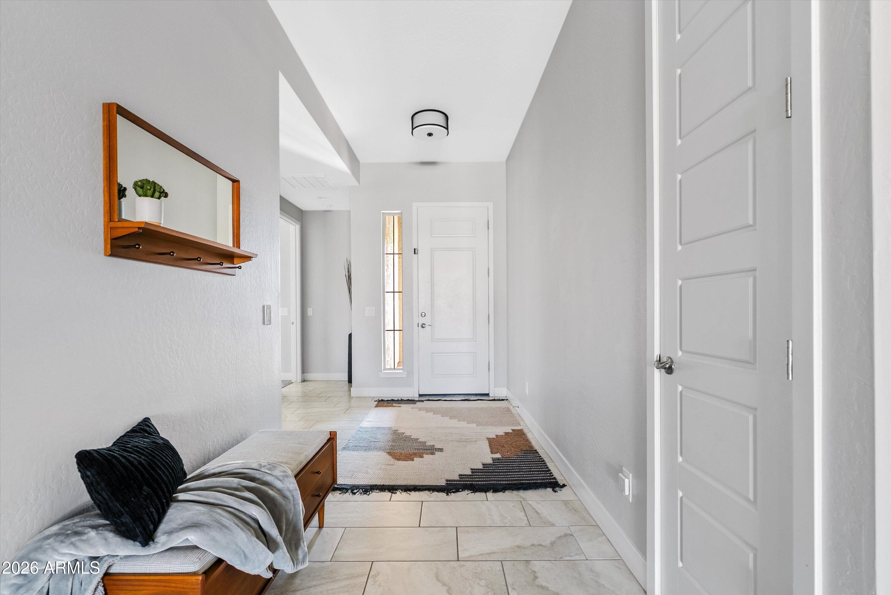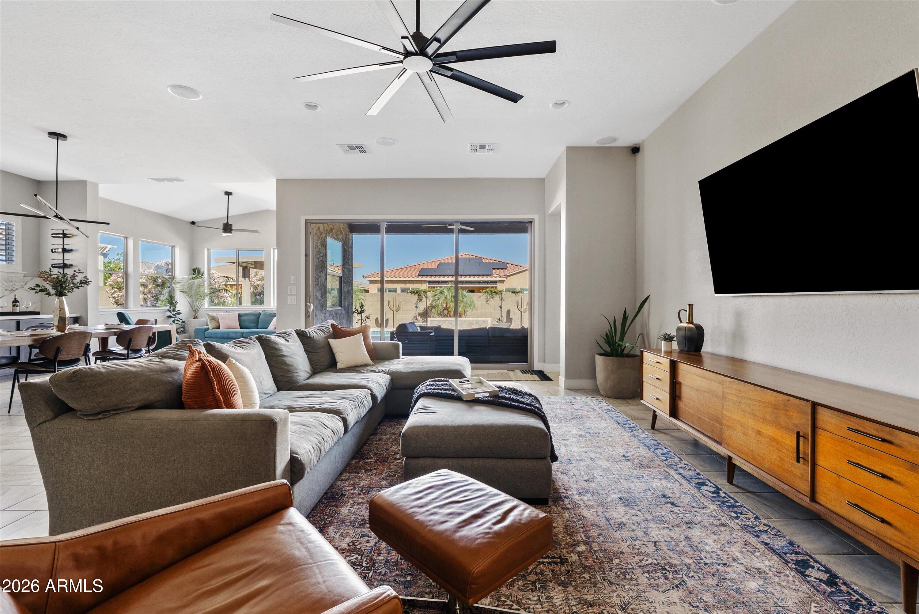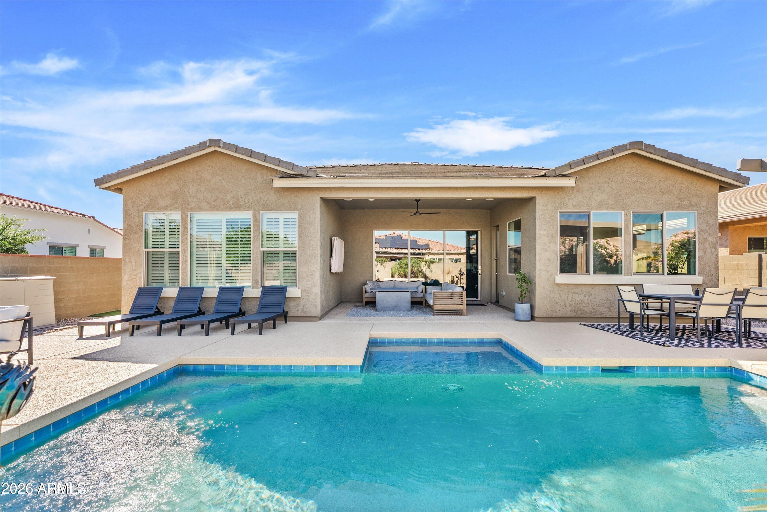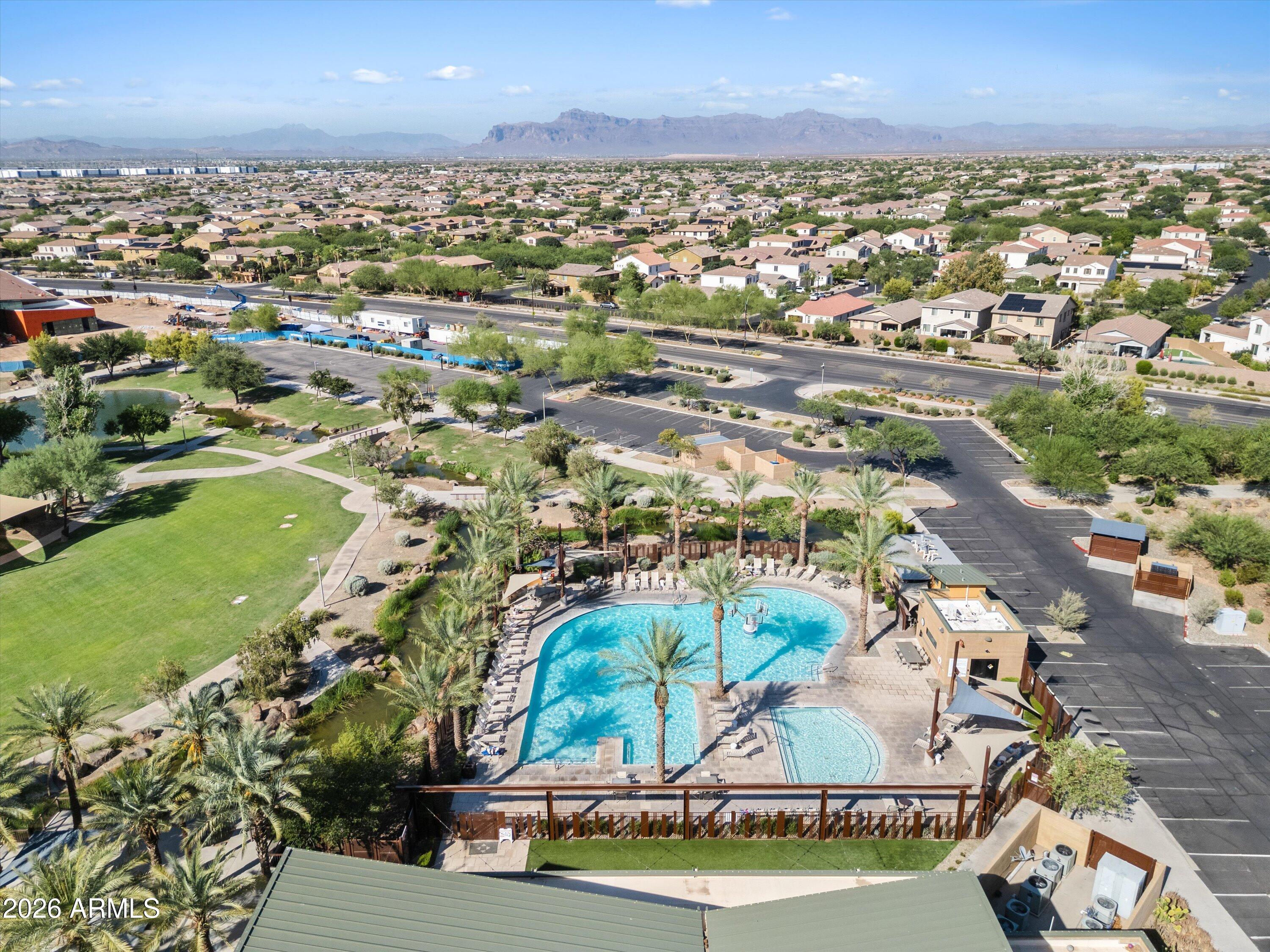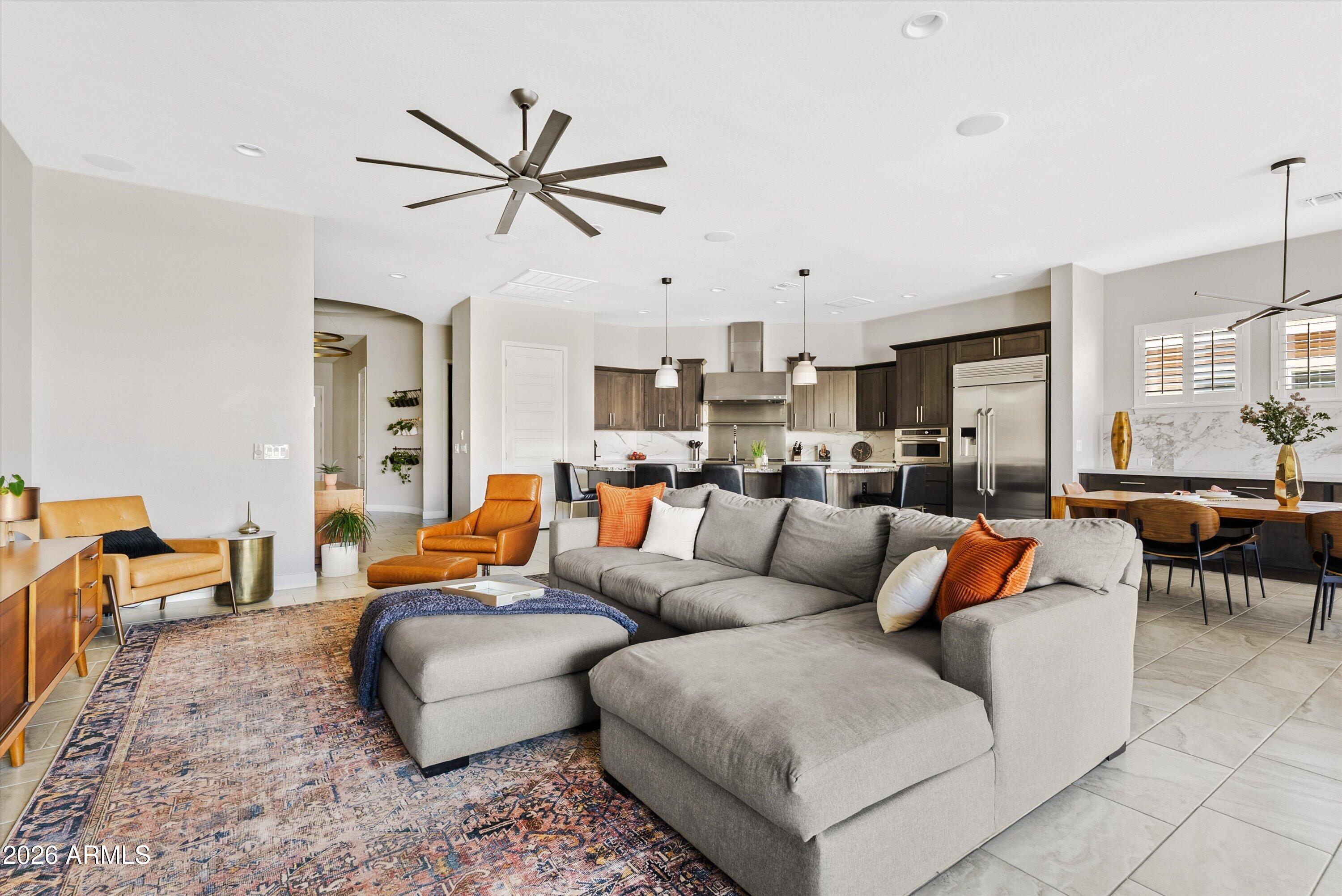 Located in the exclusive gated David Weekley community within Eastmark, this exceptional corner lot home offers luxury, privacy, and thoughtful design with stunning mountain views. The moment you drive through the gates, it feels like you've left Eastmark entirely. Wider streets, larger lots, and all single-story homes create a quiet, elevated experience you won't find anywhere else in the community. Flooded with natural light, the open-concept layout creates a bright, inviting atmosphere.
