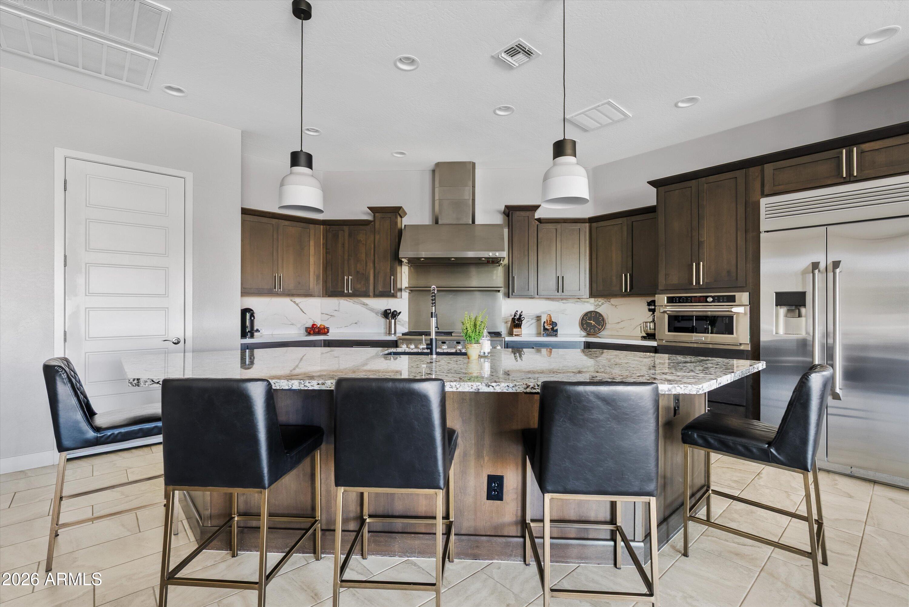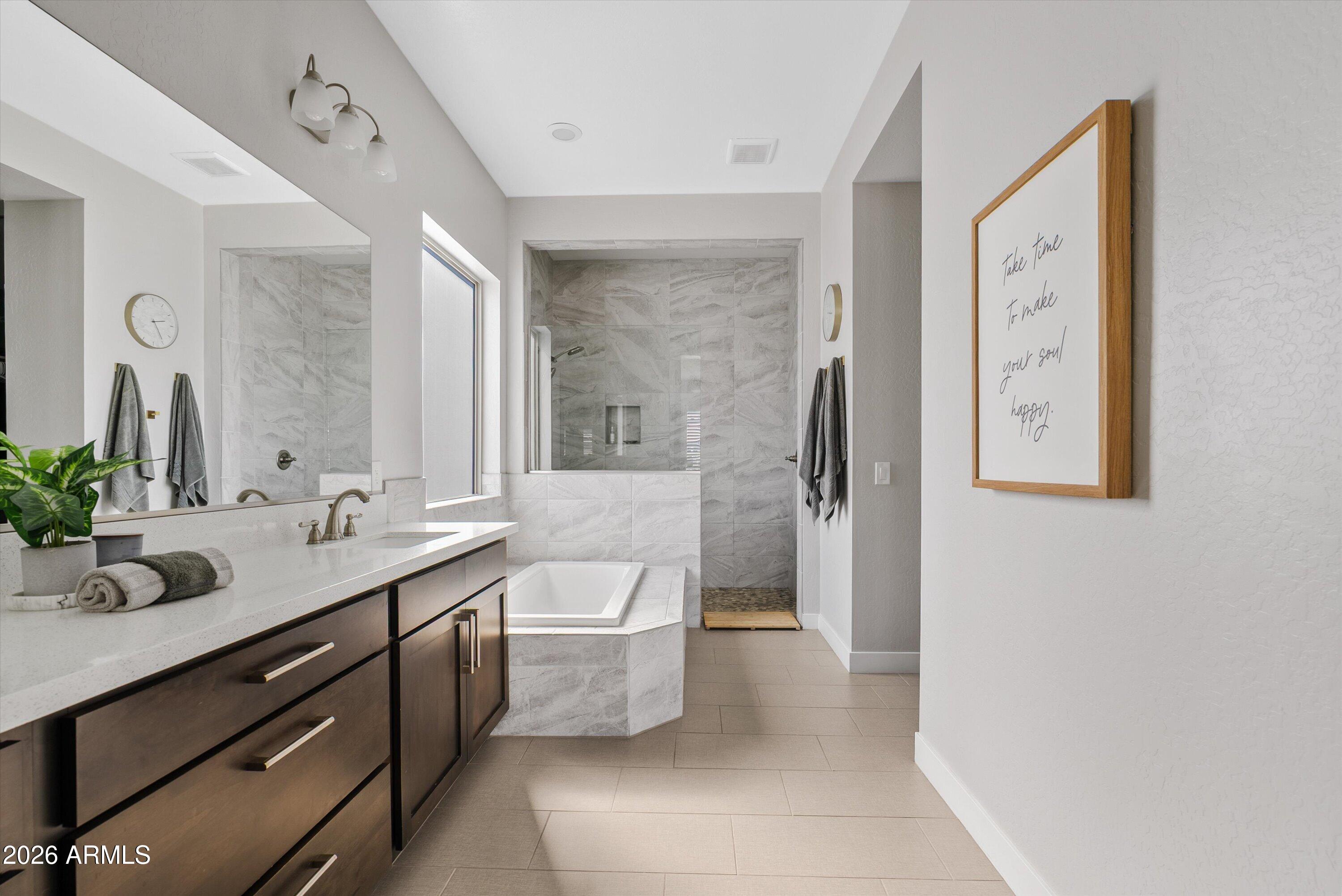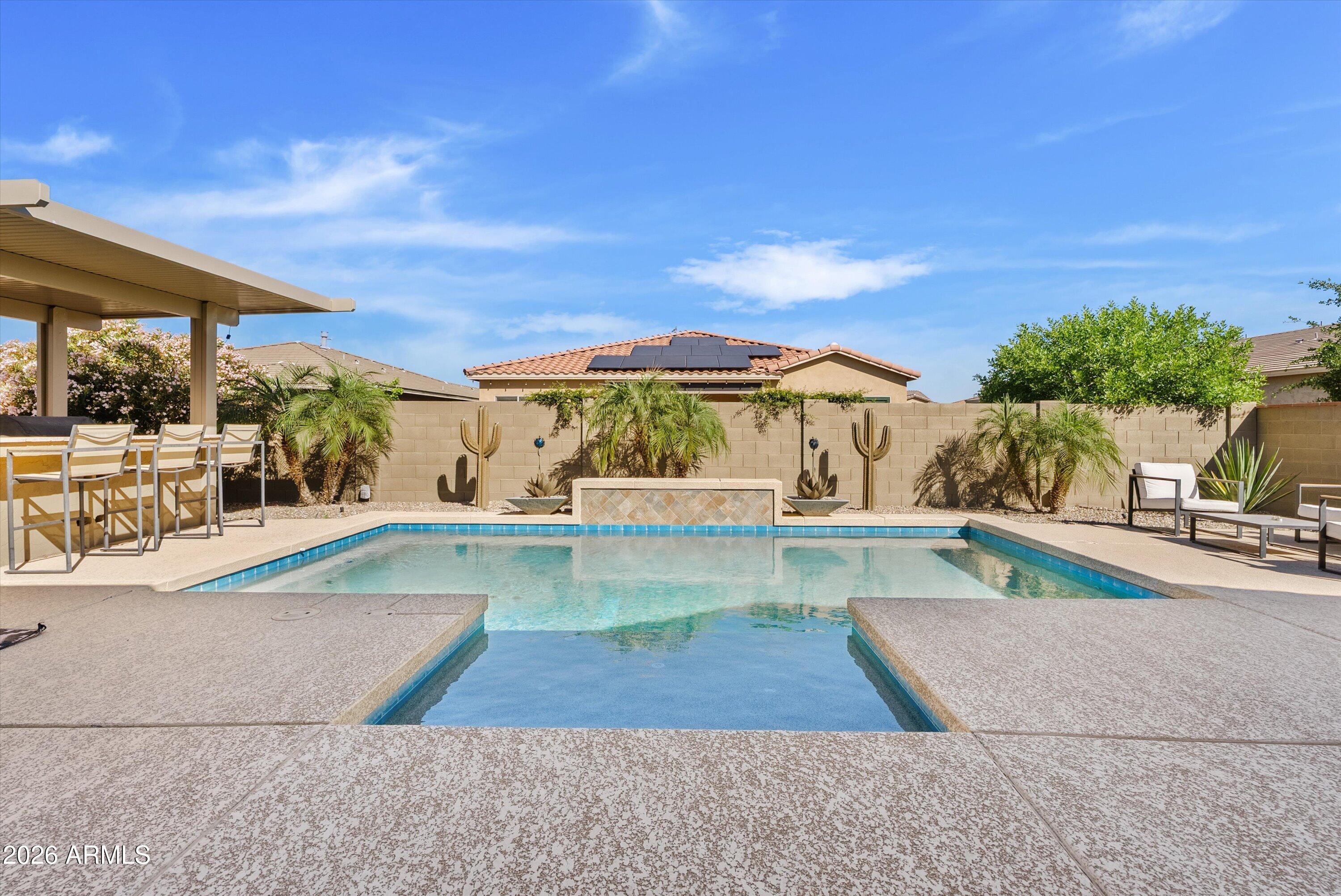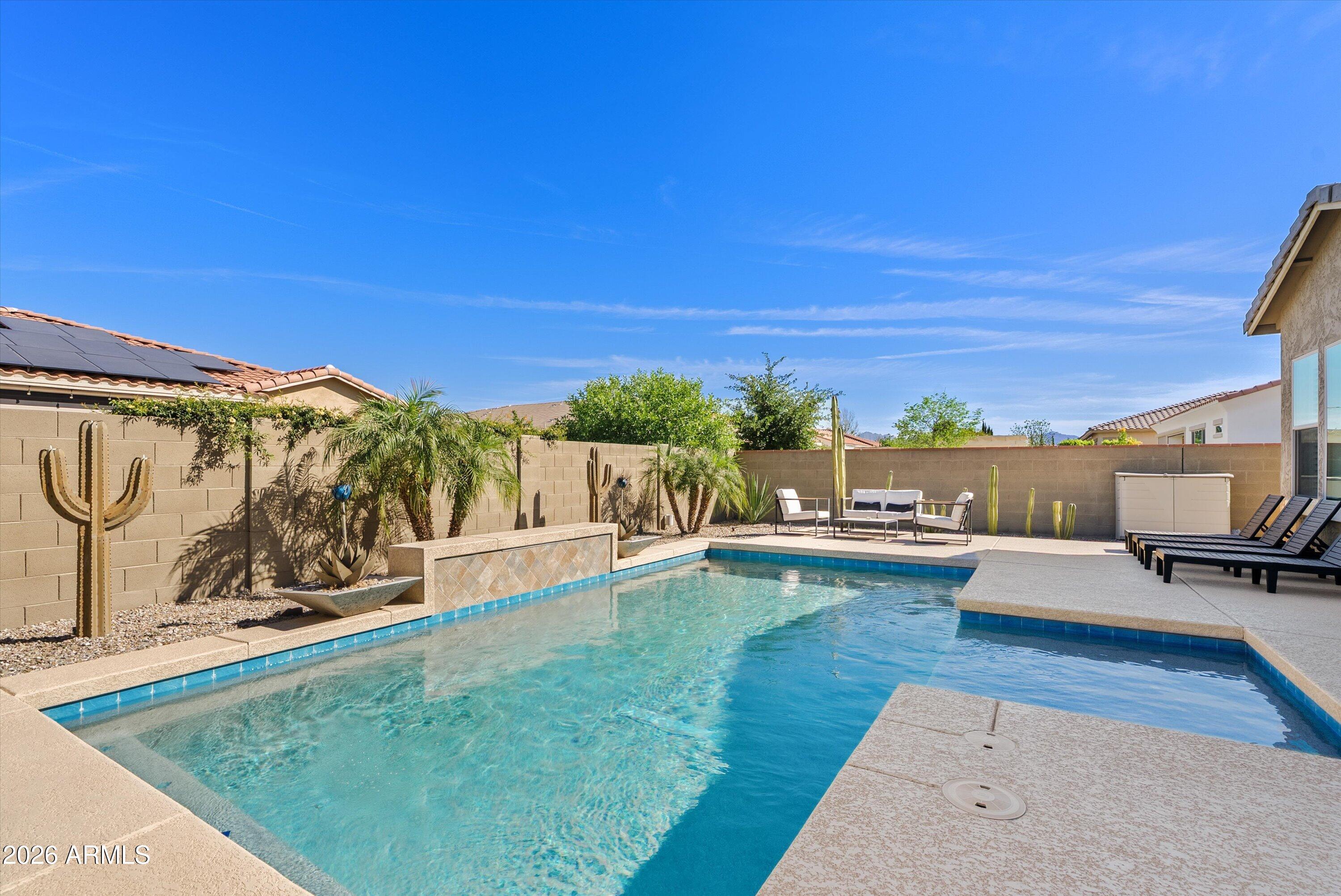 Located in the exclusive gated David Weekley community within Eastmark, this exceptional corner lot home offers luxury, privacy, and thoughtful design with stunning mountain views. The moment you drive through the gates, it feels like you've left Eastmark entirely. Wider streets, larger lots, and all single-story homes create a quiet, elevated experience you won't find anywhere else in the community. Flooded with natural light, the open-concept layout creates a bright, inviting atmosphere.