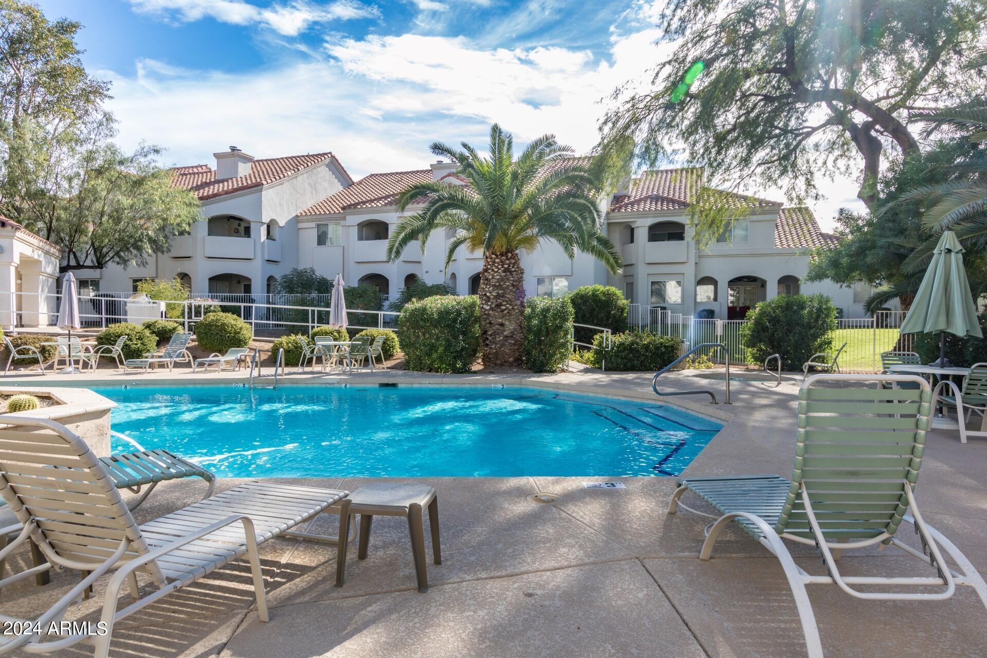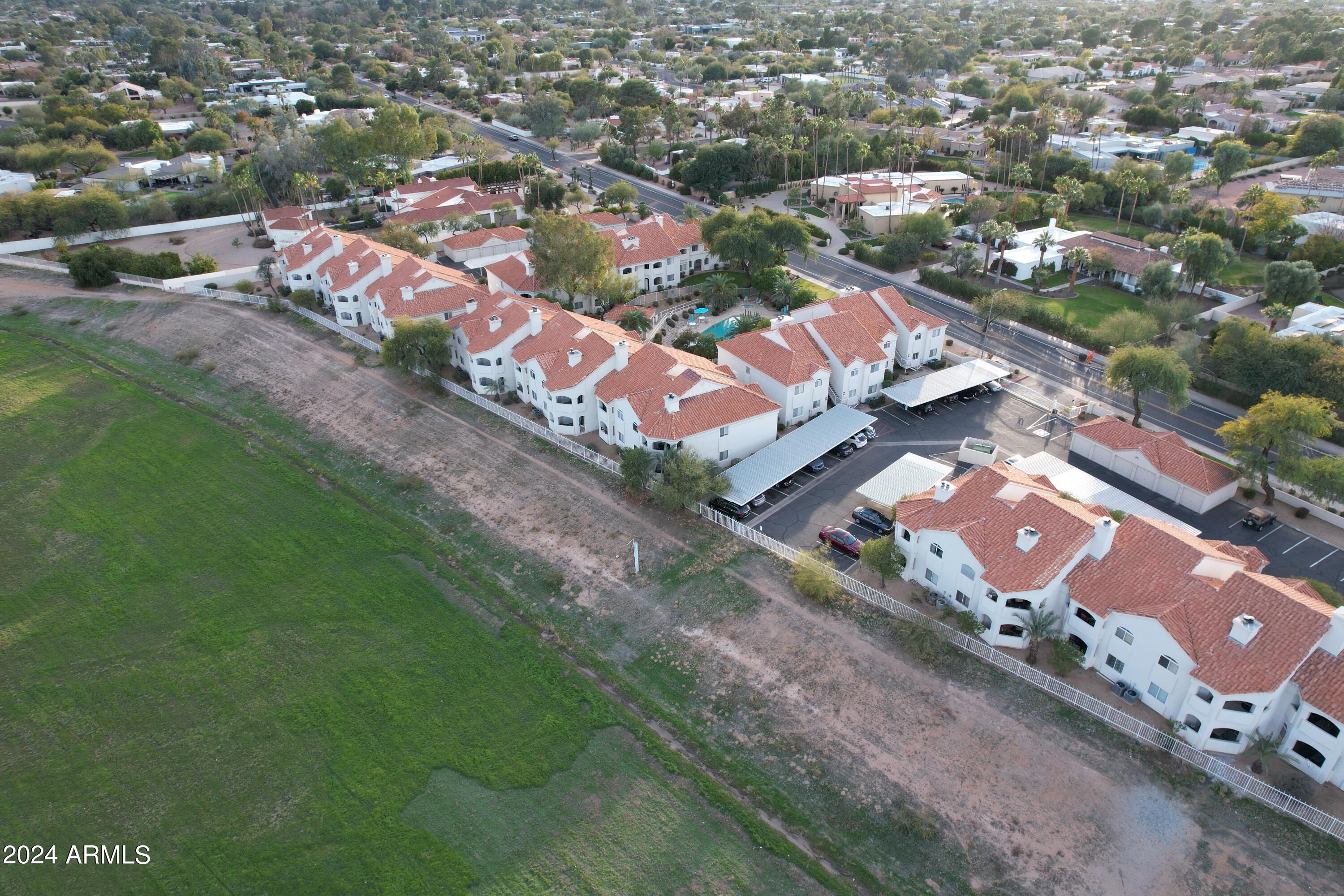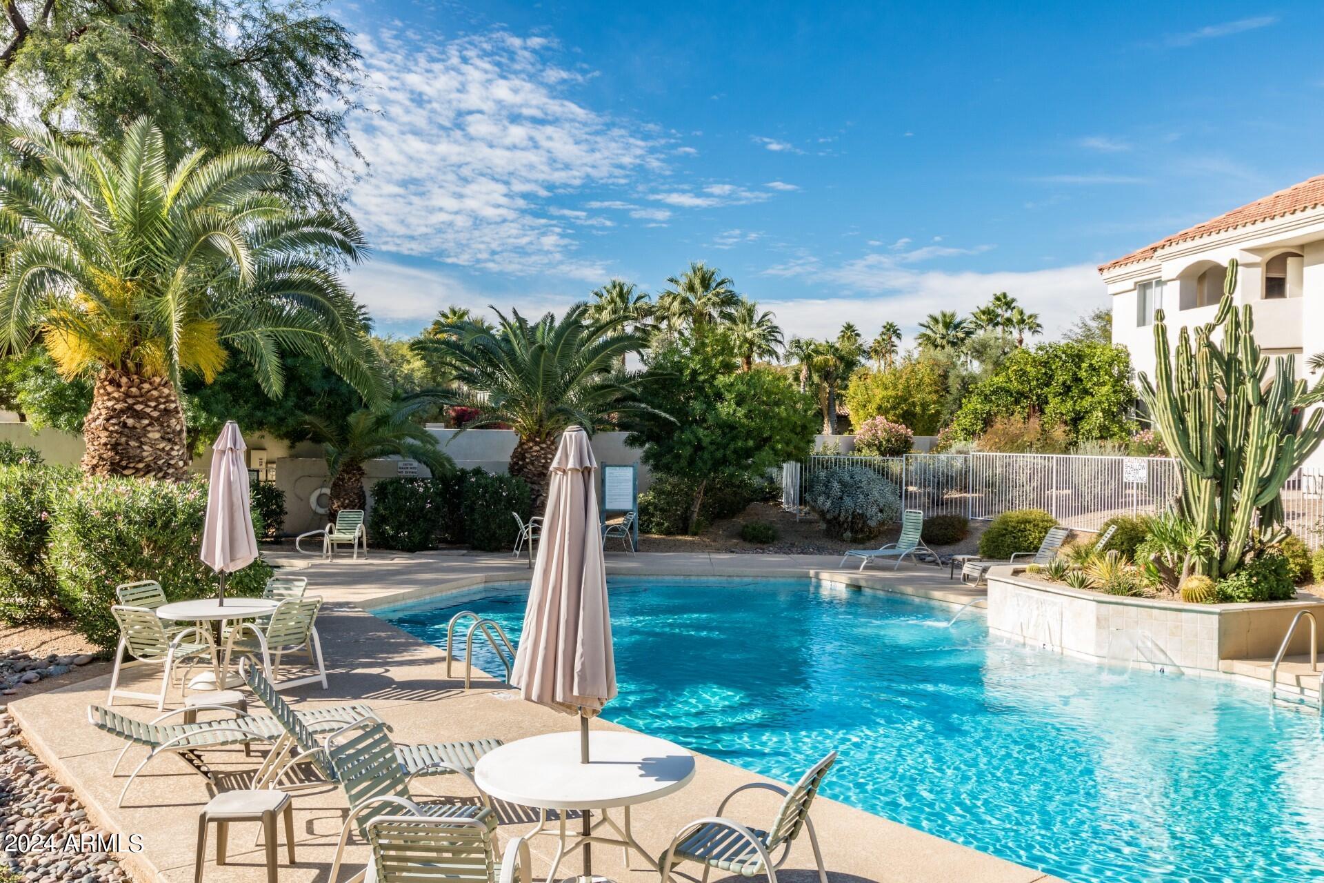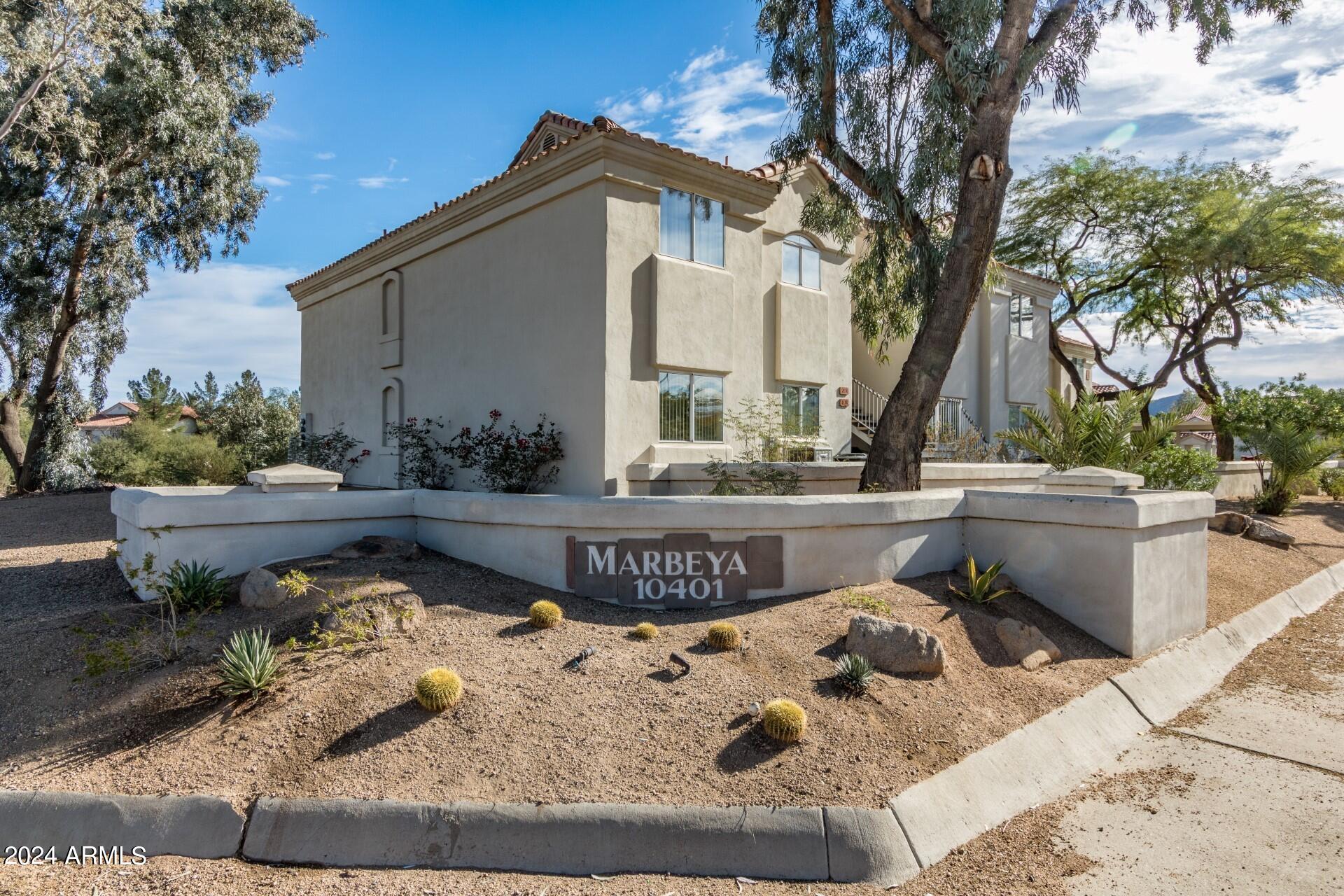 Rare opportunity to own a fully furnished turn key asset! This second floor end unit sits in the highly sought after Paradise Valley subdivision of Marbeya! Whether you are looking for your new home or home away from home this cozy 2 bed 2 bath condo is sure to please. Step into the tranquility of this centralized end unit and be amazed at the soaring vaulted ceilings, wood burning fireplace, custom color palette, granite counters, SS appliances, and wood floors. The kitchen and common area is a chef and entertainers delight. The floor pan is ideal with bedrooms on opposite ends of the unit and storage in all the right places. Both bedrooms are equipped with large walk in closets and the master boasts an en suite! The patio is equipped with laundry and looks over the Indian Bend wash.