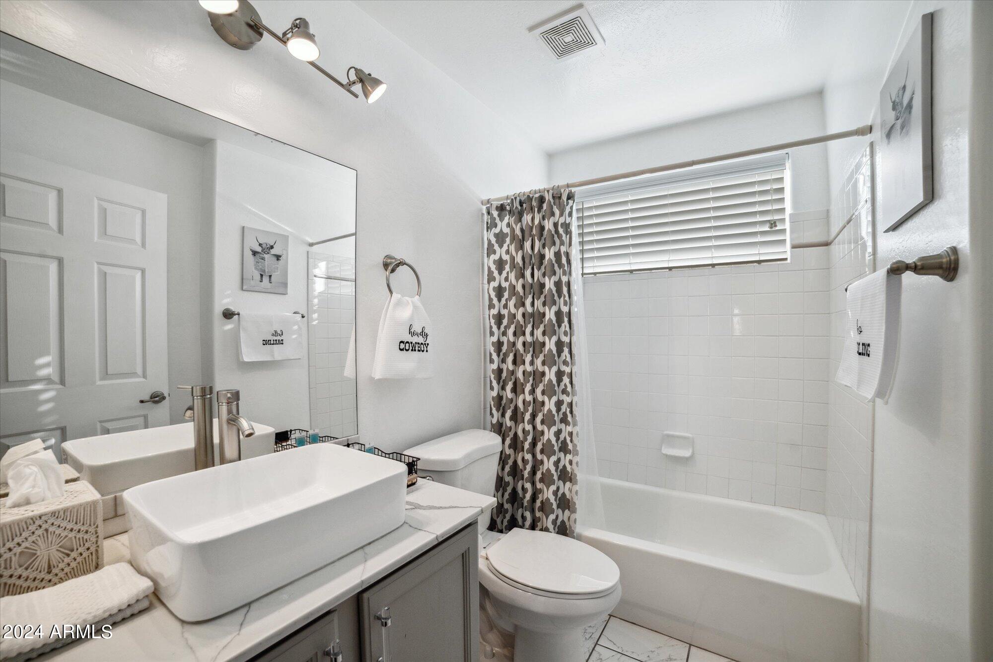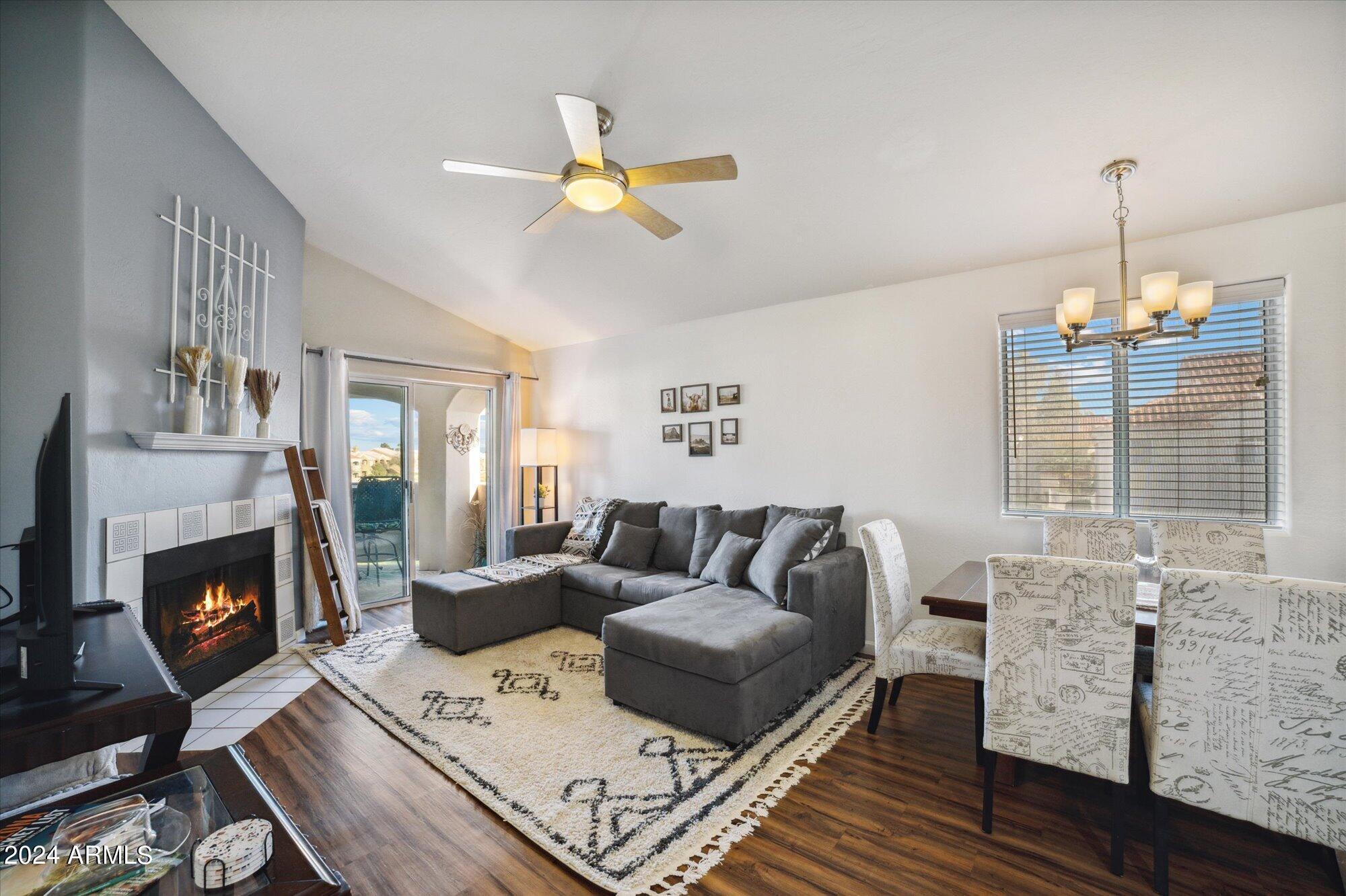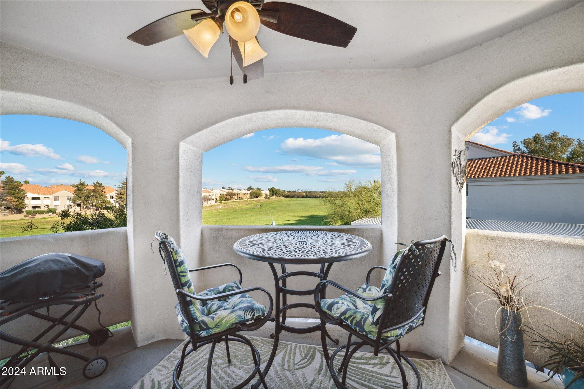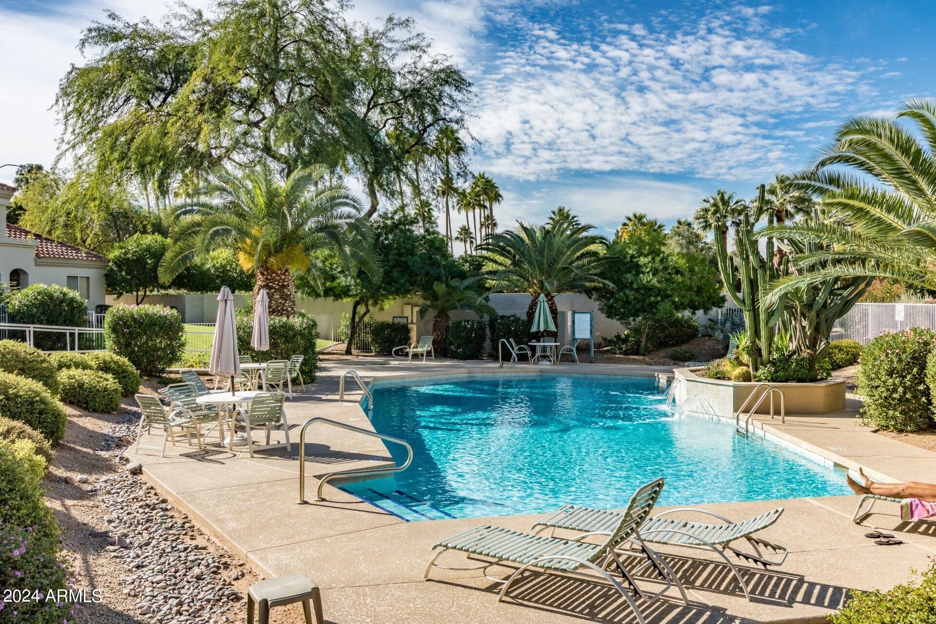 Rare opportunity to own a fully furnished turn key asset! This second floor end unit sits in the highly sought after Paradise Valley subdivision of Marbeya! Whether you are looking for your new home or home away from home this cozy 2 bed 2 bath condo is sure to please. Step into the tranquility of this centralized end unit and be amazed at the soaring vaulted ceilings, wood burning fireplace, custom color palette, granite counters, SS appliances, and wood floors. The kitchen and common area is a chef and entertainers delight. The floor pan is ideal with bedrooms on opposite ends of the unit and storage in all the right places. Both bedrooms are equipped with large walk in closets and the master boasts an en suite! The patio is equipped with laundry and looks over the Indian Bend wash.