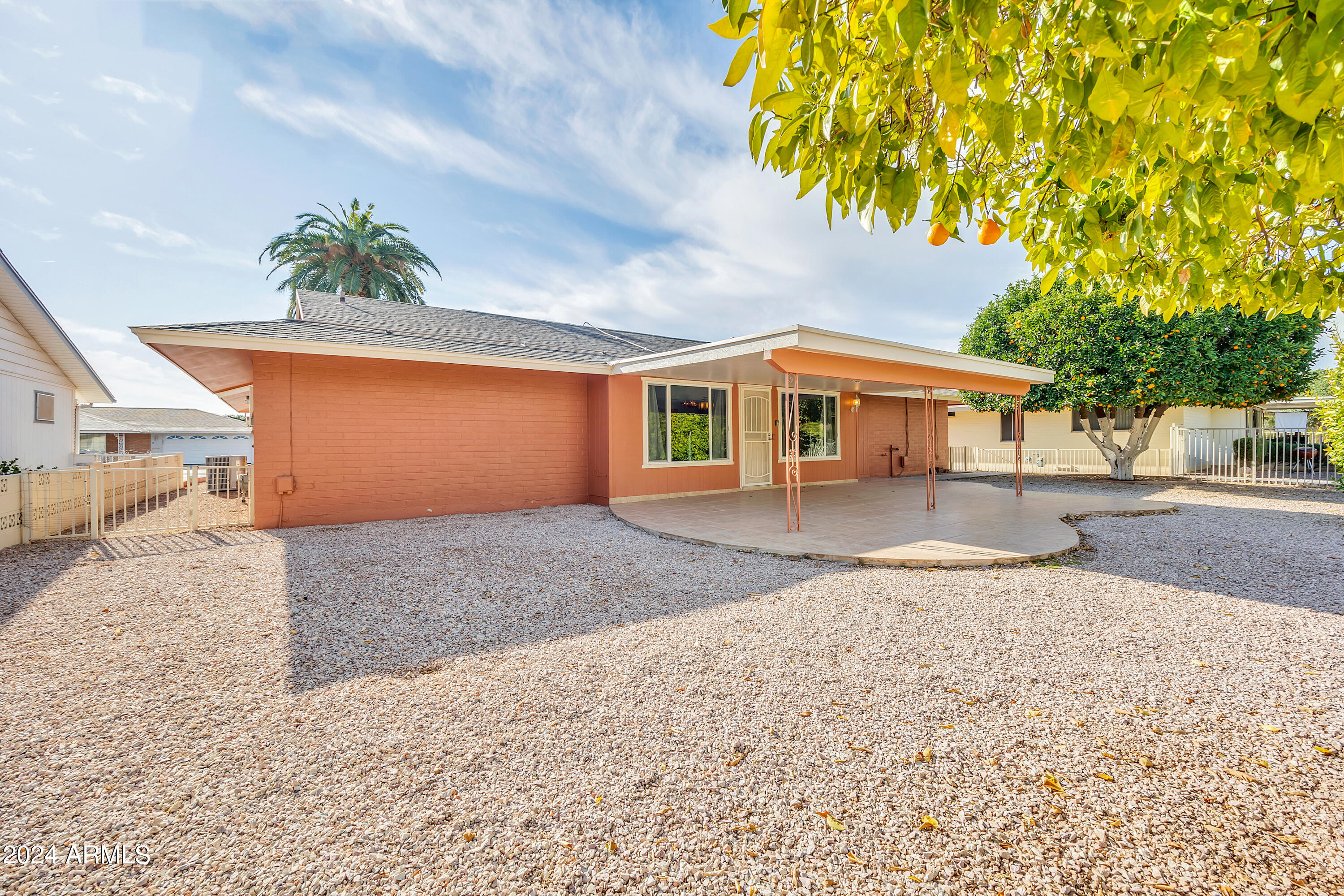 Welcome to a beautiful, energy-efficient solar home in the golf course community of Sun City! This meticulously maintained residence boasts a new roof and water heater, ensuring worry-free living. Enjoy the ideal N/S exposure and a host of updates, including an updated kitchen and flooring. Step inside to a tastefully updated interior featuring 2 bedrooms, 2 baths, and a den. The home exudes charm with pristine curb appeal and a welcoming entry. The interior is adorned with a crisp palette, ceiling fans, neutral tiled floors, a formal dining area, and upgraded lighting. The kitchen is a chef's delight, showcasing granite counters, an under-mount sink, and ample wood cabinetry with hardware. Luxurious touches include plush carpeting in all the right places, window blinds, upscale baths with granite counters, and a walk-in tub feature. The extended covered patio beckons outdoor entertaining, surrounded by desert plants for added ambiance. This home is not only a haven but also part of a welcoming community with delightful neighbors. Residents have exclusive access to the community heated pool, spa, and clubhouse, ensuring a lifestyle of relaxation and enjoyment. Don't miss the opportunity to call this Sun City gem your own!
