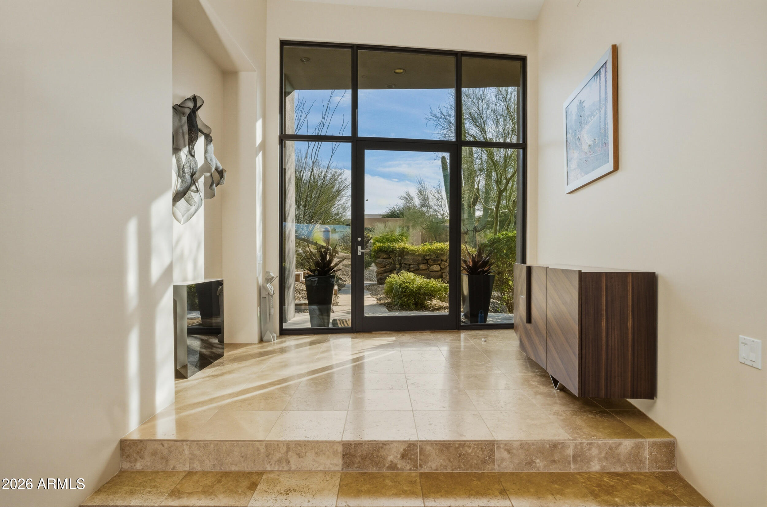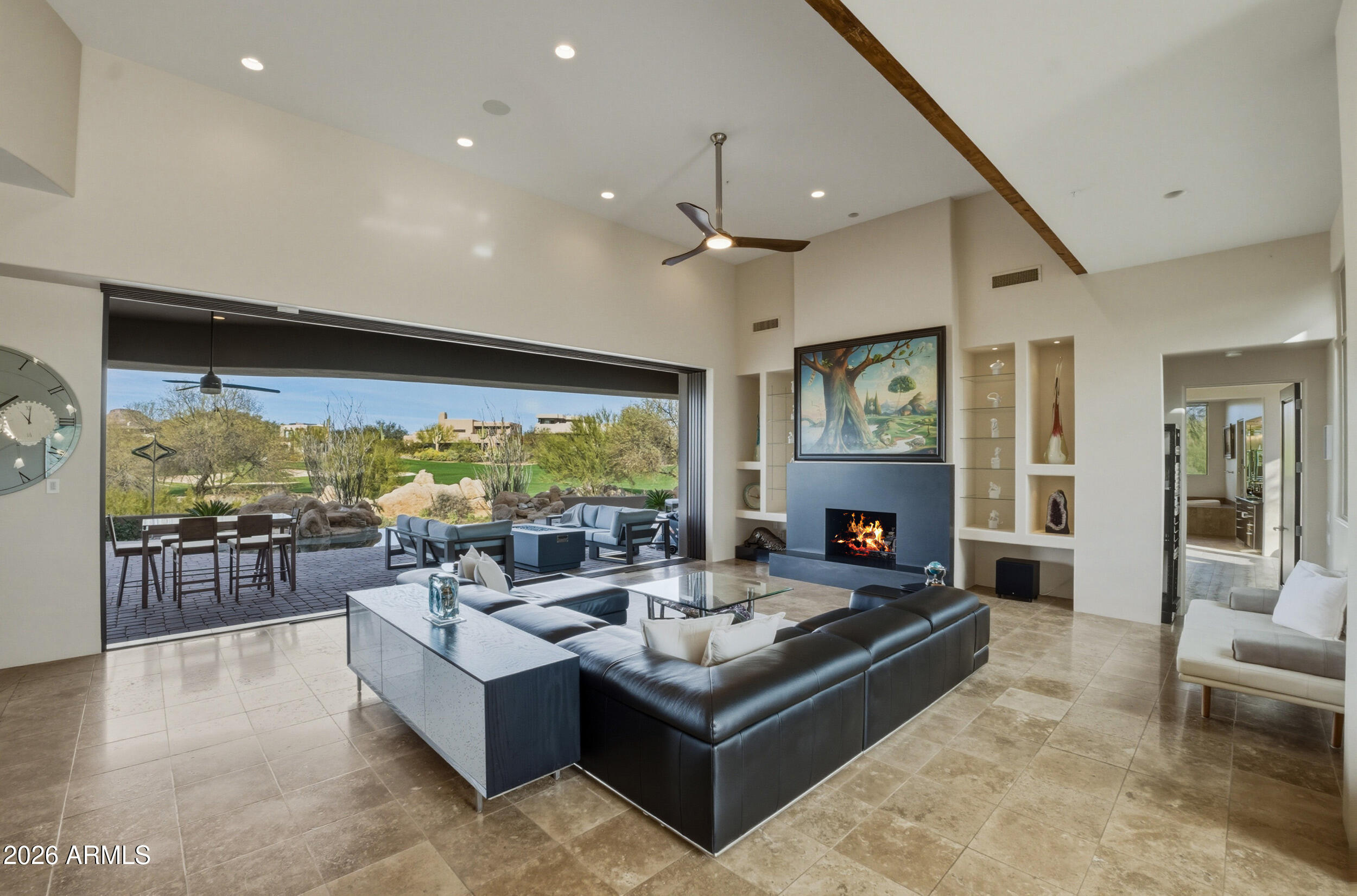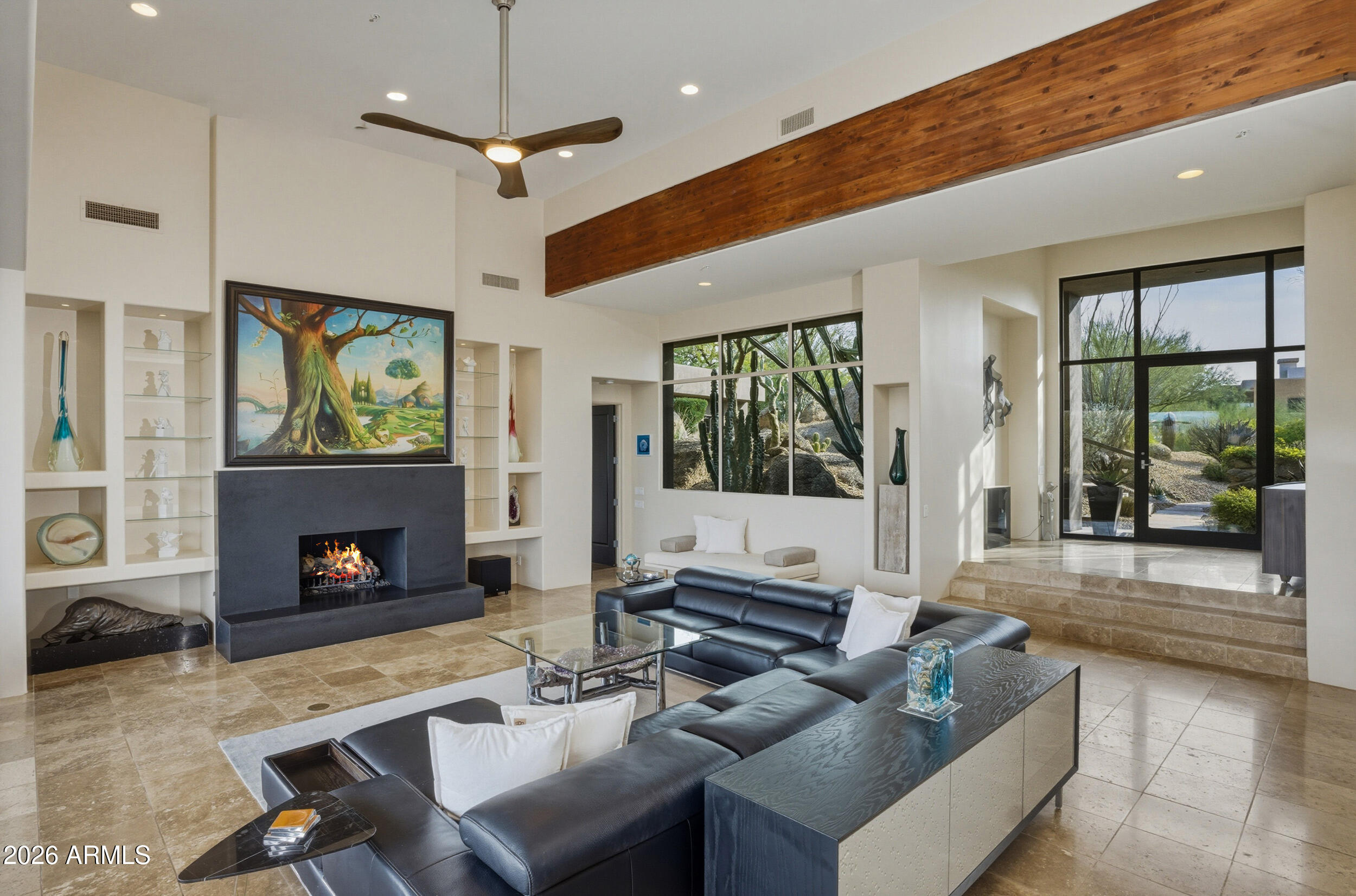 Located within the Troon Guard Gated neighborhood, this exceptional retreat offers resort-style living w/ sweeping VIEWS of the 15th fairway & surrounding mountains. Main residence complemented by 739sf detached guest casita, set on an expansive 0.674 acre lot designed for privacy & entertaining. Open-concept interior showcases vaulted ceilings, dramatic double-sided gas fireplace anchoring main living spaces + custom sliding & electronic pocket doors opening the great room to the backyard patio & pool. Chef's kitchen outfitted w/ high-end SS-appliances including Dacor, Sub-Zero, & Bosch, along w/ RO & a Grohe Blue chilled & sparkling water system. Luxurious primary retreat features spacious walk-in closet & spa-inspired 5pc bath, while each additional bedroom offers its own en-suite bath. Guest casita offers full privacy w/ kitchenette, full bath, laundry, & private patio. Theater & bonus lounge w/ wine storage & beverage fridge adds to the home's entertainment appeal. Resort-inspired outdoor entertaining space w/ negative-edge pool & spa, expansive covered patio, built-in BBQ, rooftop terrace, & breathtaking golf course & mountain views. Additional highlights include new roof, 3-car painted garage w/ epoxy floors, built-in storage & EV charger, updated HVAC, tankless gas water heaters, & fresh exterior paint throughout. Don't miss your opportunity to live in one of Troon's most coveted neighborhoods!