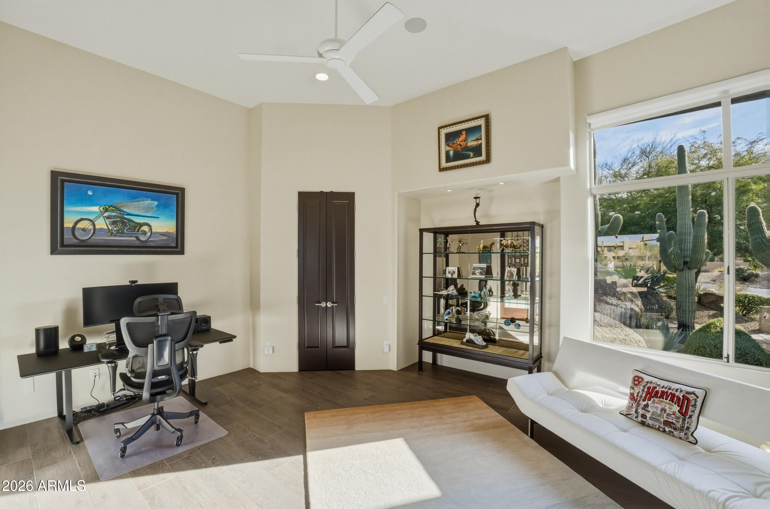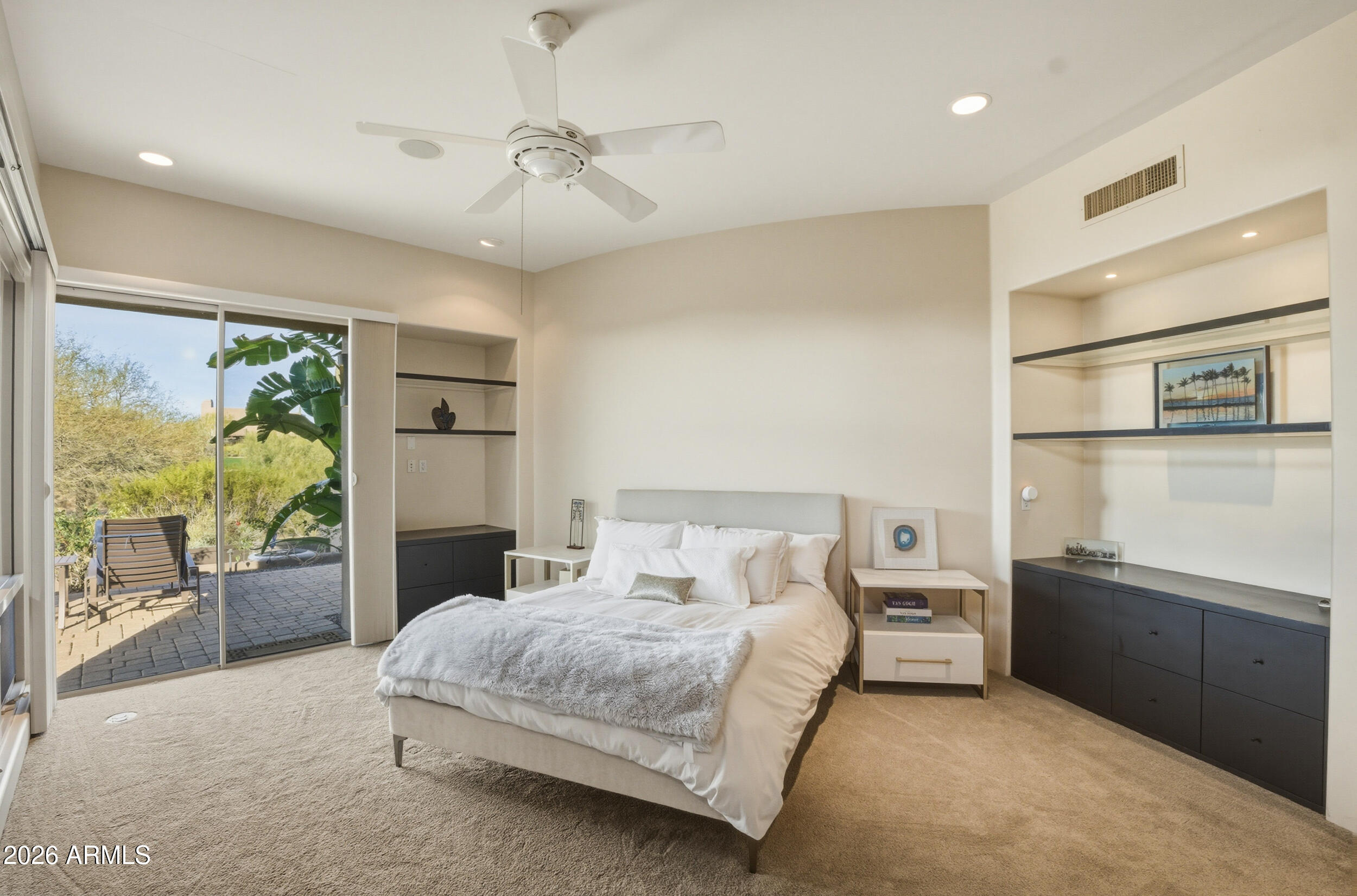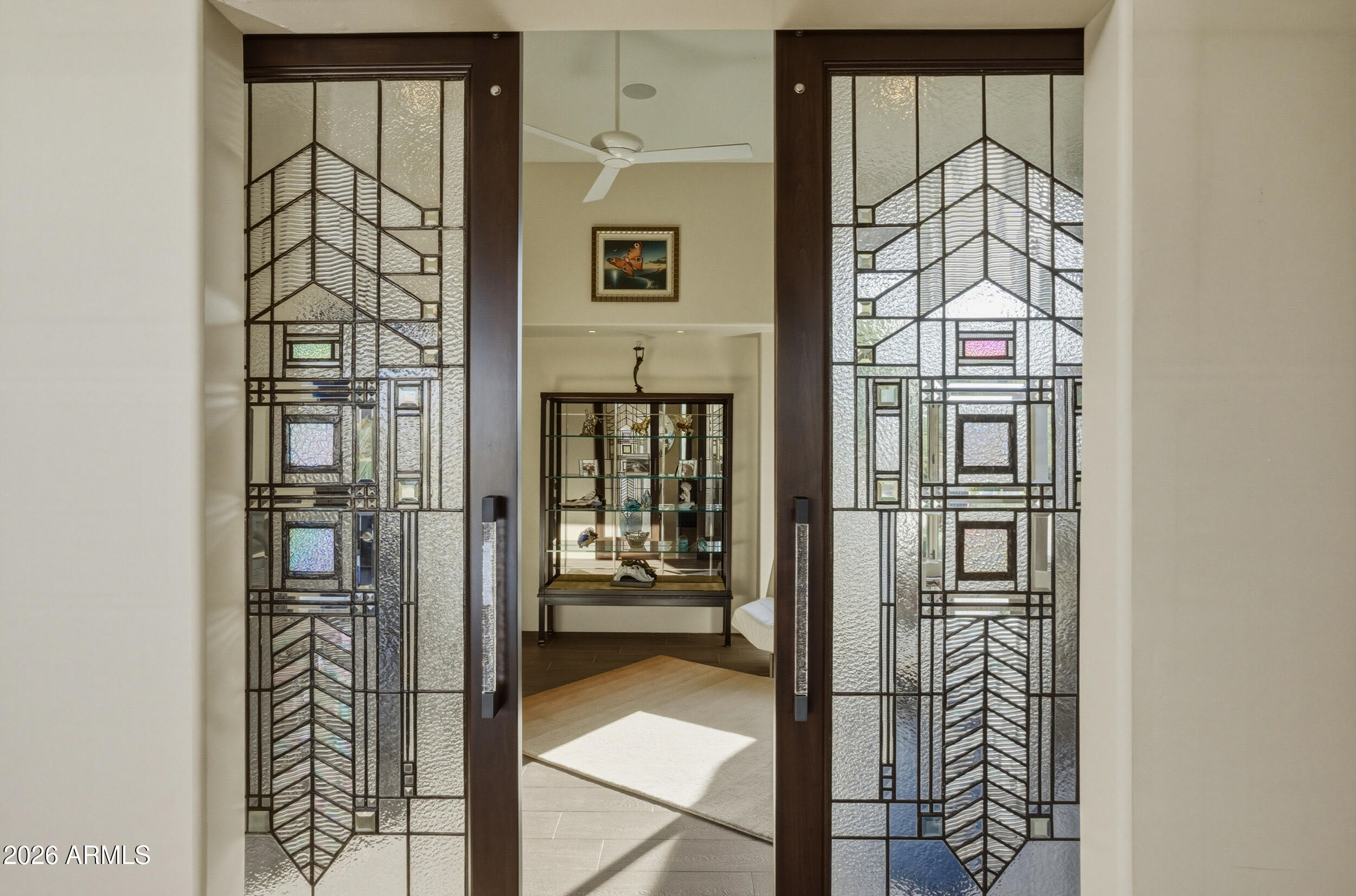 Located within the Troon Guard Gated neighborhood, this exceptional retreat offers resort-style living w/ sweeping VIEWS of the 15th fairway & surrounding mountains. Main residence complemented by 739sf detached guest casita, set on an expansive 0.674 acre lot designed for privacy & entertaining. Open-concept interior showcases vaulted ceilings, dramatic double-sided gas fireplace anchoring main living spaces + custom sliding & electronic pocket doors opening the great room to the backyard patio & pool. Chef's kitchen outfitted w/ high-end SS-appliances including Dacor, Sub-Zero, & Bosch, along w/ RO & a Grohe Blue chilled & sparkling water system. Luxurious primary retreat features spacious walk-in closet & spa-inspired 5pc bath, while each additional bedroom offers its own en-suite bath. Guest casita offers full privacy w/ kitchenette, full bath, laundry, & private patio. Theater & bonus lounge w/ wine storage & beverage fridge adds to the home's entertainment appeal. Resort-inspired outdoor entertaining space w/ negative-edge pool & spa, expansive covered patio, built-in BBQ, rooftop terrace, & breathtaking golf course & mountain views. Additional highlights include new roof, 3-car painted garage w/ epoxy floors, built-in storage & EV charger, updated HVAC, tankless gas water heaters, & fresh exterior paint throughout. Don't miss your opportunity to live in one of Troon's most coveted neighborhoods!