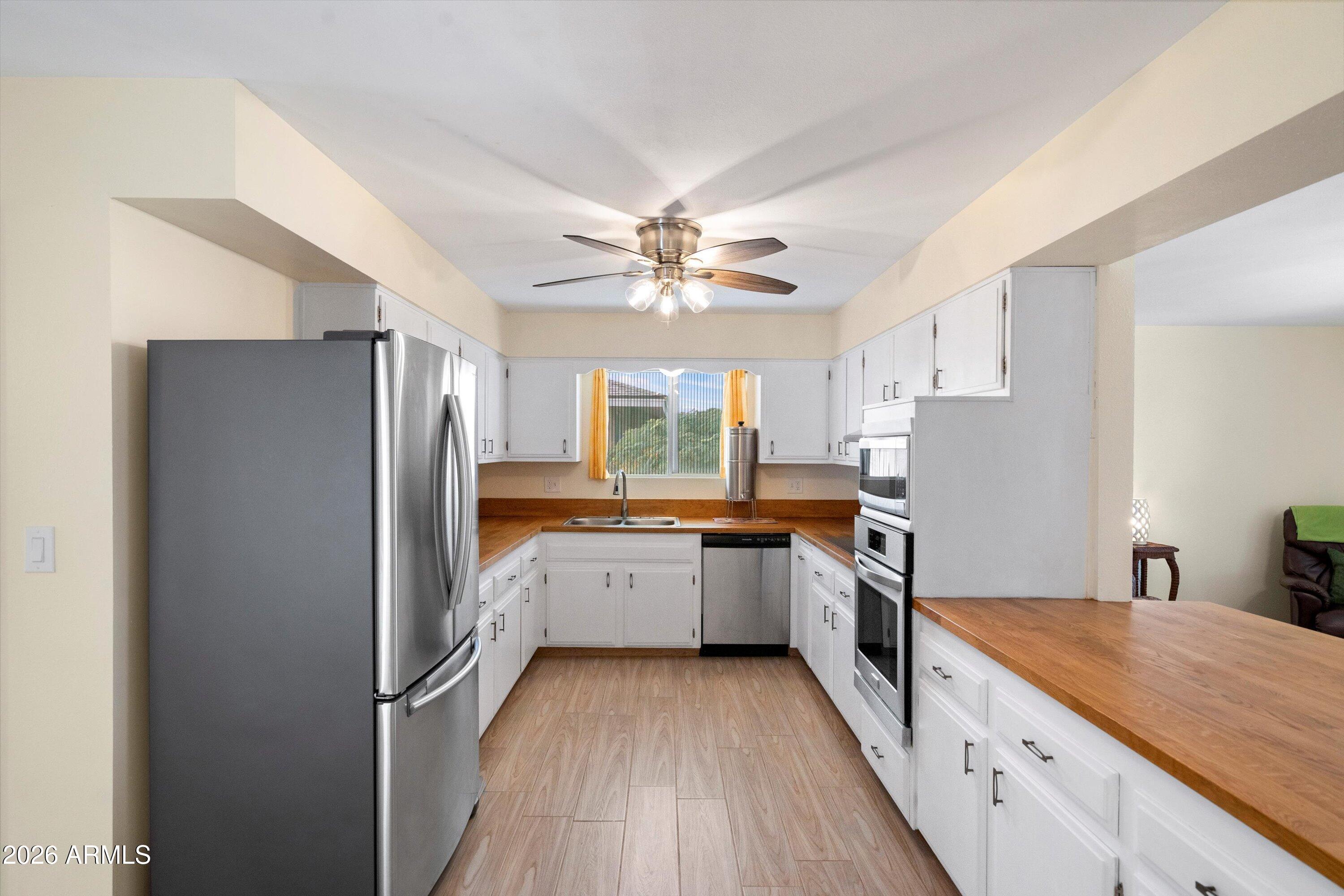 This gorgeous, fully remodeled Sun City home has it all, combining timeless charm with beautiful modern upgrades. From the moment you step inside, you'll appreciate the spacious open floor plan, wood-look tile flooring, and fresh interior paint throughout, creating a bright and welcoming atmosphere. The kitchen is a standout with stainless steel appliances, a glass cooktop, butcher block countertops, and generous cabinet space, perfect for daily living and entertaining. New lighting and ceiling fans accent every room, while all bathrooms have been fully remodeled with custom tile showers. The home also features new exterior paint and a refinished roof for added peace of mind. Step outside to a serene backyard, ideal for relaxing or enjoying quiet Arizona evenings. A true must see!!