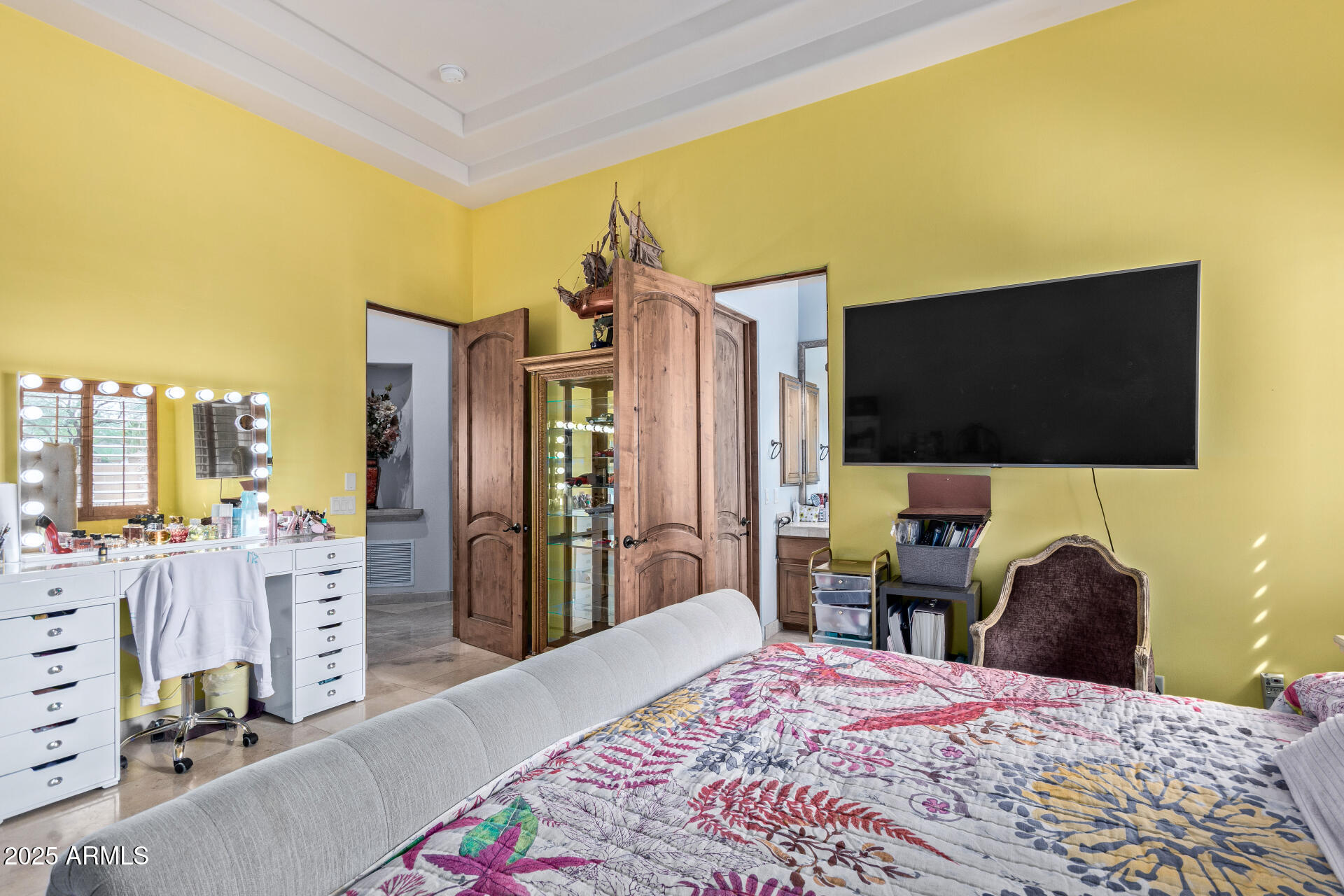 The palatial primary suite is a private retreat, featuring a cozy fireplace, a spa-inspired ensuite with natural stone accents, and a walk-in closet rivaling high-end boutiques. Three additional en-suite bedrooms, including a fully appointed detached guest house, offer luxurious comfort for family or guests. Outdoors, the sprawling grounds unfold into a desert paradise: a resort-style pool and spa cascade amid terraced gardens, with expansive patios ideal for starlit entertaining.