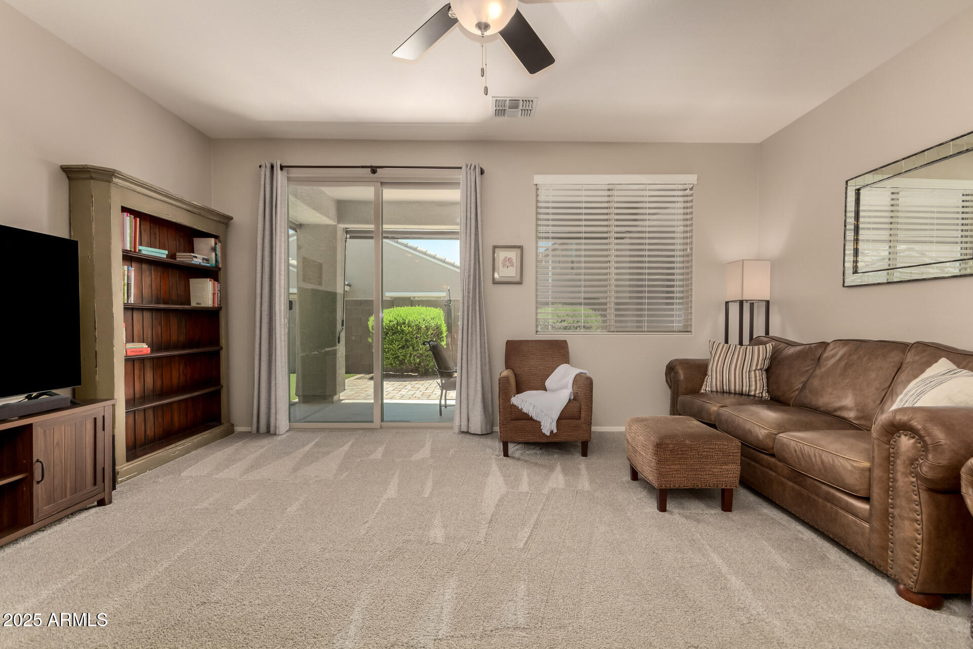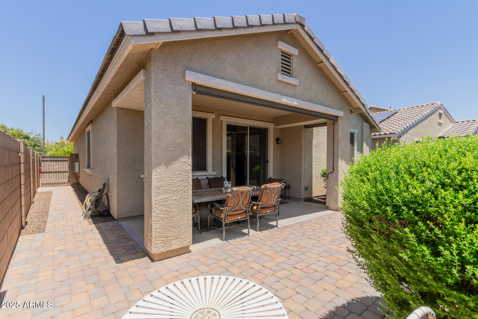 The owner's suite is tucked away for privacy and offers a generous layout with a walk-in closet and an ensuite bath with dual sinks. Down the hall, you'll find the laundry room with updated cabinets, a second full bathroom, and two additional bedrooms--one of which also includes a walk-in closet. Step outside to a low-maintenance backyard designed for easy living, complete with artificial turf (installed in 2020), a paver patio and walkway (added in 2021), and roller sunshades on the covered patio for extra comfort. Sunscreens were installed on all windows in 2020 to help keep things cool and energy efficient.