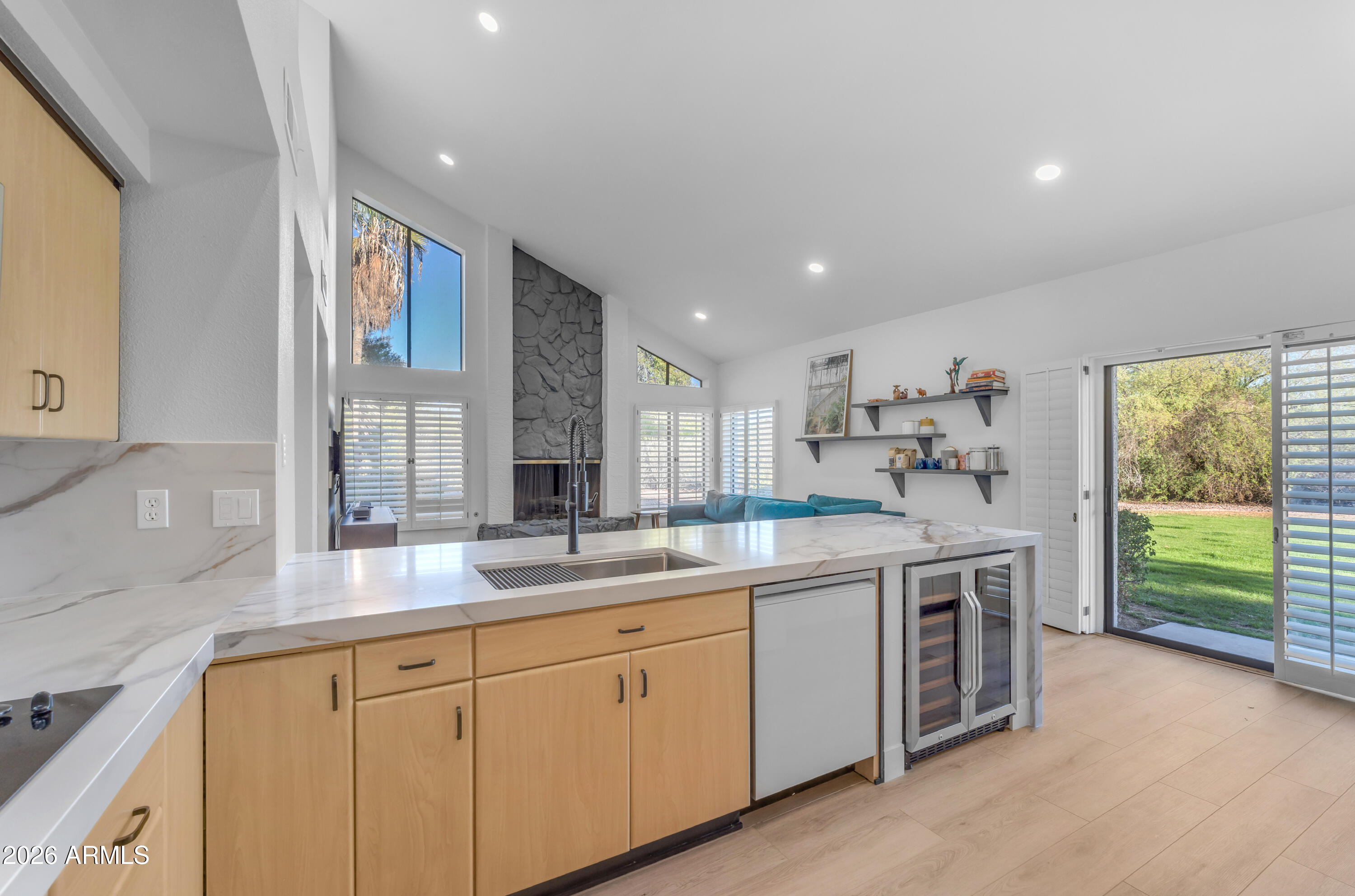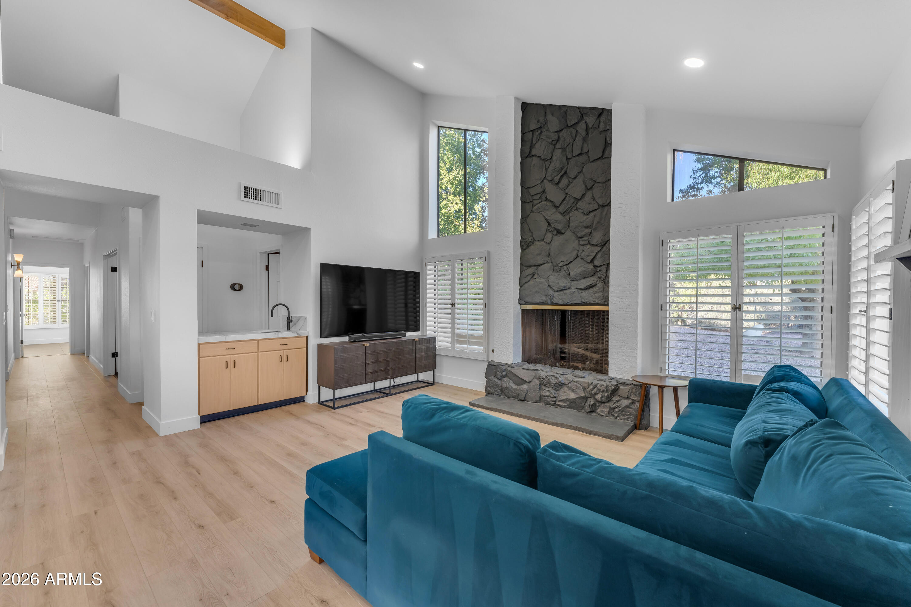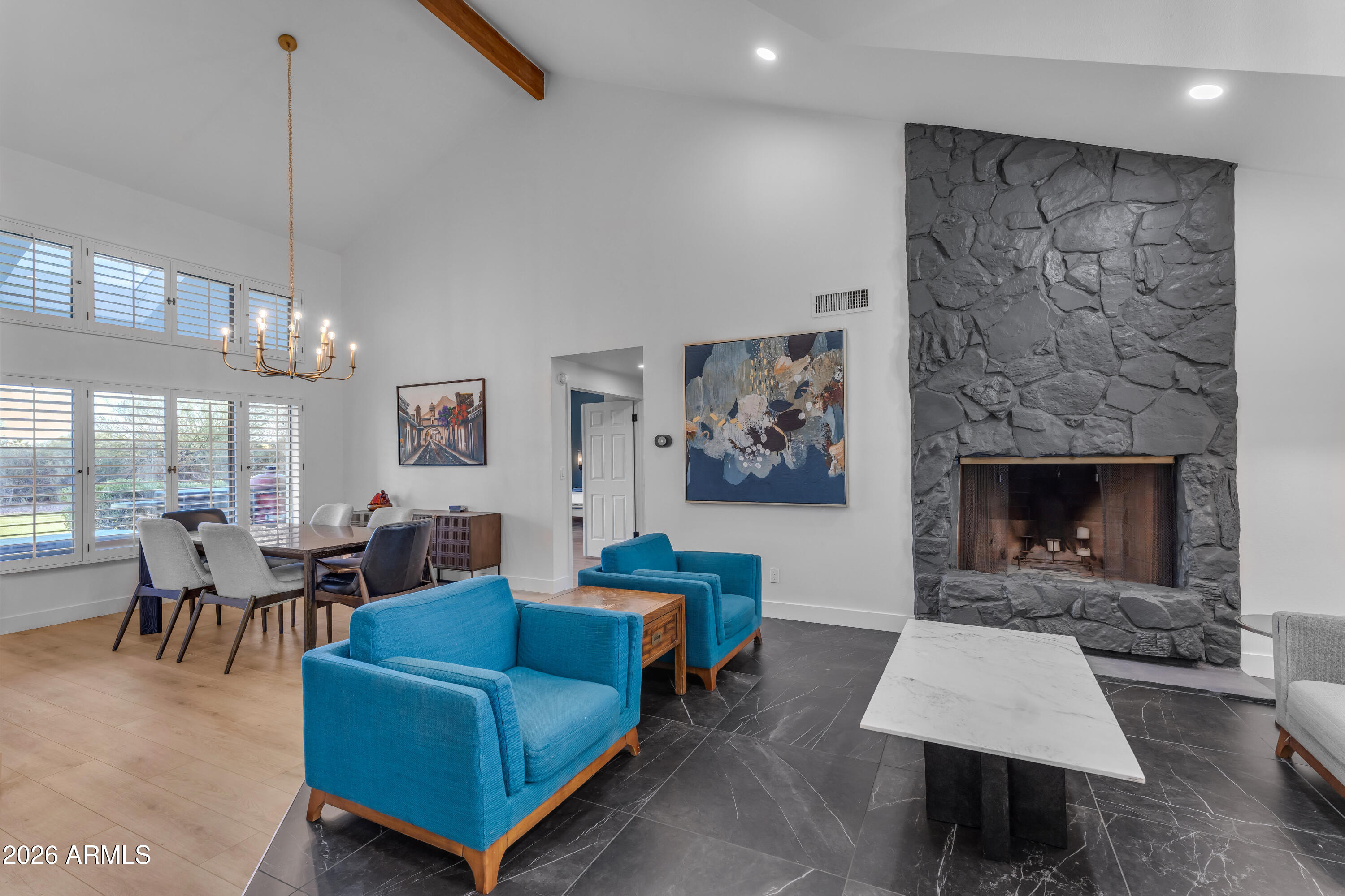 The heart of the home is the updated kitchen, designed for both everyday living and entertaining. Waterfall edge countertops, modern cabinetry, generous prep space, and a wine fridge anchor the space, while the seamless flow into the great room makes gatherings effortless. Wood beams, a striking stone fireplace, and a built in bar with sink elevate the great room into a true showpiece.