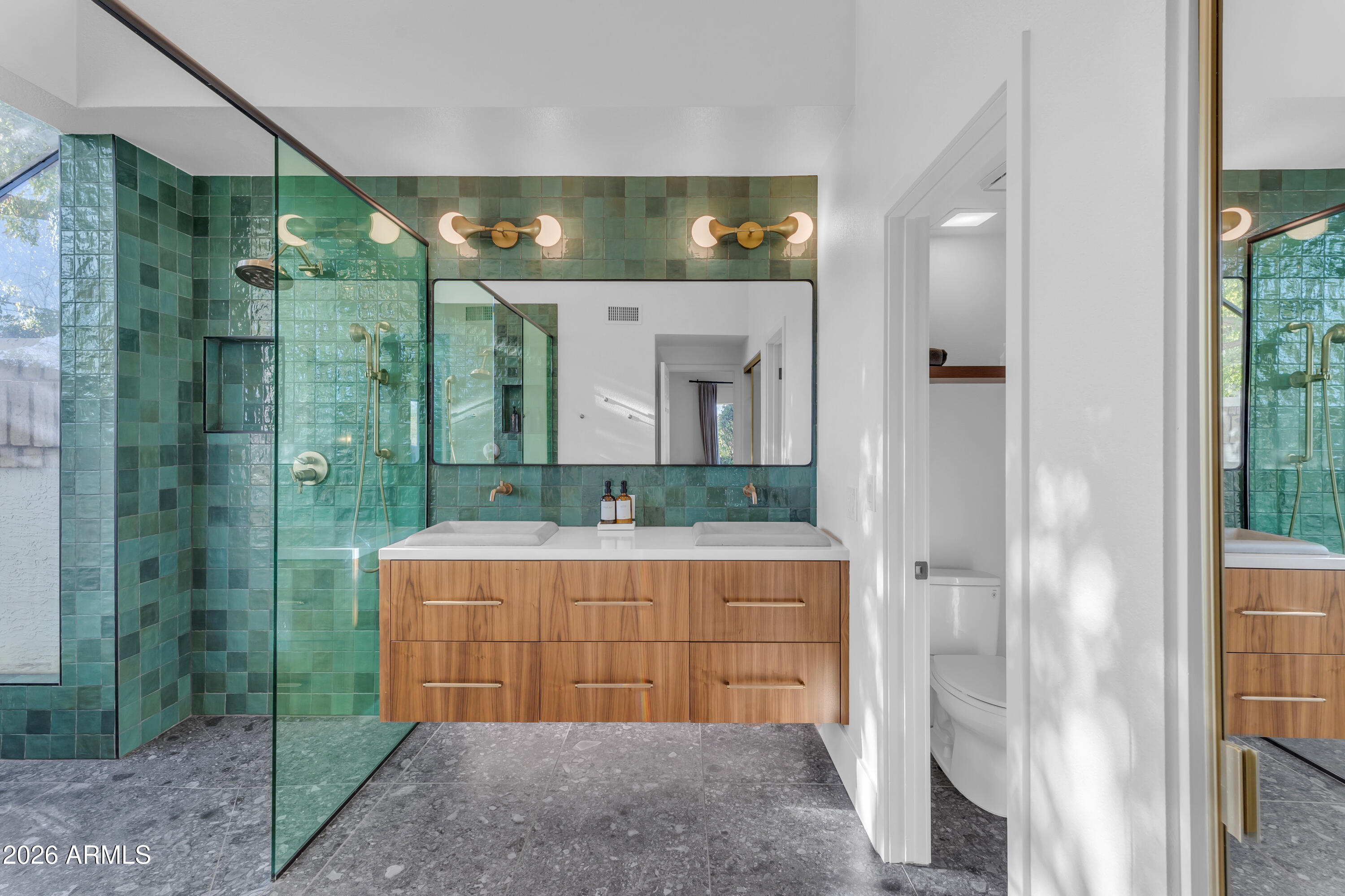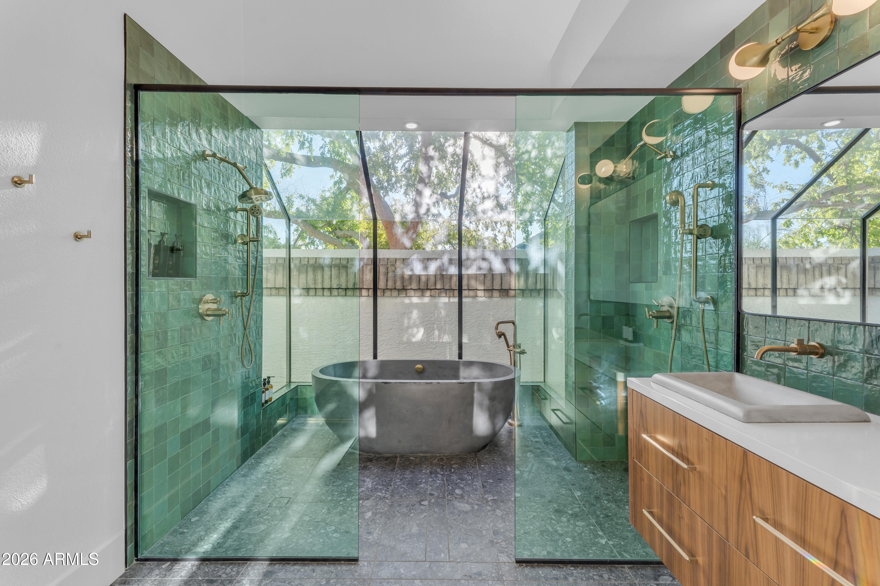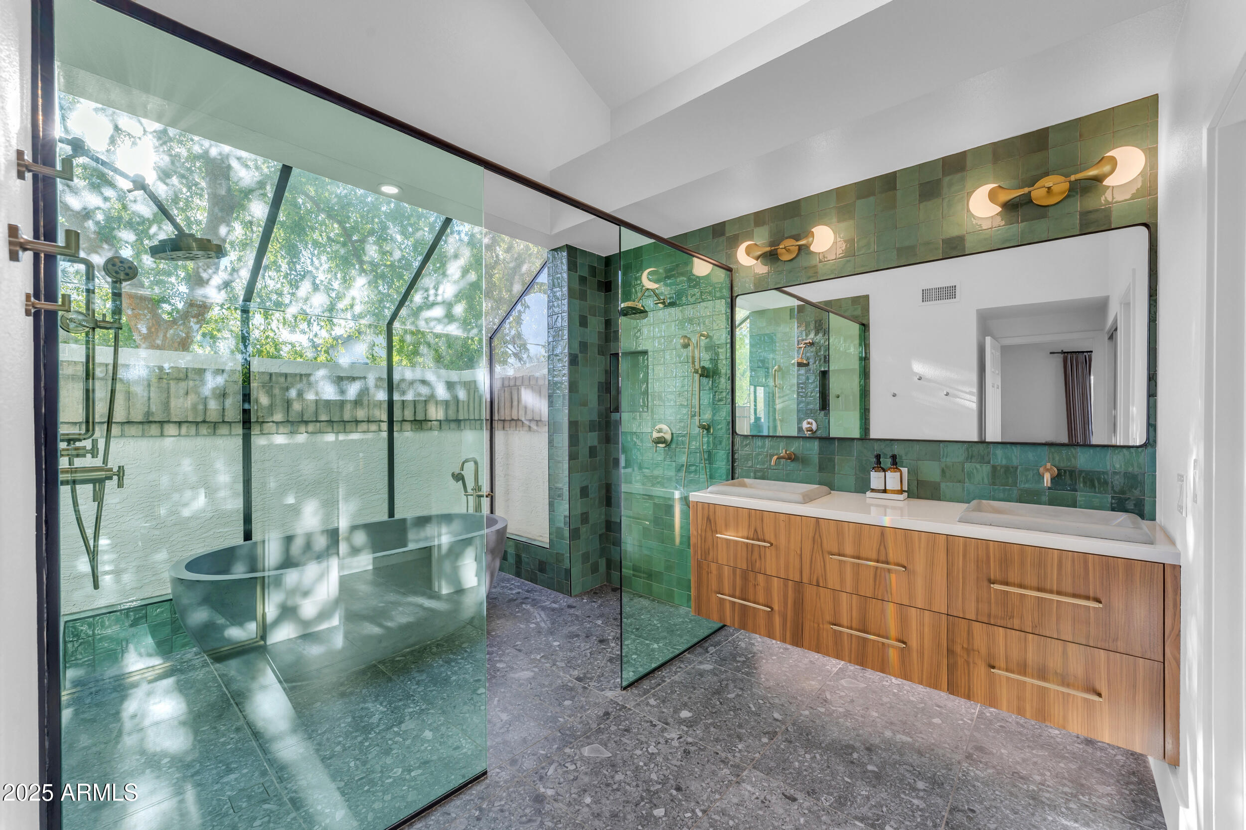 The primary suite is a private retreat with direct patio access and a spa inspired en suite bathroom that rivals luxury resorts. Floating vanities with square sinks, an oversized walk in shower with double rain heads and body sprays, a standalone soaking tub, and glass surrounds are bathed in natural light with serene views of the property. The custom walk in closet with built in shelving completes the space. A stylish powder bath with regal touches and a fully updated guest bathroom ensure comfort and elegance for everyone.
