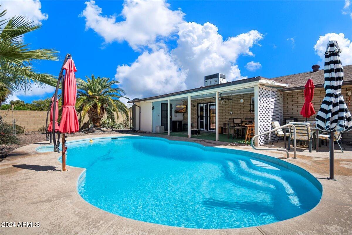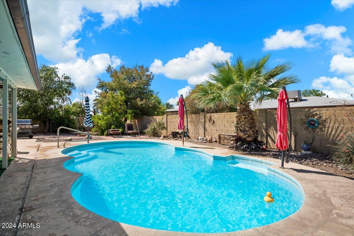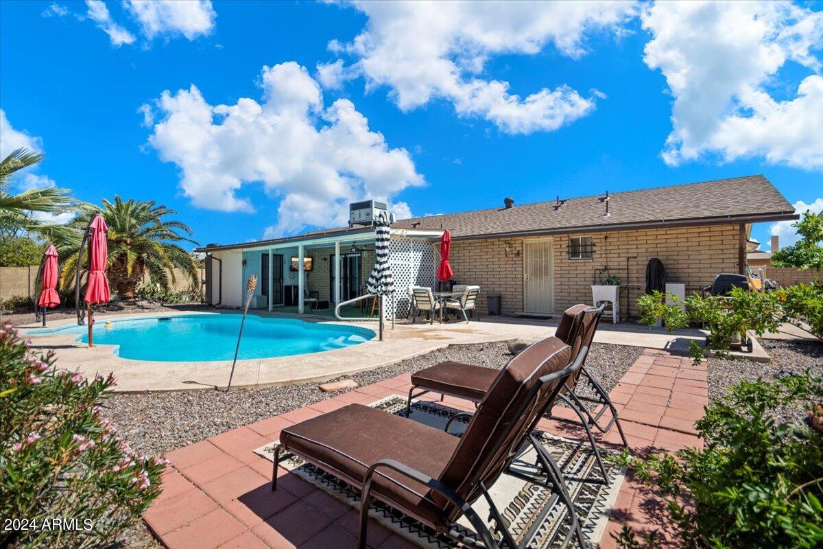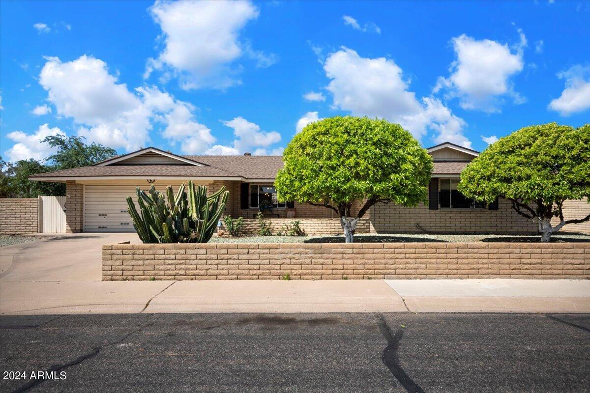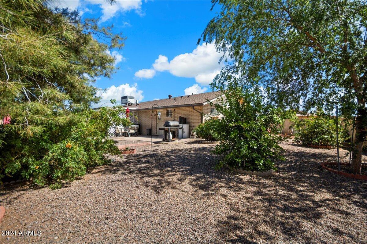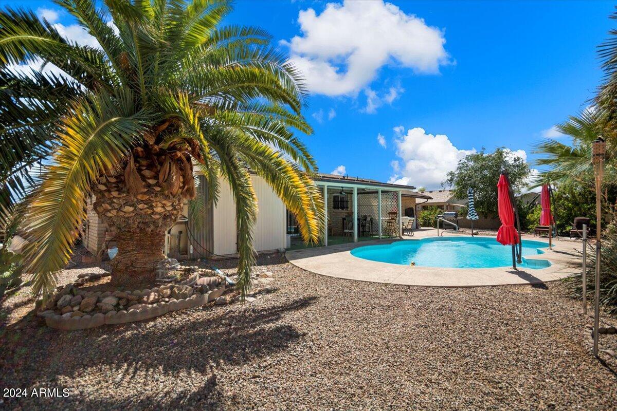Welcome to your personal oasis in the +55 Velda Rose Estates! This updated 2 bedroom, 2.5 bath home boasts the warmth of new wood laminate flooring that flows seamlessly throughout. The spacious living room offers a cozy ambiance, perfect for relaxing. Prepare to be impressed by the fully remodeled kitchen, complete with a sleek island with a butcher block counter, ideal for culinary enthusiasts and casual dining alike. Step outside into your private backyard oasis, where a sparkling dive pool beckons on warm Arizona days. Mature landscaping creates a tranquil backdrop, while the covered patio provides a shady retreat. Indulge in the beauty of the front patio and yard accompanied by three citrus trees, including two vibrant orange trees and a grapefruit tree. The primary bedroom features a walk-in shower and newly updated double-sink vanity. The 2-car garage provides convenience and ample storage space. Experience the epitome of desert living! Additional updates include new kitchen cabinets, new laminate countertops, new kitchen backsplash, new kitchen sink and faucet, new kitchen appliances, three new kitchen light fixtures, and new kitchen island with storage; new laundry cabinets, new bathroom vanities, new bathroom faucets, fresh paint in all bathrooms, pool has been repainted, and installation of pool umbrellas. Roof replaced in 2021, only 3 years old! Also, the whole home is equipped with a water filtration system with reverse osmosis.