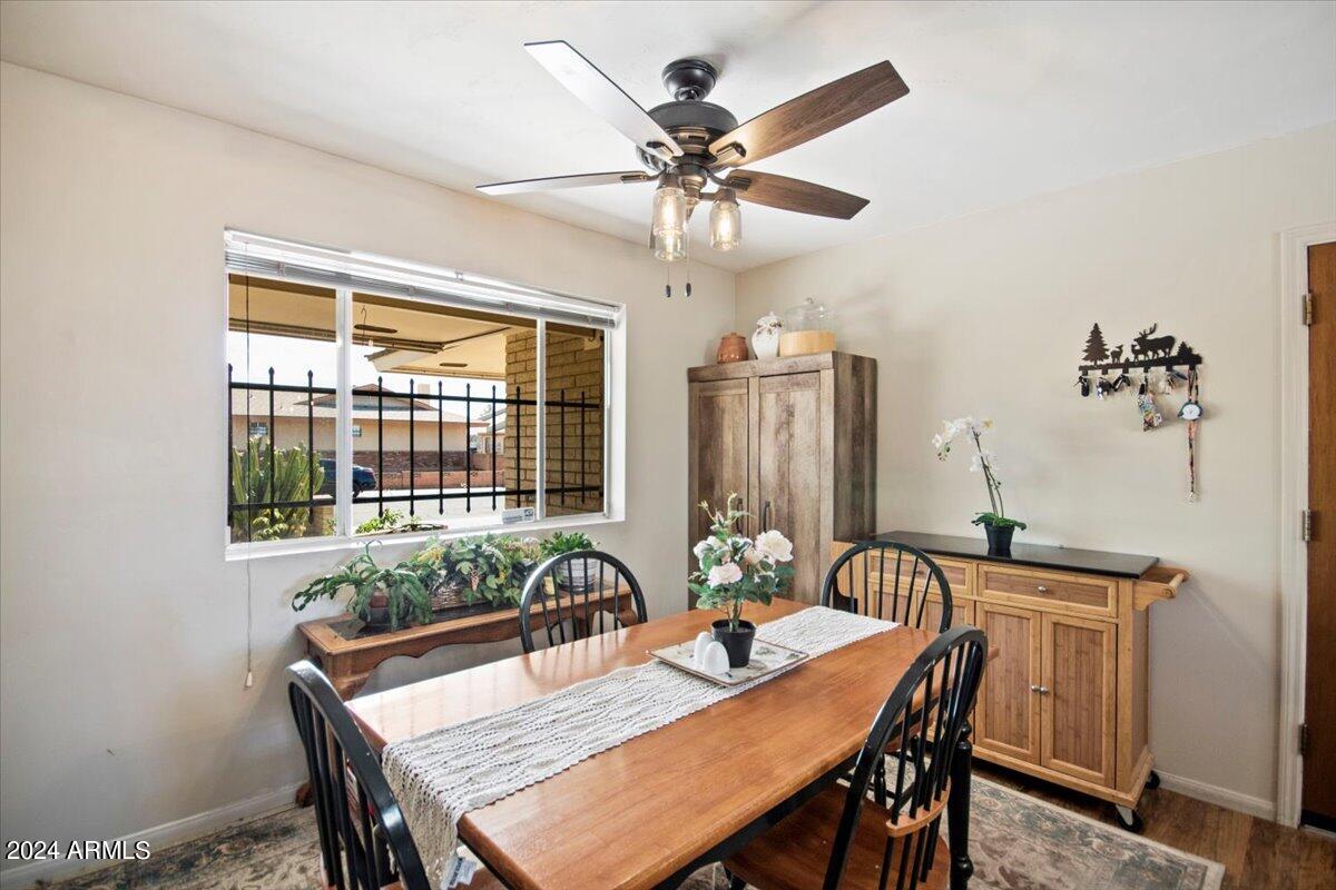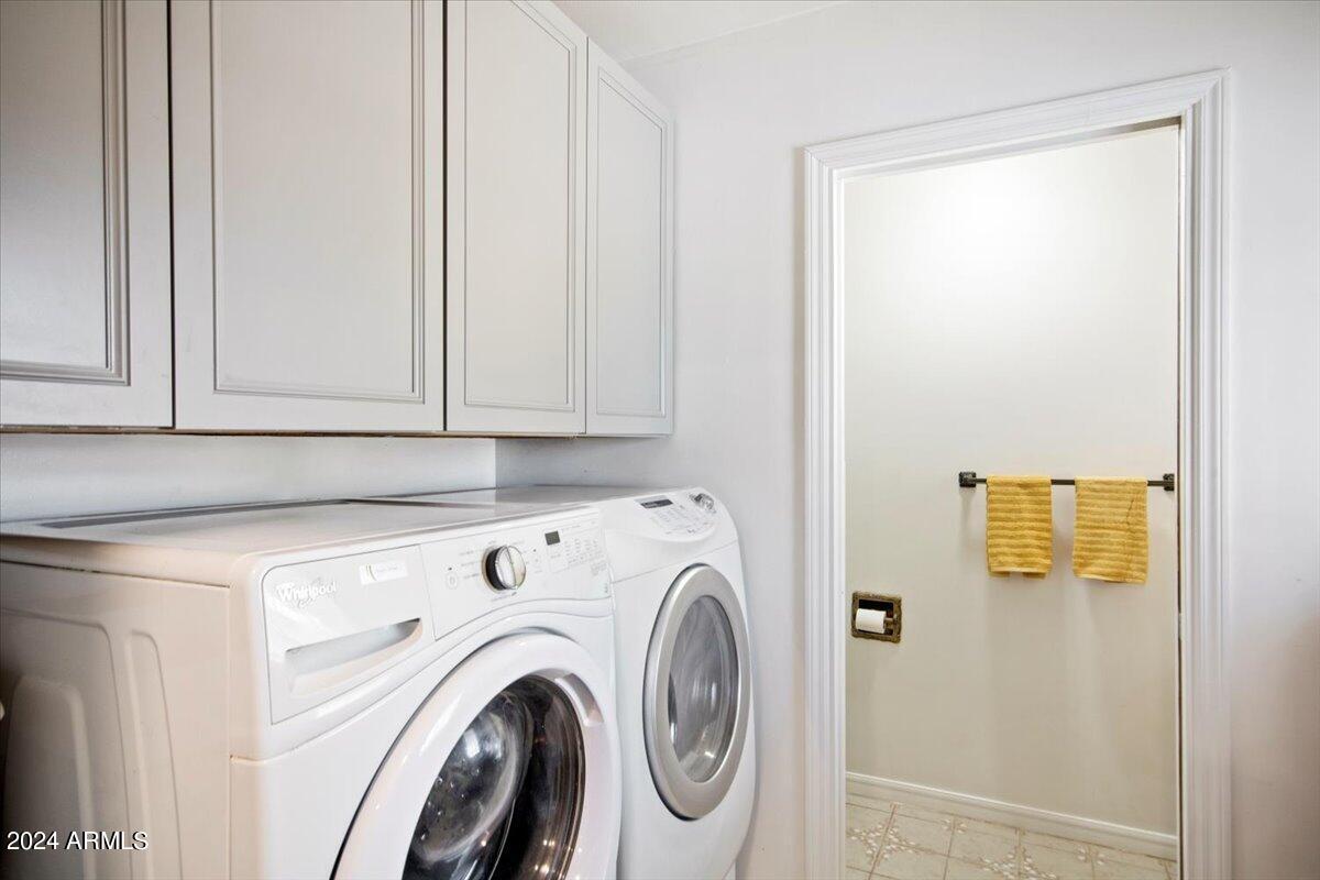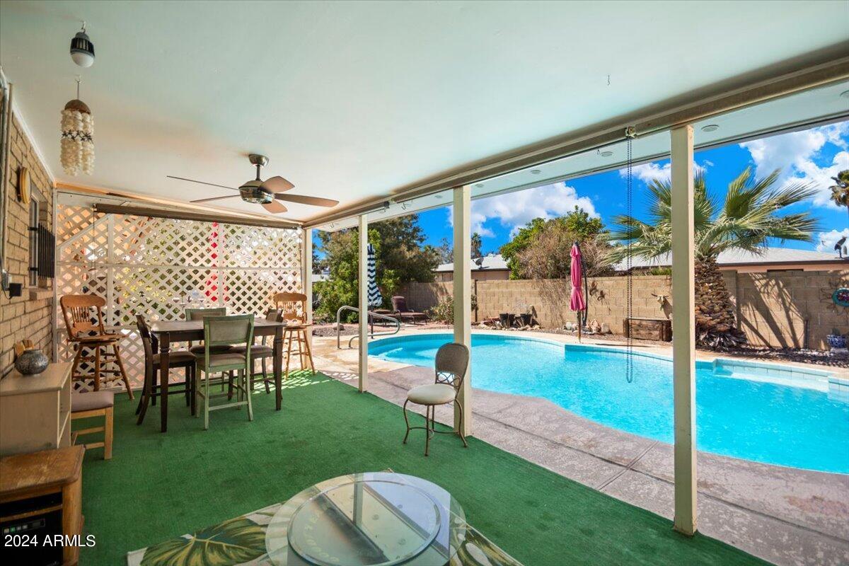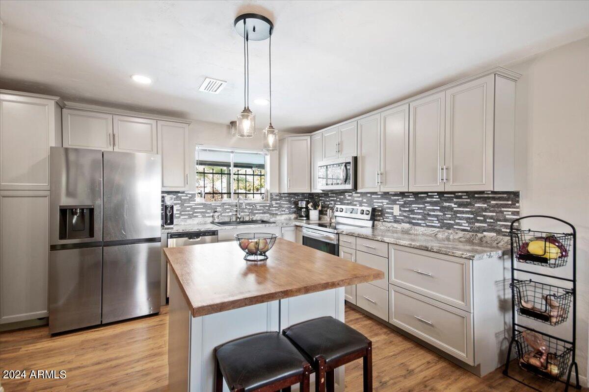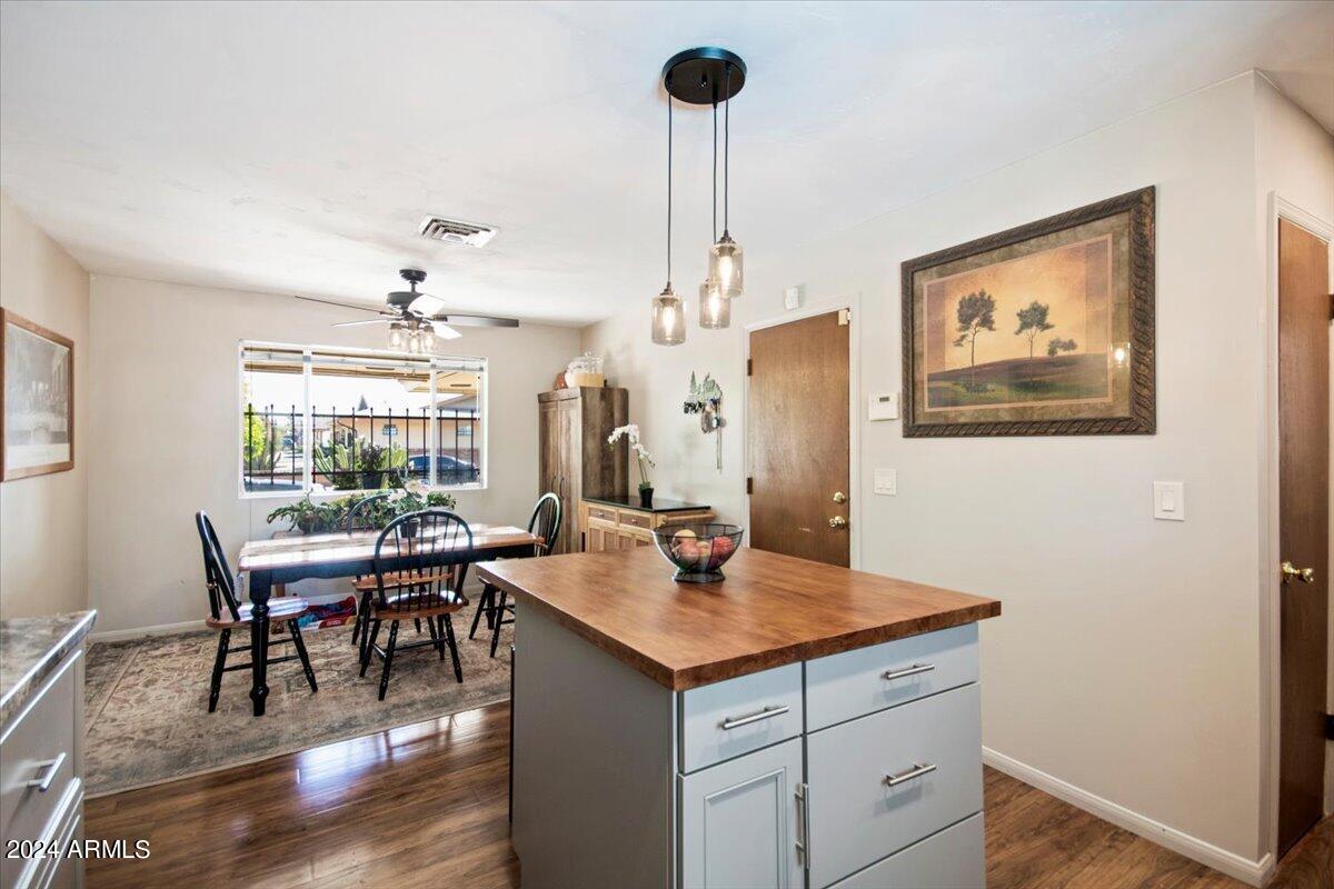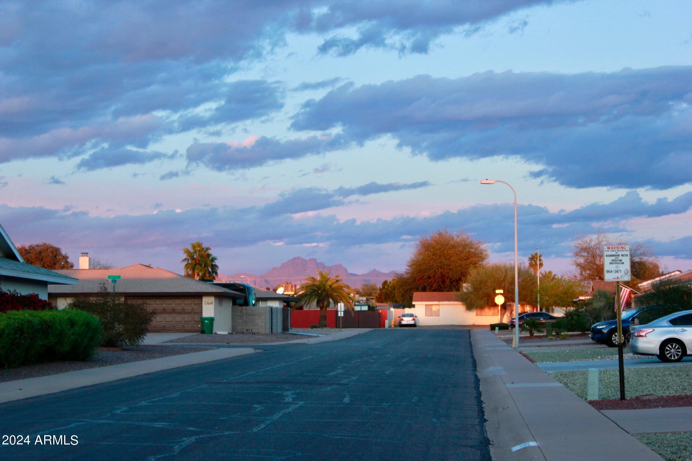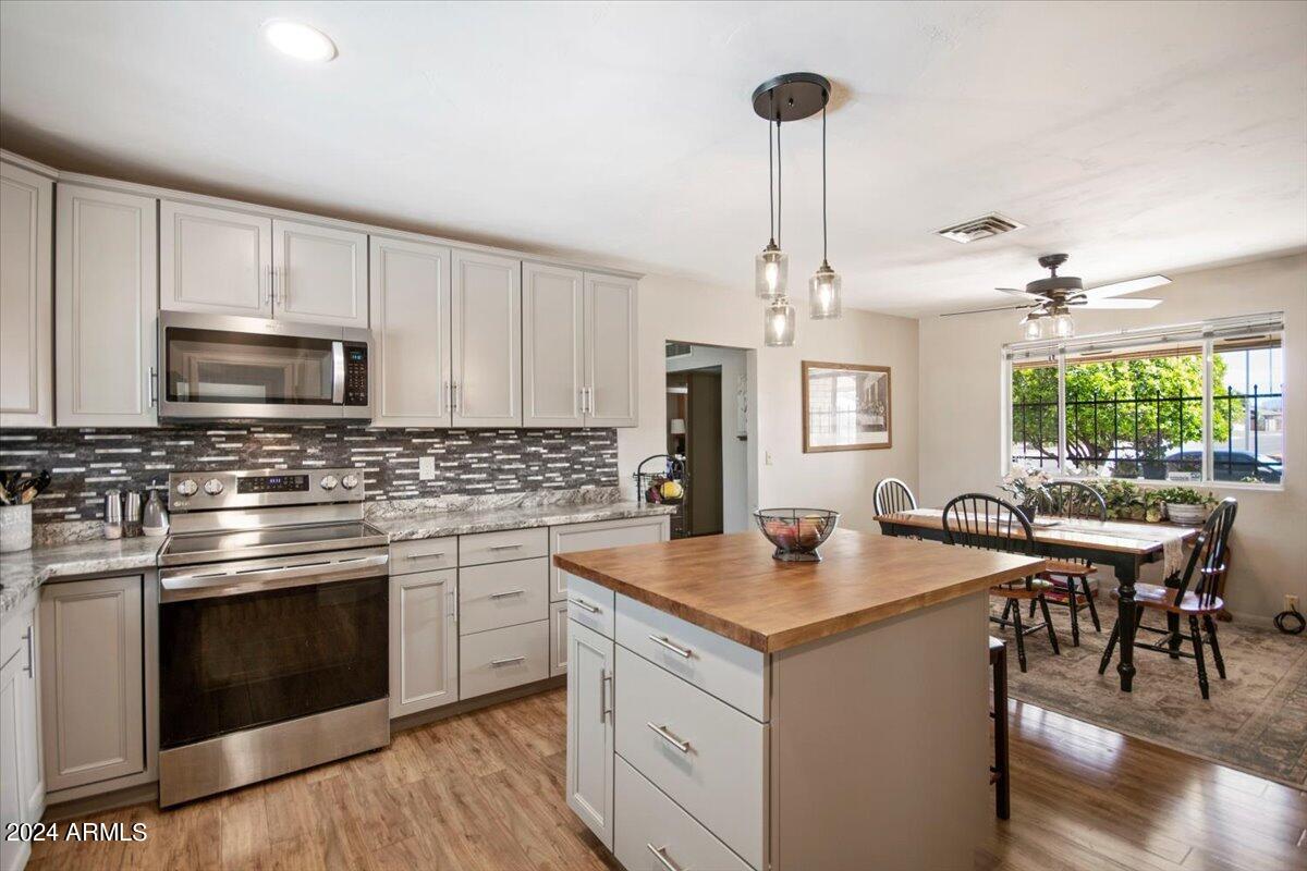 Welcome to your personal oasis in the +55 Velda Rose Estates! This updated 2 bedroom, 2.5 bath home boasts the warmth of new wood laminate flooring that flows seamlessly throughout. The spacious living room offers a cozy ambiance, perfect for relaxing. Prepare to be impressed by the fully remodeled kitchen, complete with a sleek island with a butcher block counter, ideal for culinary enthusiasts and casual dining alike. Step outside into your private backyard oasis, where a sparkling dive pool beckons on warm Arizona days. Mature landscaping creates a tranquil backdrop, while the covered patio provides a shady retreat. Indulge in the beauty of the front patio and yard accompanied by three citrus trees, including two vibrant orange trees and a grapefruit tree. The primary bedroom features a walk-in shower and newly updated double-sink vanity. The 2-car garage provides convenience and ample storage space. Experience the epitome of desert living! Additional updates include new kitchen cabinets, new laminate countertops, new kitchen backsplash, new kitchen sink and faucet, new kitchen appliances, three new kitchen light fixtures, and new kitchen island with storage; new laundry cabinets, new bathroom vanities, new bathroom faucets, fresh paint in all bathrooms, pool has been repainted, and installation of pool umbrellas. Roof replaced in 2021, only 3 years old! Also, the whole home is equipped with a water filtration system with reverse osmosis.