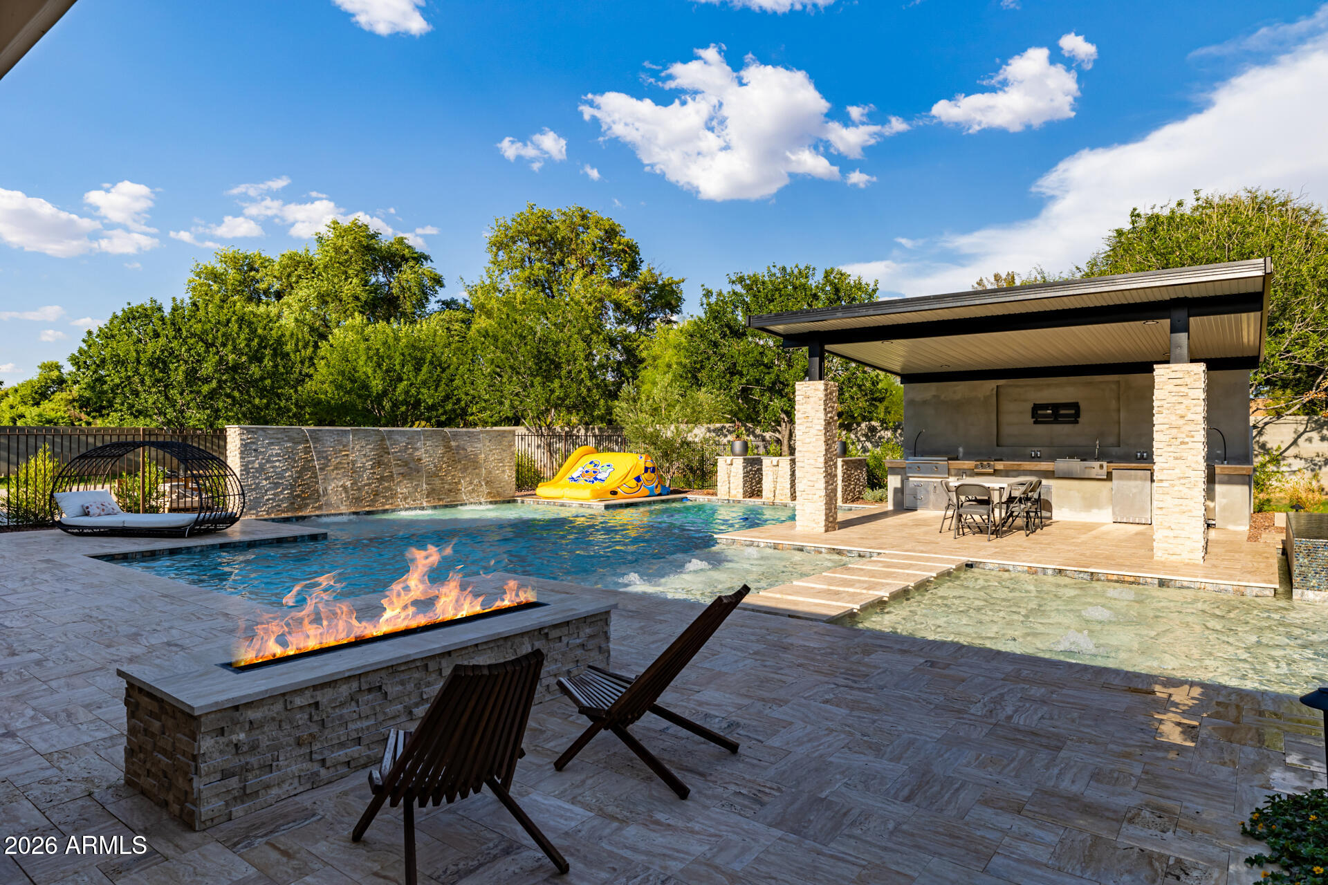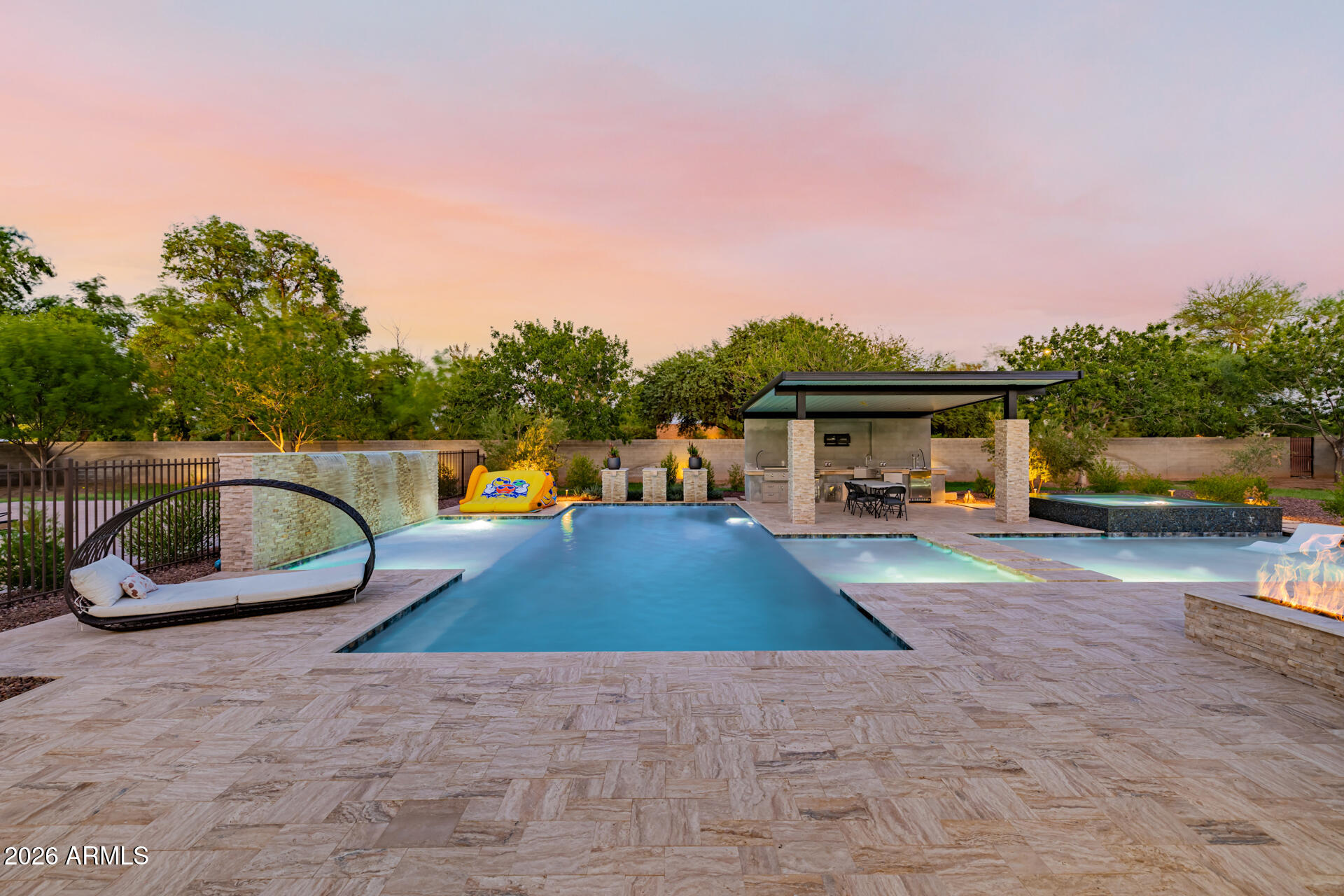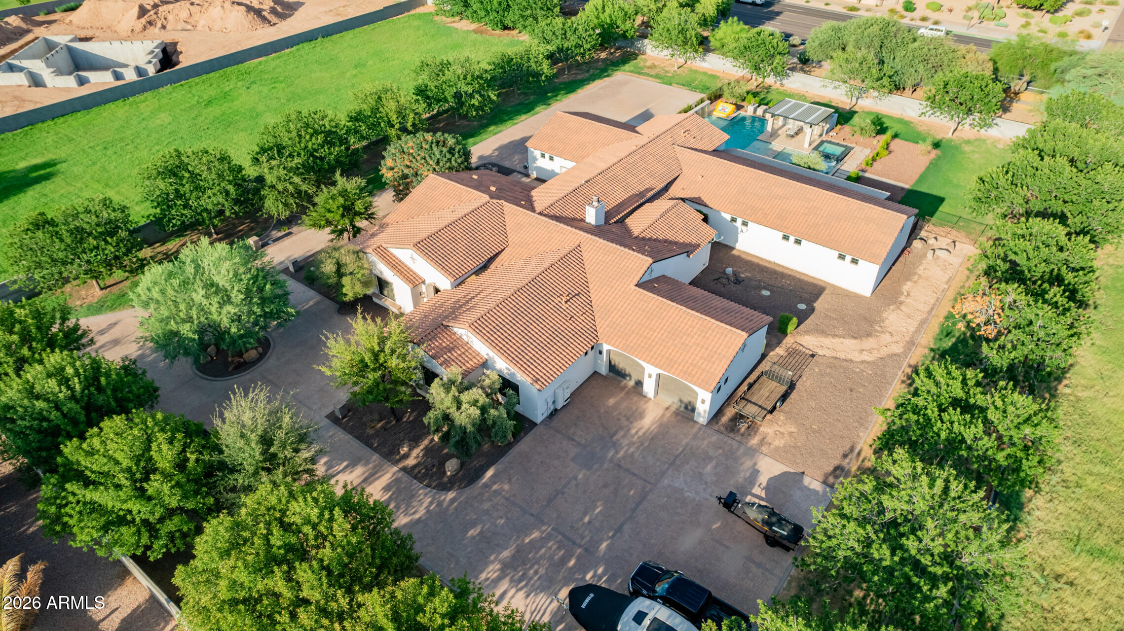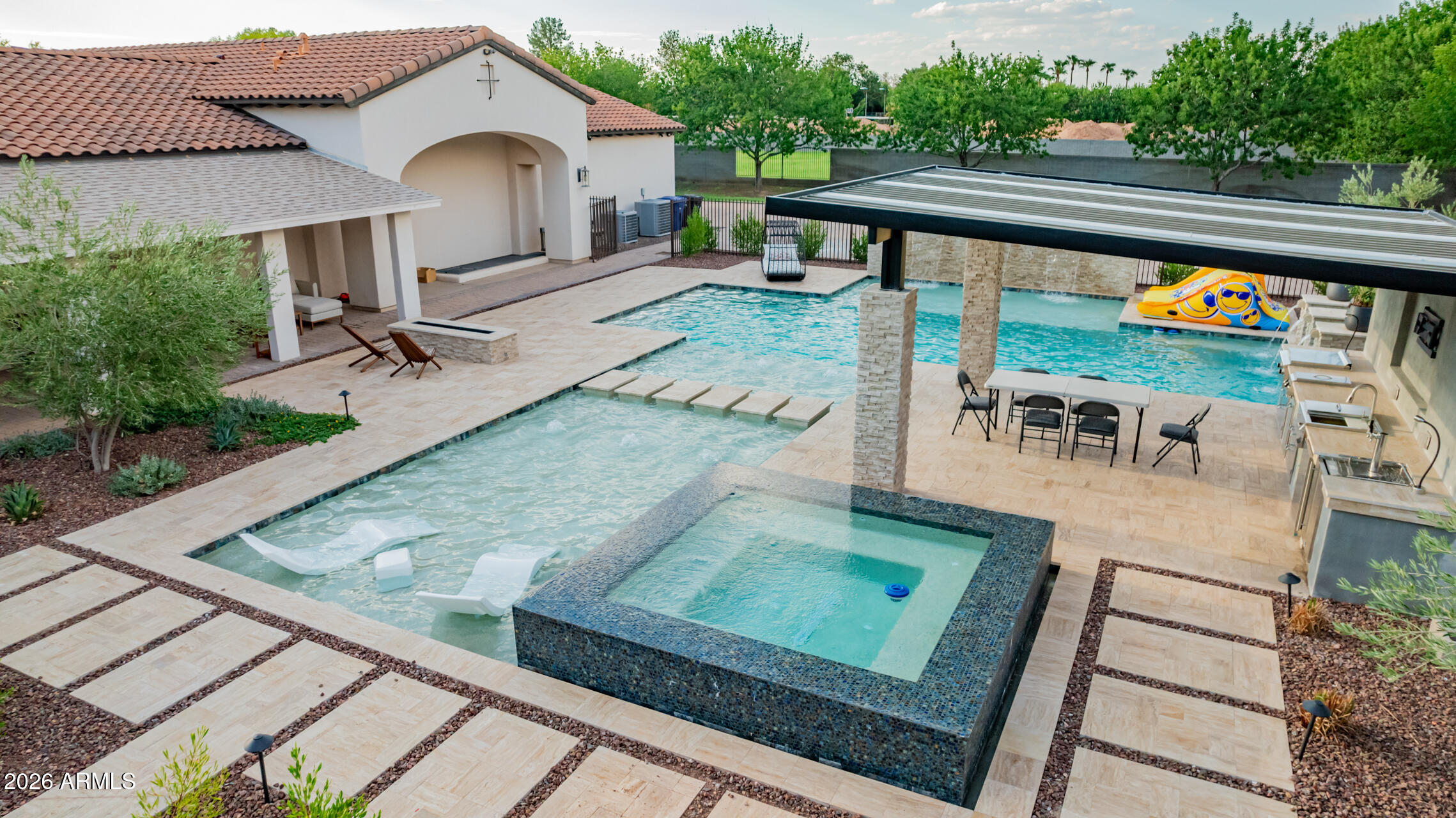 The guest house has a full-size indoor basketball/pickleball court with a full kitchen, bathrooms, and two bedrooms adds a unique and practical feature to the property. The resort-style pool is BRAND NEW with a covered sitting area and built-in BBQ enhancing the luxurious, resort-like feel of the compound. This property truly offers a comprehensive package for luxury living and entertaining.