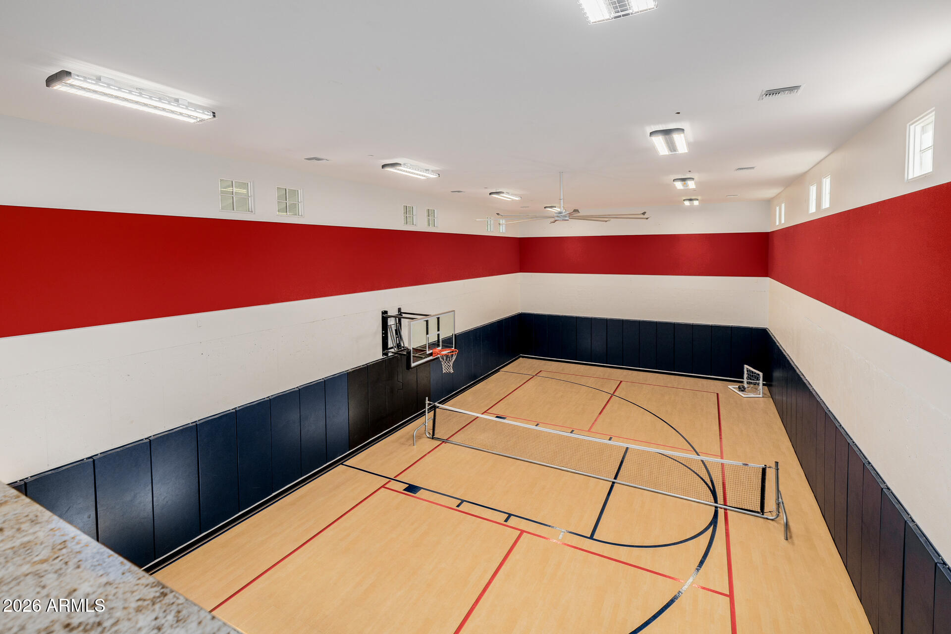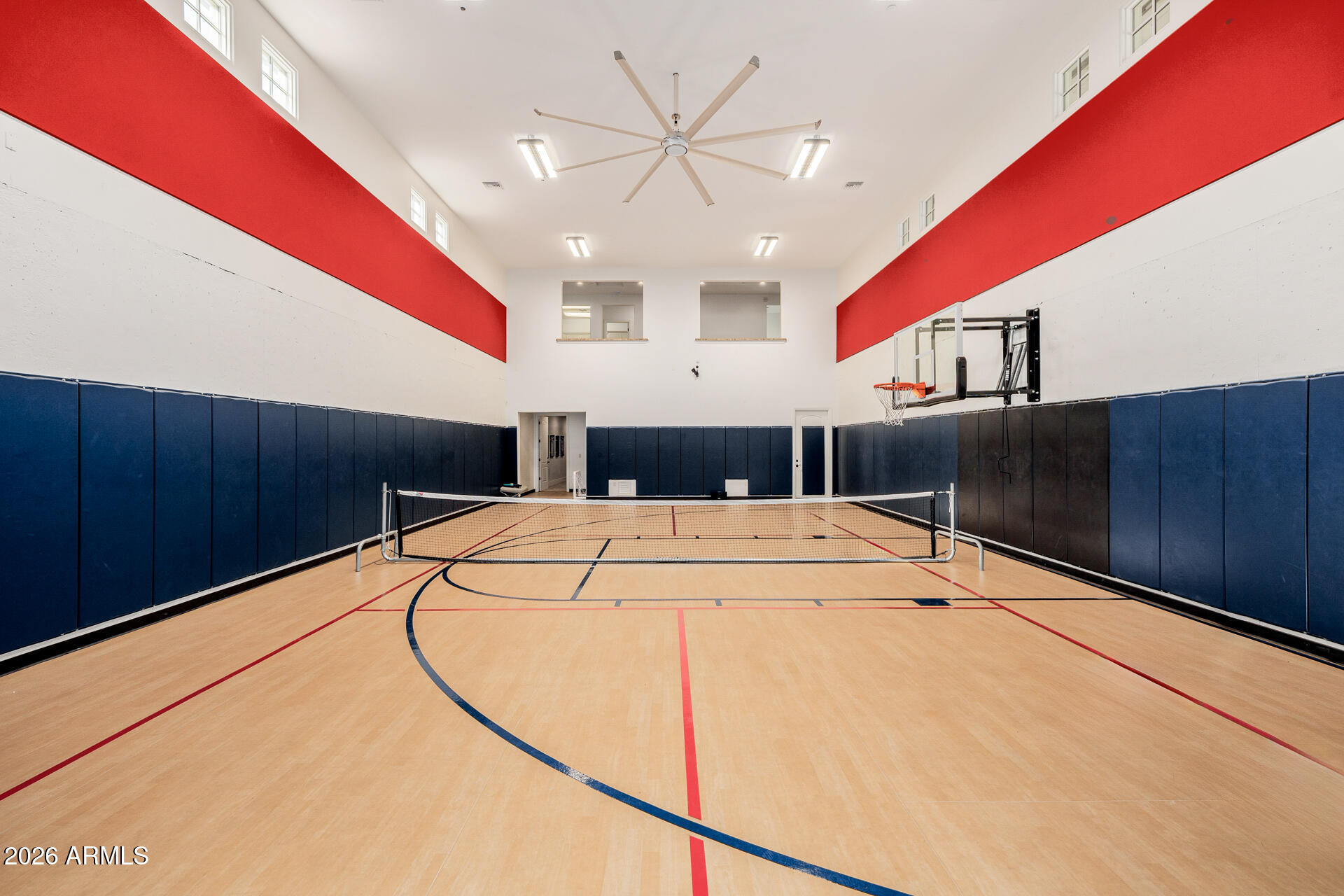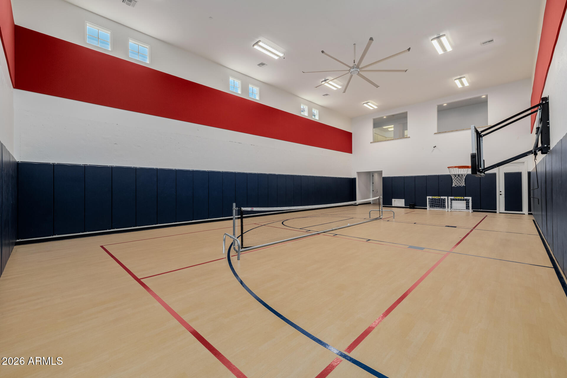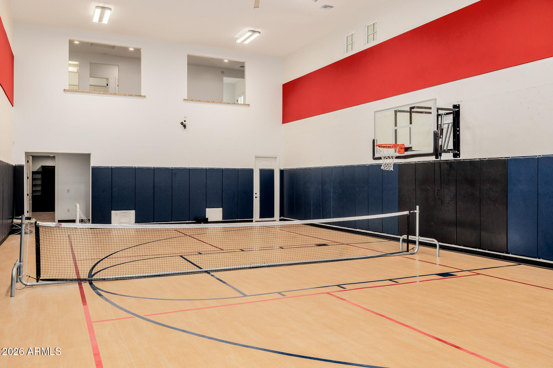 The primary suite is particularly impressive, with dual vanities, toilet rooms, a multi-head shower, extensive built-in storage, and direct laundry access. The second residence adds a recreational dimension with indoor basketball and pickleball courts, along with a guesthouse or man cave that includes a full kitchen, TV room, and extra beds.
