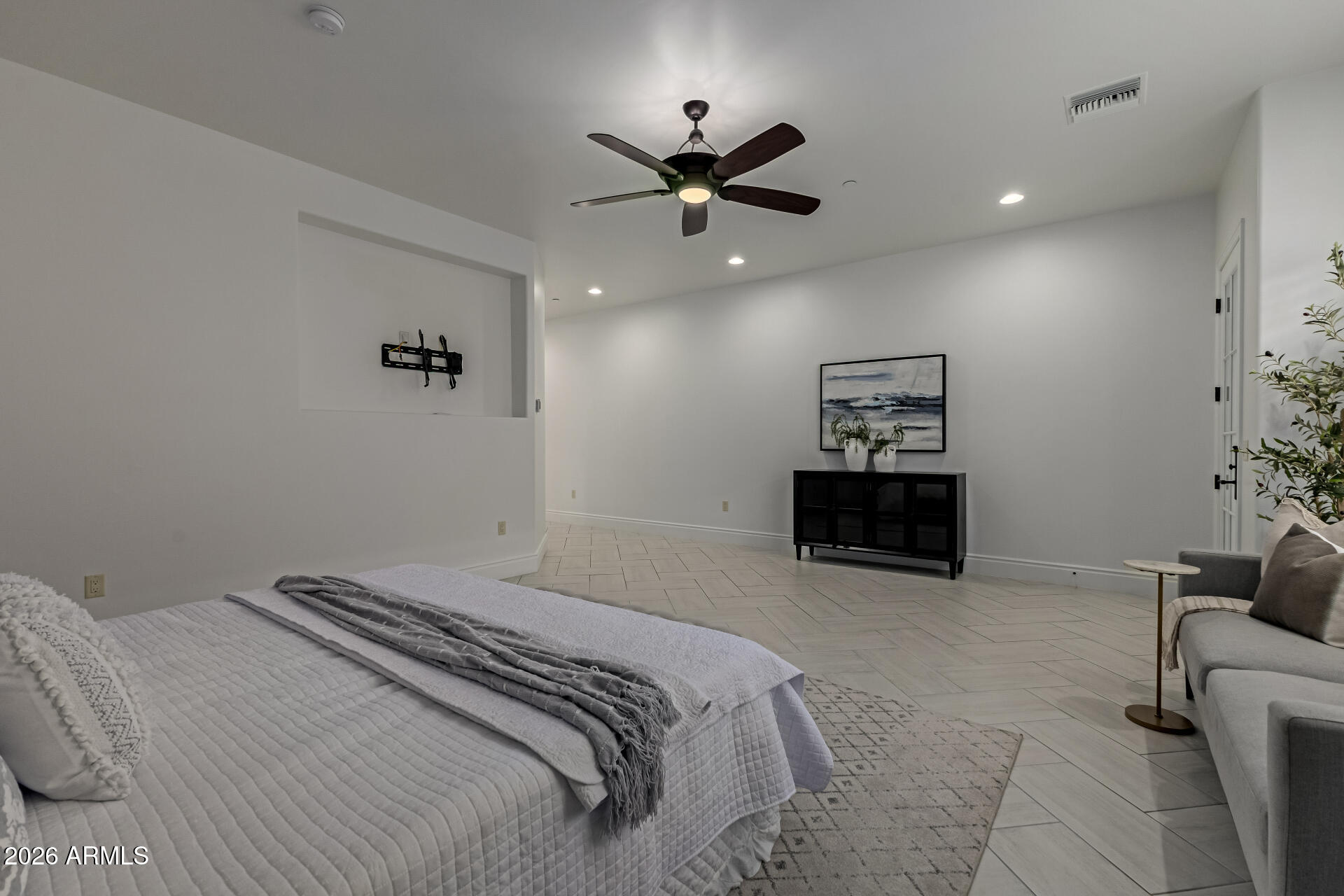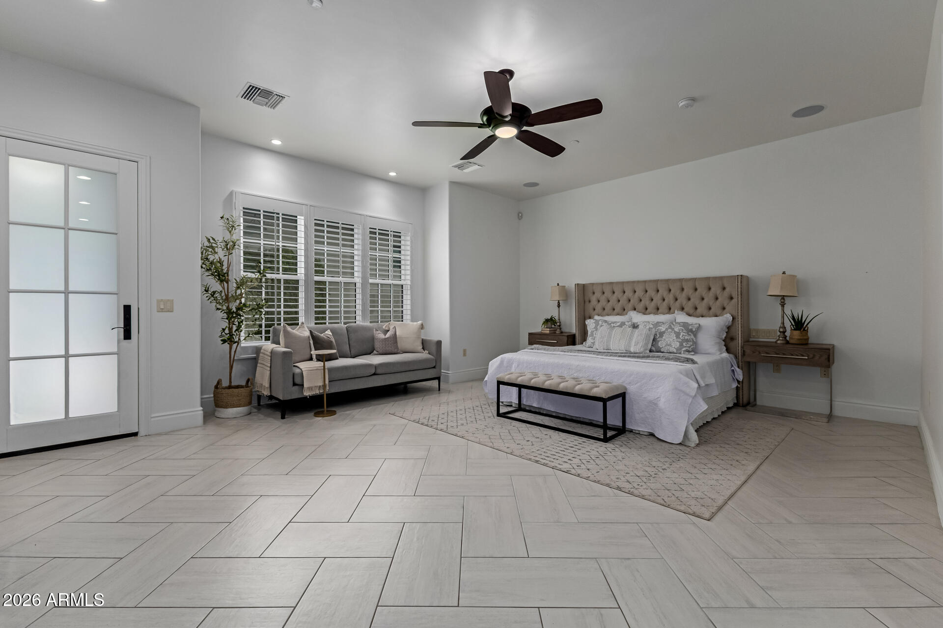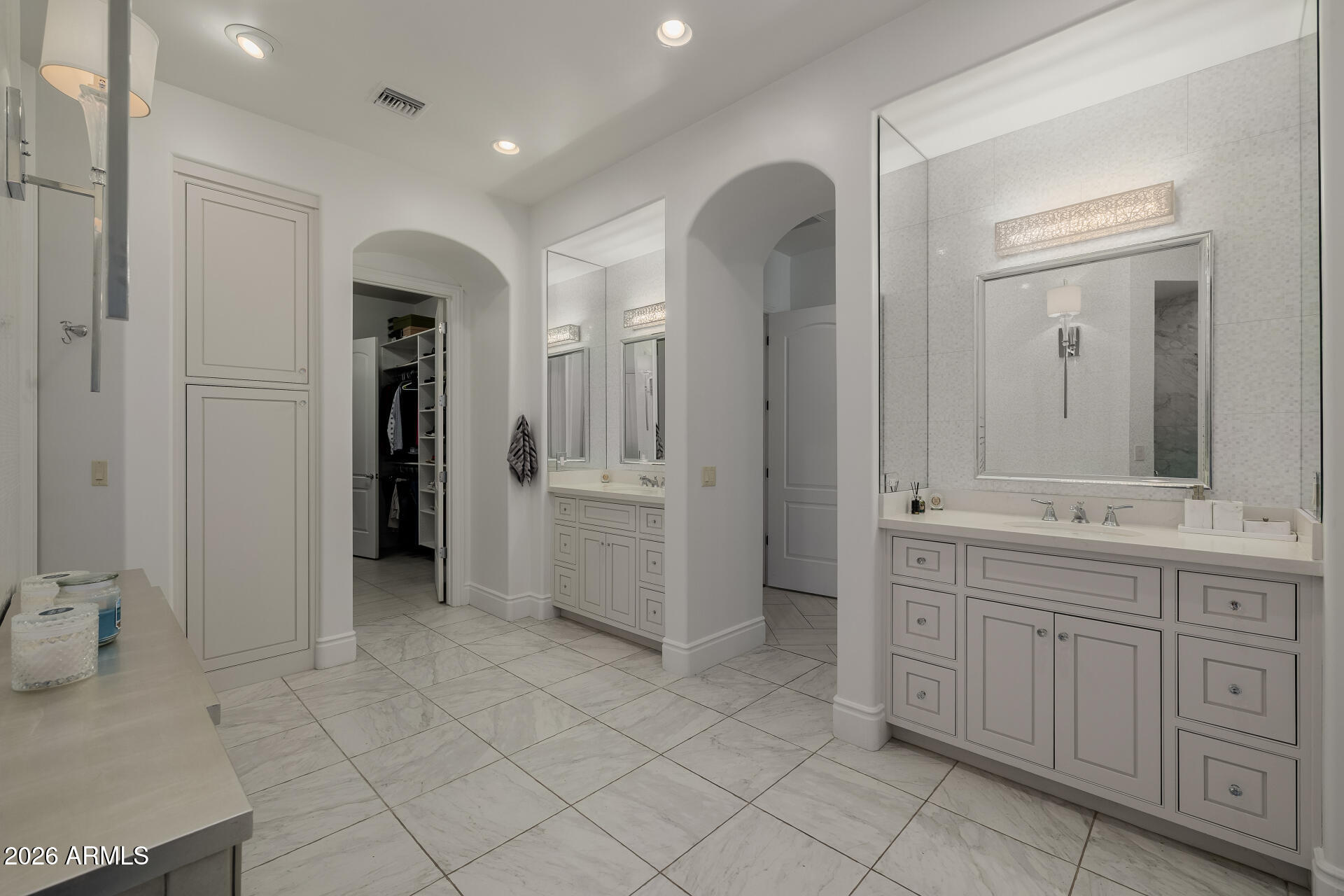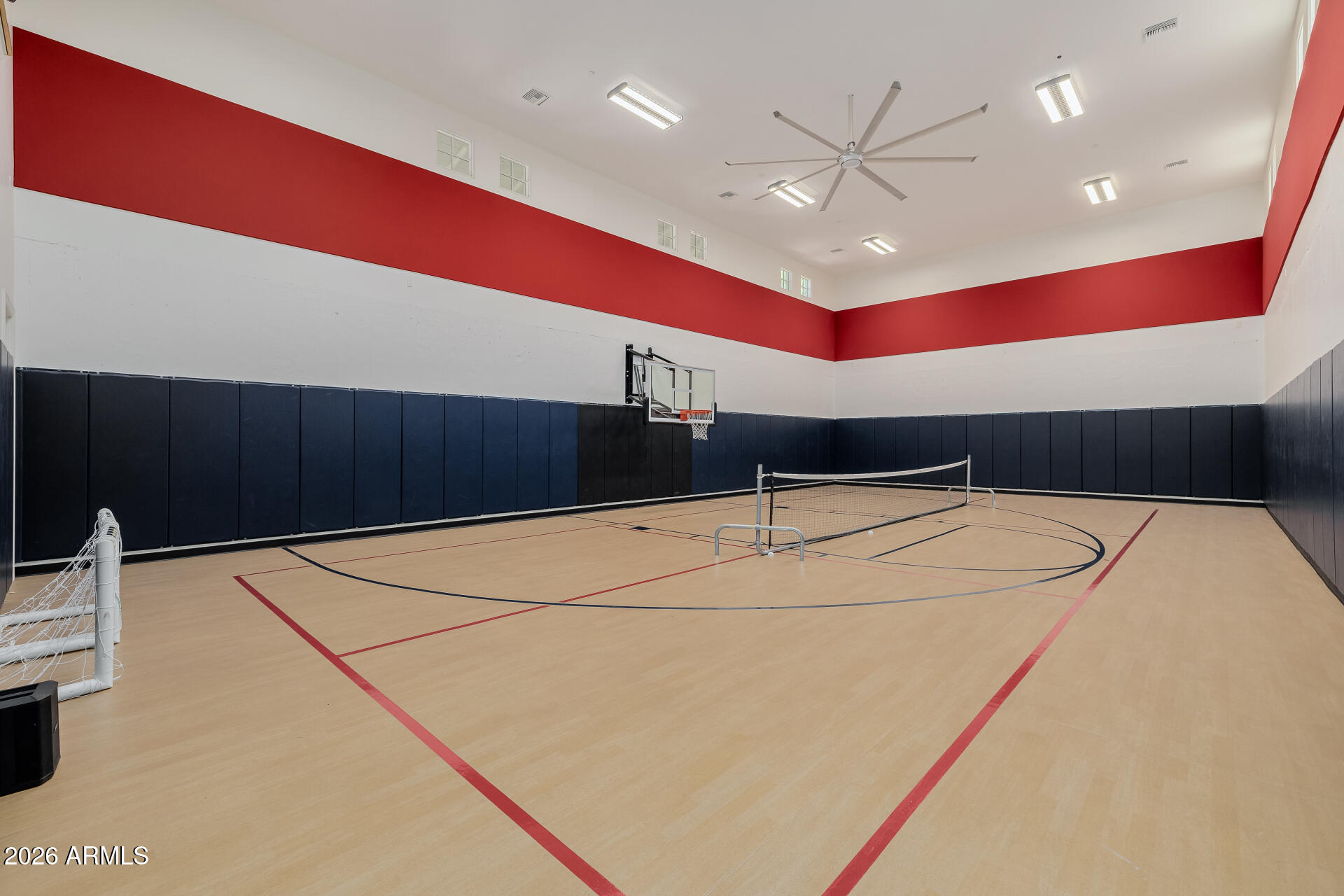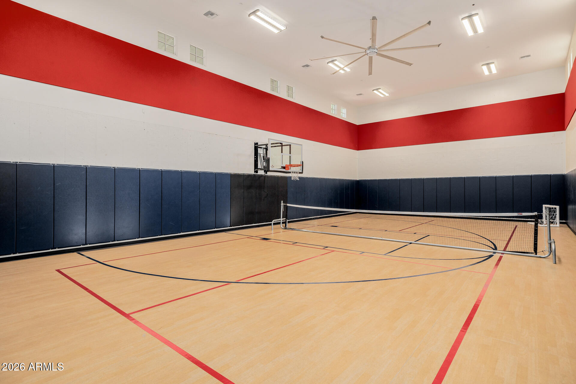 The primary suite is particularly impressive, with dual vanities, toilet rooms, a multi-head shower, extensive built-in storage, and direct laundry access. The second residence adds a recreational dimension with indoor basketball and pickleball courts, along with a guesthouse or man cave that includes a full kitchen, TV room, and extra beds.