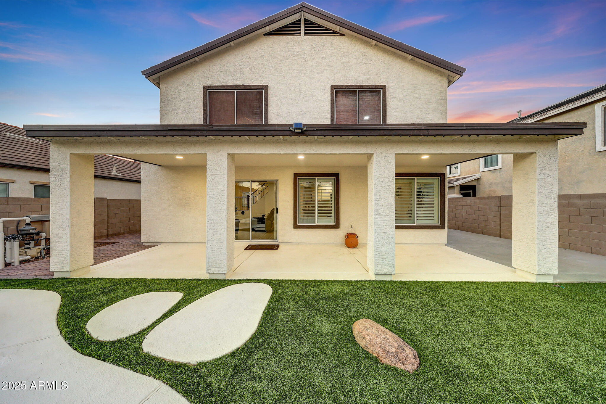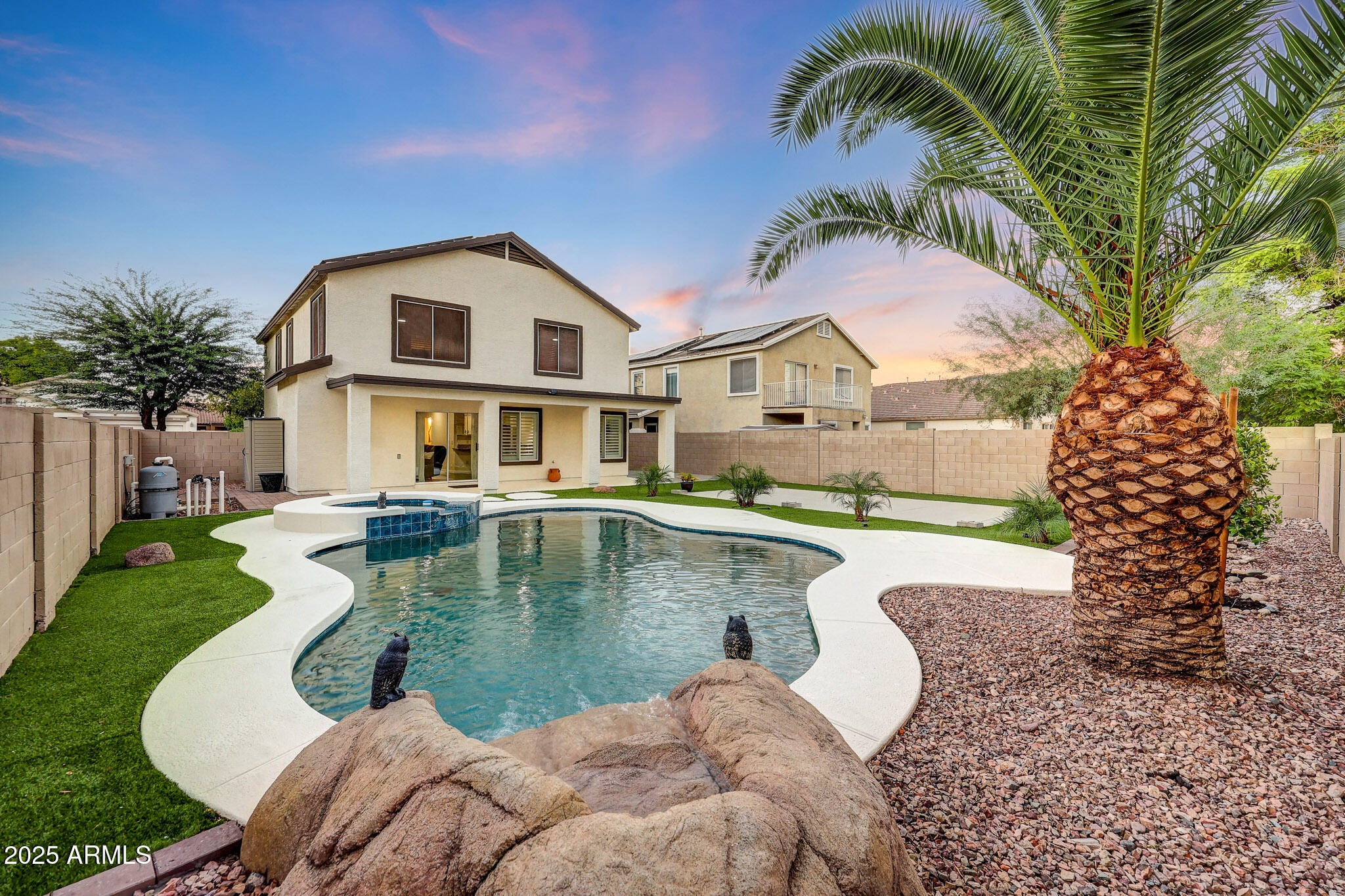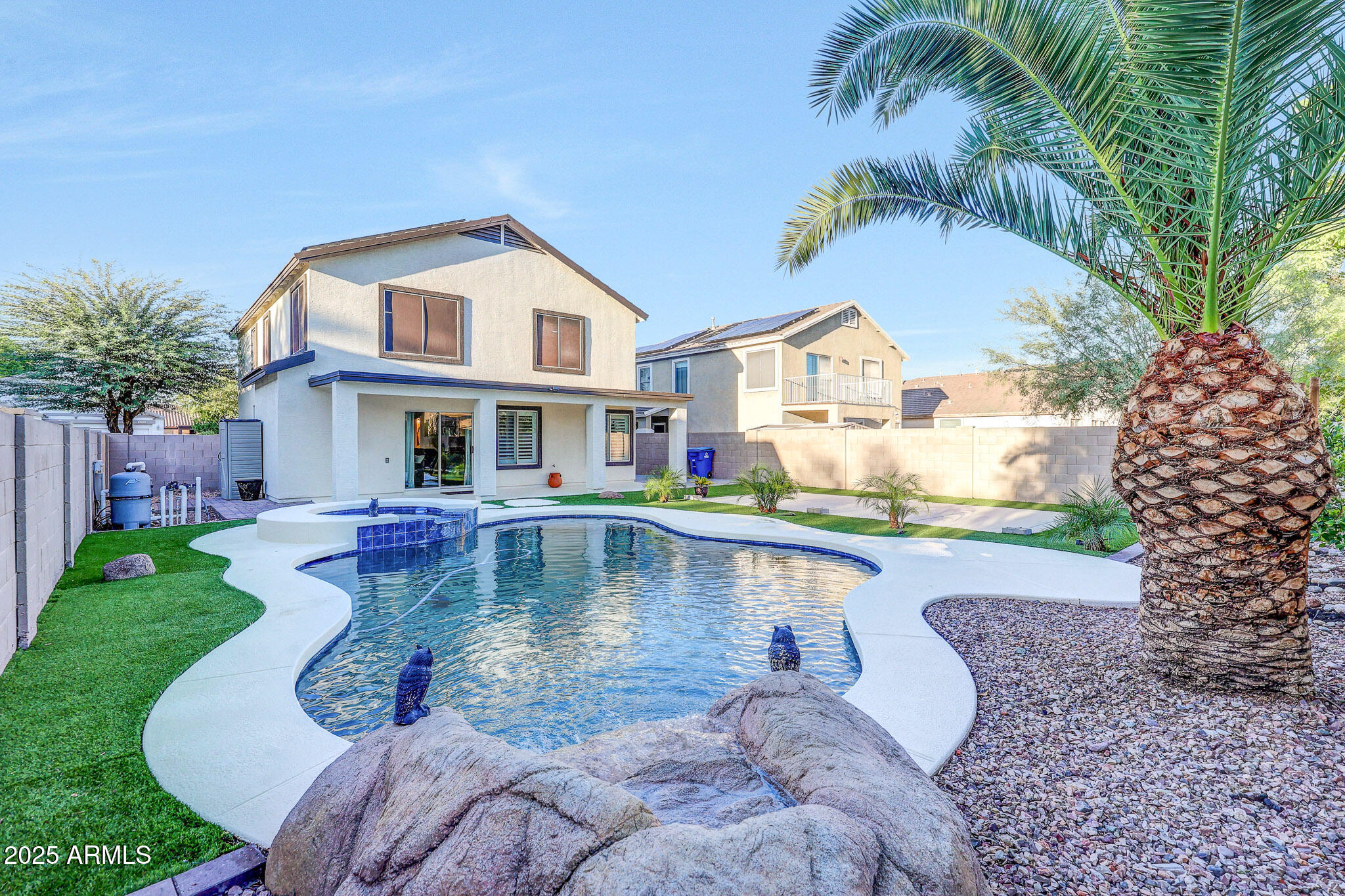 Welcome Home to this beautiful home located in the highly desirable Dreaming Summit community of Litchfield Park.This pristine 2-story home offers 4 bedrooms, 2.5 bathrooms, a loft, and a downstairs den. The updated kitchen features quartz countertops, upgraded appliances, a built-in microwave, and a spacious walk-in pantry. Mission-style stair rails lead you upstairs to a loft/family room and four generously sized bedrooms, including a primary suite with double sinks and large closet. Additional highlights include no carpet, upgraded ceiling fans, custom window treatments, leased solar, and an extended covered patio. The backyard is an entertainer's dream with a private pool, rock waterfall, spa, and extra RV parking. This home truly has it all--come see it today