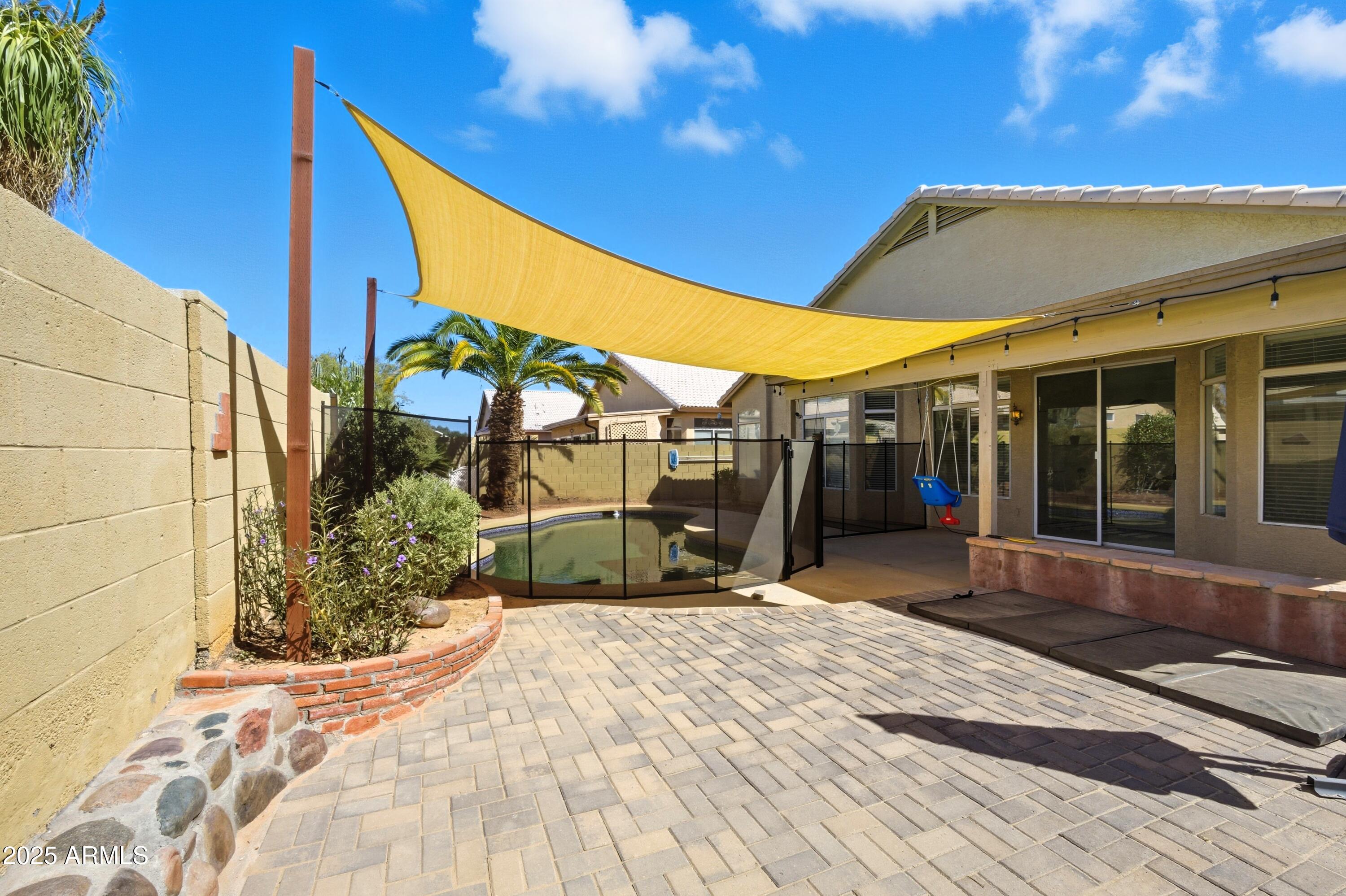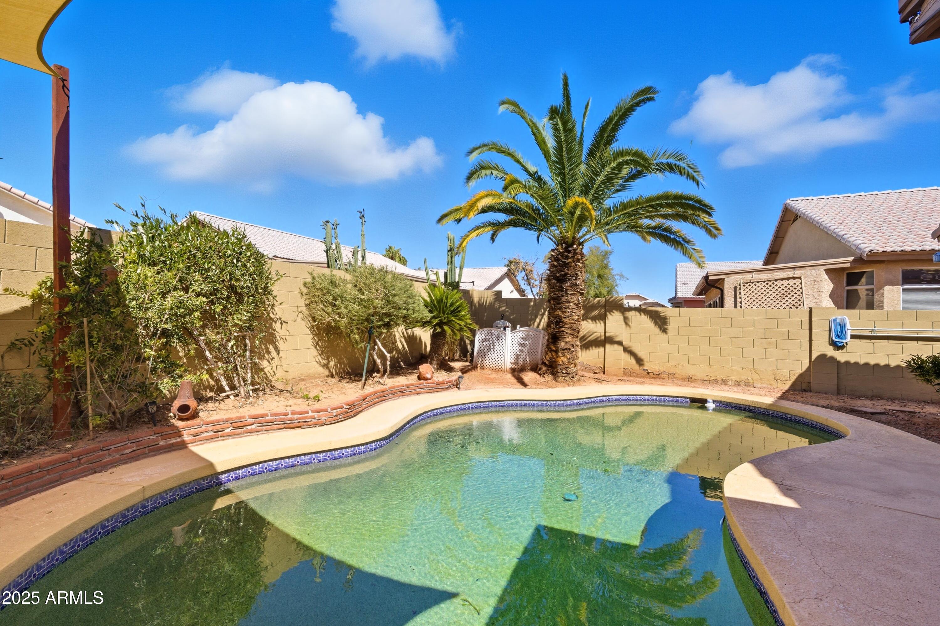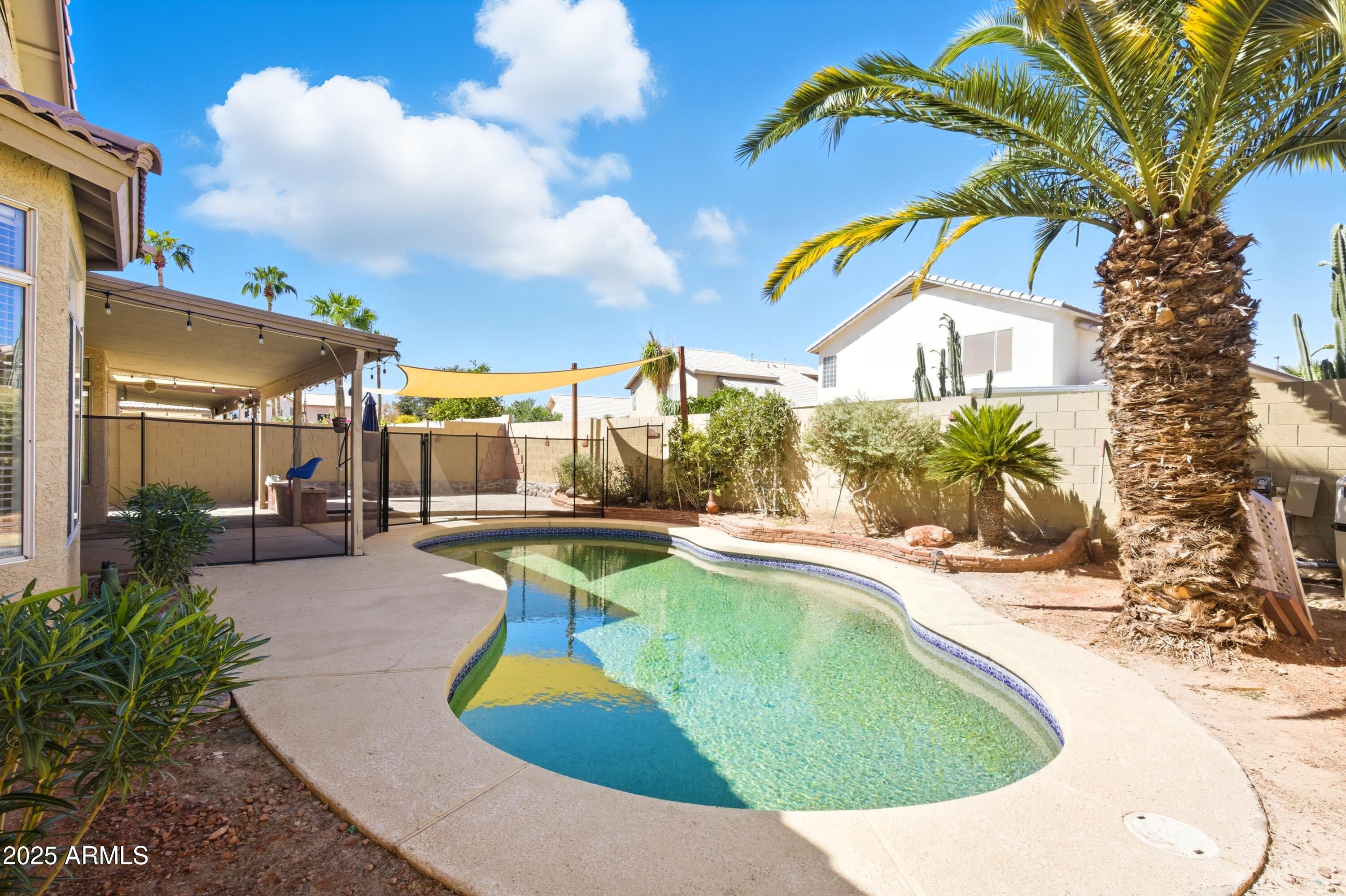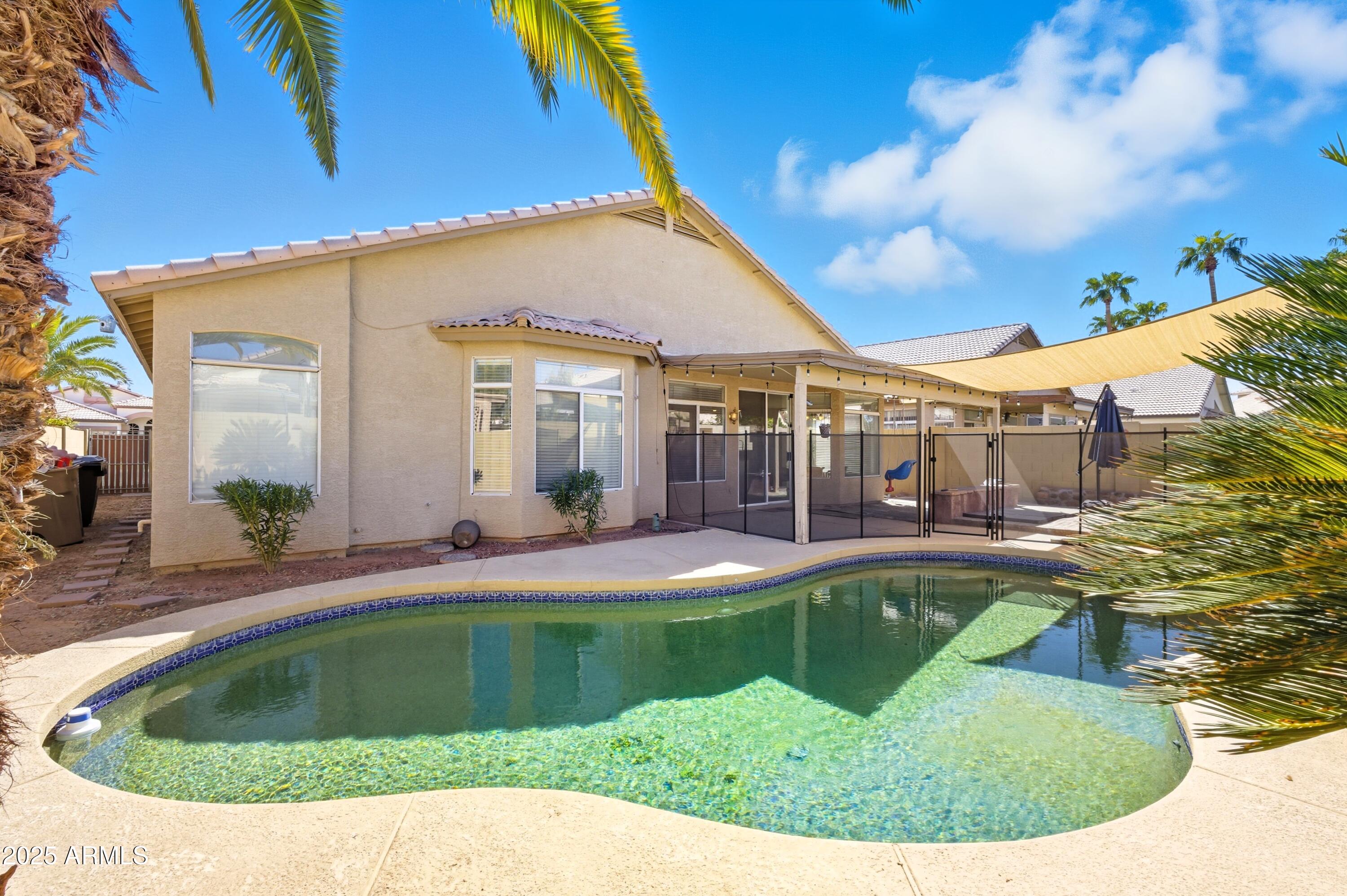 Step inside to an open, light-filled floor plan featuring vaulted ceilings, and a bright, inviting ambiance. The modern kitchen offers a subway tile backsplash, granite countertops, stainless steel appliances, and a large island that opens seamlessly to the family room--perfect for entertaining or relaxing with family. Enjoy serene backyard views from the main living areas, or retreat to the spacious primary suite with dual sinks, a soaking tub, and separate shower. With 4 bedrooms and 2 bathrooms, this home offers flexibility for any lifestyle. Step outside to your backyard oasis and cool off in the sparkling PebbleTec pool surrounded by lush landscaping and plenty of space to unwind. Located close to top-rated schools, shopping, dining, entertainment, and premier golf, this Palm Valley gem truly has it all. Don't miss your chance to make this home yours!
