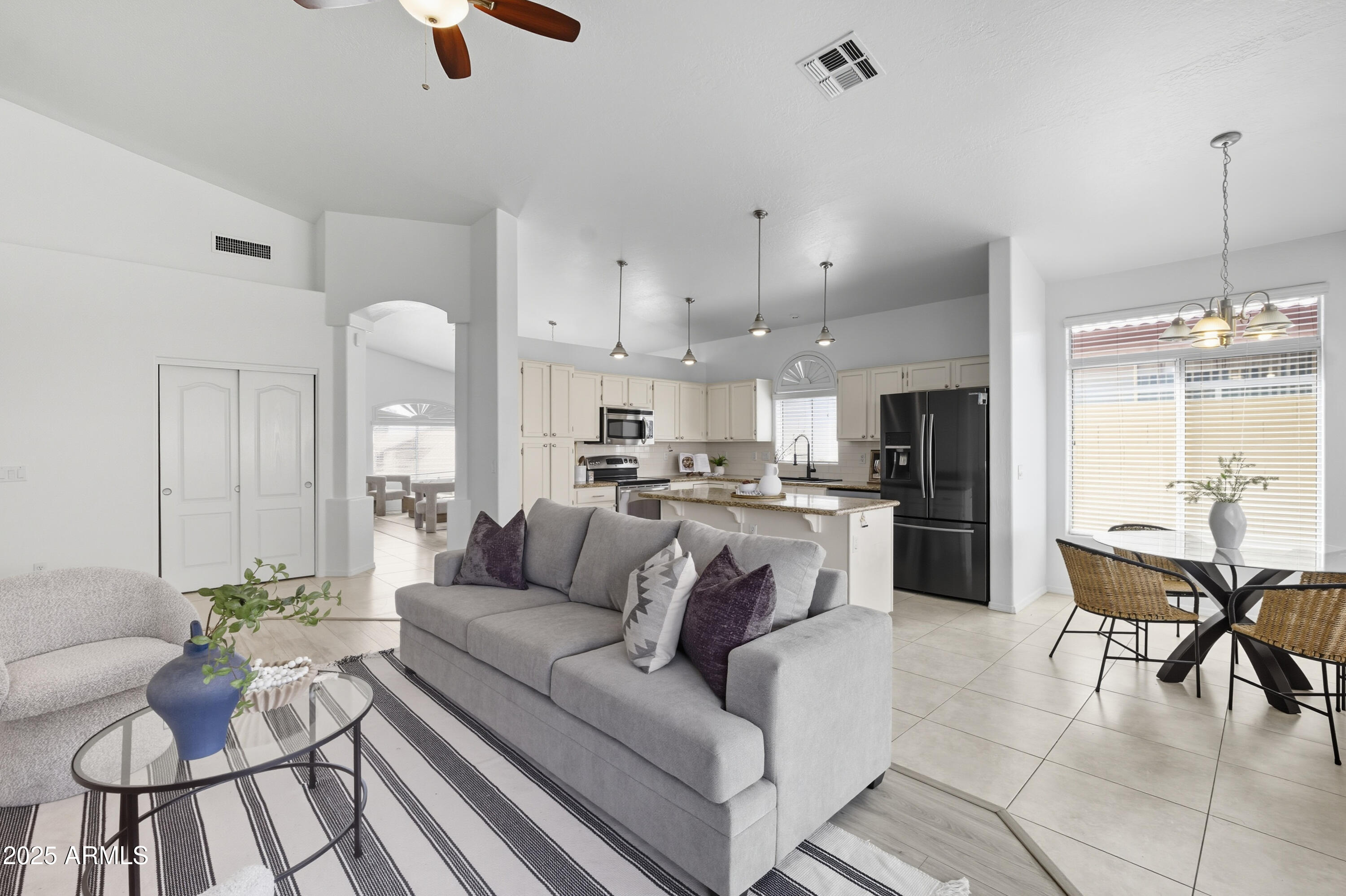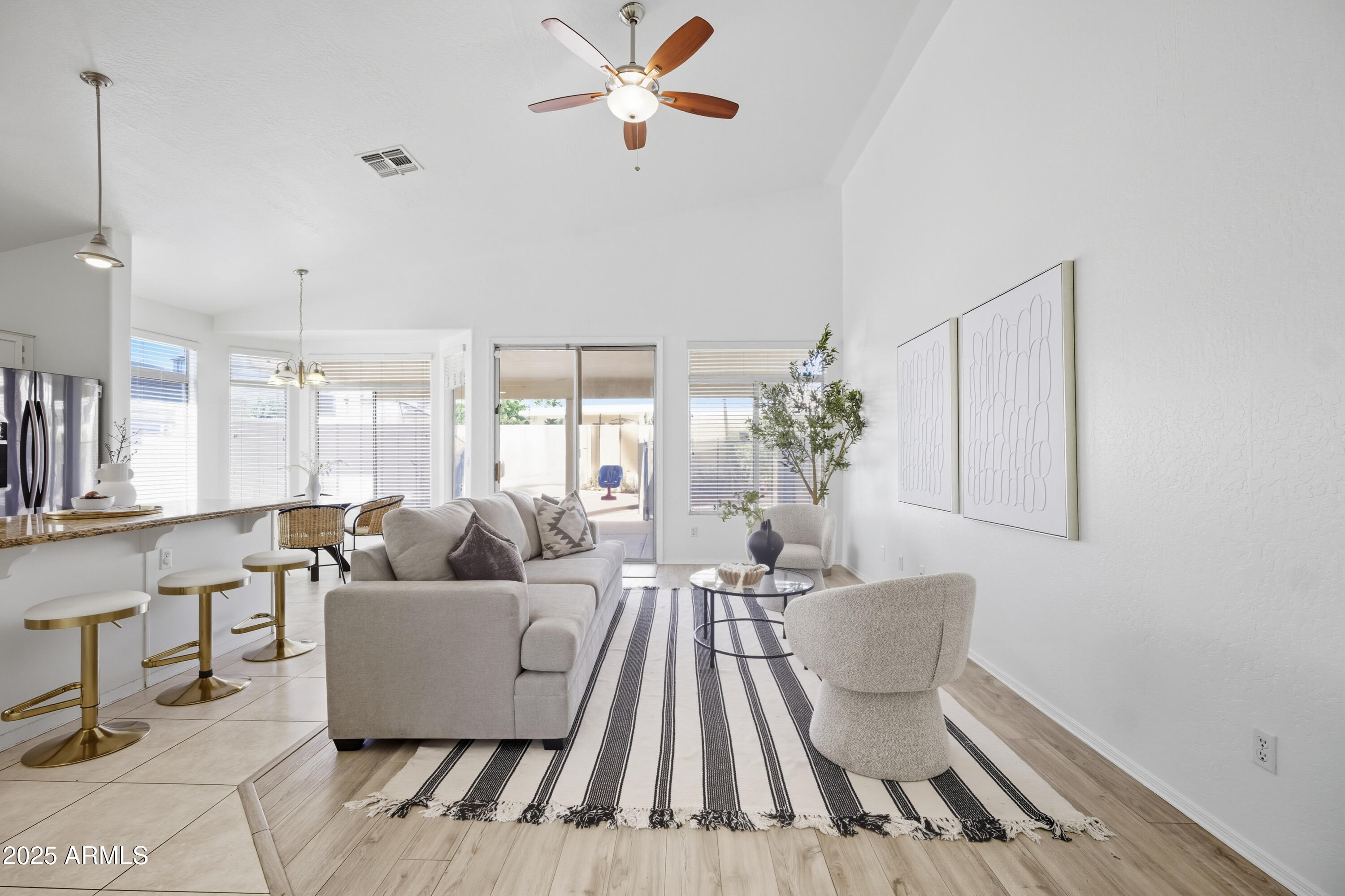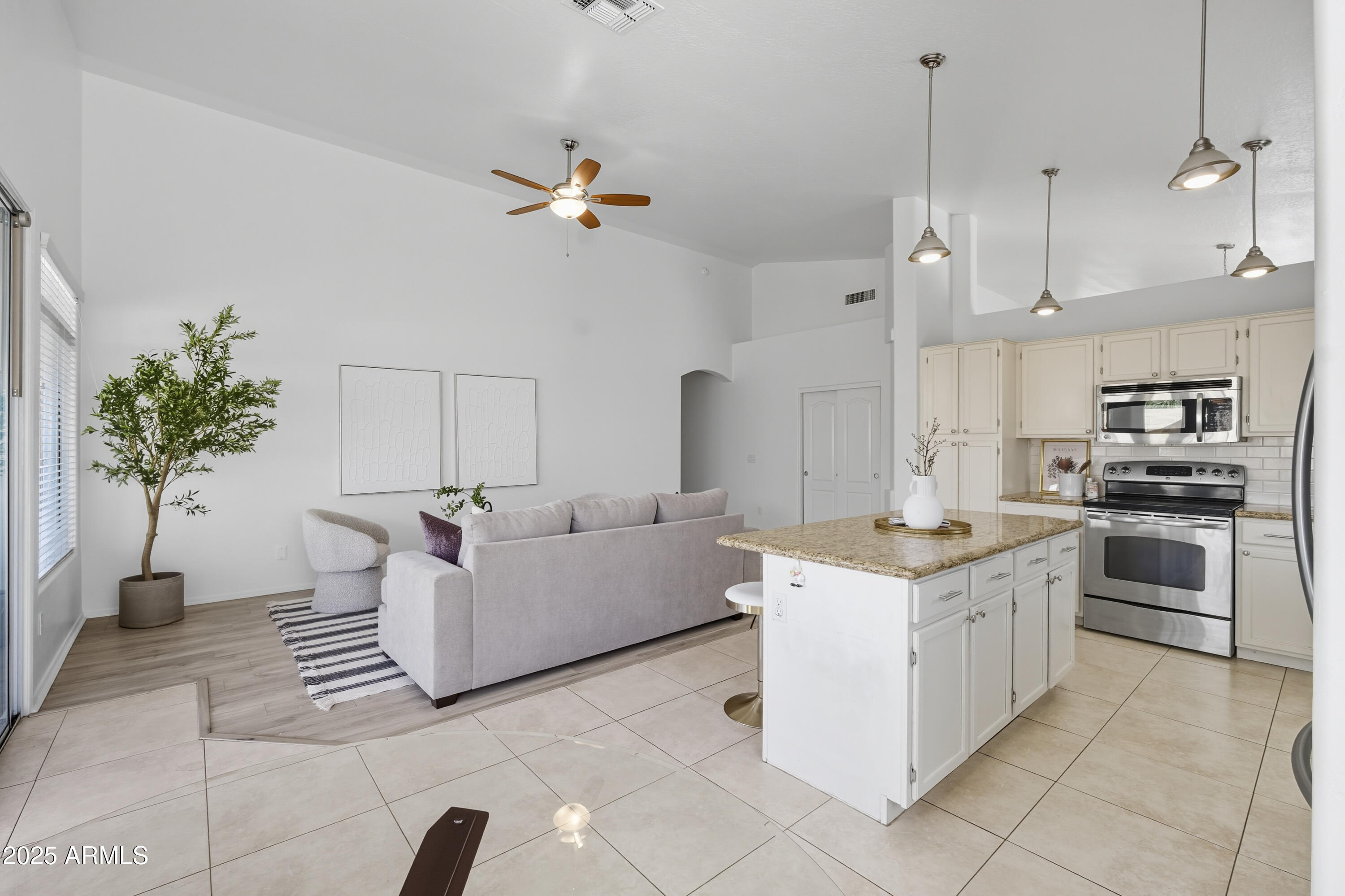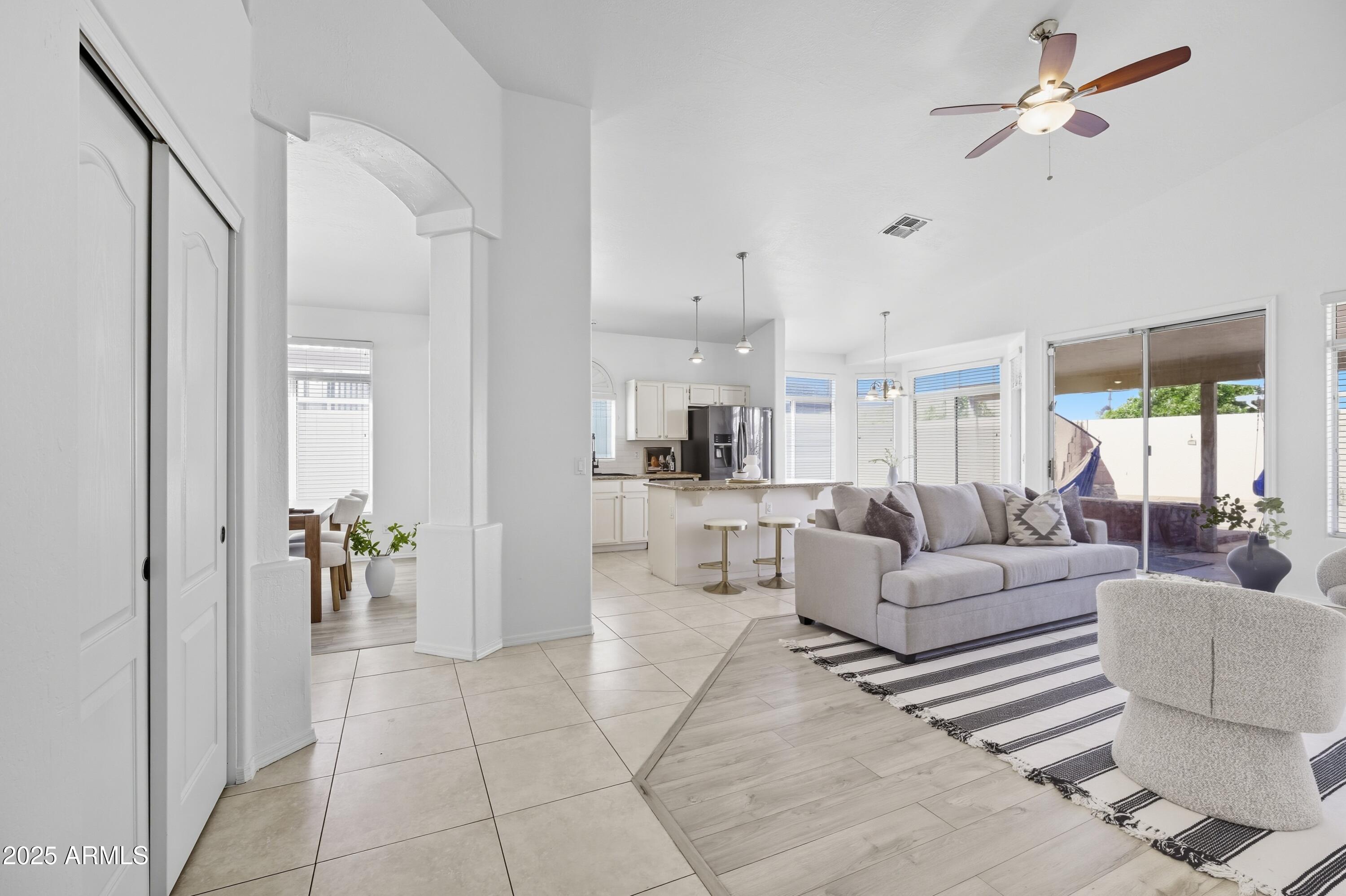 Step inside to an open, light-filled floor plan featuring vaulted ceilings, and a bright, inviting ambiance. The modern kitchen offers a subway tile backsplash, granite countertops, stainless steel appliances, and a large island that opens seamlessly to the family room--perfect for entertaining or relaxing with family. Enjoy serene backyard views from the main living areas, or retreat to the spacious primary suite with dual sinks, a soaking tub, and separate shower. With 4 bedrooms and 2 bathrooms, this home offers flexibility for any lifestyle. Step outside to your backyard oasis and cool off in the sparkling PebbleTec pool surrounded by lush landscaping and plenty of space to unwind. Located close to top-rated schools, shopping, dining, entertainment, and premier golf, this Palm Valley gem truly has it all. Don't miss your chance to make this home yours!