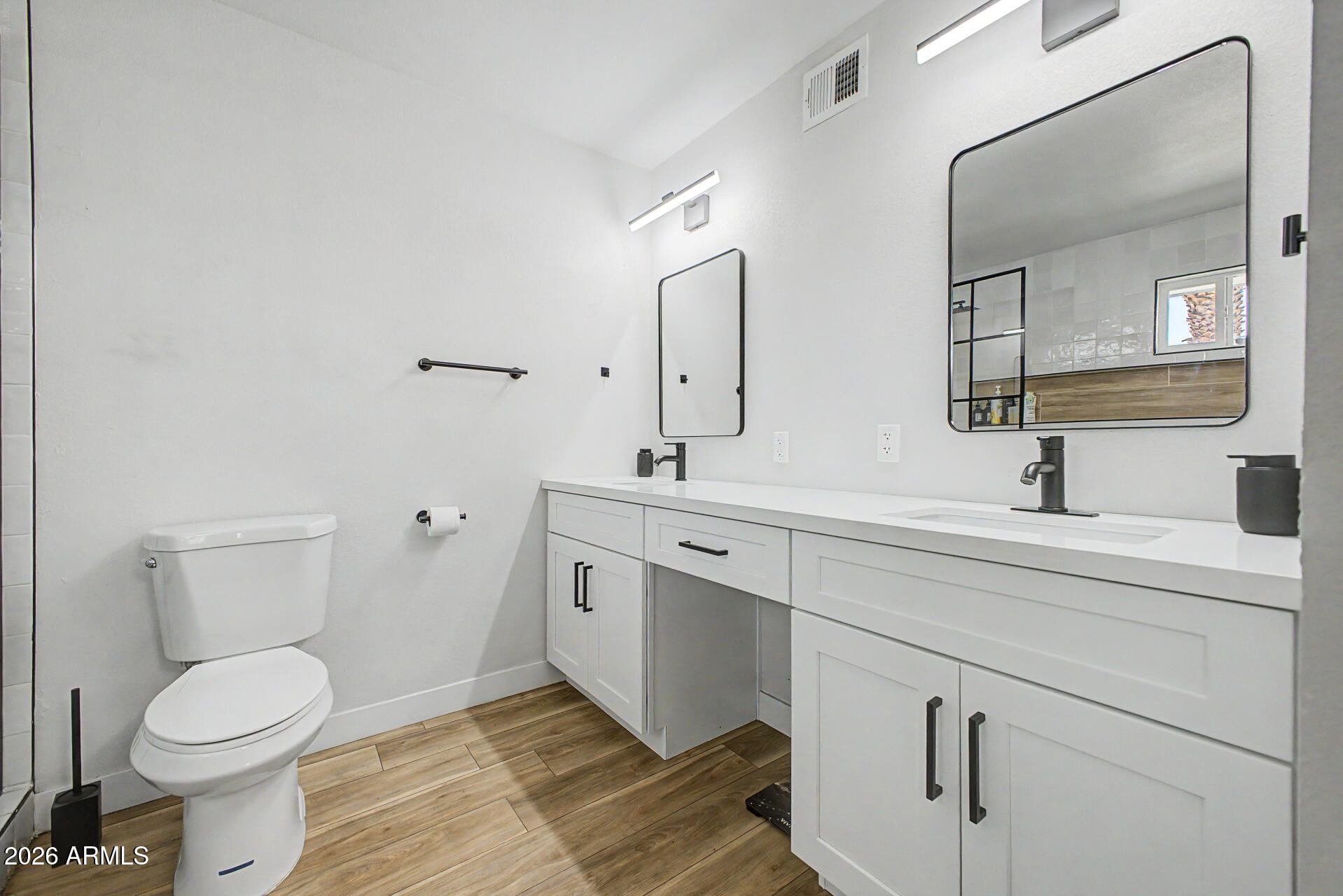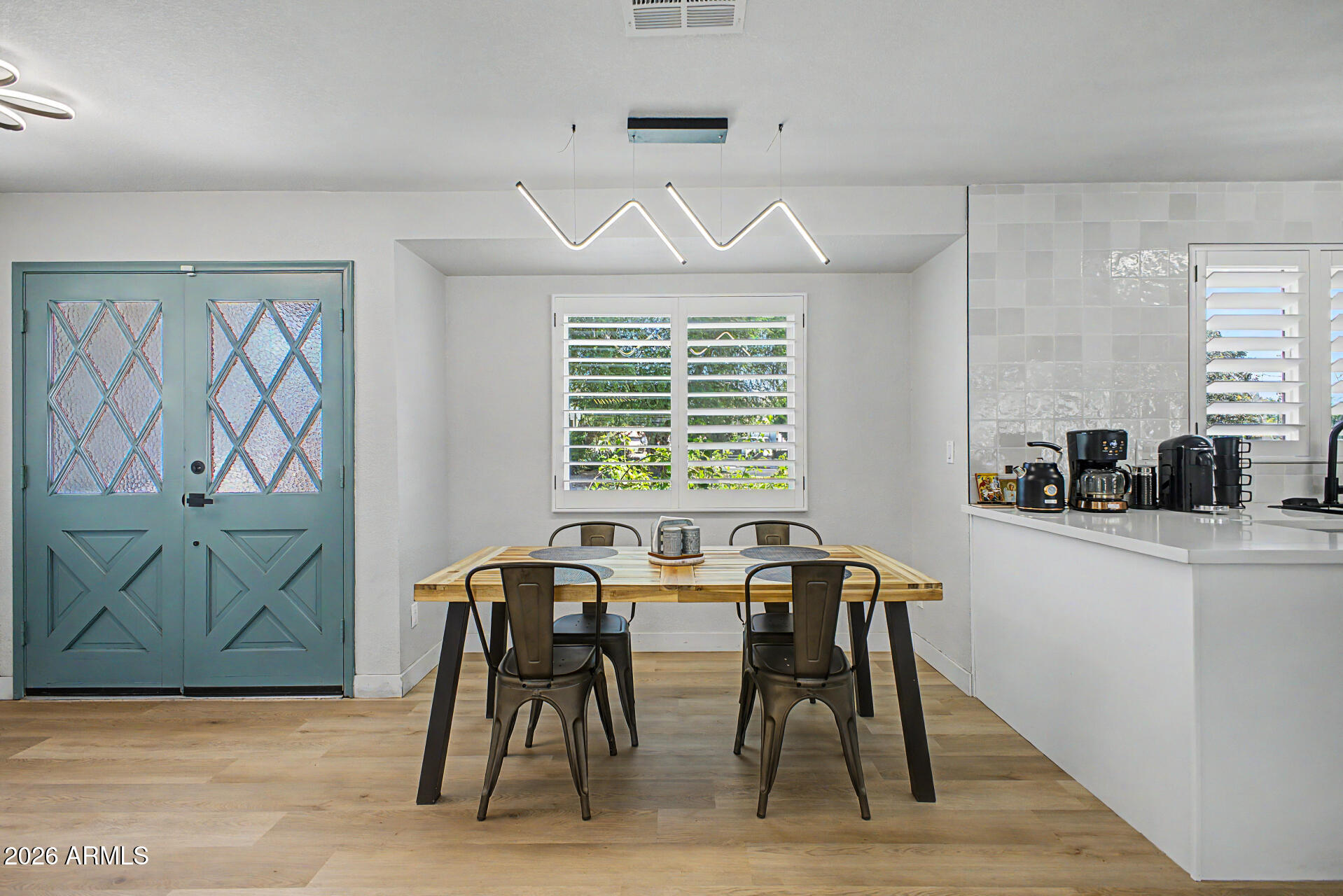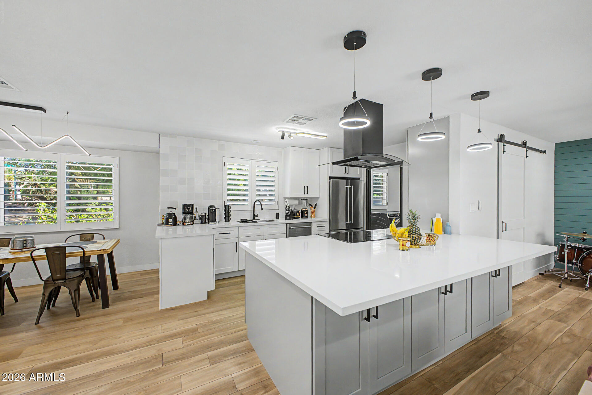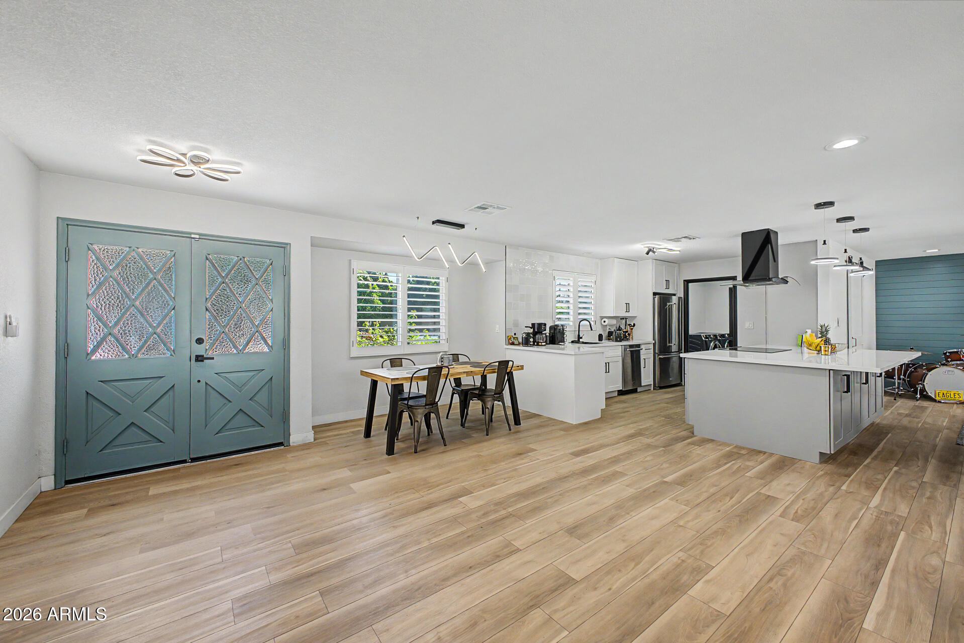The kitchen includes quartz countertops, stainless steel appliances, and modern white and gray shaker cabinets. Flooring has been updated with wood-look vinyl and upgraded carpet. The family room boasts a stylish floor-to-ceiling tiled fireplace and new wood shutters.