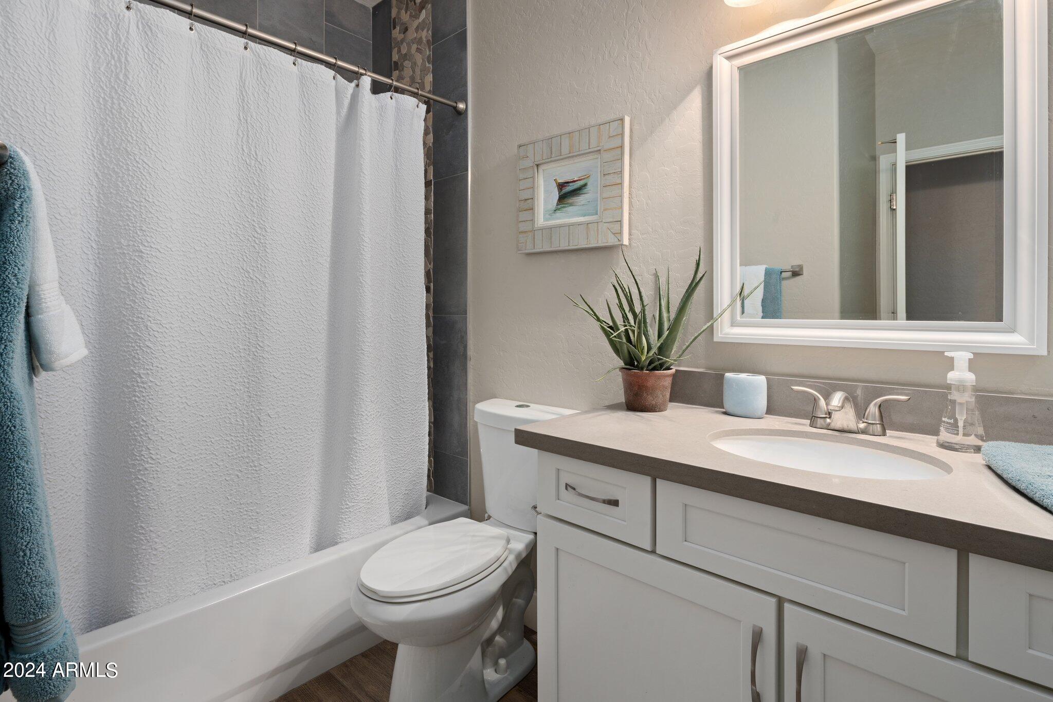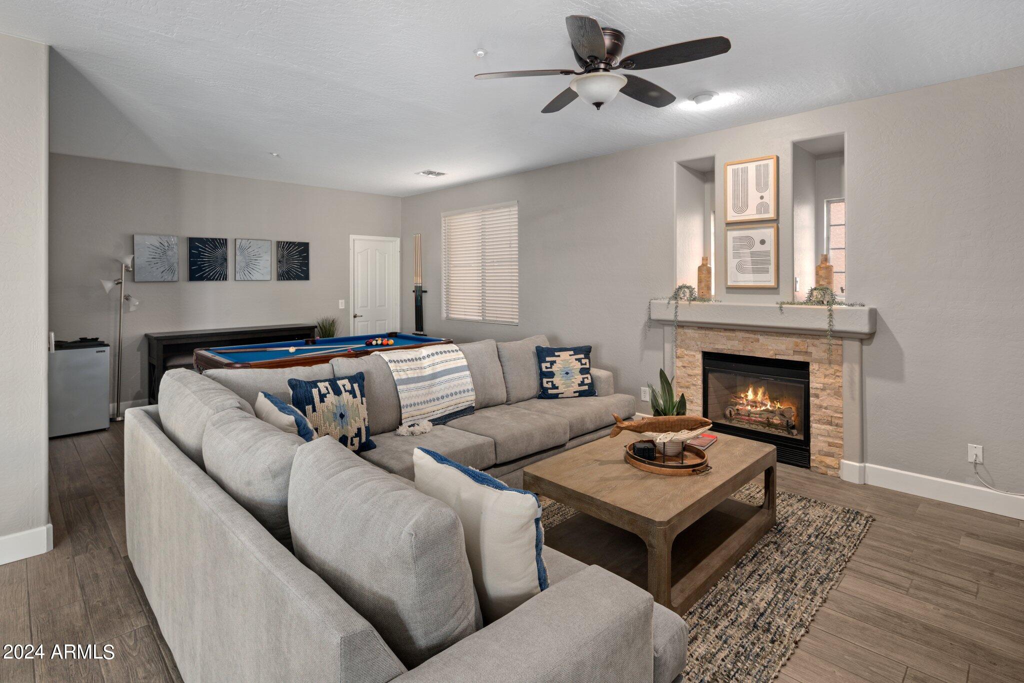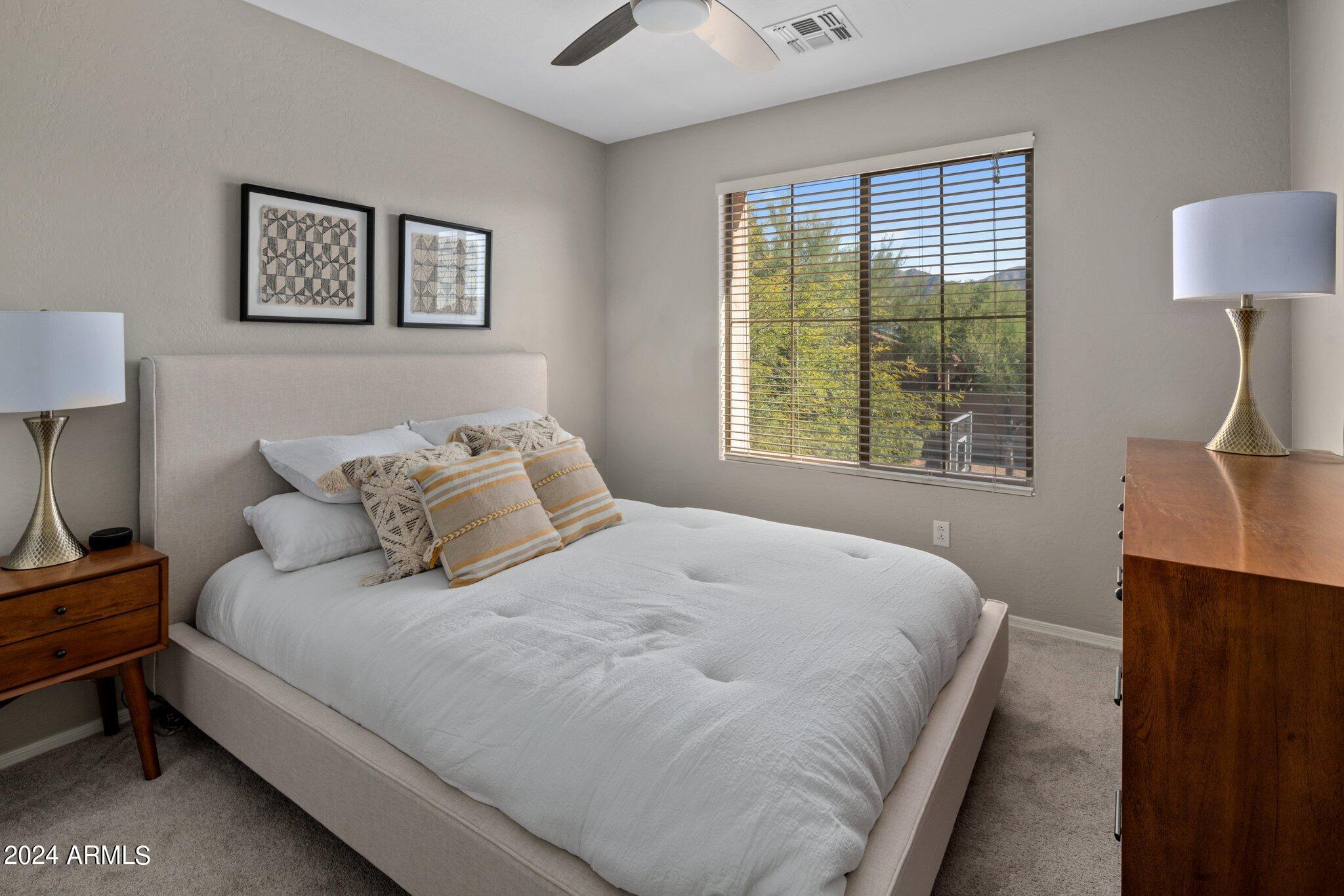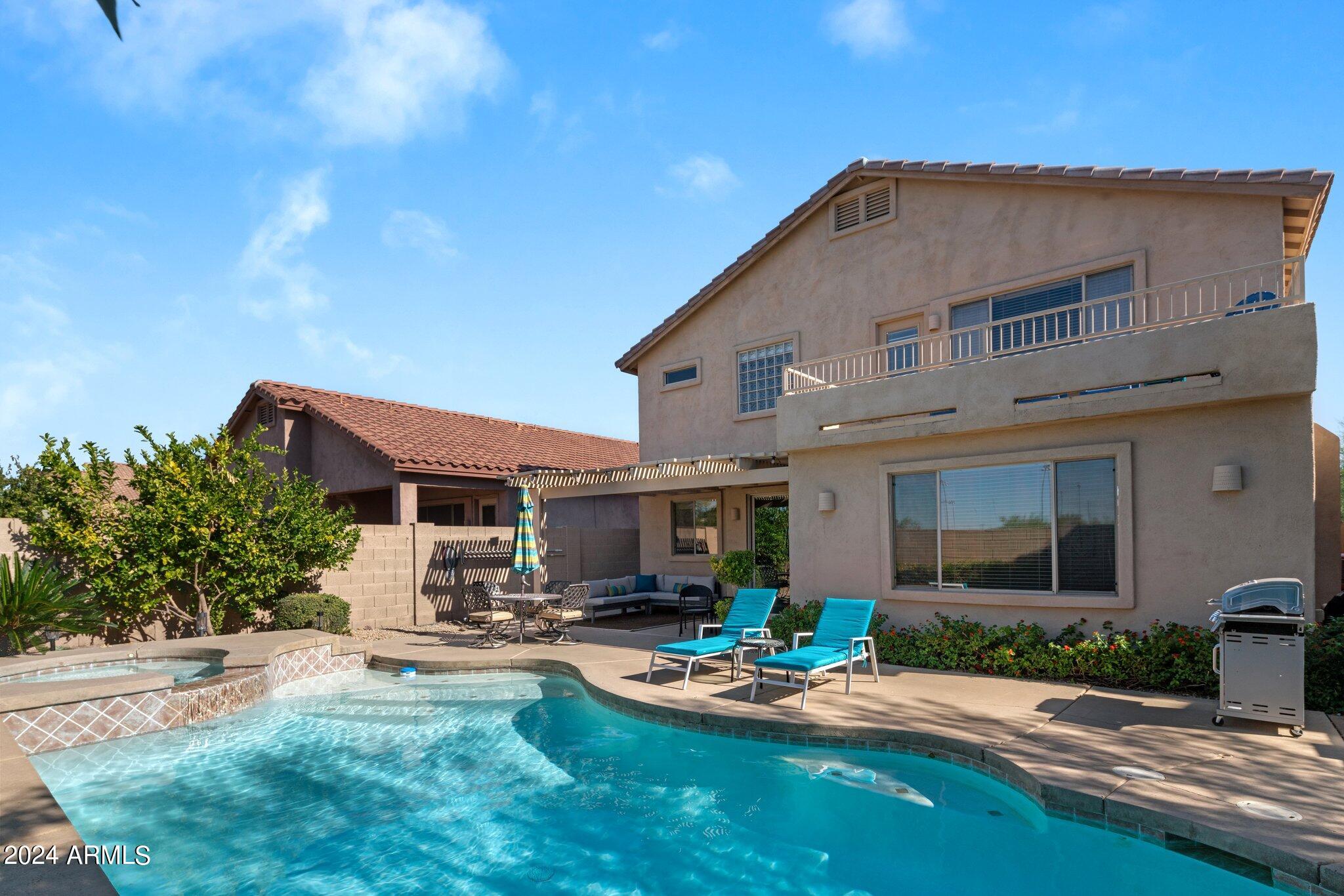 MUST SEE McDowell Mountain Ranch Masterpiece! 4 beds/3 baths PLUS a large home office. Backyard shines with a sparkling heated pool & spa. Beautifully updated, this lovely home includes soft close shaker cabinets, quartz countertops, wood-like porcelain tile floors, plush carpet w/ upgraded pad upstairs, gas fireplace, double oven/gas range, master bathroom features tile shower, oversized soaking tub w/ tile surround, double sinks w/ modern light fixtures. Huge walk-in closet in the primary bedroom . Downstairs bathroom has a lovely tile shower as well. Both AC's have been replaced. Canned lighting added & modern light fixtures. Pool/spa have been resurfaced & automated. Backyard w/citrus trees. Community has tennis, pickelball, heated pool/spas, walking & hiking trails & golf course.
