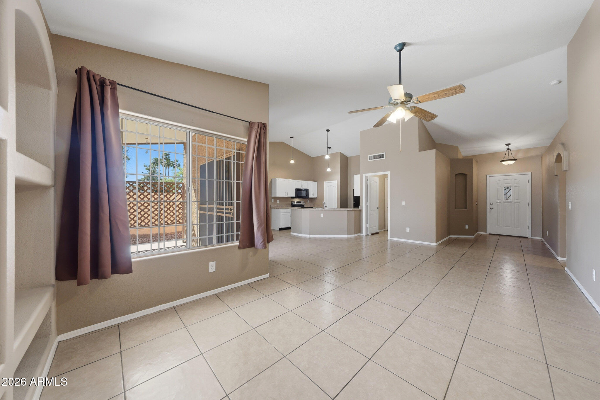 Charming 3-bedroom, 2-bath home with 1,691 sq ft of comfortable living space. The open floor plan creates a bright, spacious feel and allows for easy flow between the living, dining, and kitchen areas--ideal for everyday living and entertaining. The neutral kitchen offers a clean, timeless design with plenty of cabinet and counter space. The functional layout provides comfortable bedrooms and well-sized bathrooms, while the cute, low-maintenance backyard offers a great space to relax, entertain, or enjoy Arizona evenings without extensive upkeep.A great opportunity for buyers looking for a well-designed home with easy indoor and outdoor living.