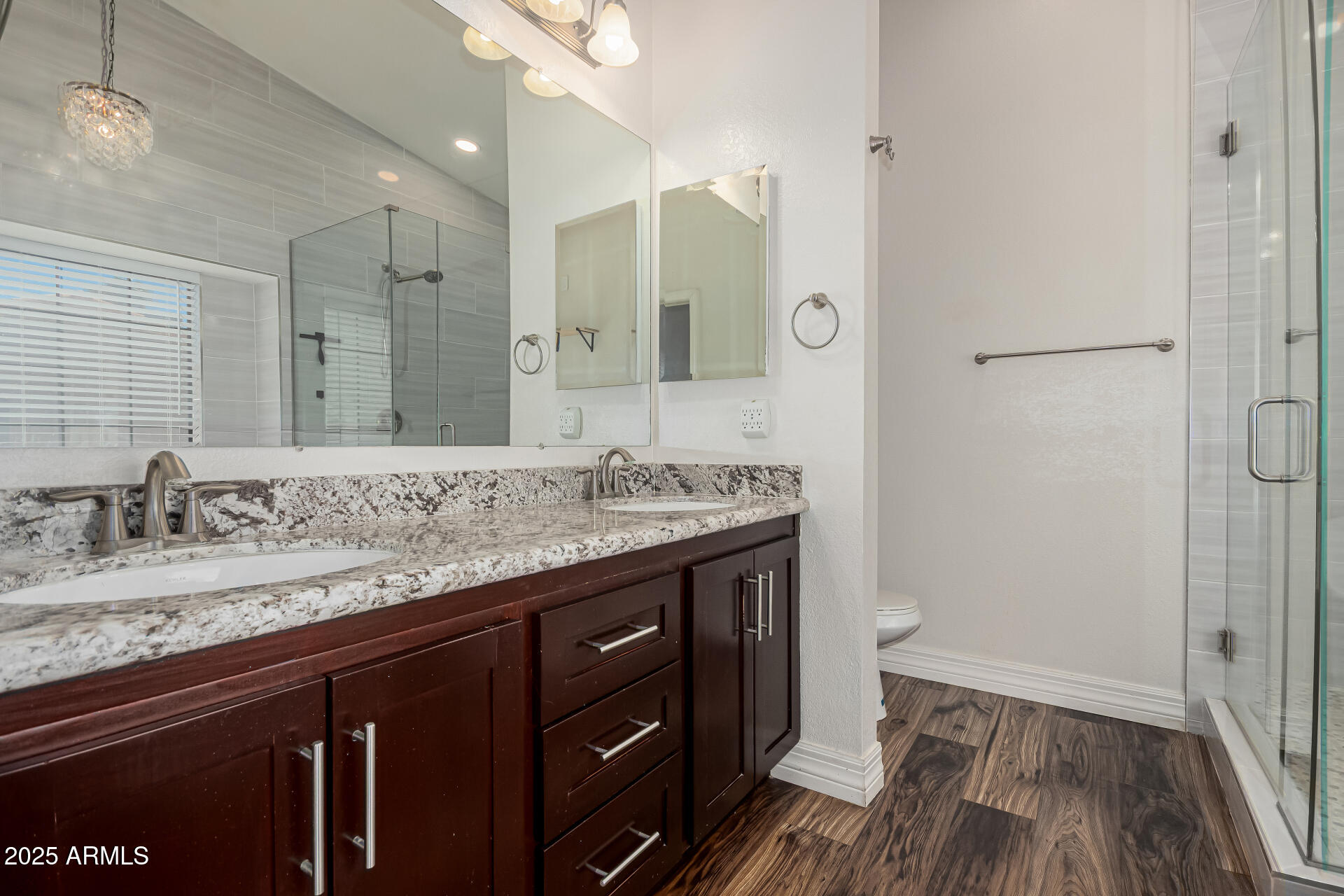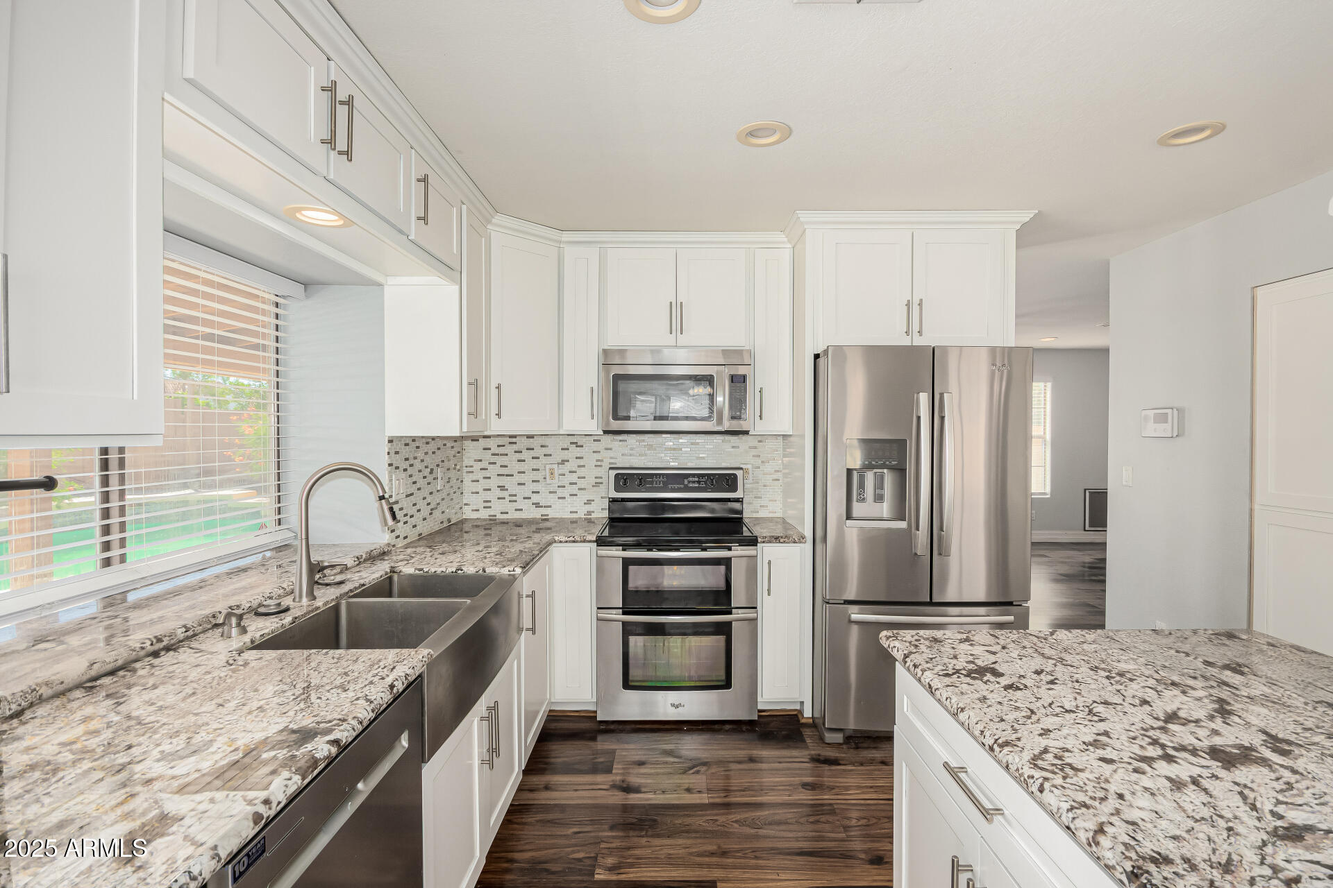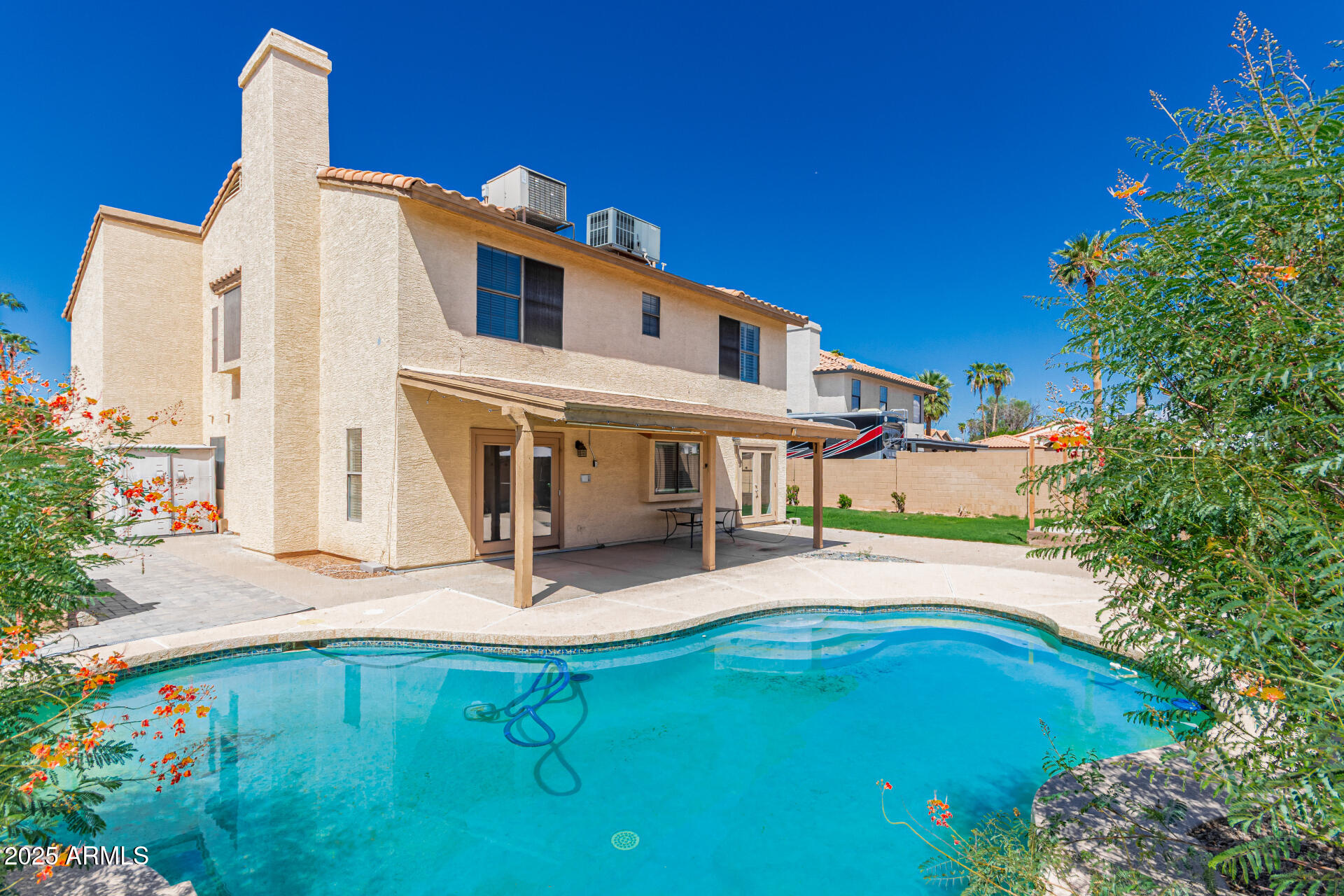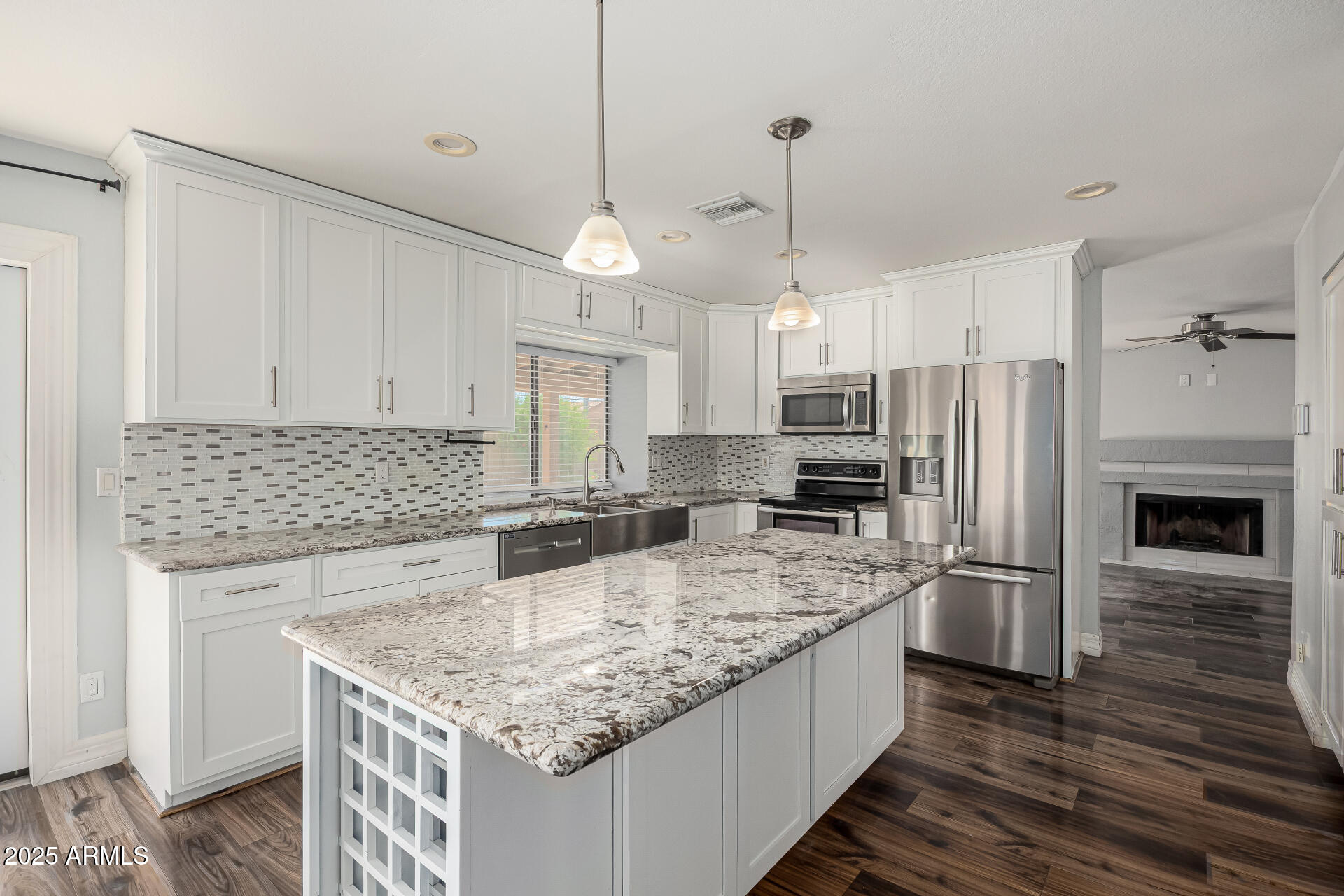 Welcome to your dream 2-story retreat! Inside, vaulted ceilings and wood-look floors set the tone for stylish comfort, while the living room greets you with warmth. Cozy up by the fireplace in the family room, or whip up gourmet meals in the kitchen featuring stainless steel appliances, granite counters, crisp white cabinetry, a mosaic tile backsplash, and a center island with a breakfast bar perfect for morning chats. Primary suite is a true haven with a walk-in closet and spa-like bath complete with dual sinks, a soaking tub, and a glass-enclosed shower. Plantation shutters add elegance to the secondary bedrooms. And when it's time to relax? Head out back to the covered patio or take a dip in your very own sparkling pool. Why just imagine it when you can live it? Act now!