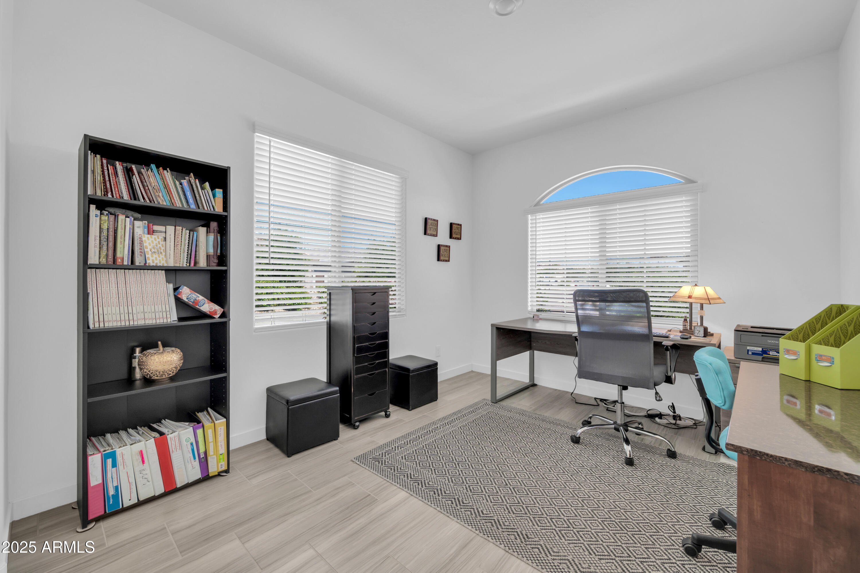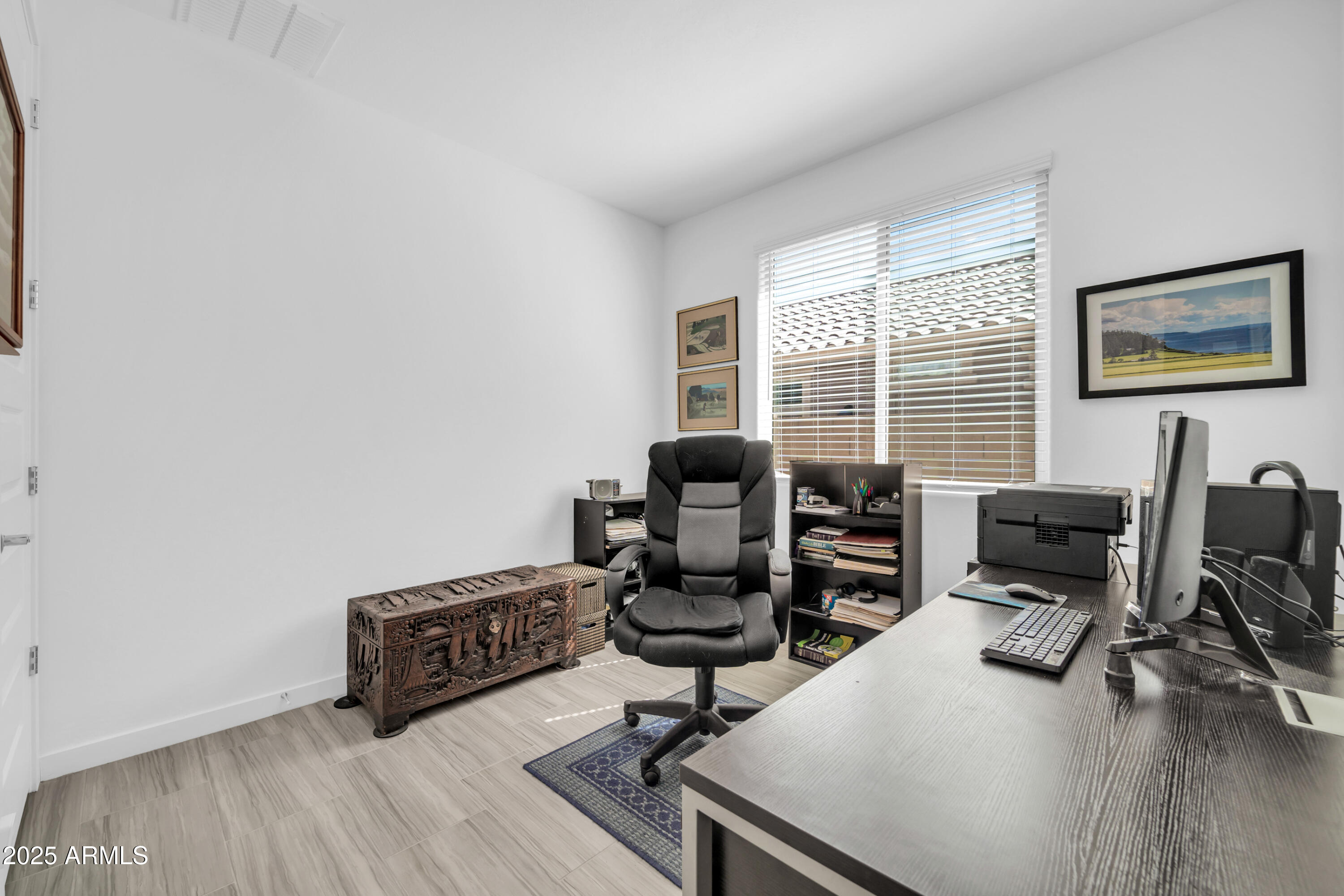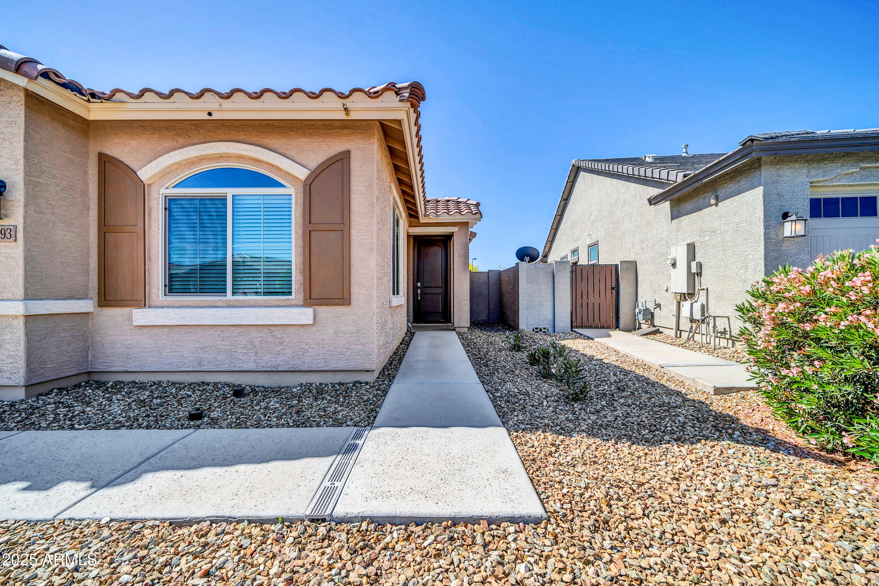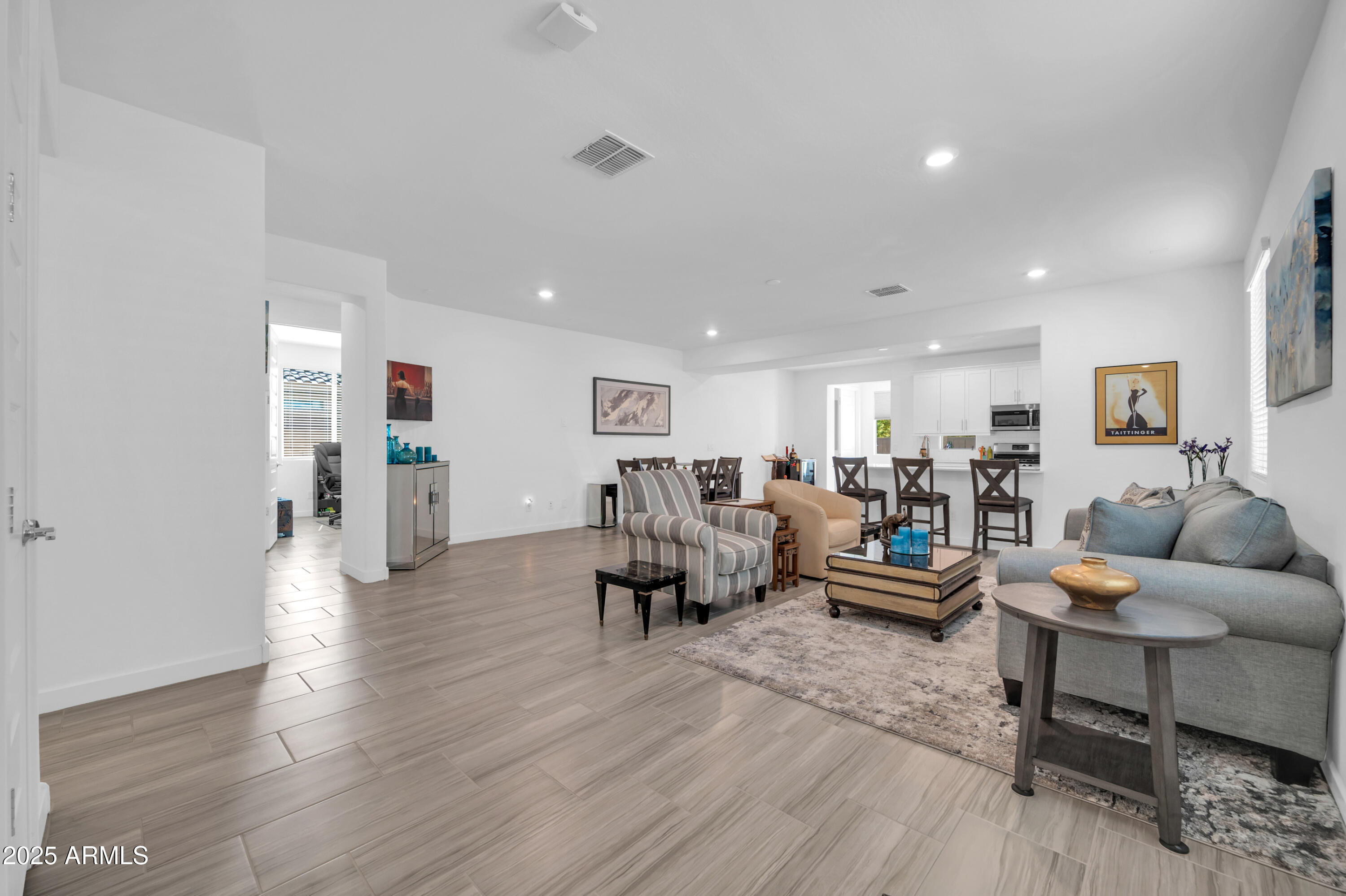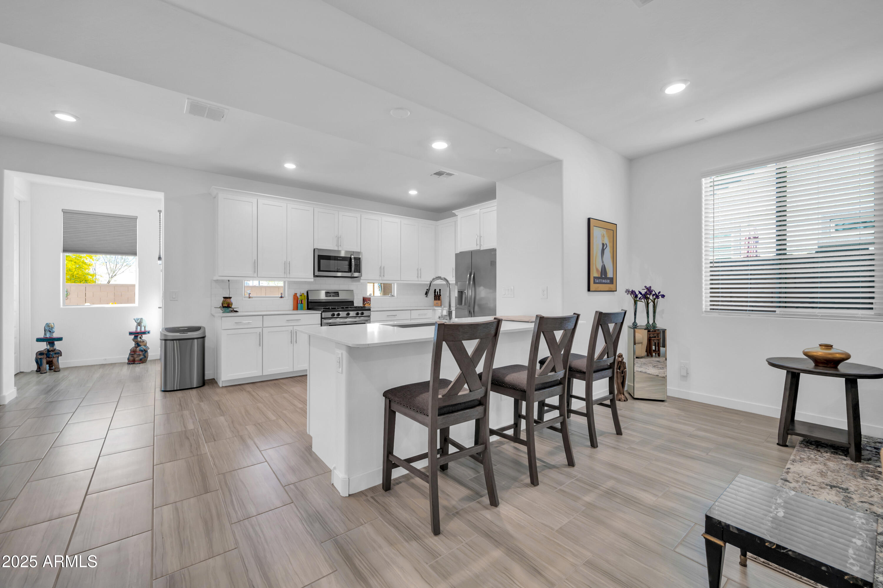 Step through the front door and you're greeted by an inviting open-concept great room where 9-foot ceilings and rich wood-look tile floors create an airy, elegant feel.Natural light pours in, highlighting the seamless flow between living, dining, and kitchen spaces perfect for cozy nights in or entertaining friends and family. The heart of the home is the chef's kitchen, complete with sleek quartz counters, crisp white 42" upper cabinets, stainless steel appliances, and an oversized island with seating that encourages conversation. A generous walk-in pantry adds function to the beauty, making it easy to host everything from casual brunches to holiday feasts.The split floor plan provides privacy for the primary suite retreat, highlighted by a spa-like oversized walk-in shower, dual sinks, and generous storage. Additional upgrades include epoxy-coated garage and patio floors plus a gas BBQ stub, making backyard cookouts under Arizona sunsets effortless.