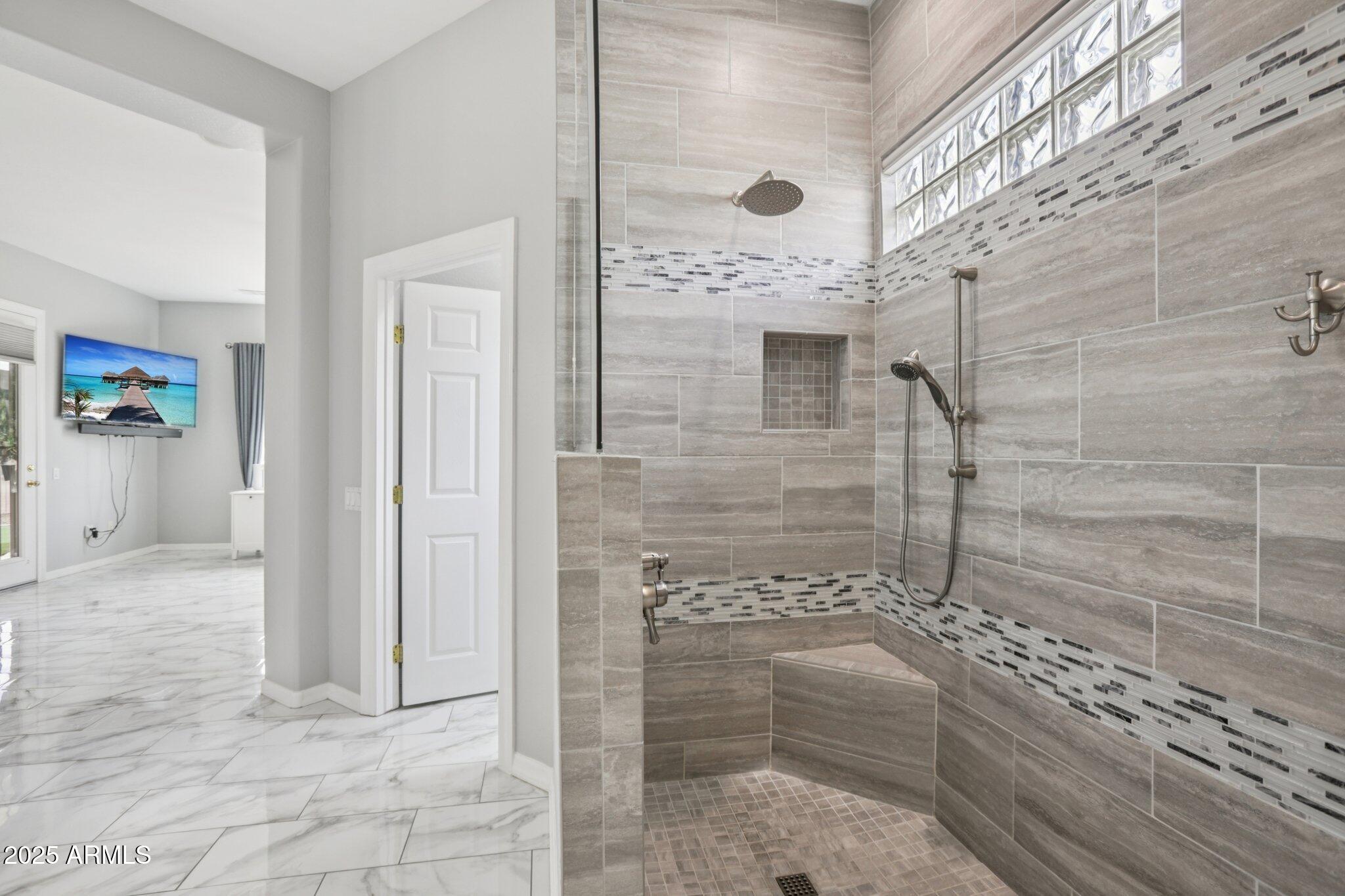 Stunning golf course lot with unobstructed fairway and White Tank Mountain views! This beautifully upgraded Cambridge model in desirable Sun City Grand sits on a premium homesite with over $200,000 in high-end renovations completed throughout. The home features imported Italian tile flooring, a fully remodeled luxury primary bath with walk-in shower, freestanding tub, updated counters, and motorized shades, plus an upgraded kitchen with new granite countertops, new sink and faucet, and a full suite of new appliances. A newly installed Western 3-panel sliding glass door with motorized shades opens to a spectacular backyard with extended travertine patio, travertine courtyard, enhanced landscaping, and a custom corn hole court. All of this showcasing sweeping golf and mountain views. Additional improvements include two new furnaces and AC units, constant hot water system, updated guest and half baths, two new garage door openers, Control 4 smart home system, Ring doorbell with cameras, reverse osmosis system, and epoxy-finished 3-car garage with storage. This rare Cambridge model offers 2 bedrooms plus den, 2.5 baths, an open great room design, and is truly move-in readyperfect for enjoying resort-style living at its finest.