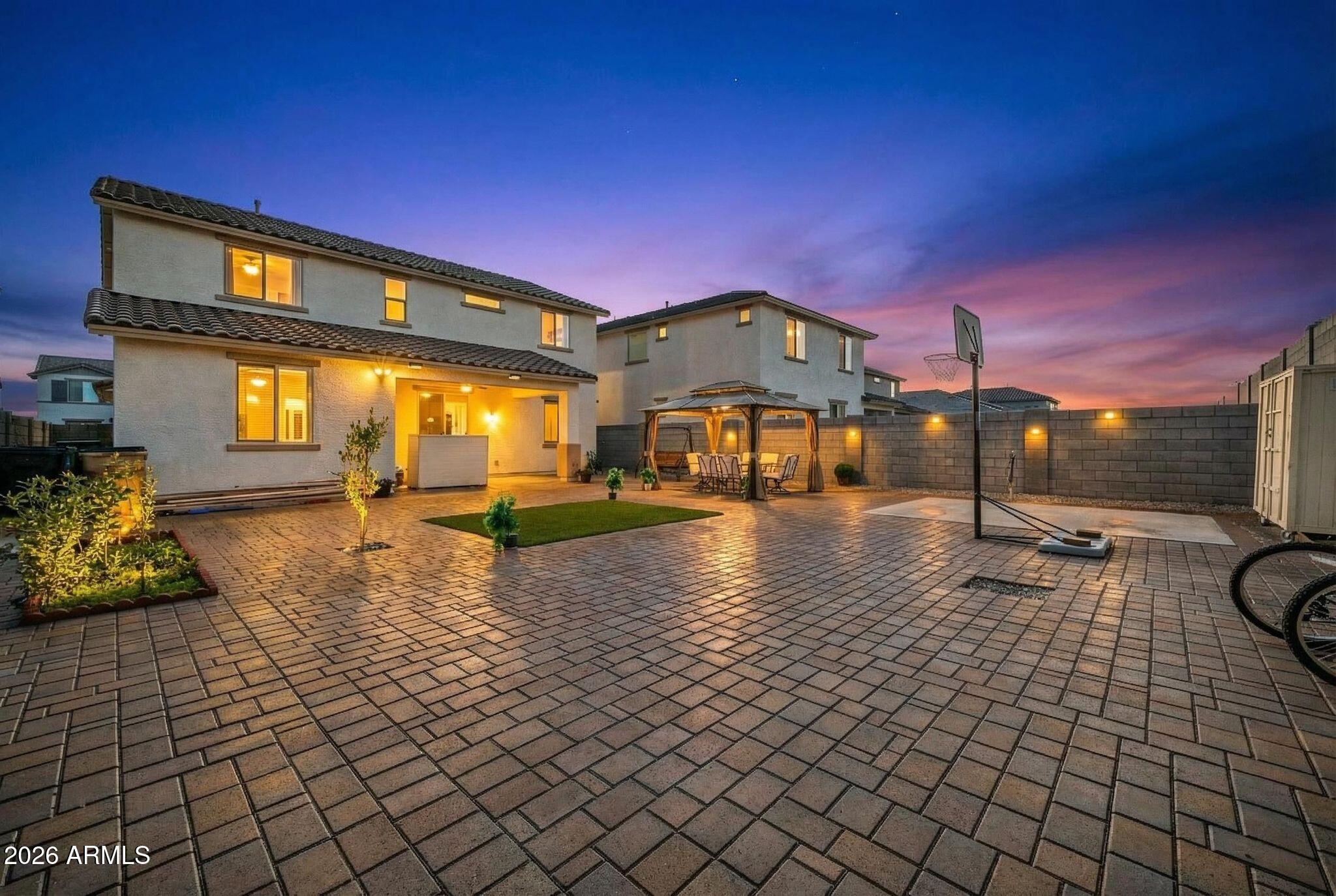 Step outside to a beautifully finished backyard designed for low-maintenance enjoyment, featuring wall-to-wall Phoenix-native pavers, artificial turf, a gazebo, sealed pavers for easy cleaning, and pre-installed electrical and water lines for future use. Additional water lines with timers are already in place for gardening or landscaping projects.