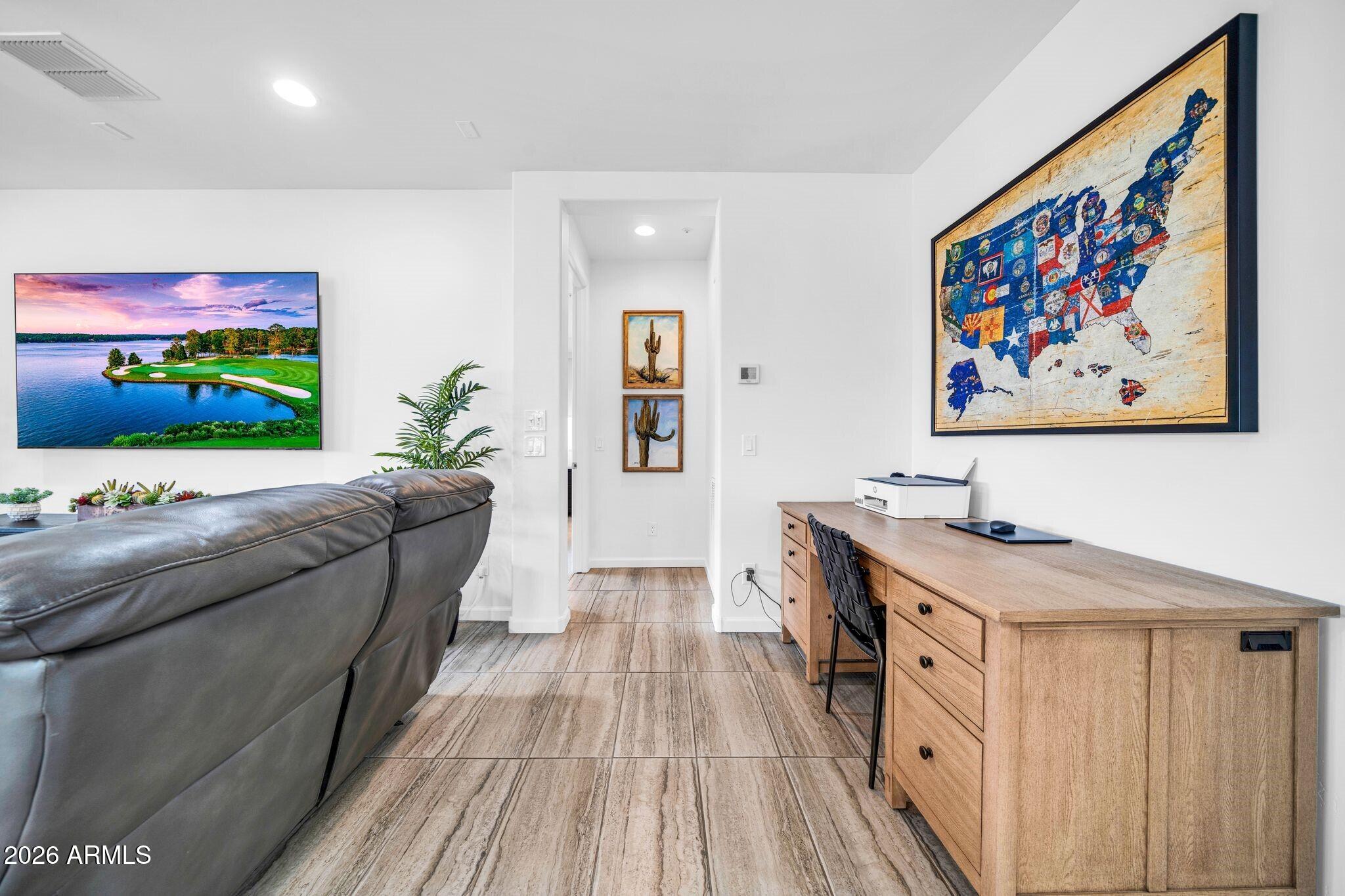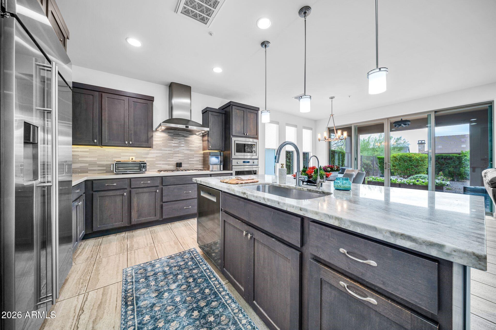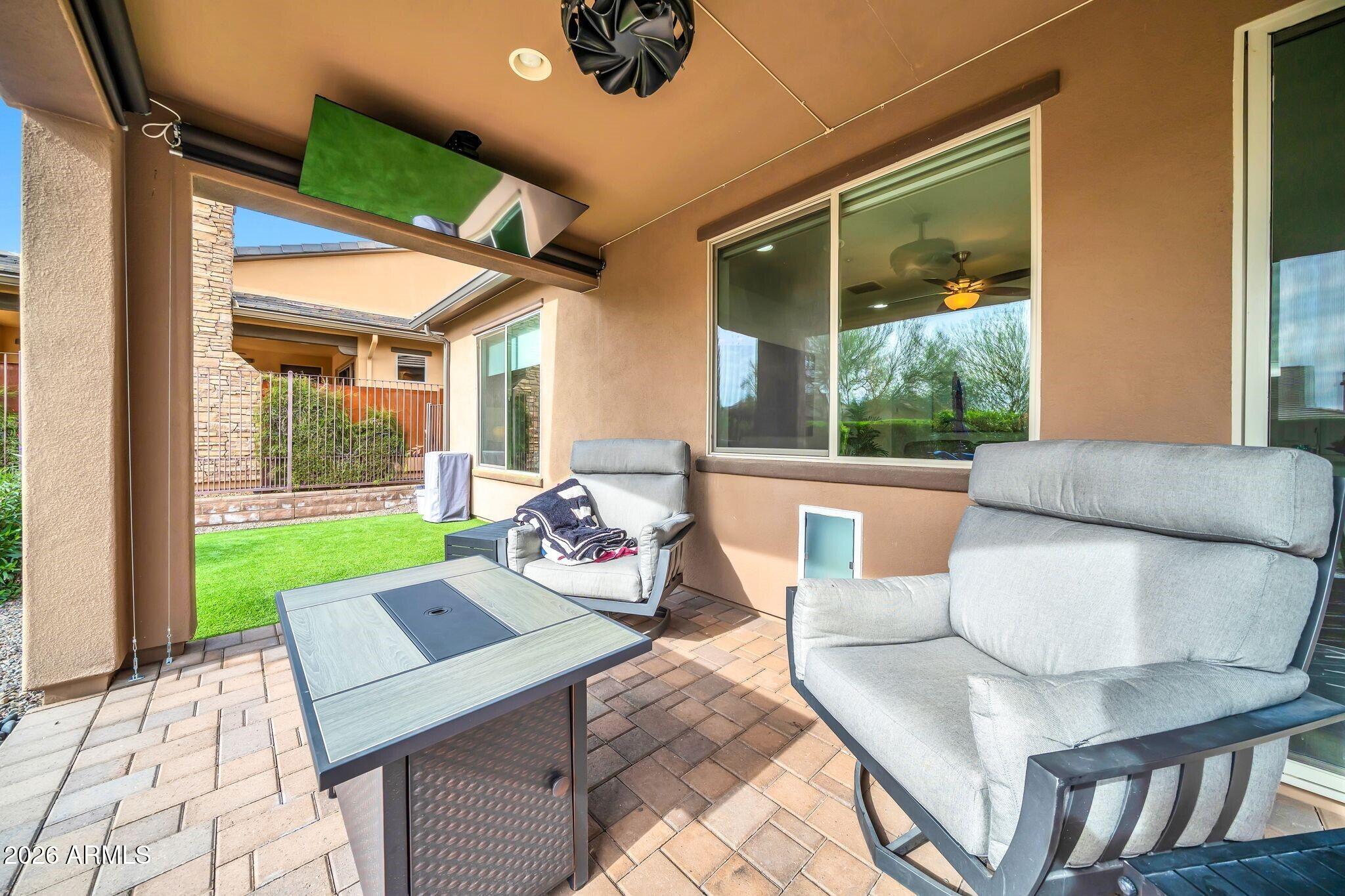 Turnkey and beautifully maintained, this home is move-in ready and is one of the best values in all of Trilogy VR. As you enter the home, the freshly painted interior (2025) offers a clean, modern feel filled with natural light. The upgraded covered patio is perfect for AZ living, featuring a retractable ceiling mounted outdoor TV, power privacy sunshades, a brand-new misting system, and ample space for relaxing & entertaining year-round. Recent improvements include new water softener, reverse osmosis & AC in garage. The kitchen features a beautiful granite kitchen island and upgraded Monogram appliances with a gas stove top. The primary suite is outfitted with a walk-in shower, double sinks with a make-up vanity, and a walk-in closet. This home is perfect for a quick move in this winter.