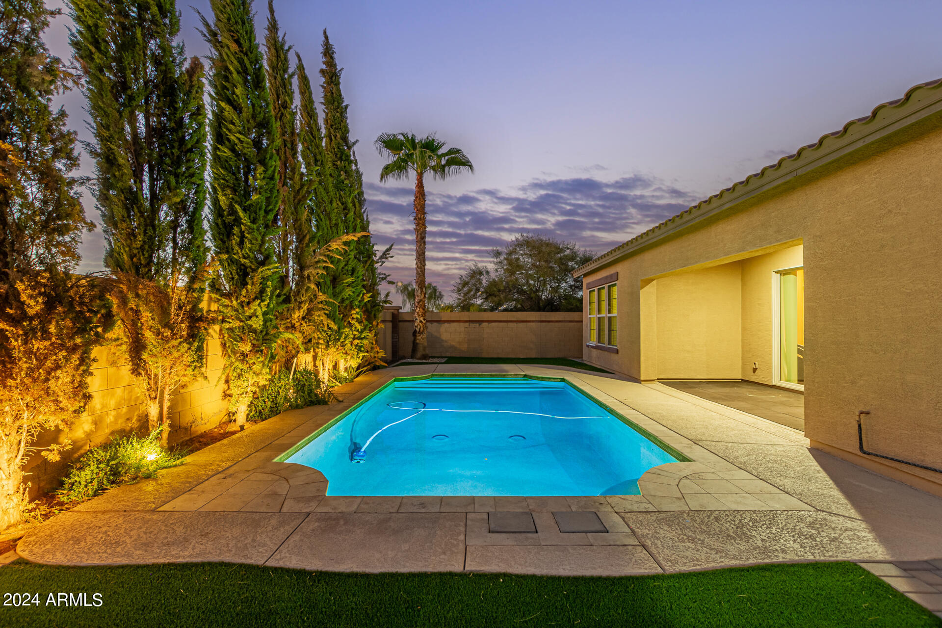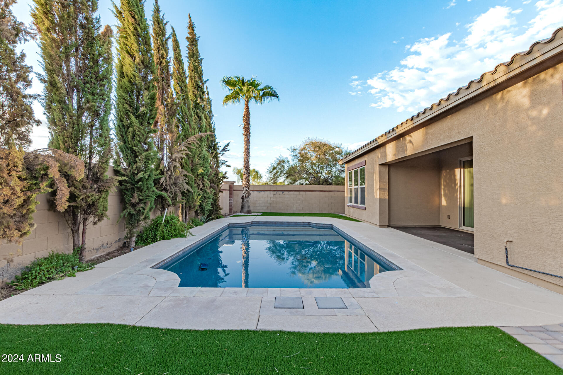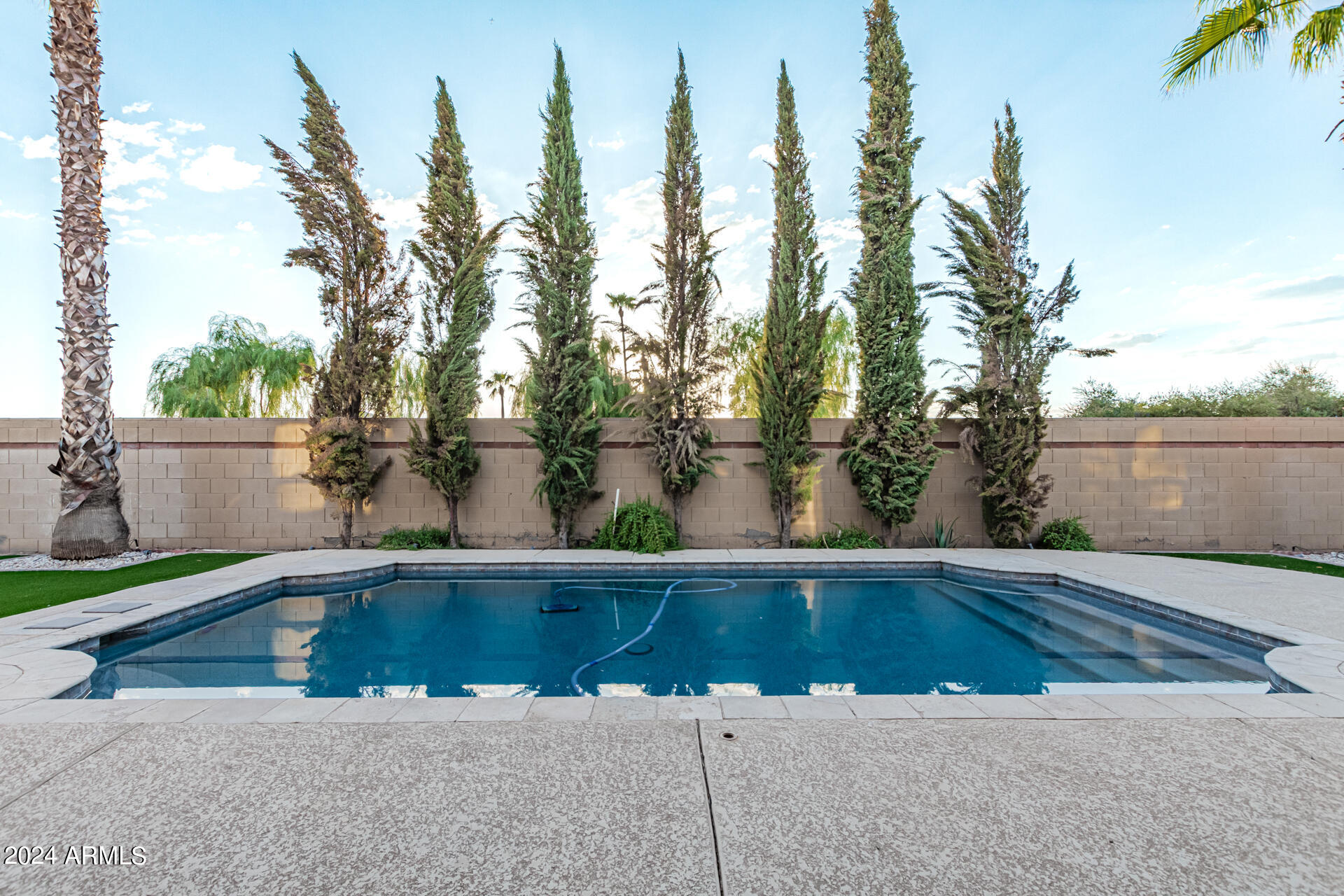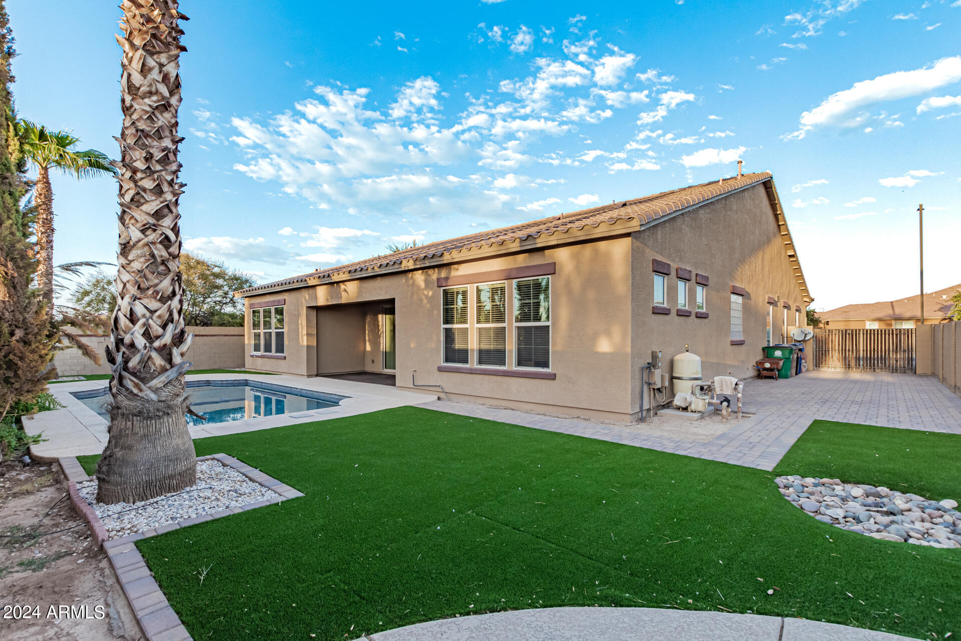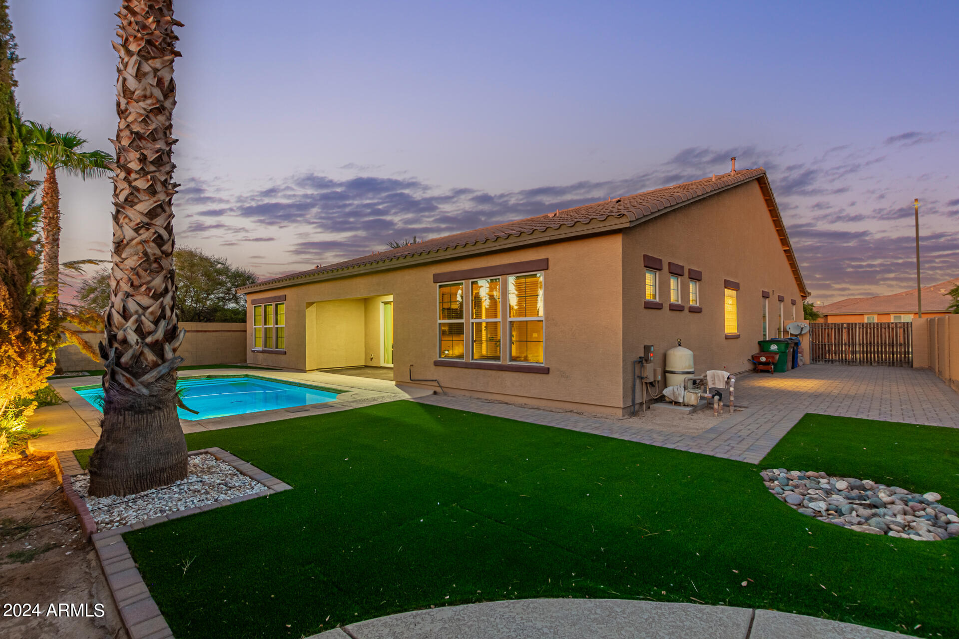 The primary suite is a true retreat, featuring a luxurious bath with a double vanity, a separate tub, and a shower. Bedroom 2 enjoys an adjoining bath, while Bedrooms 3 and 4 conveniently share a Jack-and-Jill bathroom, ensuring privacy and comfort for all. The home also includes a versatile den/ office space, perfect for working from home or relaxing. 3car The 3-car tandem garage provides plenty of room for vehicles and storage. Step outside to a beautifully landscaped, low-maintenance backyard with synthetic grass and a sparkling pool, creating a serene space to unwind. Ideally located close to shopping, freeway access (303 and I-10), and just minutes from downtown Phoenix, this home offers both convenience and luxury living.
