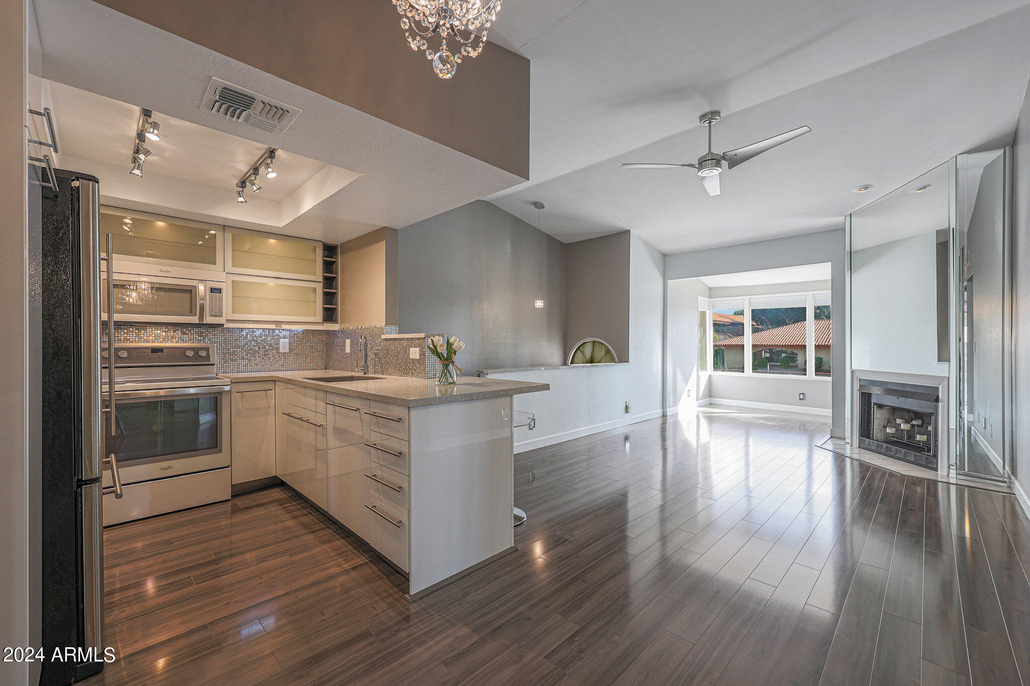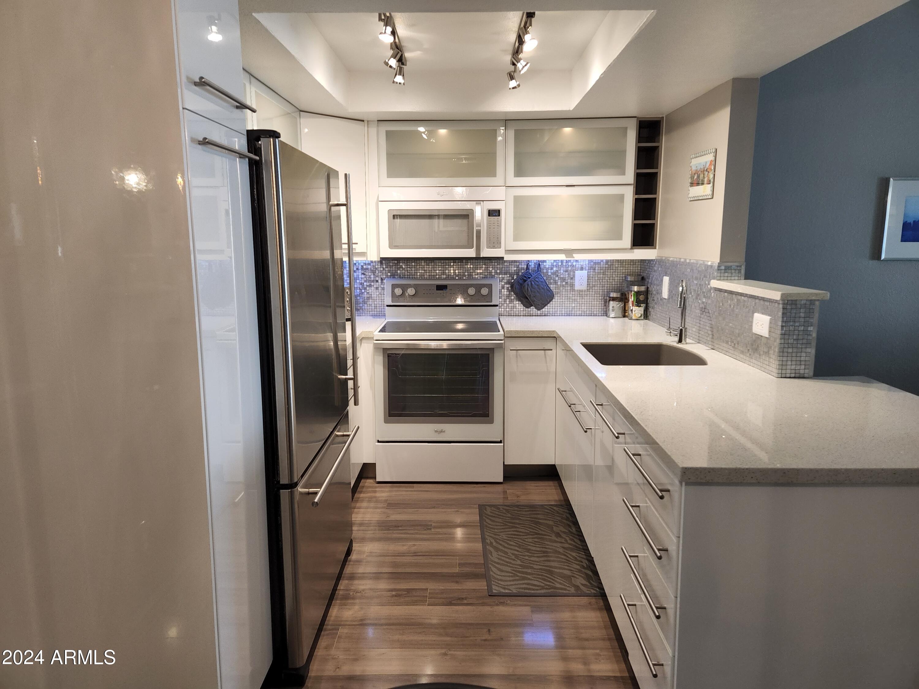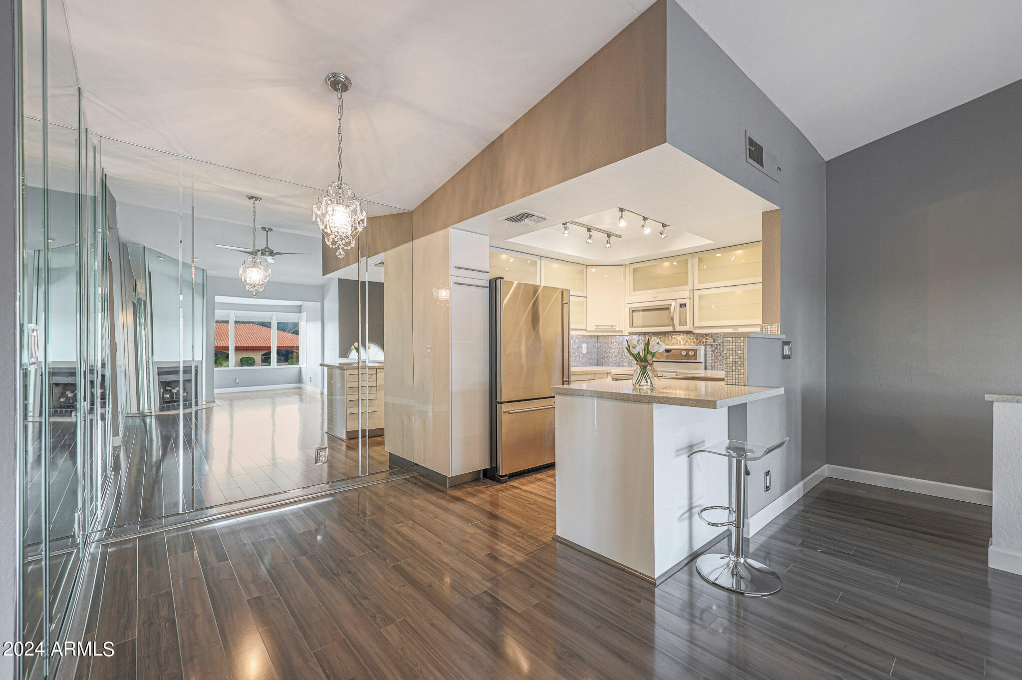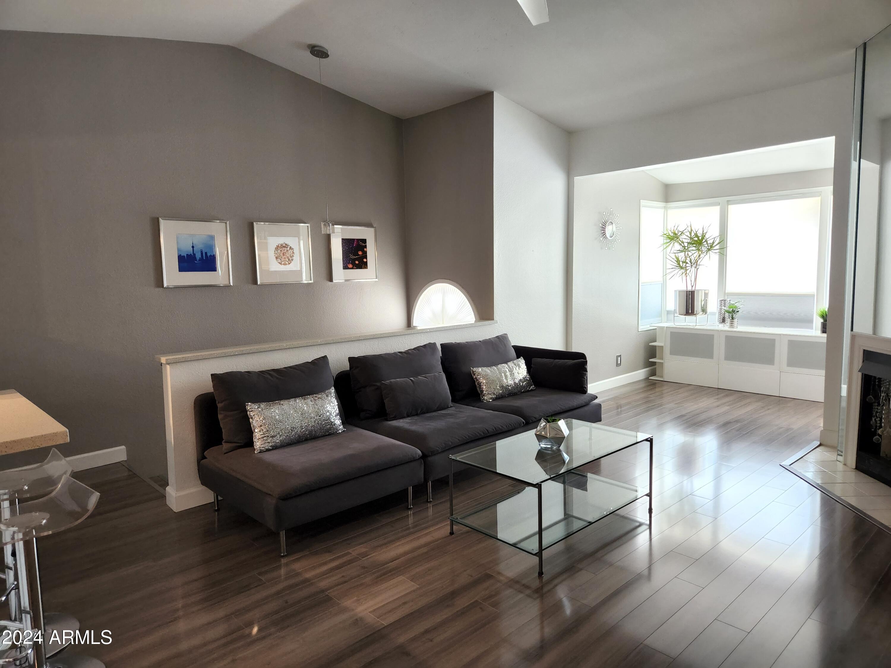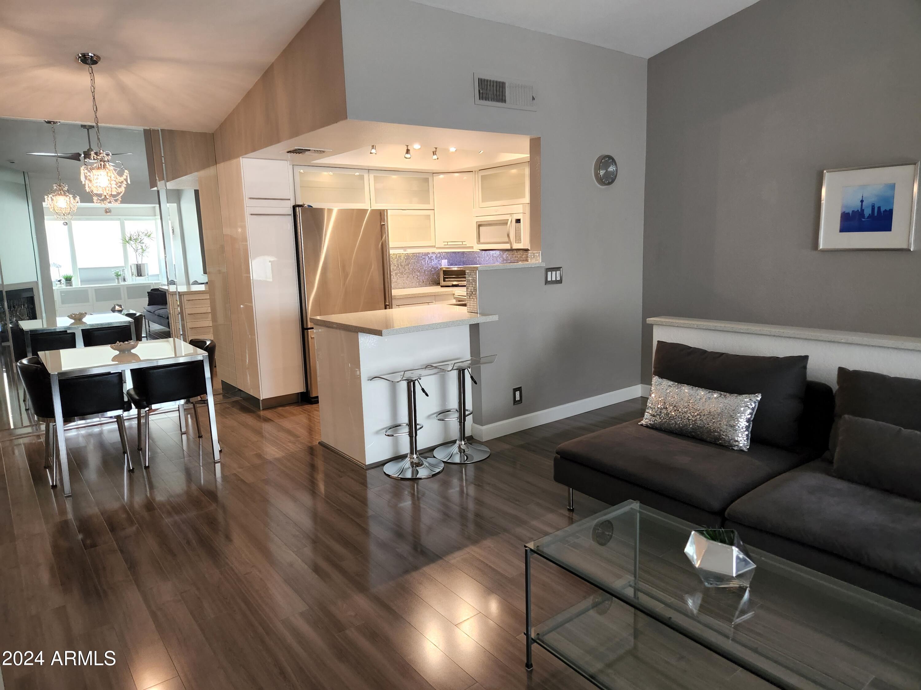 Upon entering this stylish residence, you'll immediately appreciate the custom paint that imparts a touch of personality and charm to the living space. This 1/1 features an alcove/nook/flex-space near windows for ample light and inspiration. The vaulted ceilings elevate the sense of openness. Armstrong high-gloss laminate flooring, extends seamlessly throughout, accompanied by 3.5-inch baseboards, adding a touch of sophistication to every room. The beautifully remodeled kitchen is adorned with granite Transformations Trend Stone countertops featuring ForeverSeal tm, a BLANCO SILGRANIT sink, lazy Susans, integrated cabinet lighting, and modern cabinets. The attention to detail continues into the full bath remodel, boasting a custom sliding door, a modern bathtub, Granite Transformations Trend Stone shower walls, stainless + polished steel penny round tile extending to the ceiling, a shower rail with high-end Grohe fixtures + hand wand.