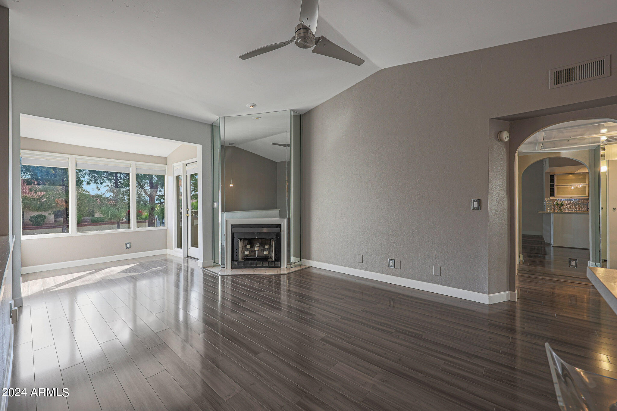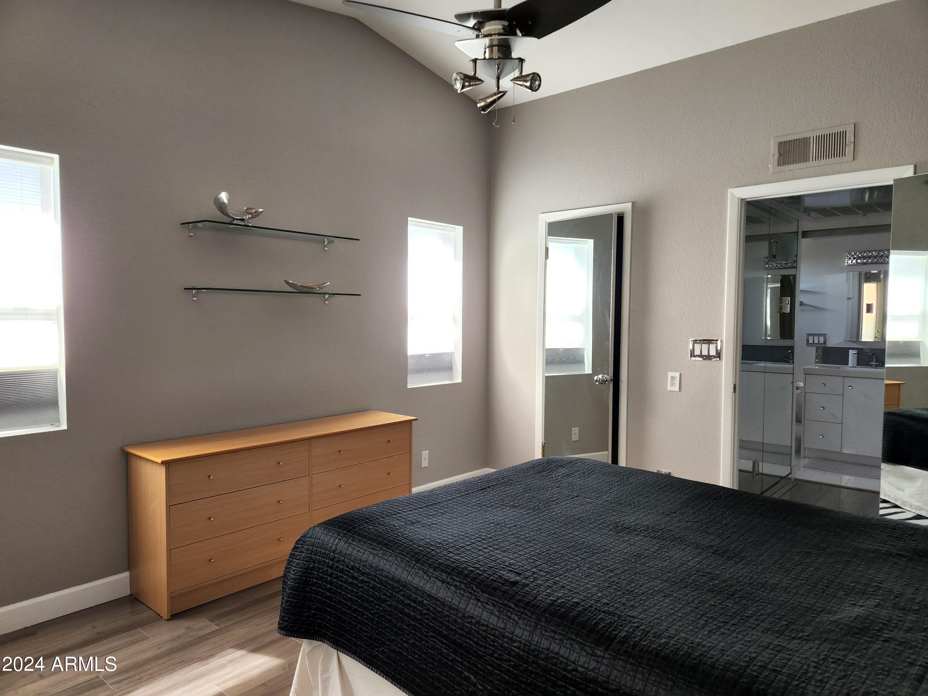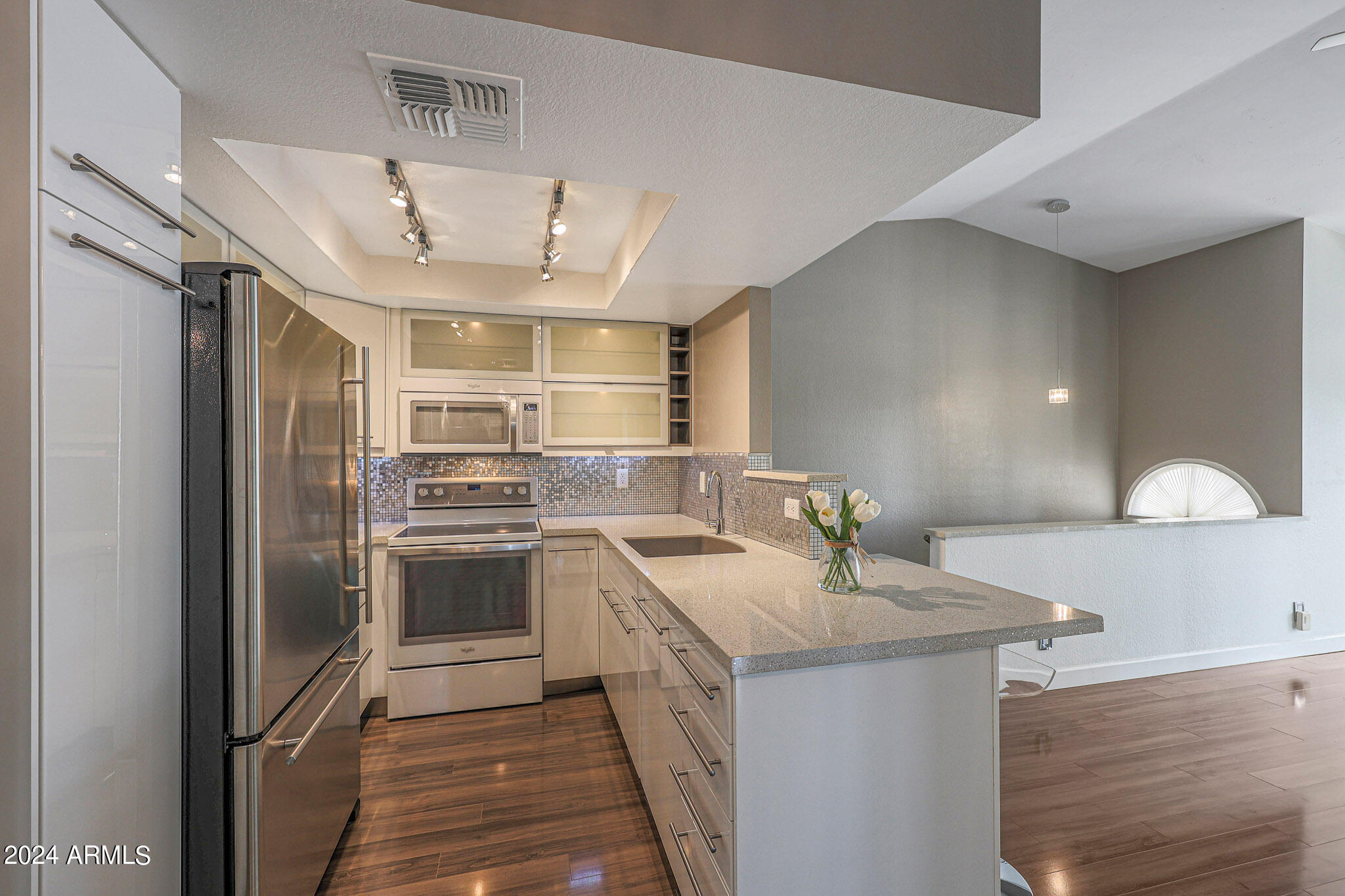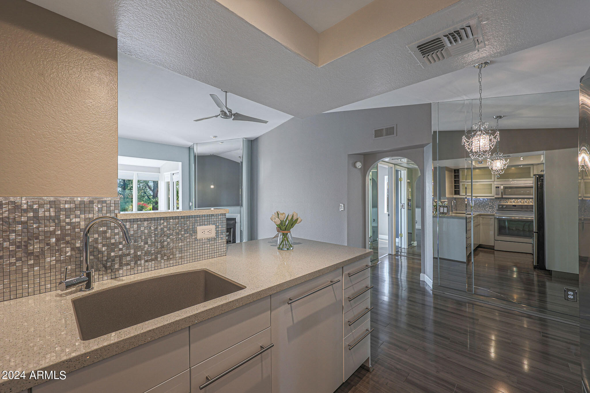 Upon entering this stylish residence, you'll immediately appreciate the custom paint that imparts a touch of personality and charm to the living space. This 1/1 features an alcove/nook/flex-space near windows for ample light and inspiration. The vaulted ceilings elevate the sense of openness. Armstrong high-gloss laminate flooring, extends seamlessly throughout, accompanied by 3.5-inch baseboards, adding a touch of sophistication to every room. The beautifully remodeled kitchen is adorned with granite Transformations Trend Stone countertops featuring ForeverSeal tm, a BLANCO SILGRANIT sink, lazy Susans, integrated cabinet lighting, and modern cabinets. The attention to detail continues into the full bath remodel, boasting a custom sliding door, a modern bathtub, Granite Transformations Trend Stone shower walls, stainless + polished steel penny round tile extending to the ceiling, a shower rail with high-end Grohe fixtures + hand wand.