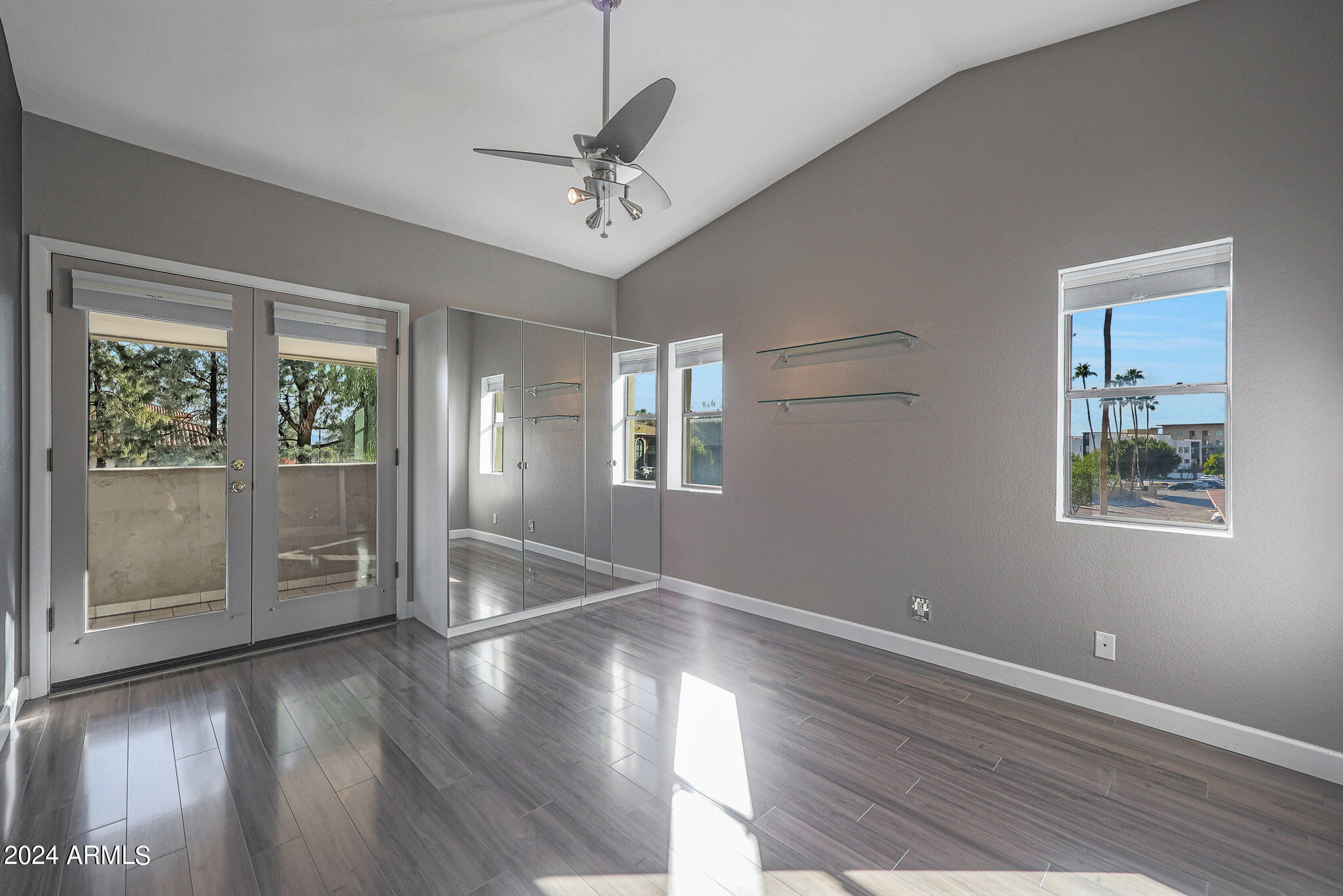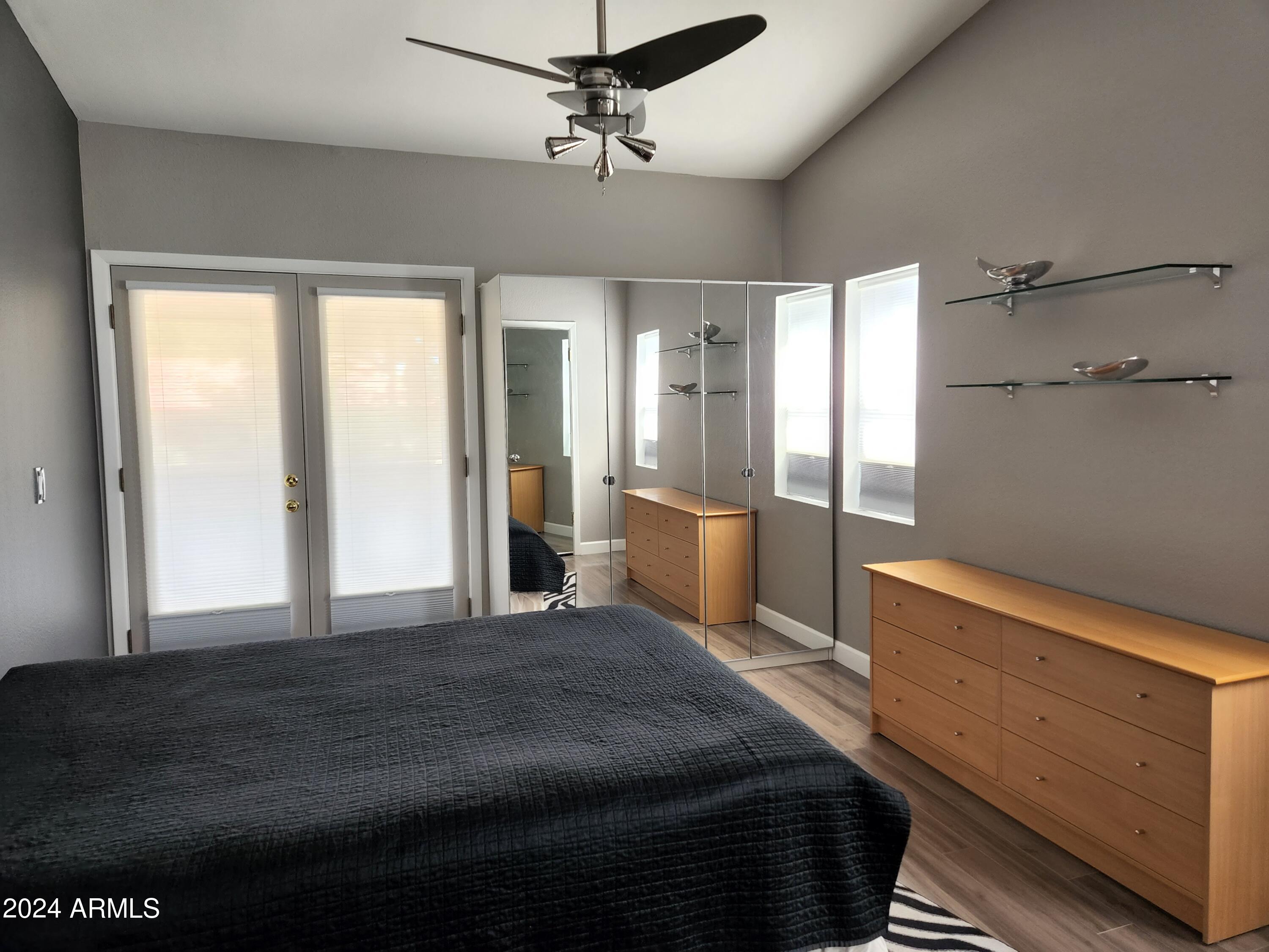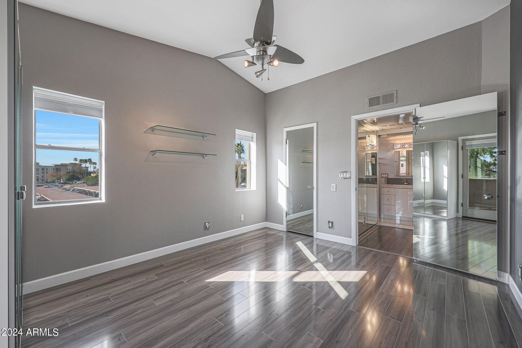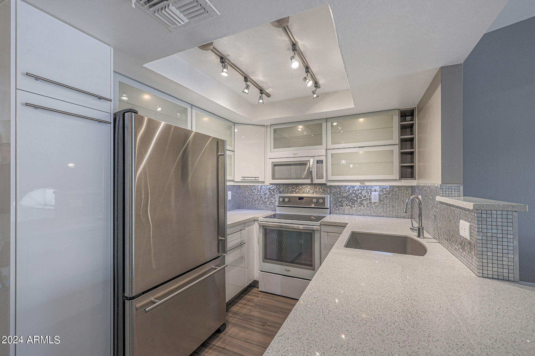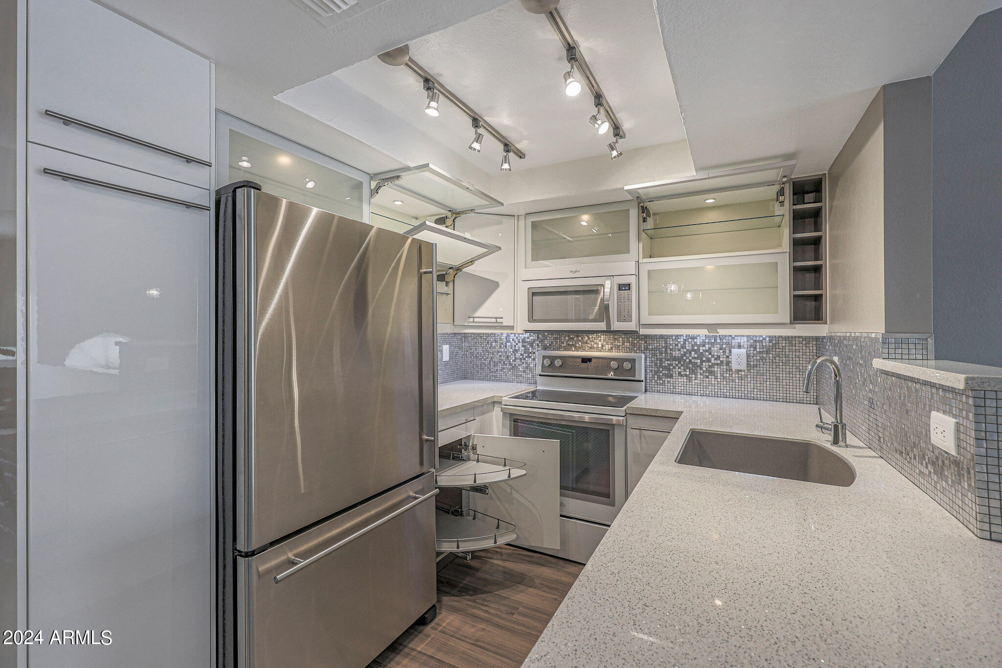 Upon entering this stylish residence, you'll immediately appreciate the custom paint that imparts a touch of personality and charm to the living space. This 1/1 features an alcove/nook/flex-space near windows for ample light and inspiration. The vaulted ceilings elevate the sense of openness. Armstrong high-gloss laminate flooring, extends seamlessly throughout, accompanied by 3.5-inch baseboards, adding a touch of sophistication to every room. The beautifully remodeled kitchen is adorned with granite Transformations Trend Stone countertops featuring ForeverSeal tm, a BLANCO SILGRANIT sink, lazy Susans, integrated cabinet lighting, and modern cabinets. The attention to detail continues into the full bath remodel, boasting a custom sliding door, a modern bathtub, Granite Transformations Trend Stone shower walls, stainless + polished steel penny round tile extending to the ceiling, a shower rail with high-end Grohe fixtures + hand wand.