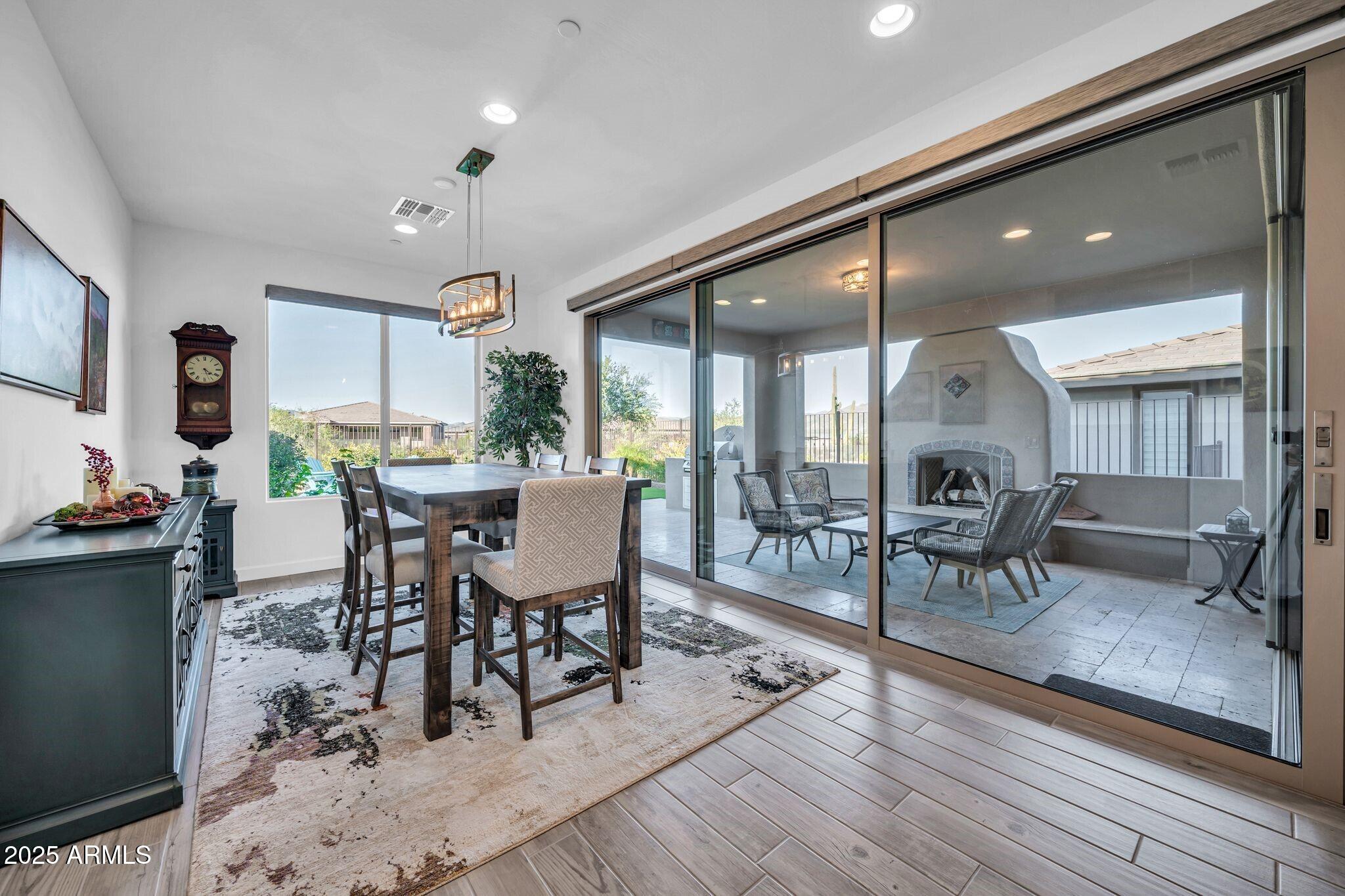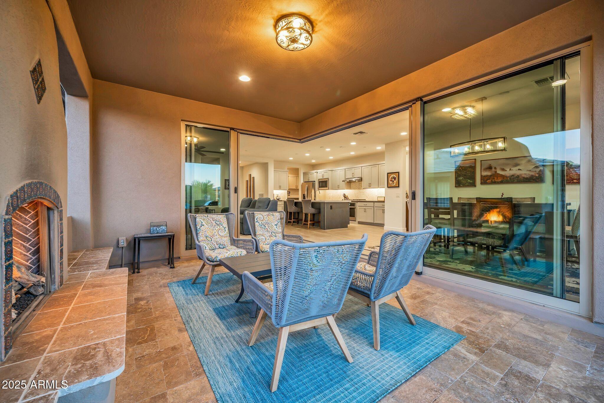 THIS BEAUTIFUL MOUNTAIN VIEW NICE MODEL HOME WAS TASTEFULLY DESIGNED WITH INDOOR/OUTDOOR LIVING IN MIND. The charming Spanish exterior gives way to a vibrant desert contemporary floor plan with upgraded corner sliding glass doors to the covered patio. Spend sunsets on the extended patio taking in incredible mountain views and then retreat to the covered patio to sit around the custom adobe fireplace. Come inside to the beautiful kitchen outfitted w/ a gas cooktop, Blanco sink and a large kitchen island. This popular floor plan opens to the great room and custom bar w/ wine fridge in the adjacent den/office. Other upgrades include custom window treatments throughout, a built-in gas grill, custom fans, smart space laundry room w/ built-in desks, premium landscape lighting and so much more.