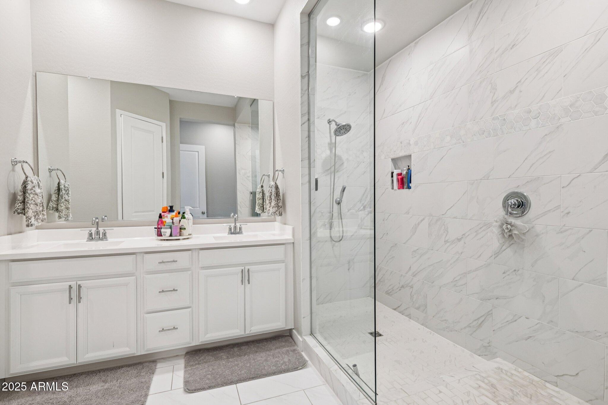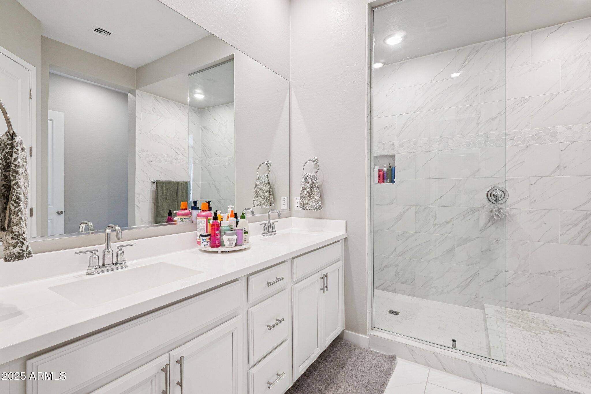 Whirlpool stainless appliances, pendant lighting, under-cabinet accents, and a walk-in pantry. Upgrades throughout include spa-style tiled primary shower, designer fixtures, custom blinds, and energy-efficient spray foam insulation