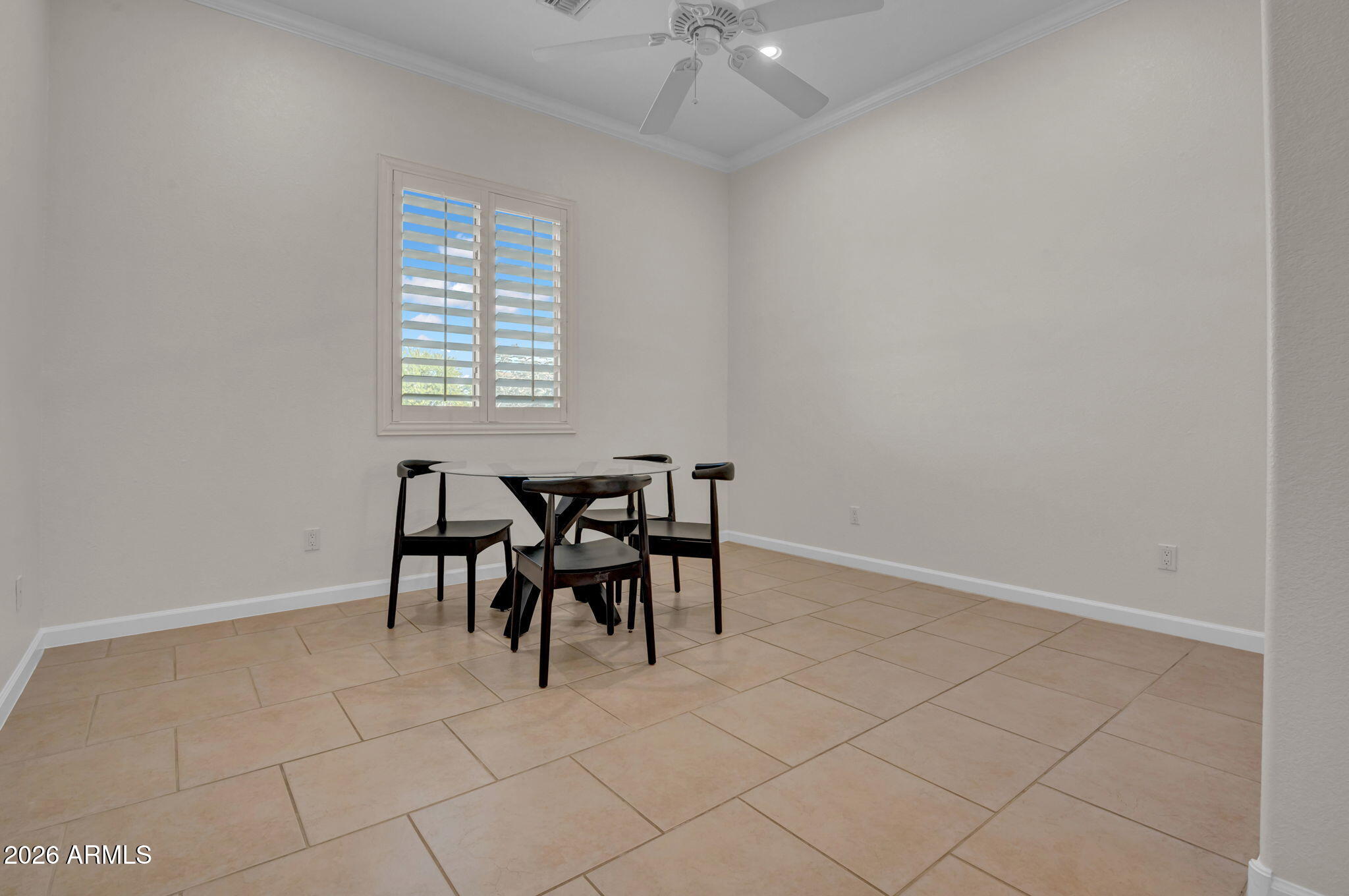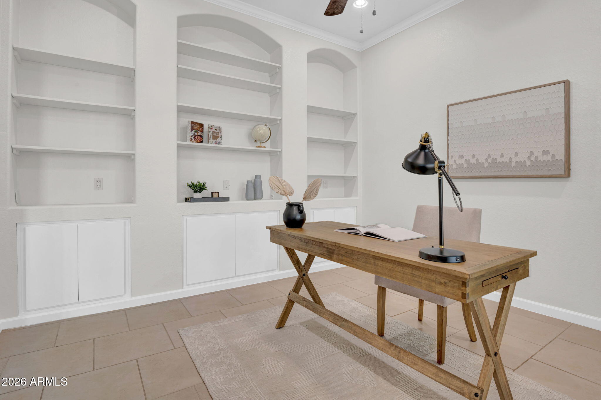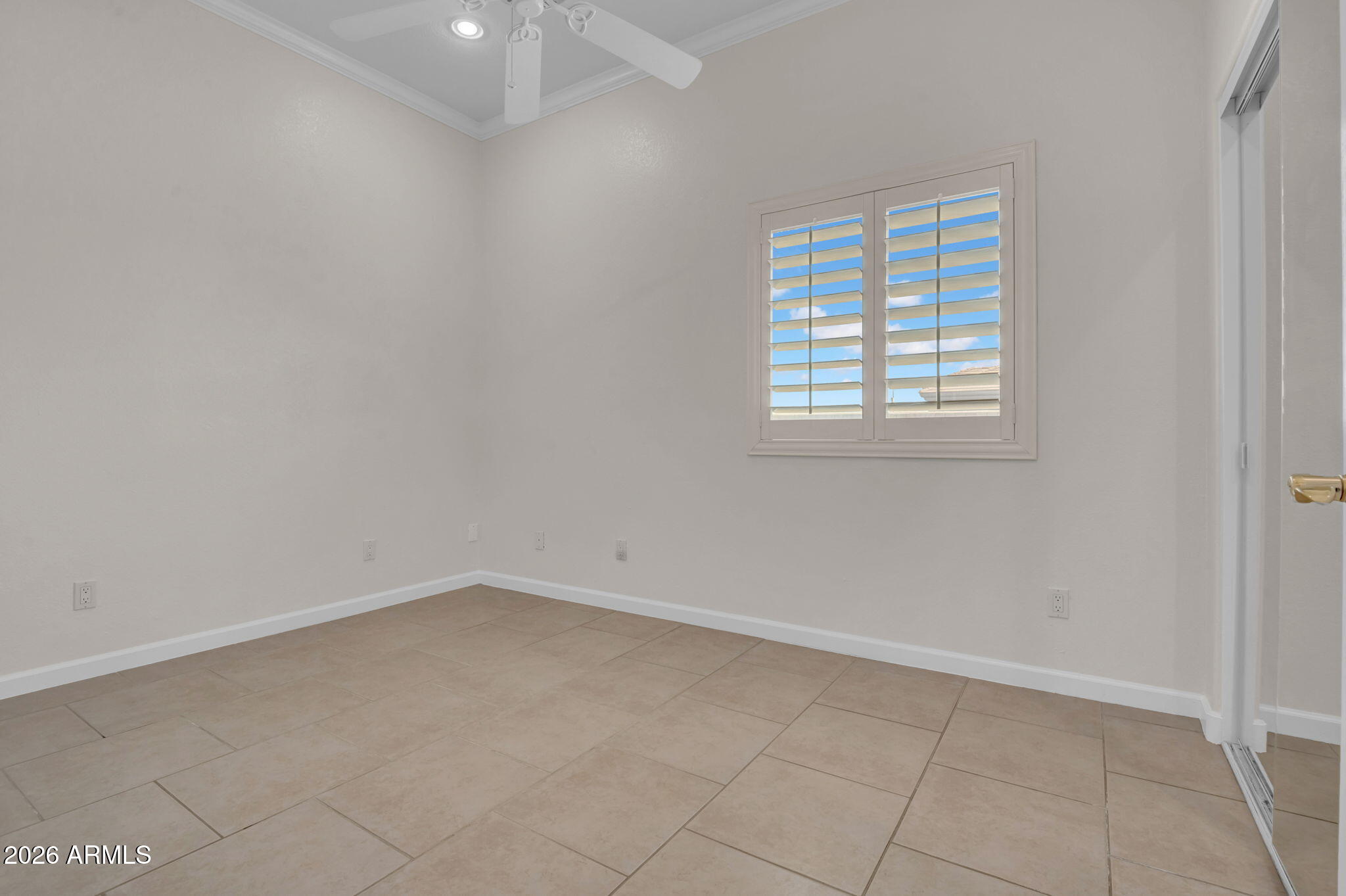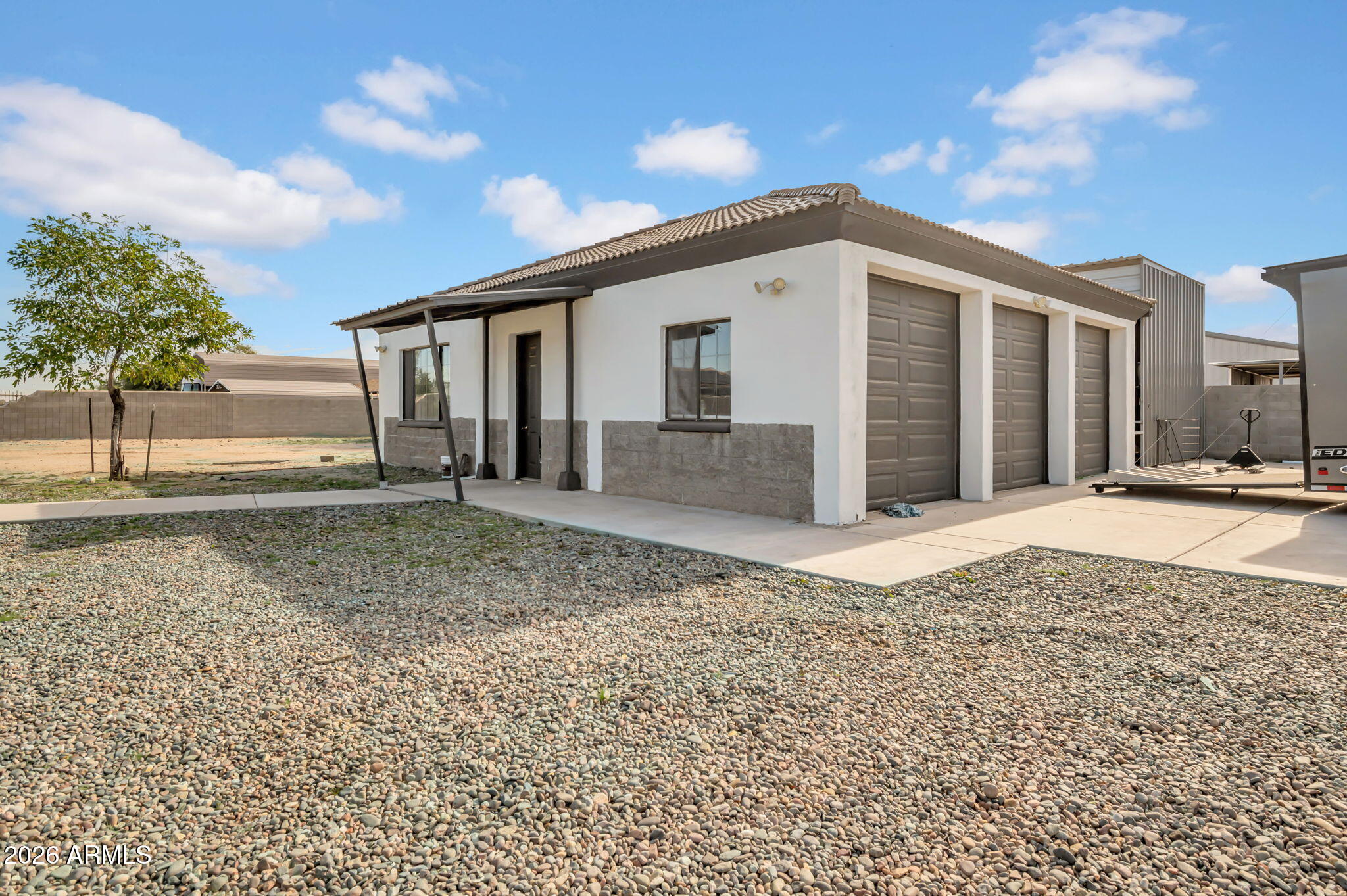 Conveniently located near I-10 and Loop 303, this custom-built home sits on over an acre and offers an incredible layout. The home features 4 bedrooms, an office/den, a split floor plan, 3 bathrooms, and two primary suites. Interior features include 10-foot ceilings, crown molding, tile flooring throughout, custom cabinetry, and plantation shutters. The attached 2-car garage is complemented by an additional 3.5-car air-conditioned garage/workshop with a large storage room and its own bathroom, offering exceptional flexibility for hobbies or workspace needs. A covered RV garage further enhances the property's functionality. The expansive lot features built-in garden, flower beds, mature trees, and a cozy extended covered patio. Don't miss your opportunity to call this house ''home''.