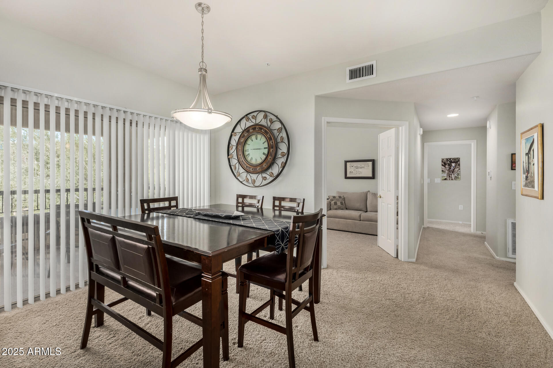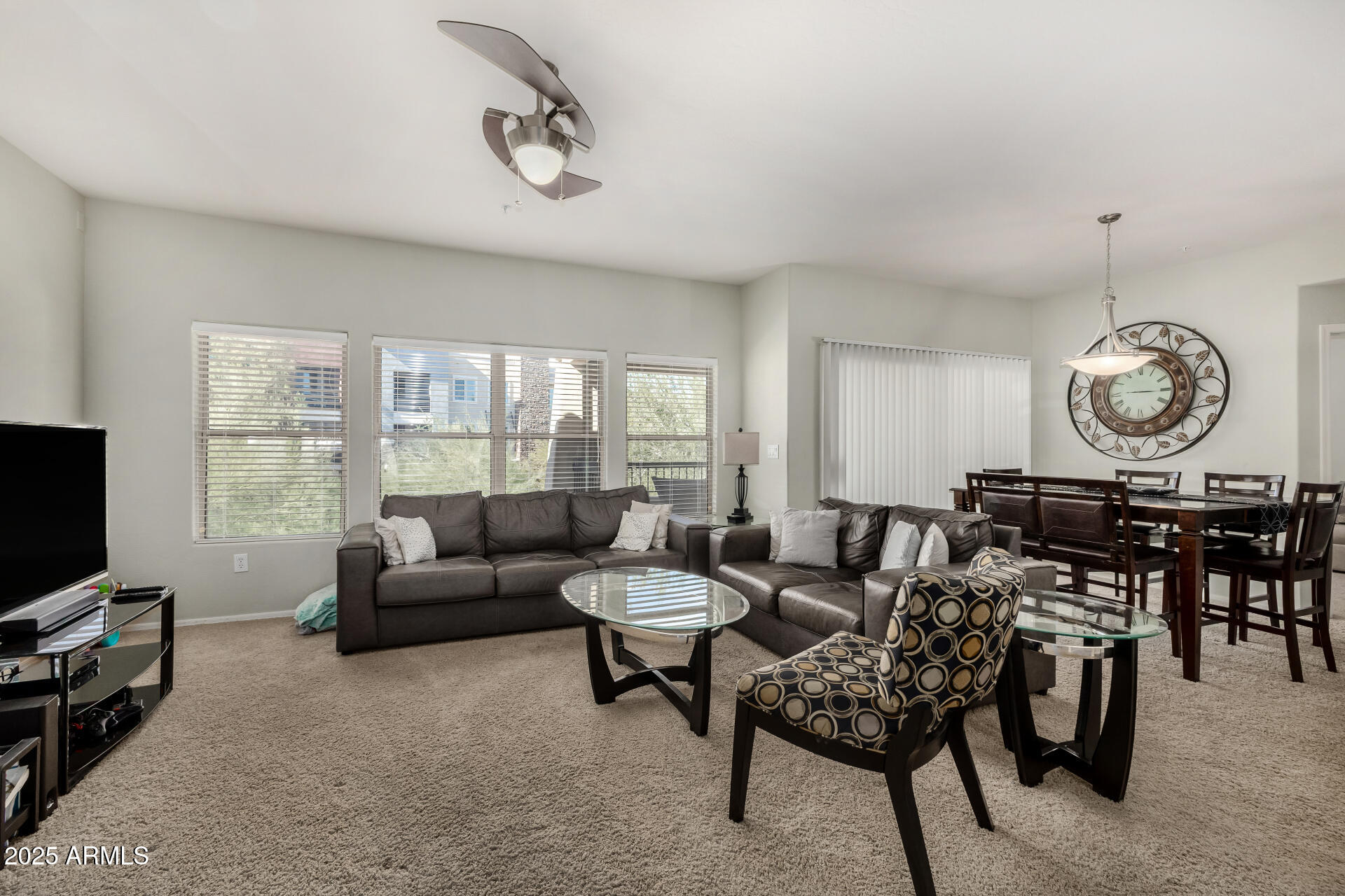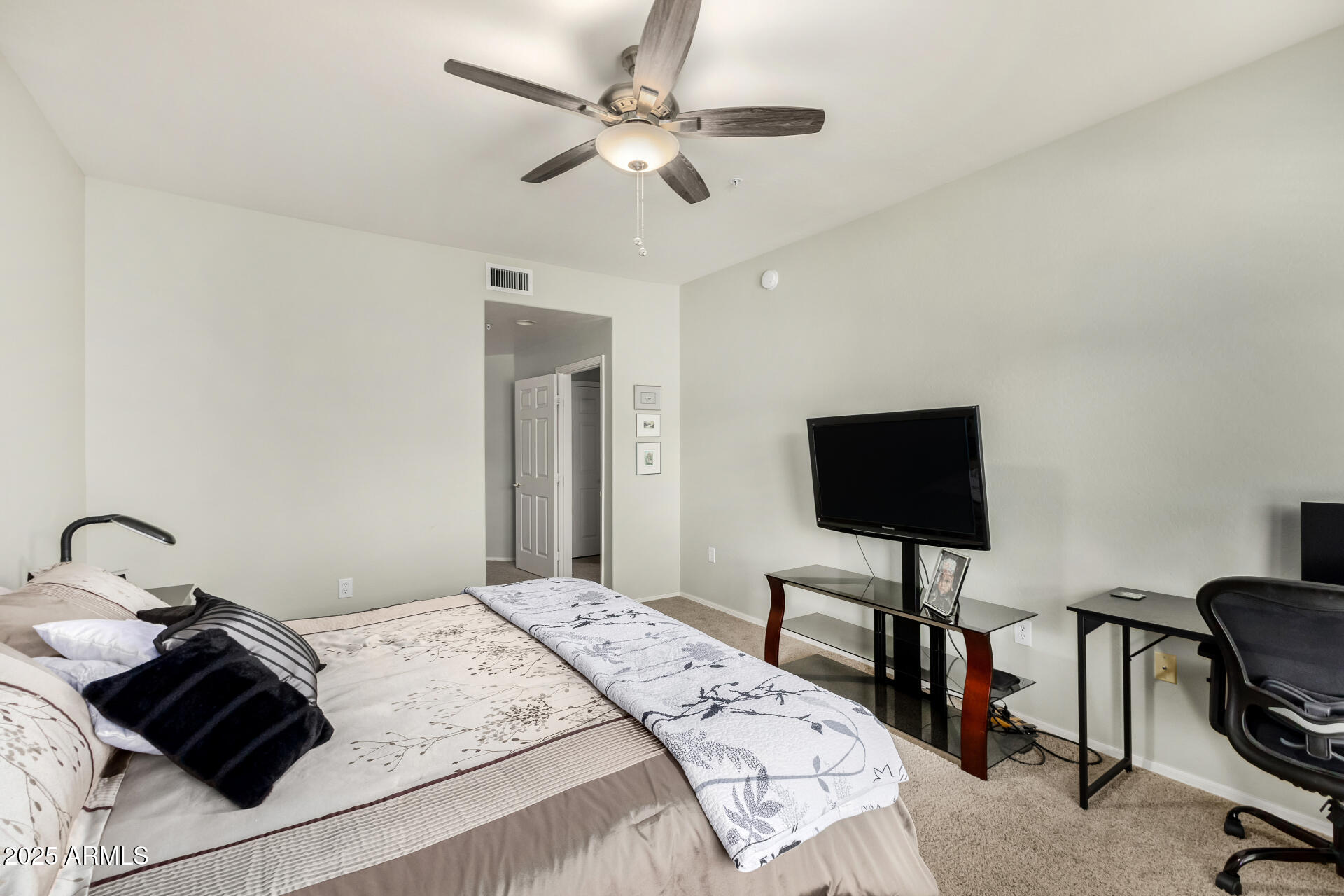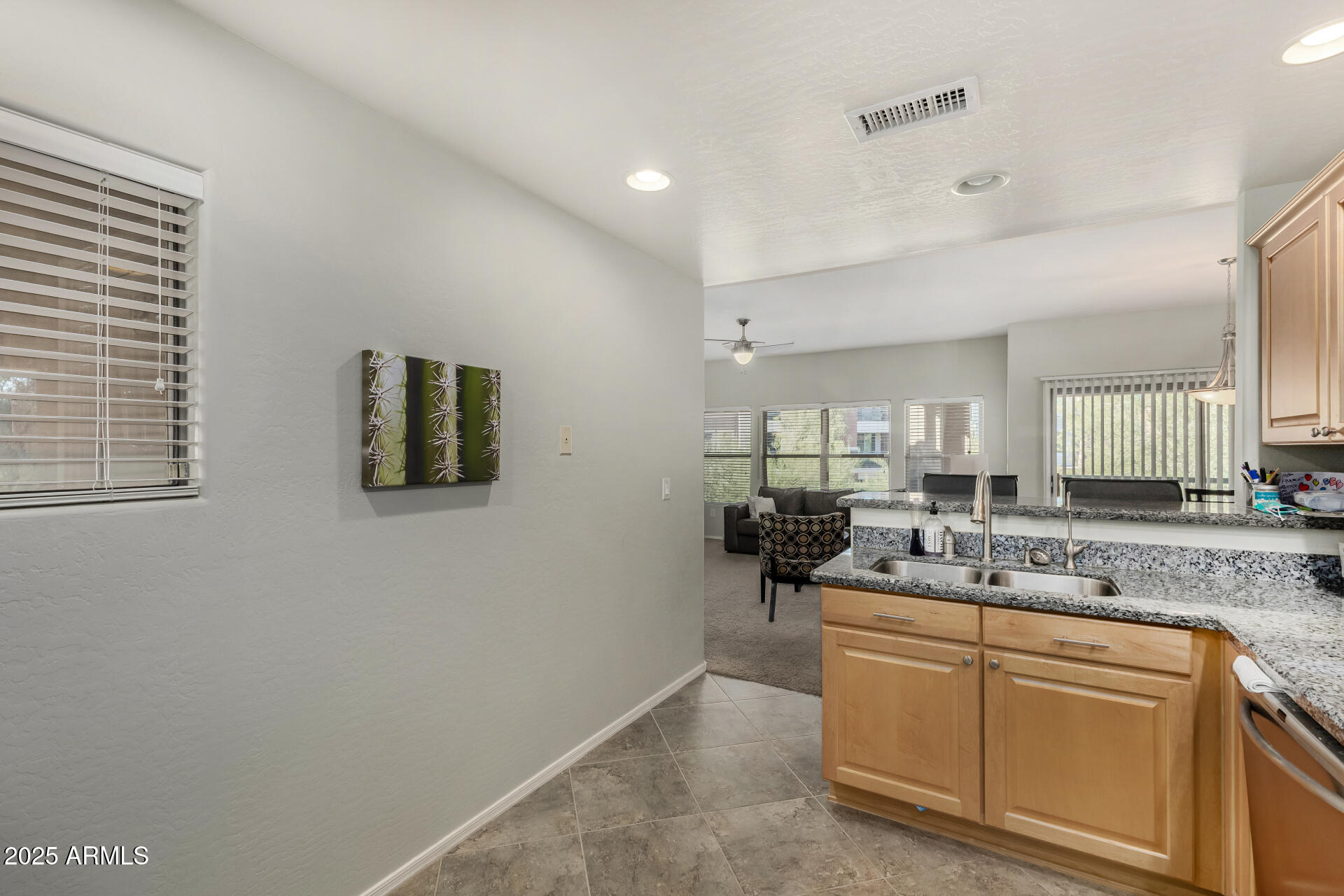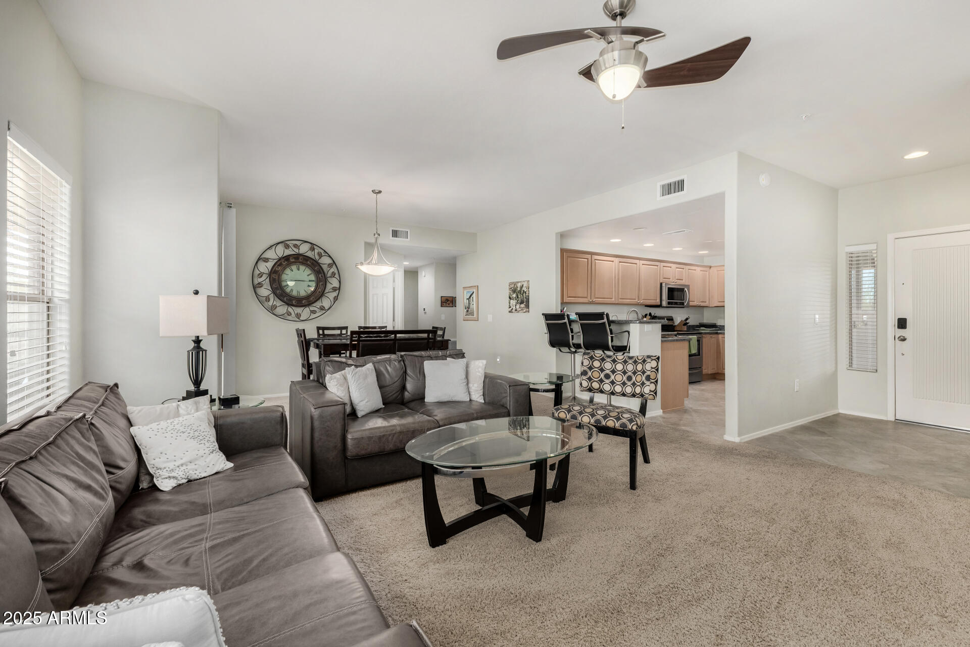 Fantastic opportunity to own this lovely apartment unit in the Village at Grayhawk! Discover a serene living room with high ceilings, a soothing palette, blinds, soft carpeting, and an inviting fireplace for intimate evenings with loved ones. The well-appointed kitchen comes with granite counters, ample wood cabinetry with crown moulding, recessed lighting, stainless steel appliances, and a two-tier peninsula with a breakfast bar. You'll also find a den ideal for an office or a lounge. The cozy main bedroom includes an ensuite with double sinks and a convenient walk-in closet. Unwind on the balcony, offering tranquil views of the surroundings. The Community boasts walking/biking paths, lush greenbelts, a refreshing pool, and more. Don't miss out on this one! Can be sold fully furnished Third bedroom does NOT have a closet.