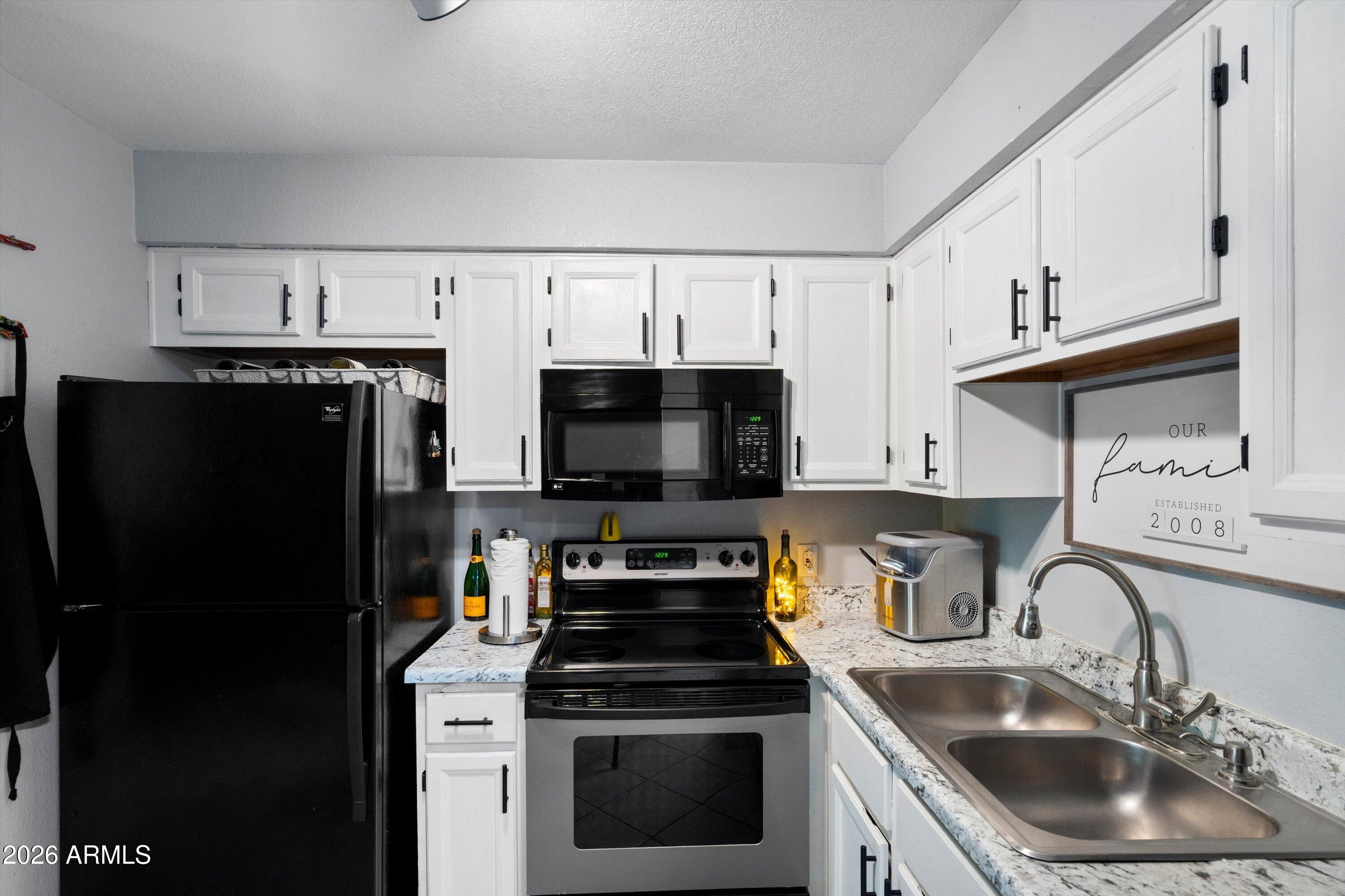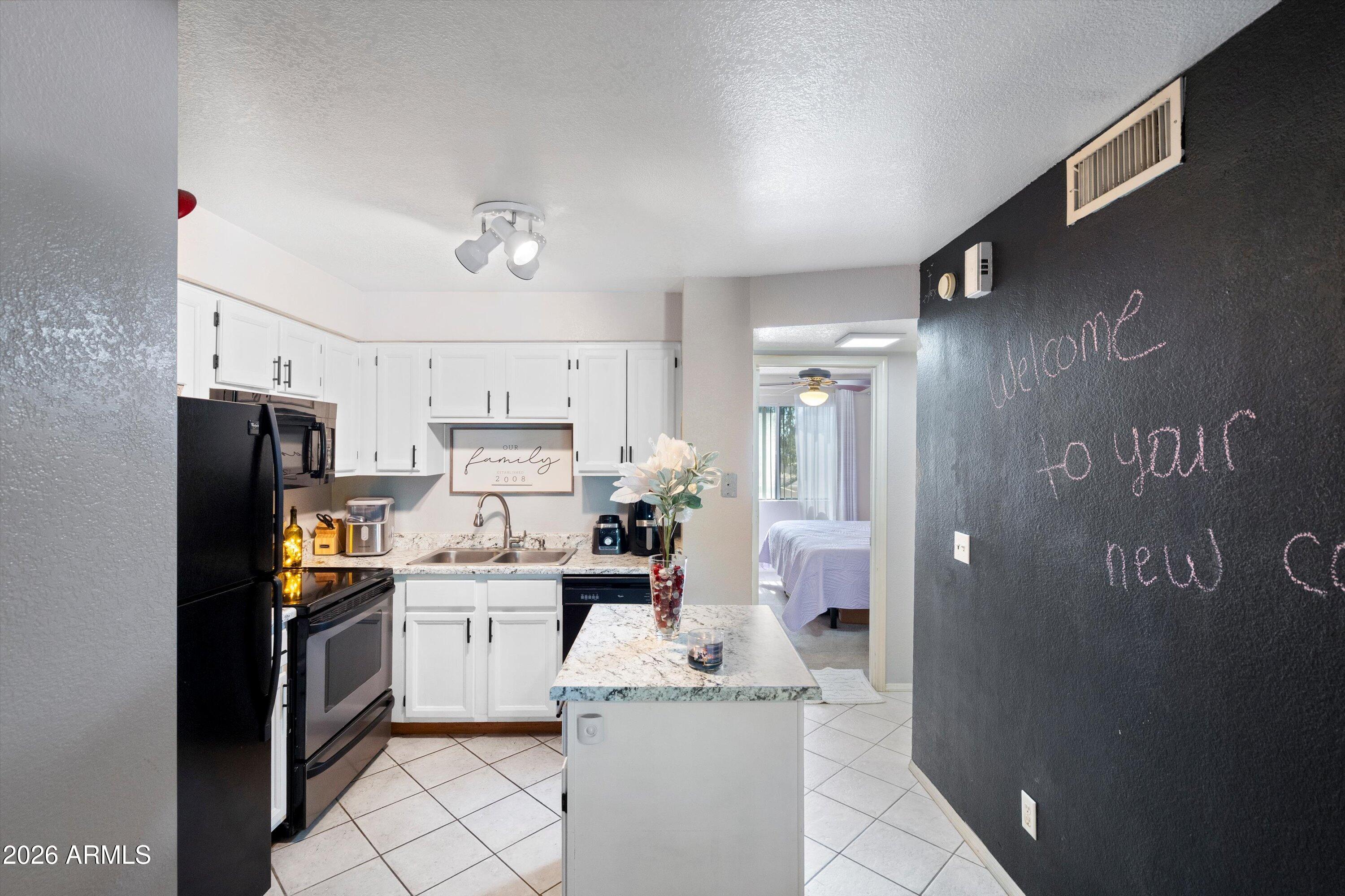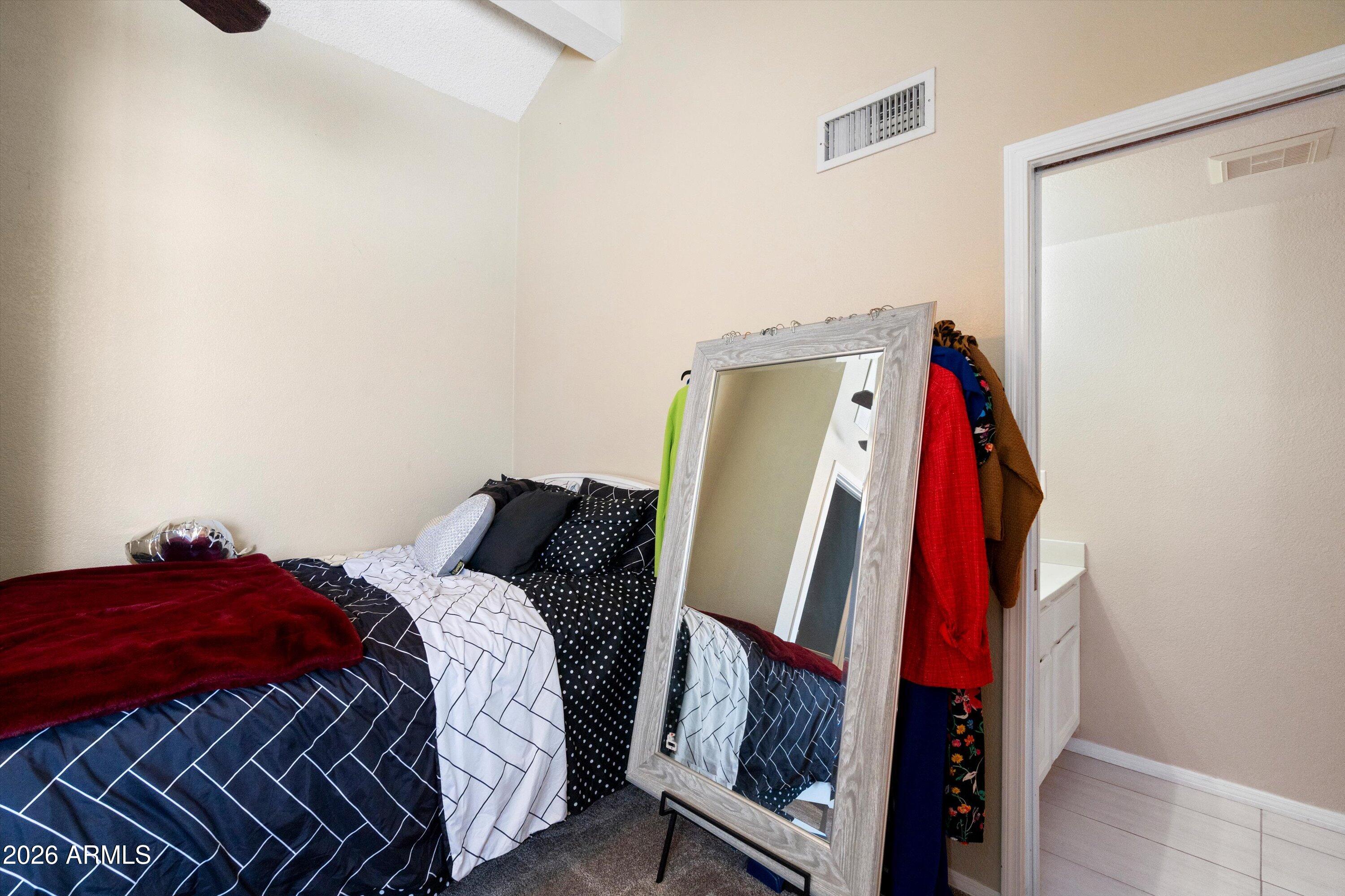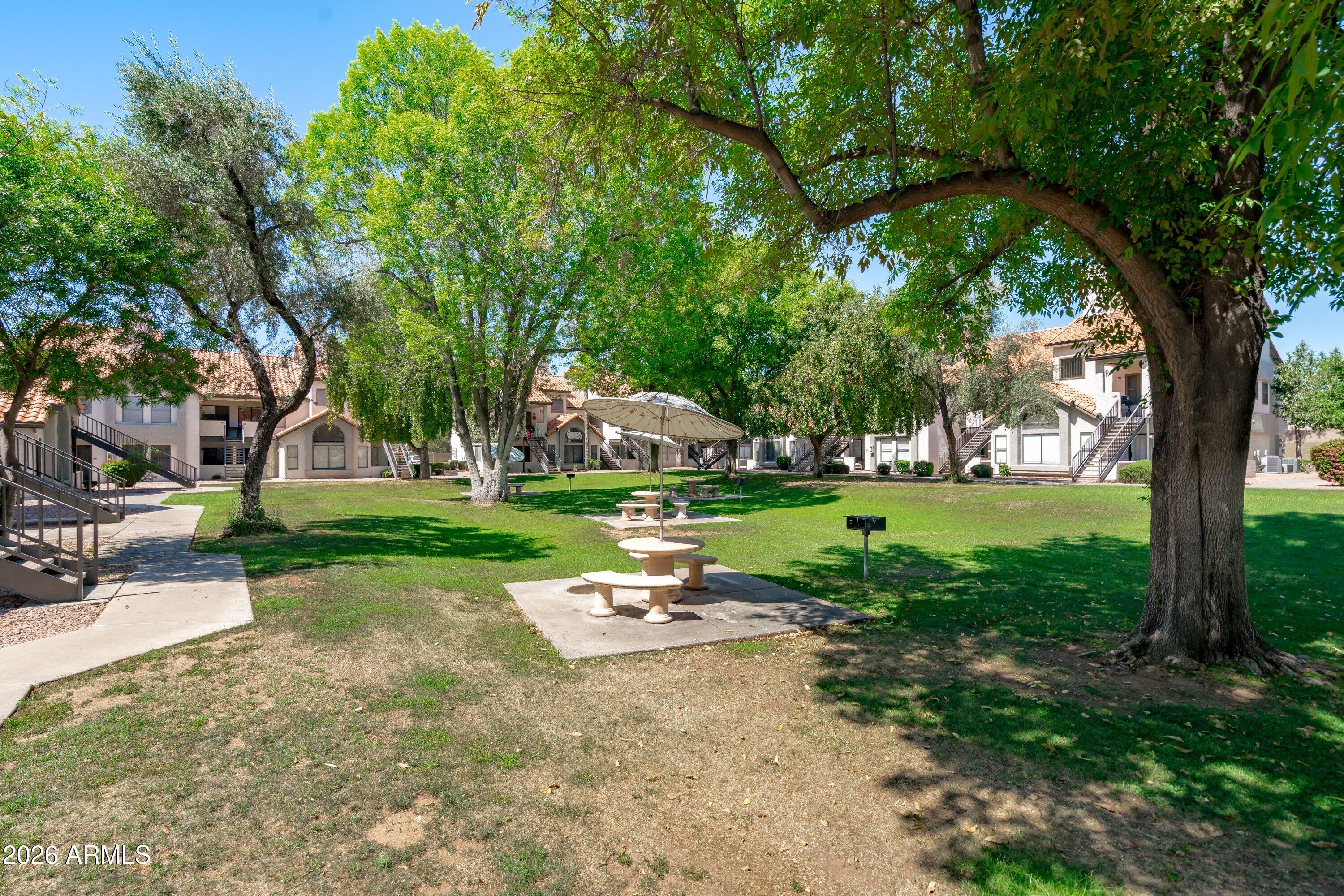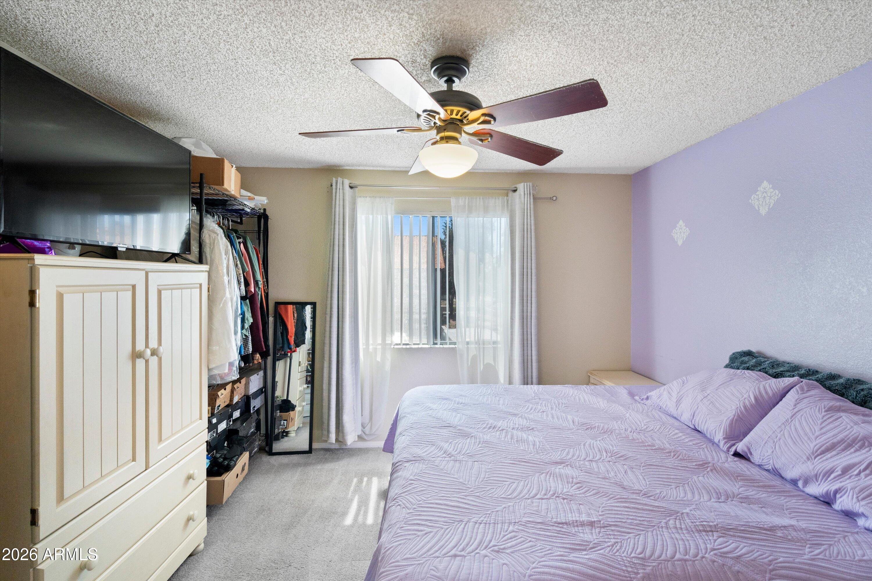 Beautiful two-bedroom condo offering a rare blend of style, comfort, and convenience with easy access to Loop 101. This home features soaring ceilings, an open floor plan, and an elegant circular staircase leading to the second bedroom. The kitchen includes all appliances and opens to the main living area, where a cozy corner fireplace adds warmth and ambiance. The primary bedroom is located on the main level, and unlike many units, this one offers a true second bedroom upstairs rather than a loft. Enjoy views of the lush greenbelt and mature trees, just steps from the community pool and spa. Additional features include a one-car garage, in-unit laundry, decorator paint, newer ceiling fans, and a professionally refinished bathtub, making this home move-in ready.