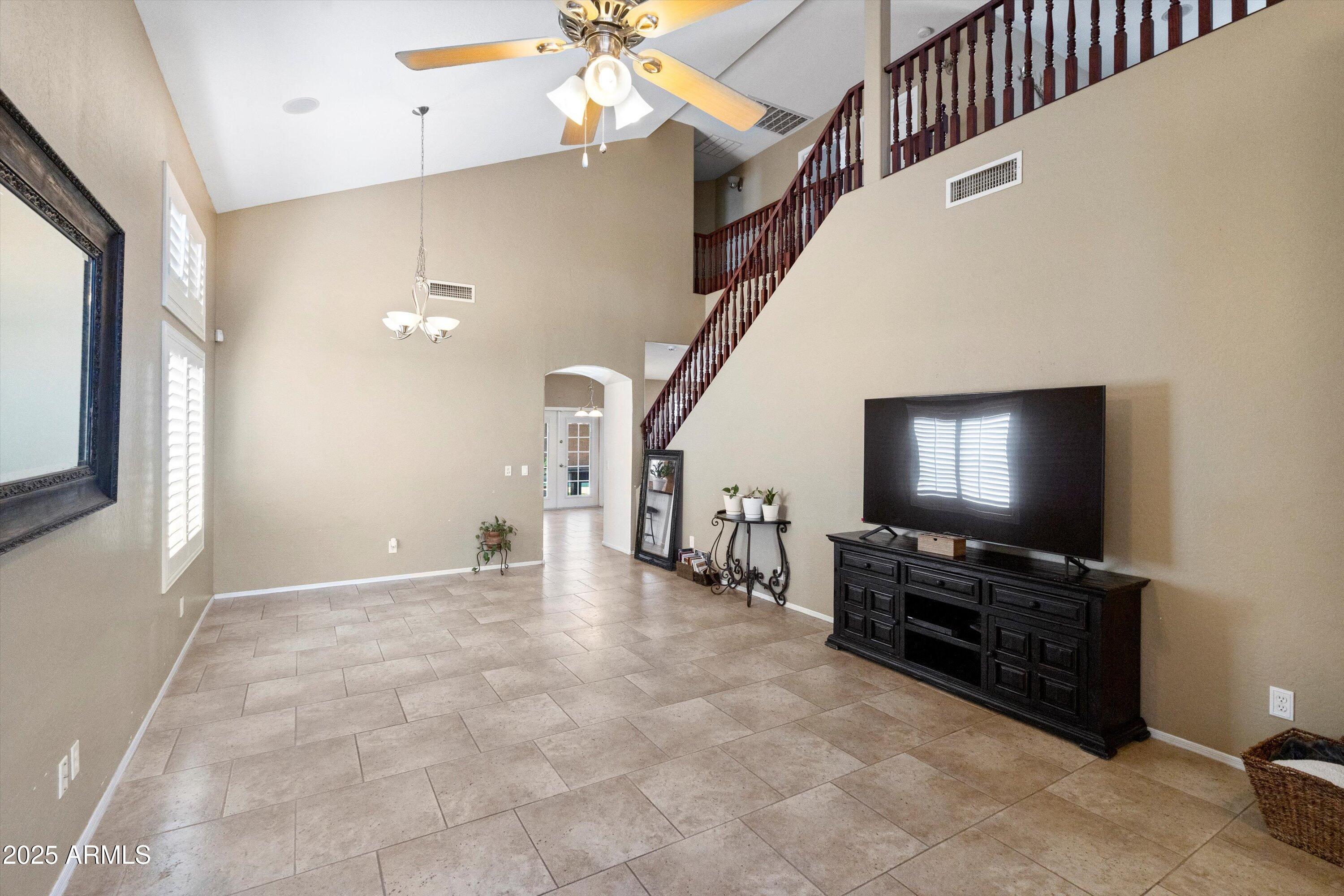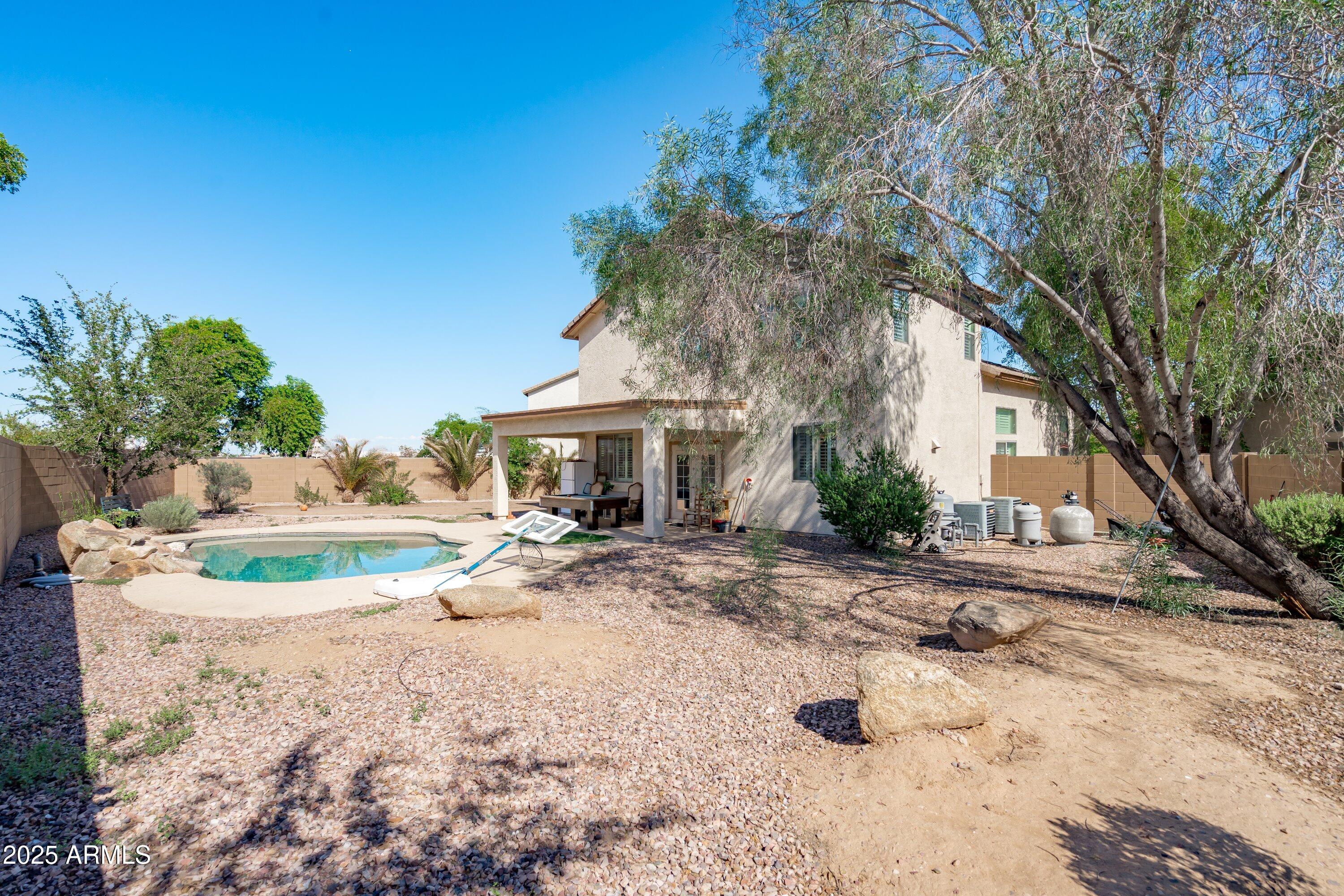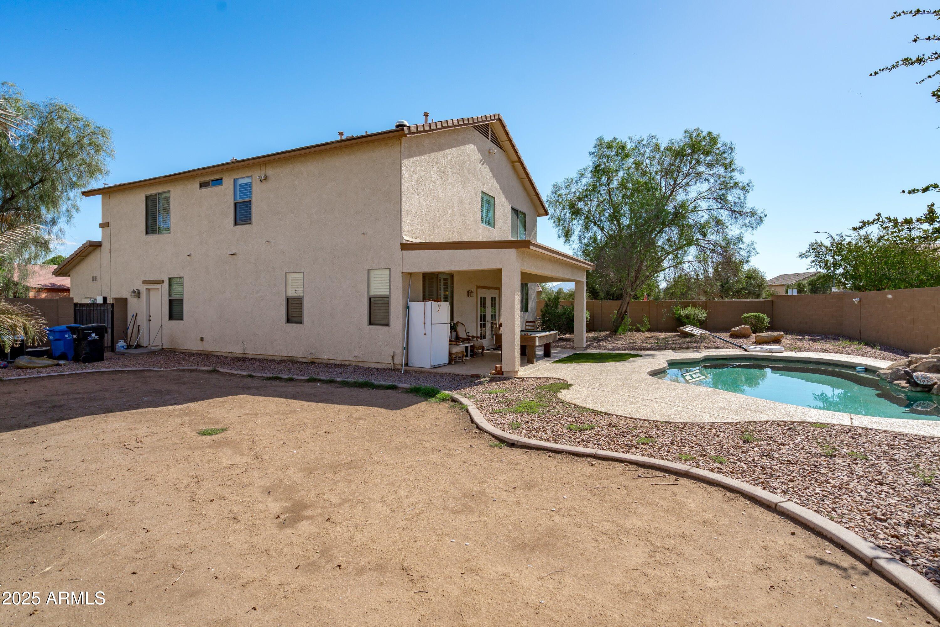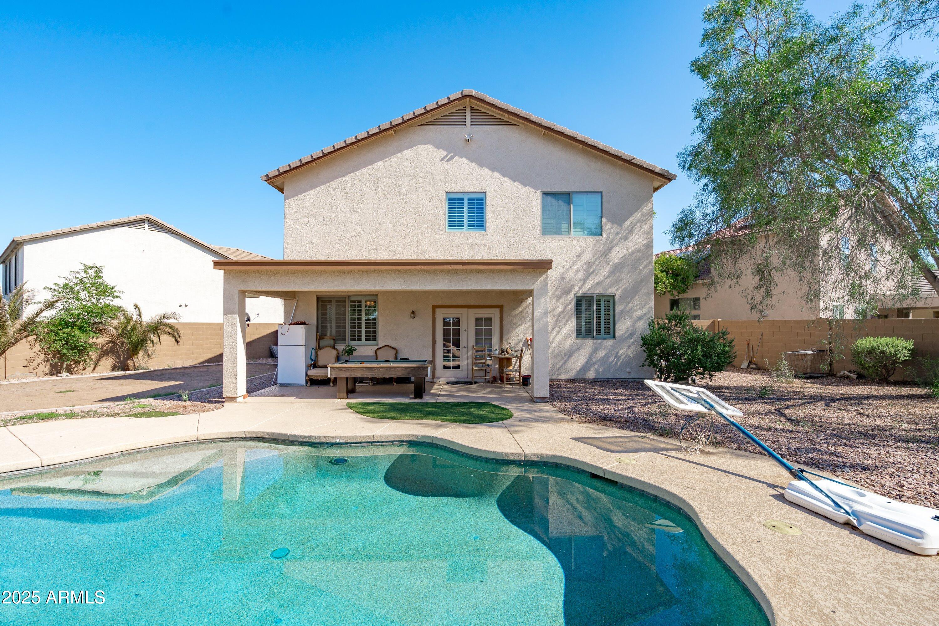 Former model home offering space, comfort, and endless potential. This well-designed home features 4 bedrooms, 3 full baths, and generous closet space in three of the bedrooms. Large windows with plantation shutters fill the home with natural light, complemented by beautiful tile flooring in the main living areas and carpet in the right places. A staircase with Brazilian cherry-style railing leads to an open loft; perfect as a playroom, home office, or media space. The kitchen is finished with granite countertops and ample cabinetry, creating a great flow for entertaining. Step outside to the covered patio overlooking a fenced-in pool and a large backyard. with RV Gate ready for your personal touch. Located in a desirable neighborhood close to shopping, dining, and entertainment, enjoy quick access to restaurants, local parks, and nearby schools. The home also features solar panels, helping reduce energy costs year-round.