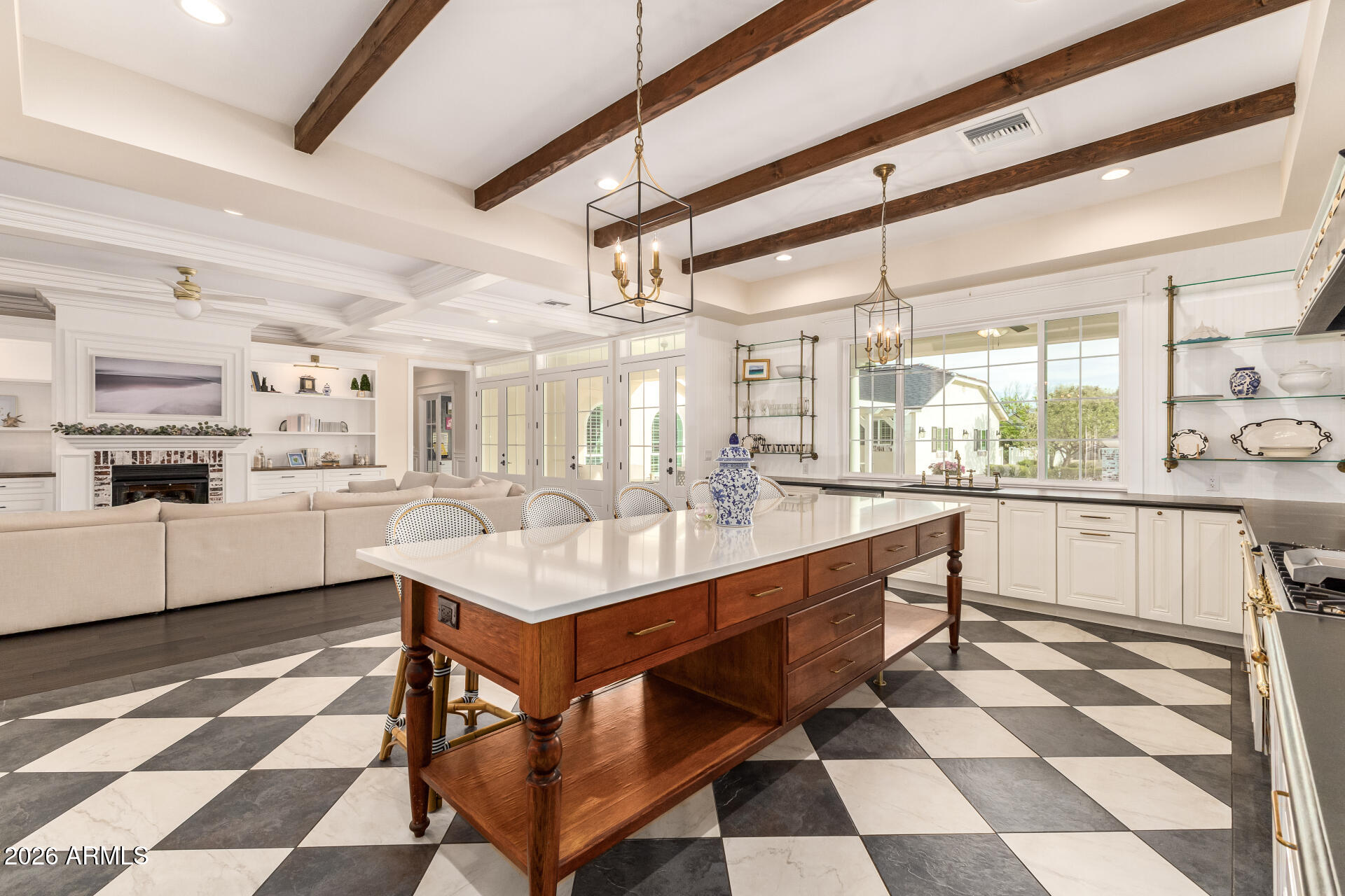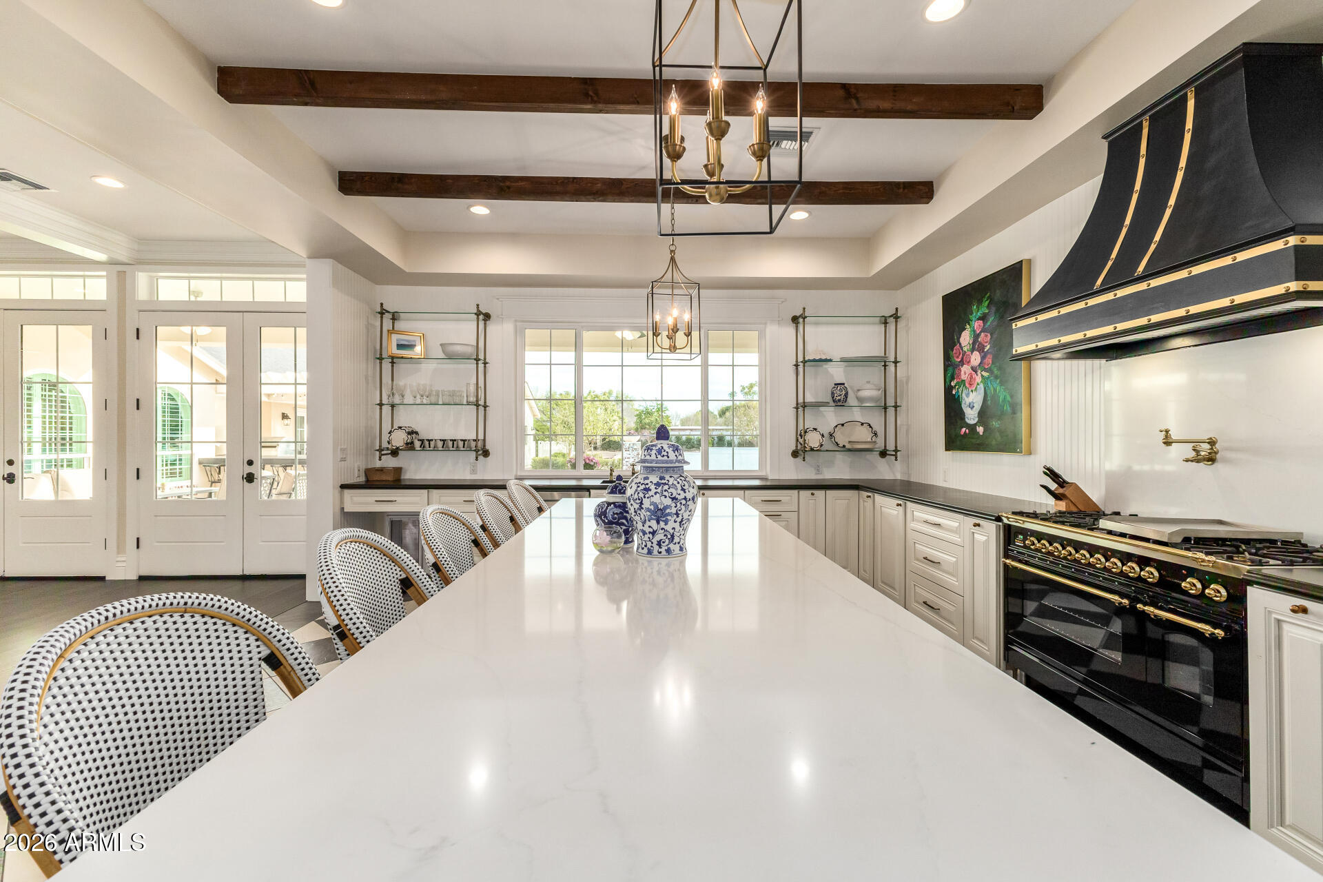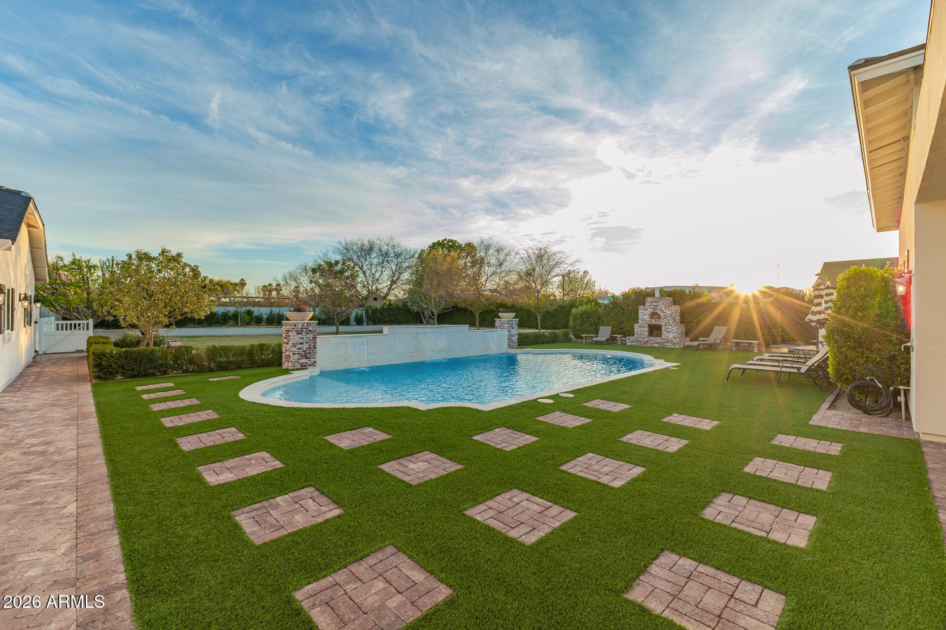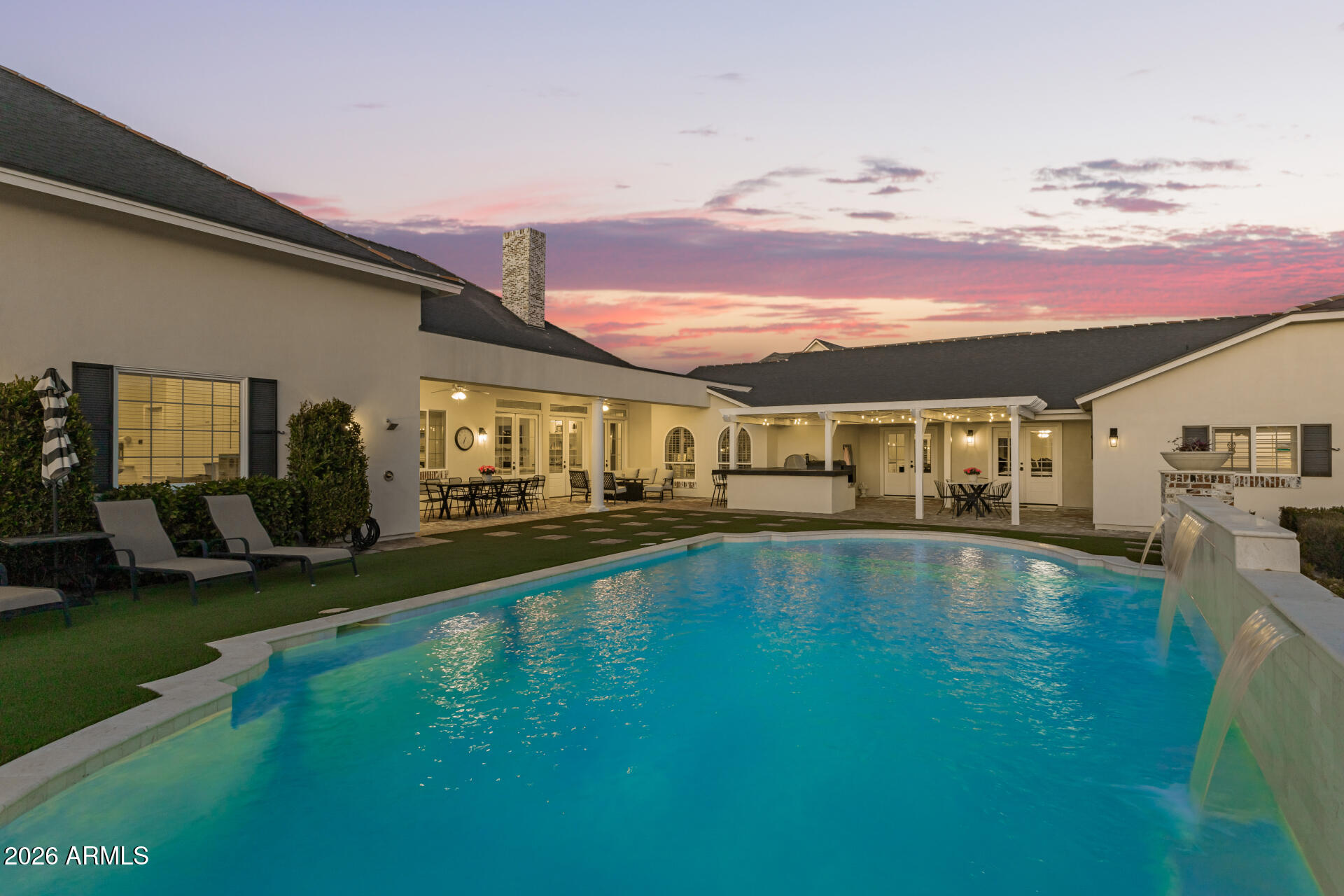 The backyard was designed for gathering, with three sets of French doors opening to a covered patio, outdoor fireplace, sparkling pool, hot tub, and multiple seating areas. A built-in BBQ, smoker, pizza oven, outdoor pool bathroom, and outdoor shower make entertaining effortless.