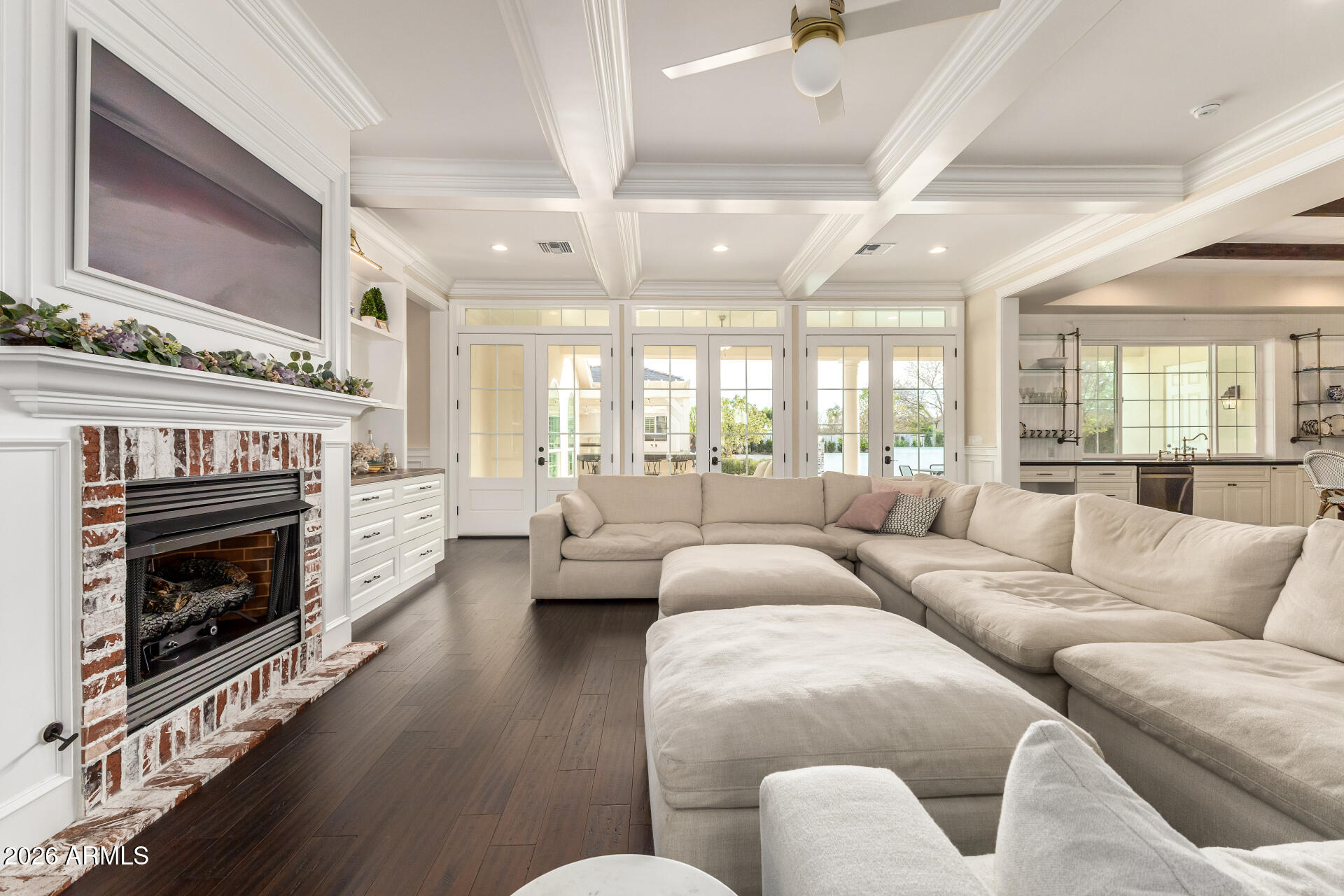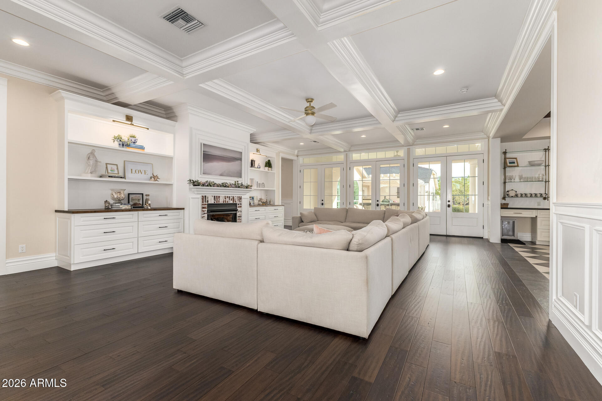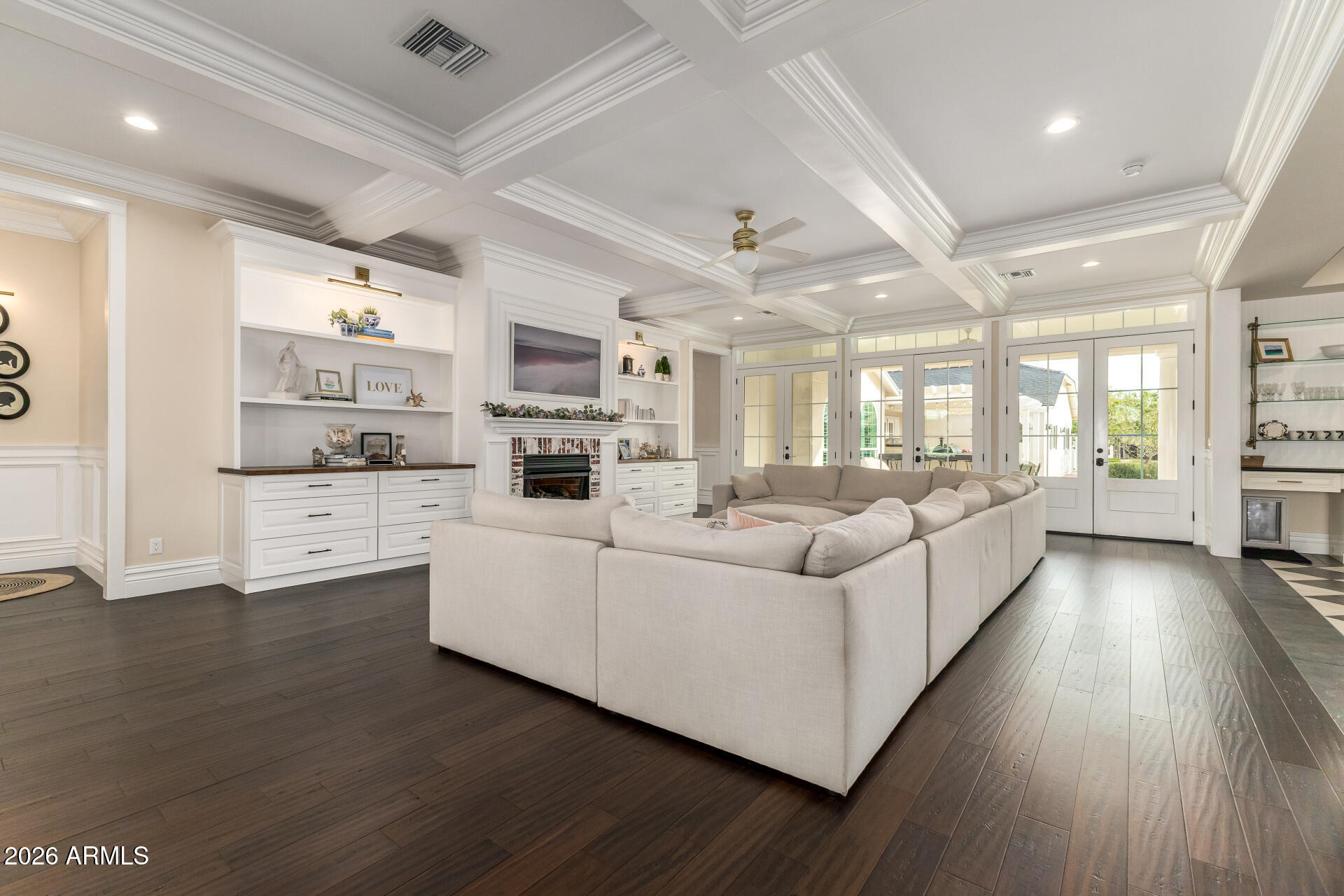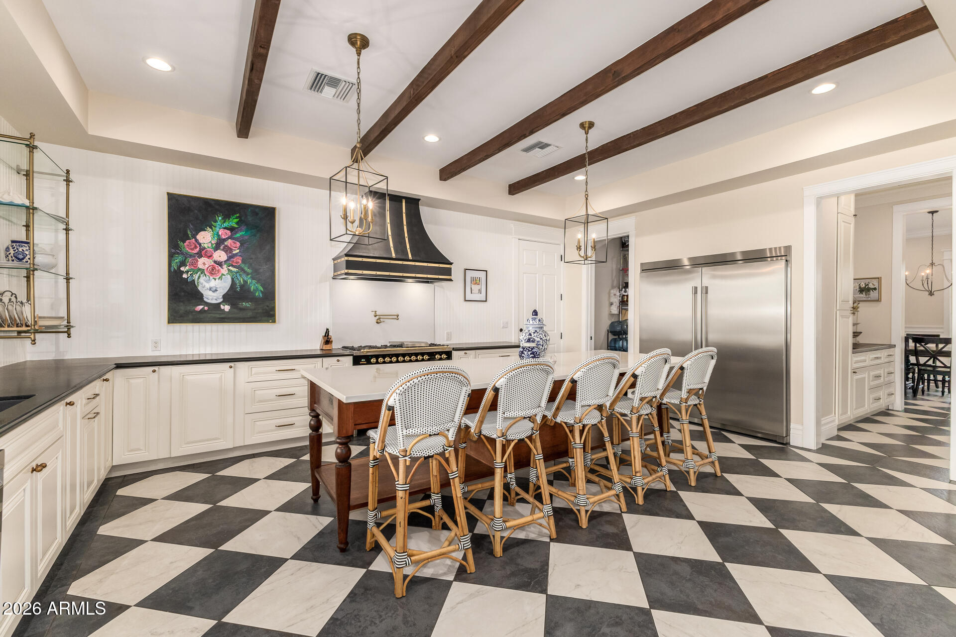 The backyard was designed for gathering, with three sets of French doors opening to a covered patio, outdoor fireplace, sparkling pool, hot tub, and multiple seating areas. A built-in BBQ, smoker, pizza oven, outdoor pool bathroom, and outdoor shower make entertaining effortless.