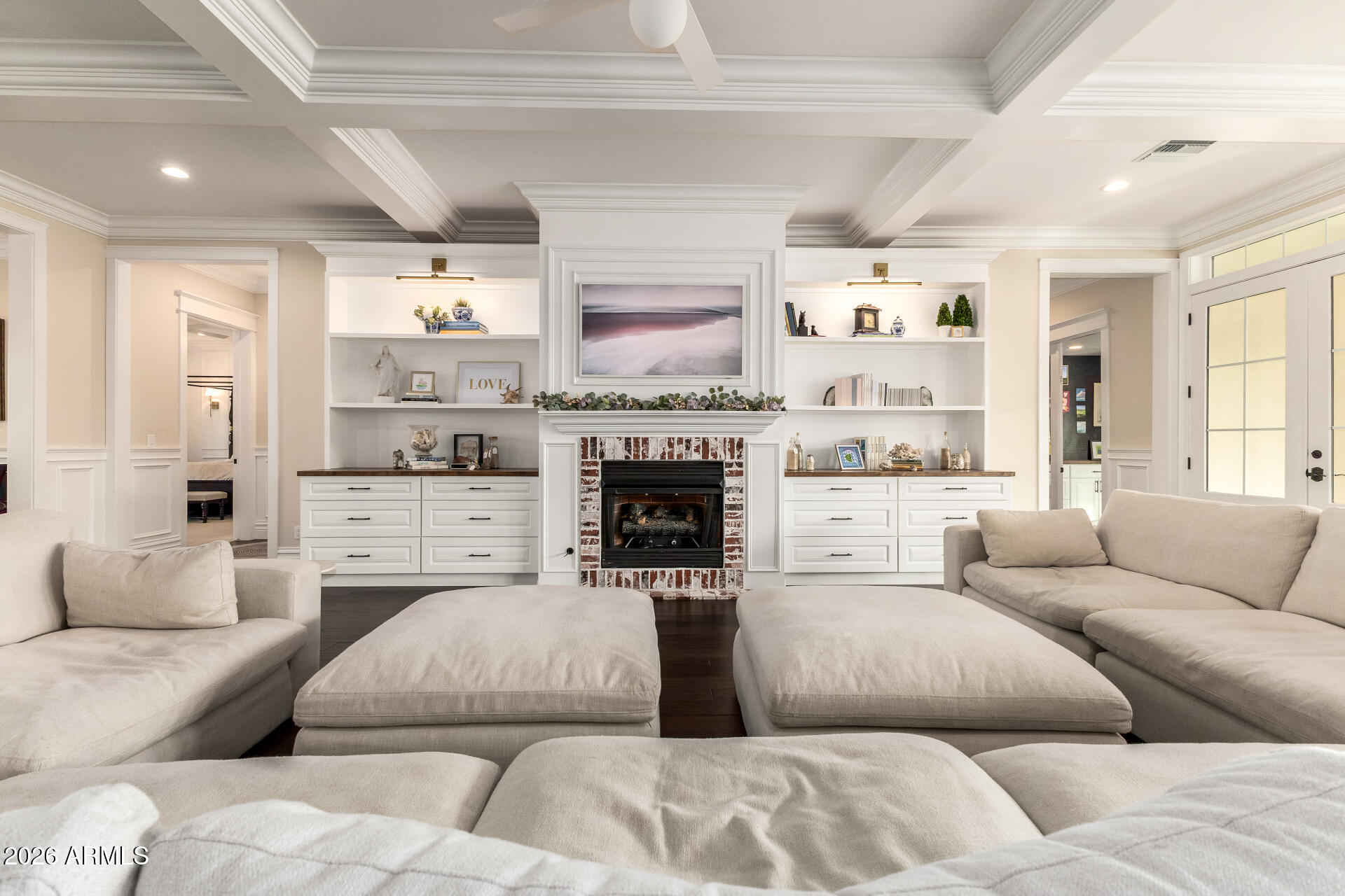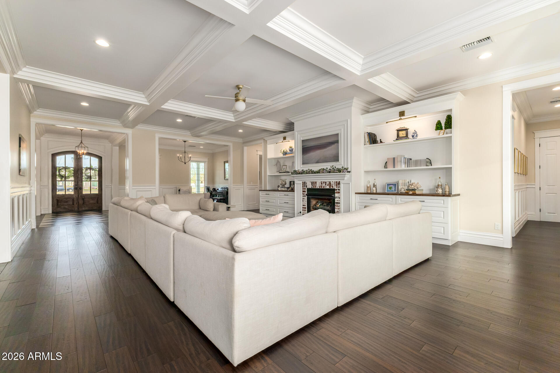 Set on a full one-acre lot with horse privileges, the home offers 5,623 square feet with 6 bedrooms, 5 full baths, and 2 half baths. A six-car garage including a massive attached RV fully insulated garage, along with a circular drive, provides exceptional space for vehicles, toys, and projects. Inside, natural light fills the home and highlights crown molding, coffered details, and warm, inviting living spaces centered around a beautiful fireplace. The kitchen sits at the heart of the home and features an imported Hallman double gas oven, pot filler, custom hood, quartz countertops, walk in pantry and generous space for cooking and gathering. Bulter's pantry with appliance station and walk through to dining room.