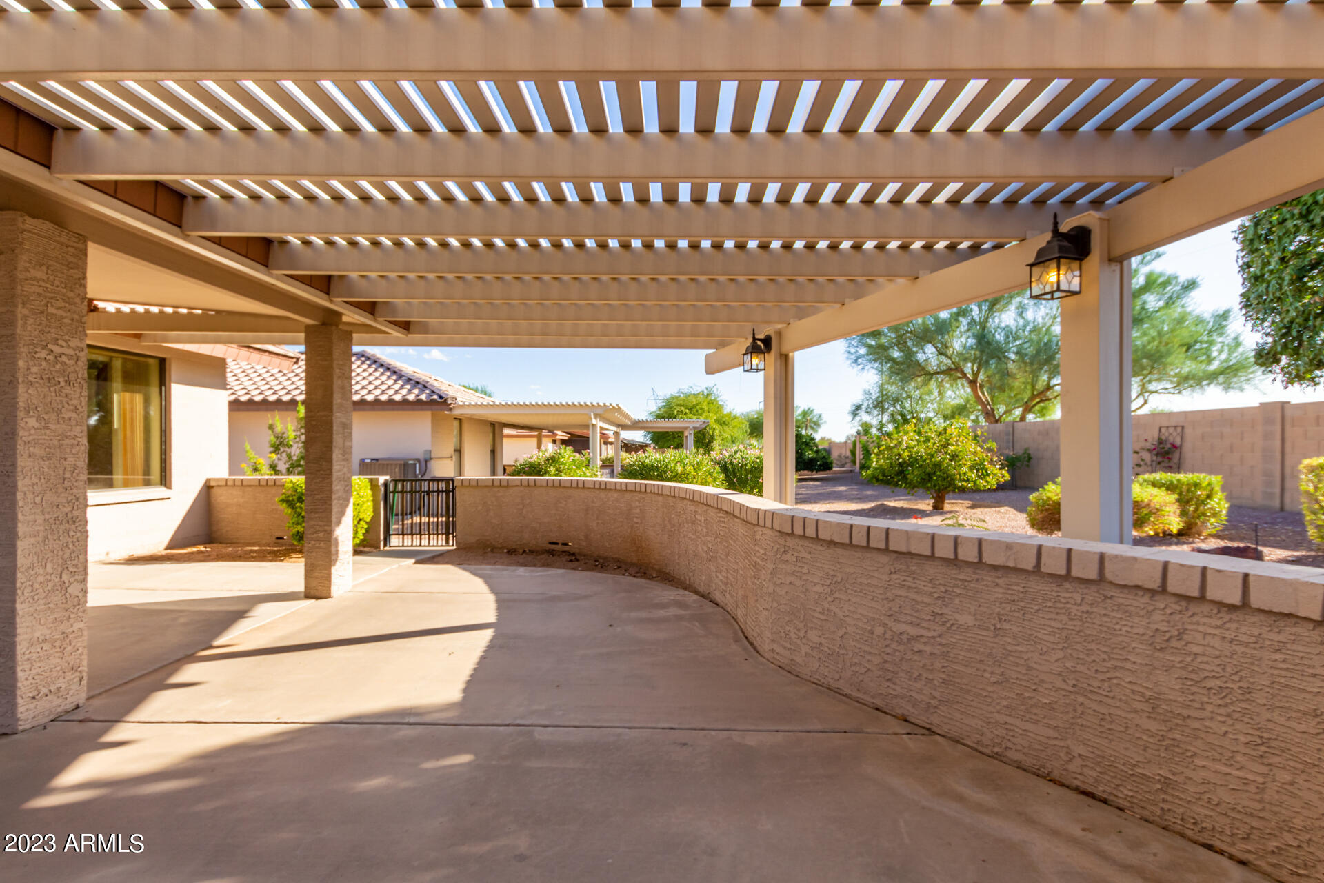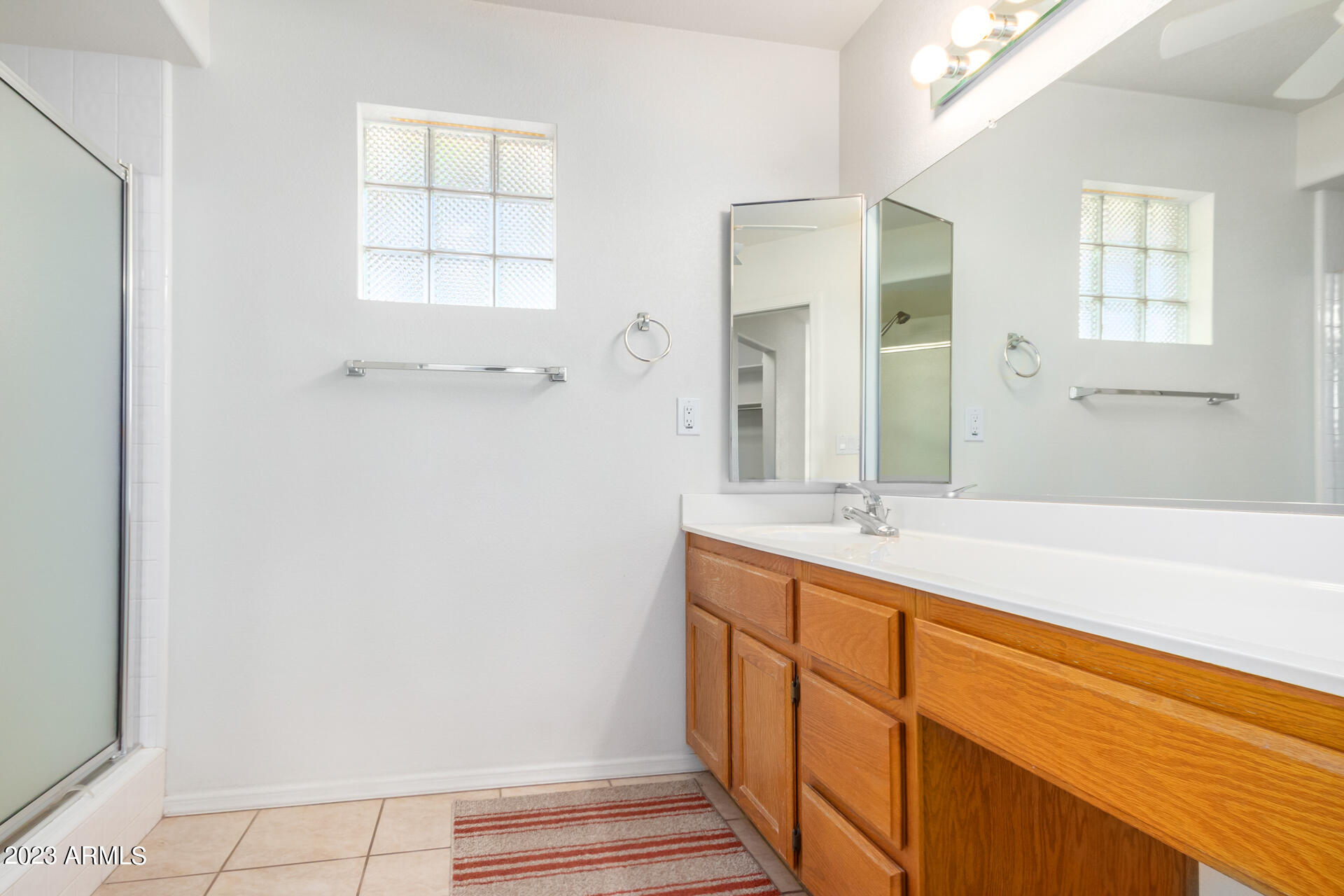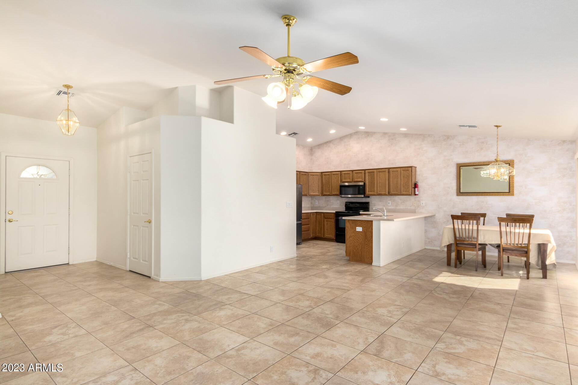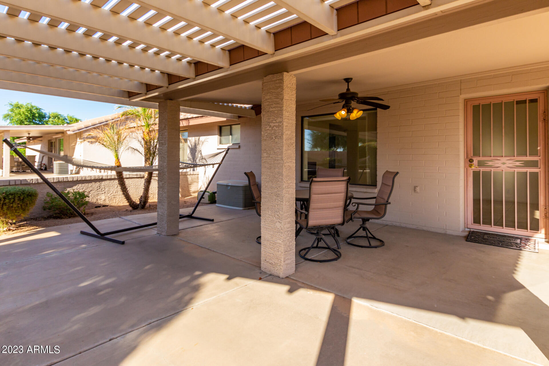 Charming 2-bedroom home in the sought-after adult community of Sunland Springs Village. Inside, you'll find a luminous living room adorned with tile floors and vaulted ceilings. The eat-in kitchen boasts recessed lighting, oak cabinets, built-in appliances, and a peninsula with a breakfast bar for leisurely mornings. The main bedroom offers privacy with its own bathroom and a spacious walk-in closet. Added storage is provided with attached cabinets in the garage. Relax outdoors on a covered patio, under the attached Ramada, or in the cozy seating areas - perfect for sipping your favorite beverage. Enjoy the neighborhood's amenities, such as a pool, spa, fitness center, and more! Don't let this gem slip away!